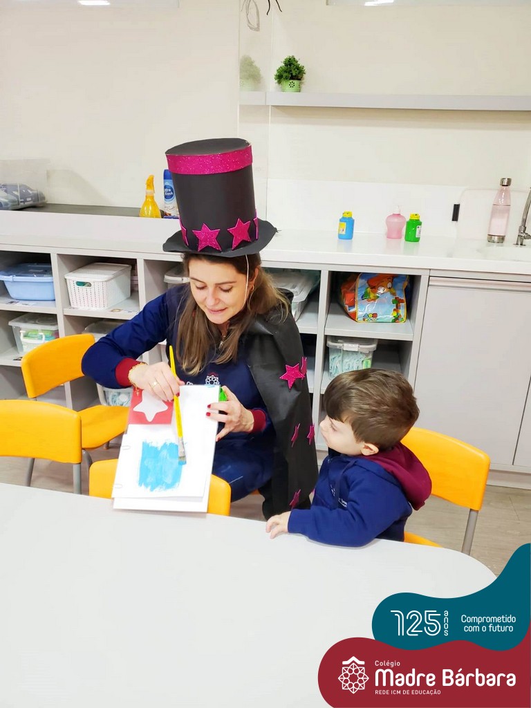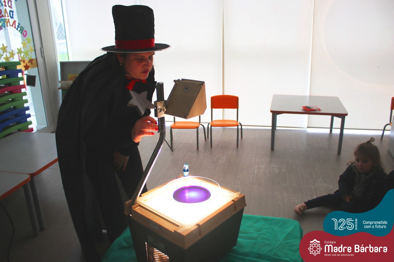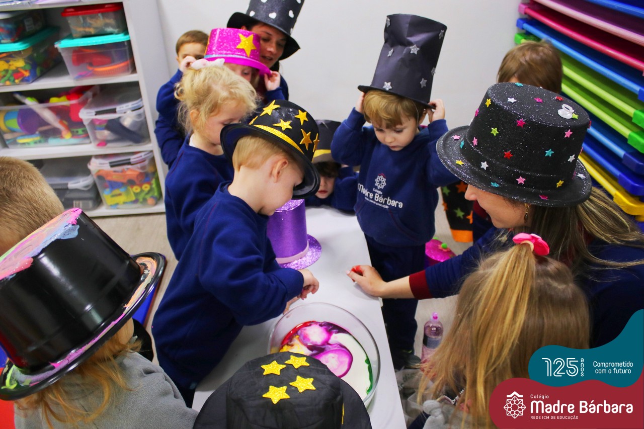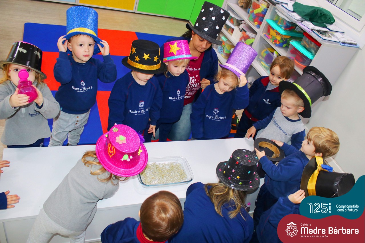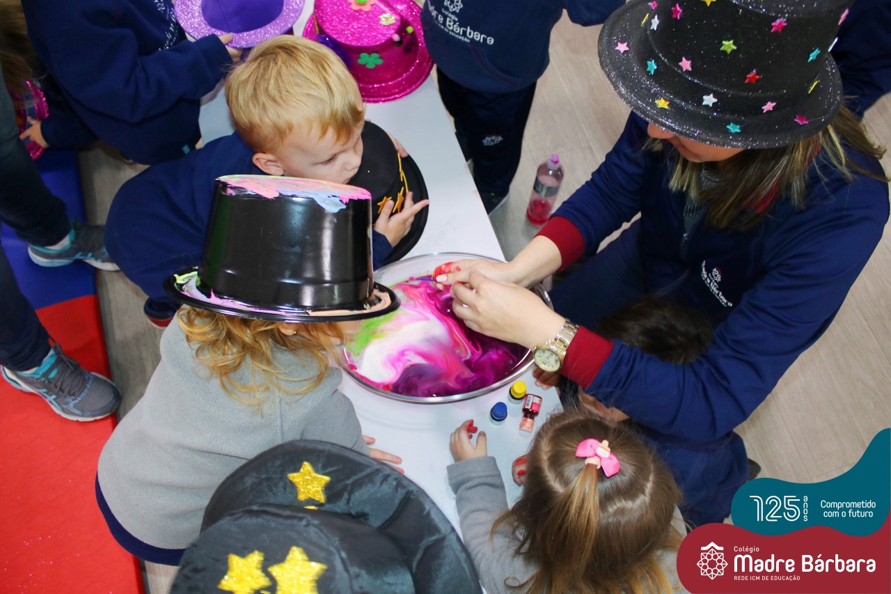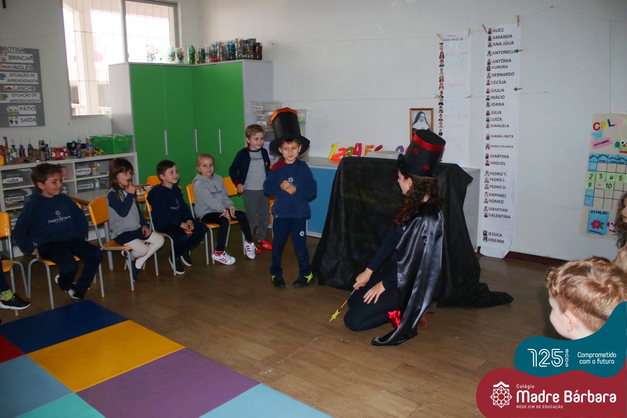 O primeiro dia da Semana da Criança foi marcado por encanto e magia. As crianças foram recebidas em um ambiente especialmente preparado com muita cor, cartolas e estrelas! O dia foi de mágicas que empolgaram as crianças e professoras. Abracadabra…simsalabim!!!