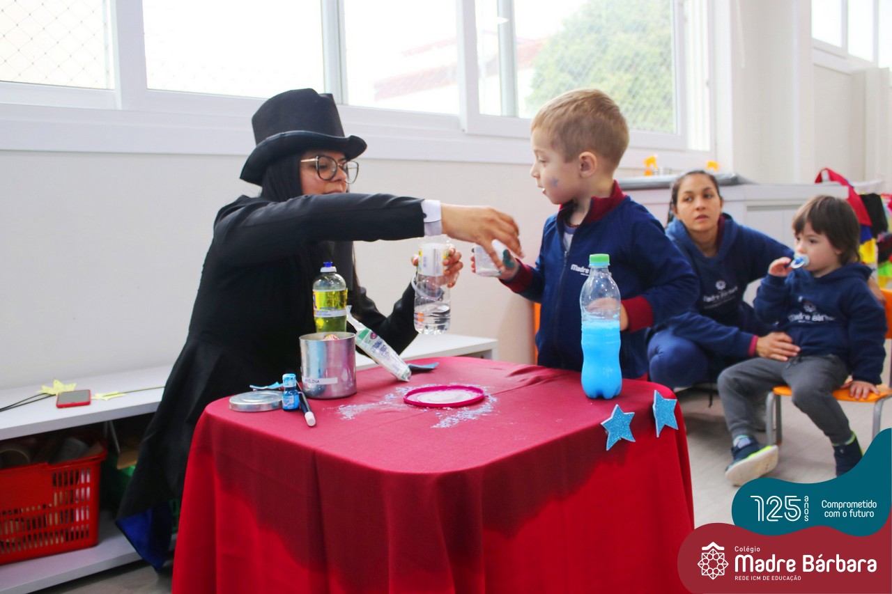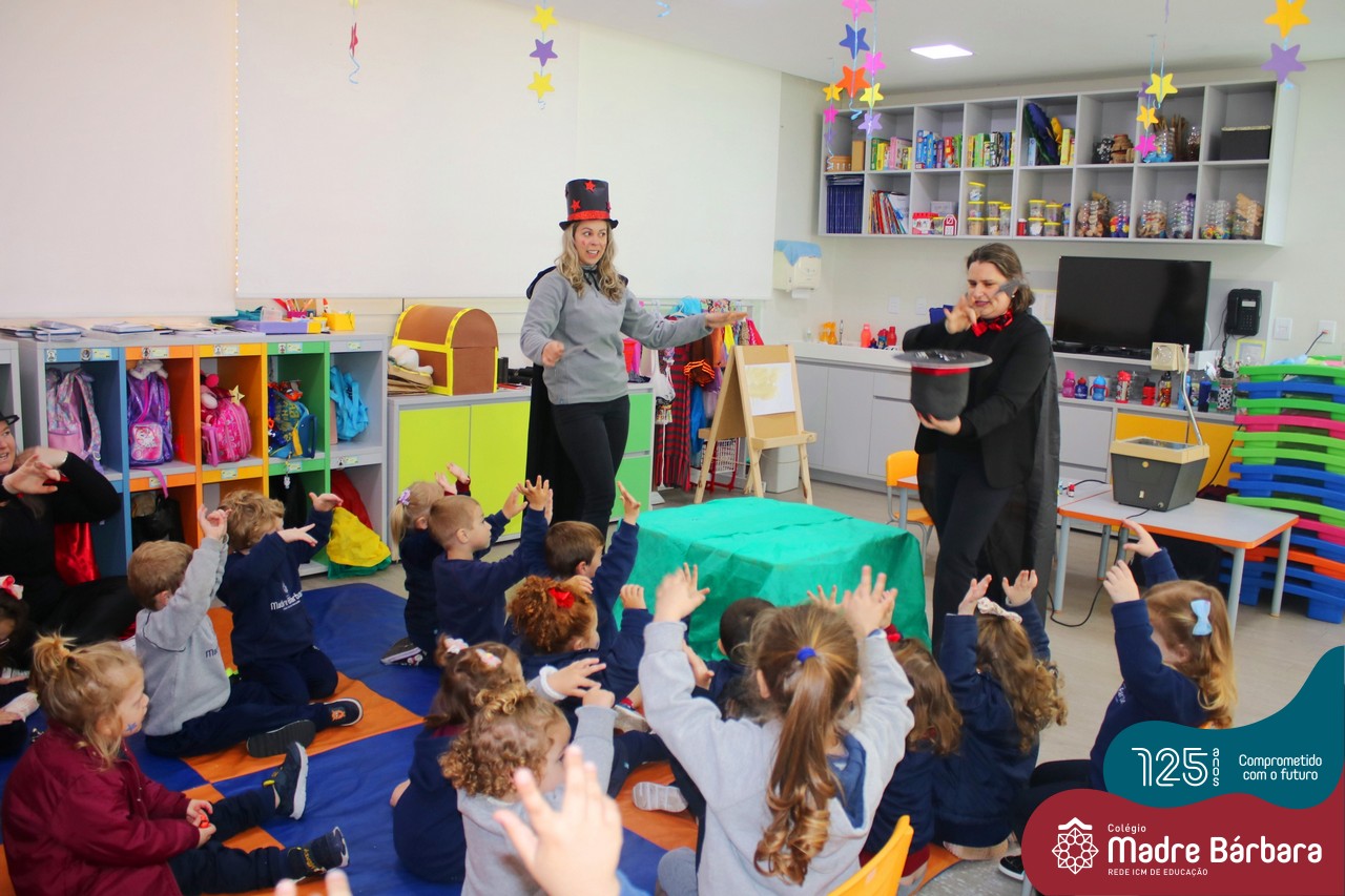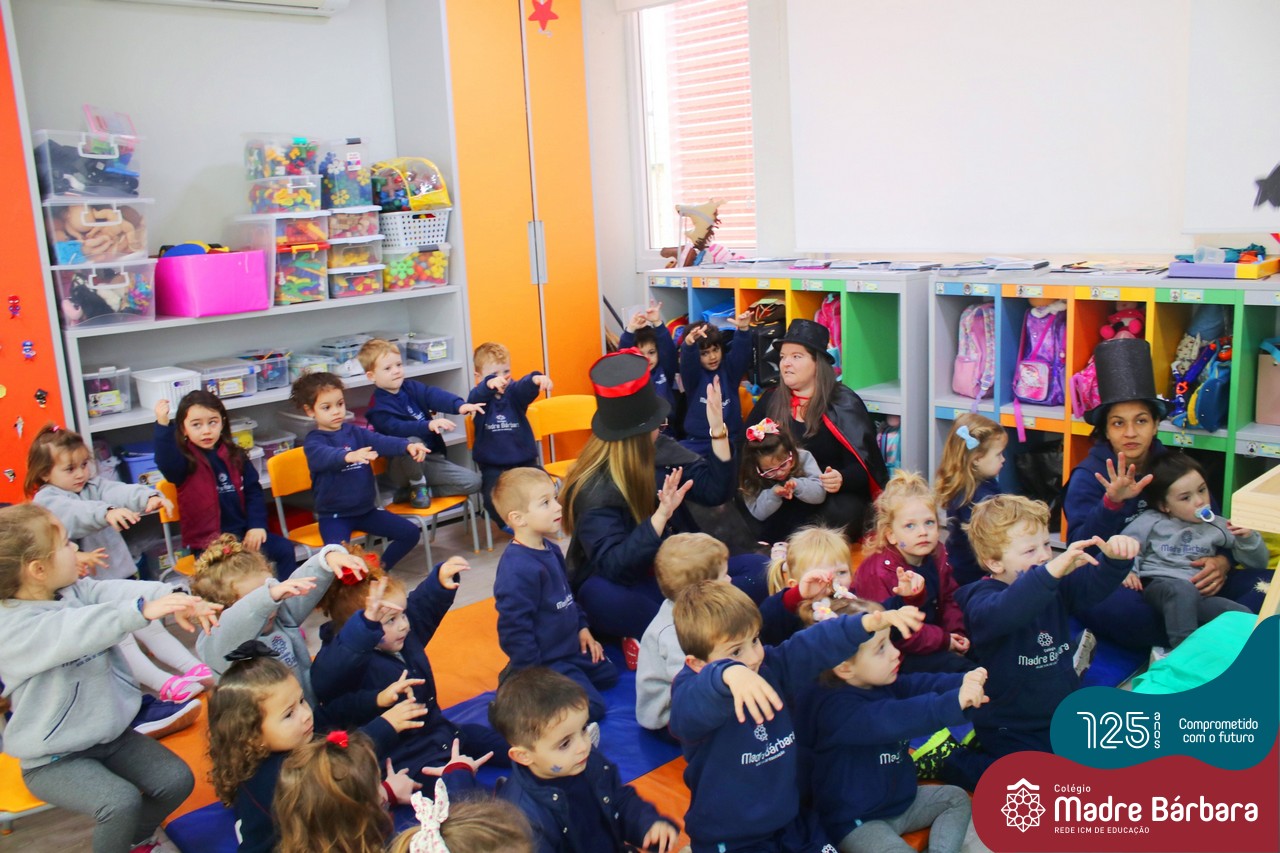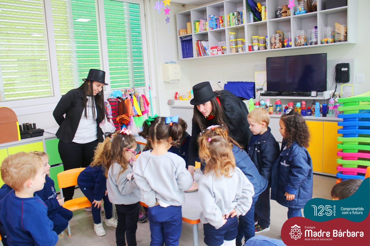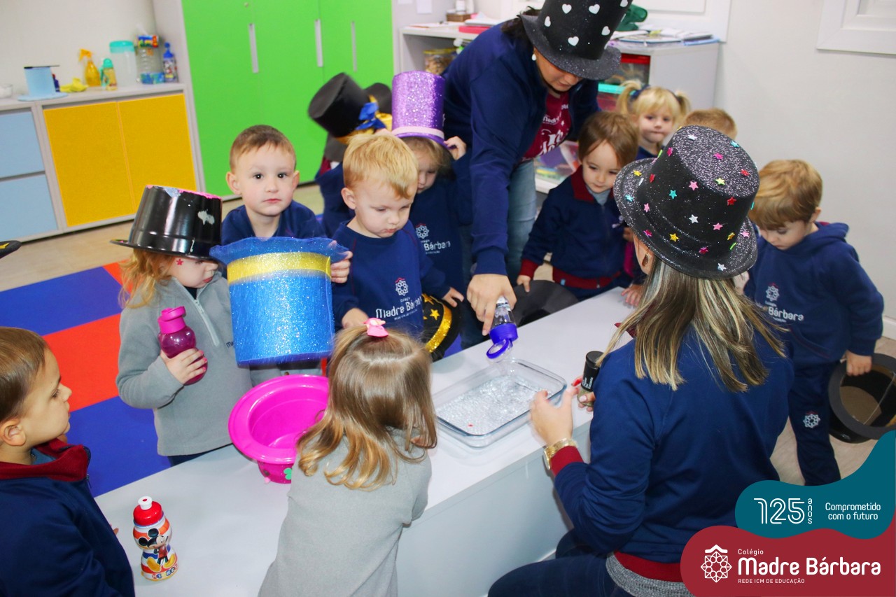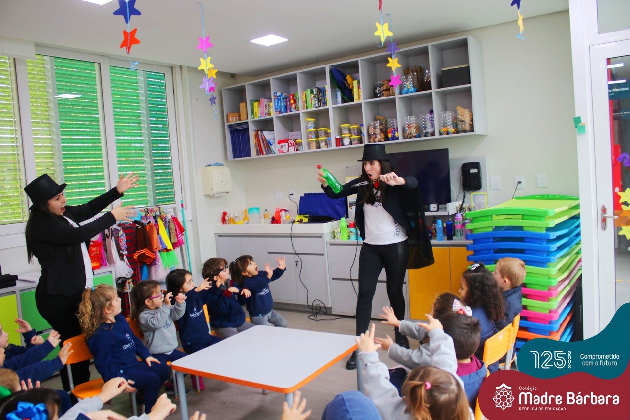 O primeiro dia da Semana da Criança foi marcado por encanto e magia. As crianças foram recebidas em um ambiente especialmente preparado com muita cor, cartolas e estrelas! O dia foi de mágicas que empolgaram as crianças e professoras. Abracadabra…simsalabim!!!