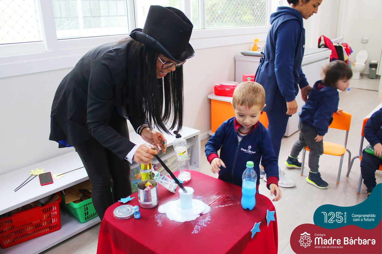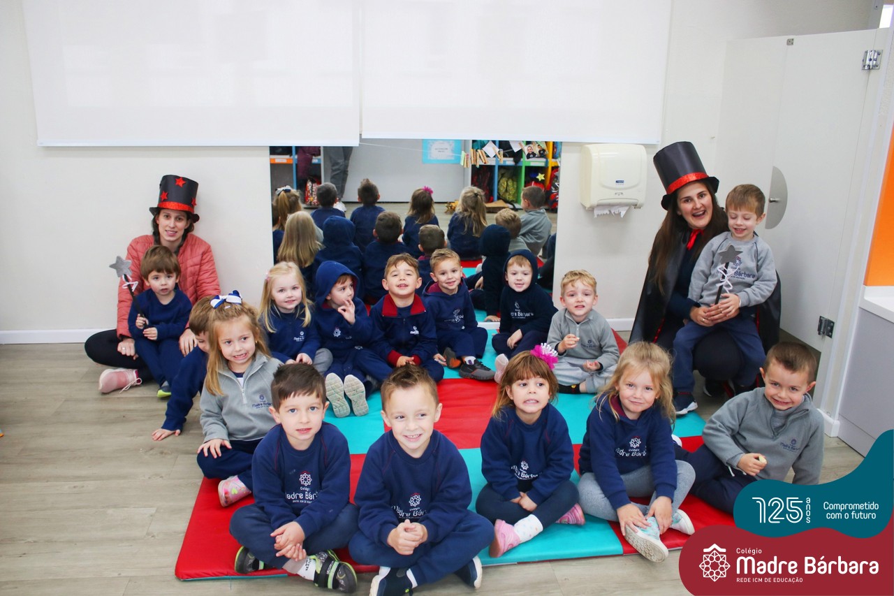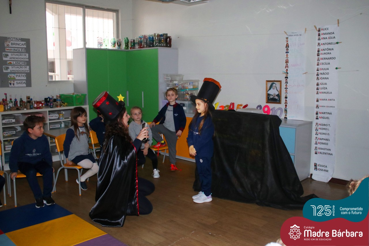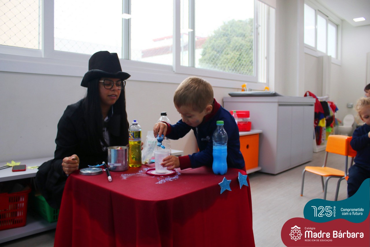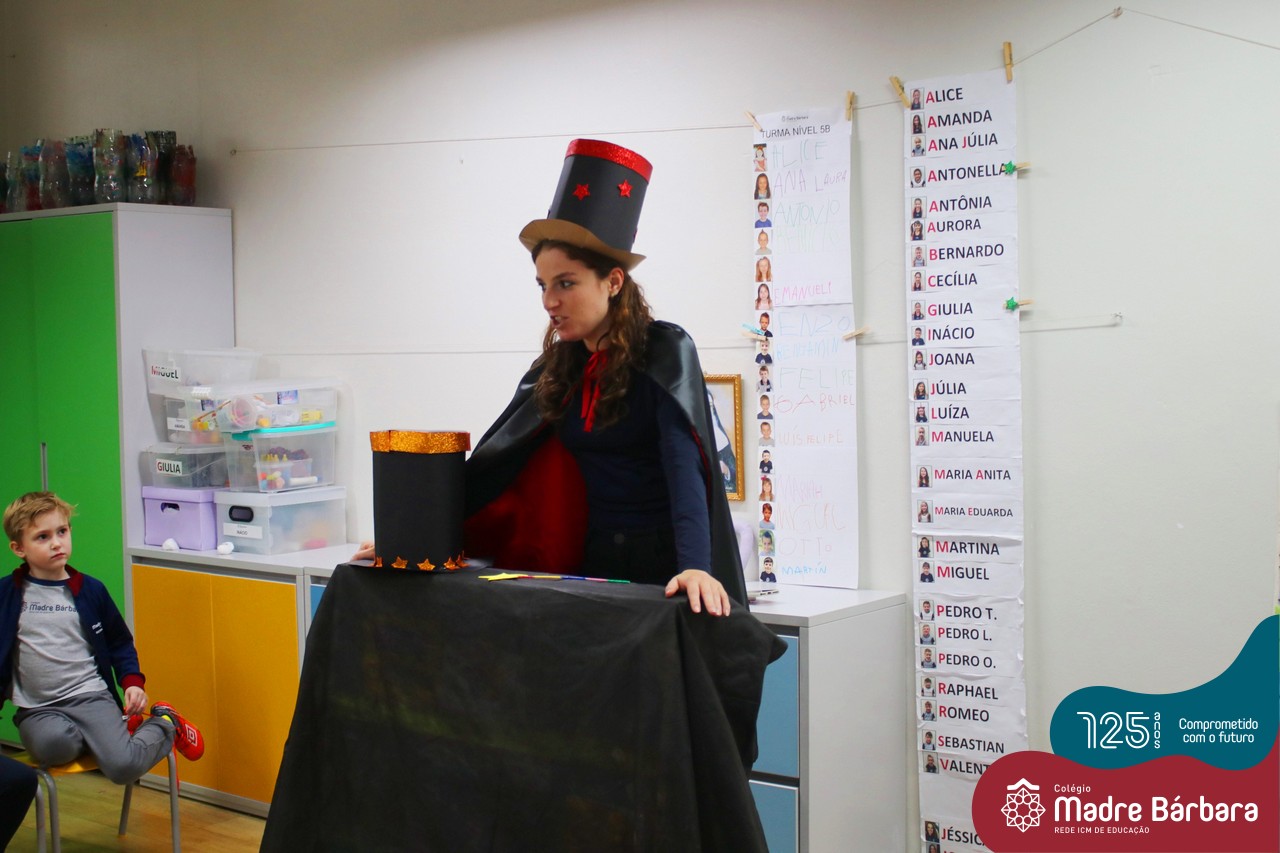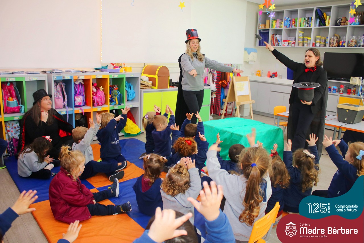O primeiro dia da Semana da Criança foi marcado por encanto e magia. As crianças foram recebidas em um ambiente especialmente preparado com muita cor, cartolas e estrelas! O dia foi de mágicas que empolgaram as crianças e professoras. Abracadabra…simsalabim!!!