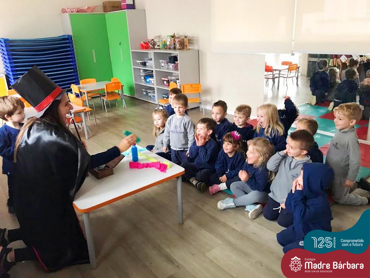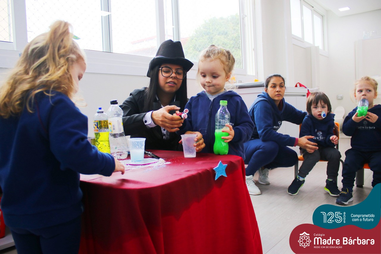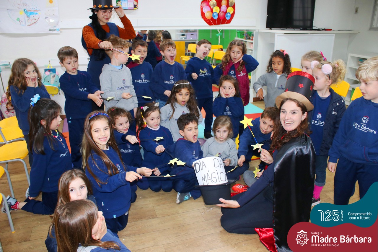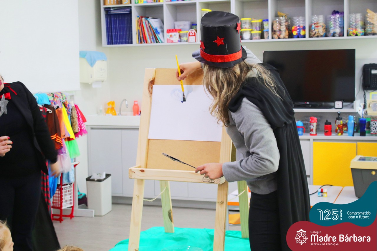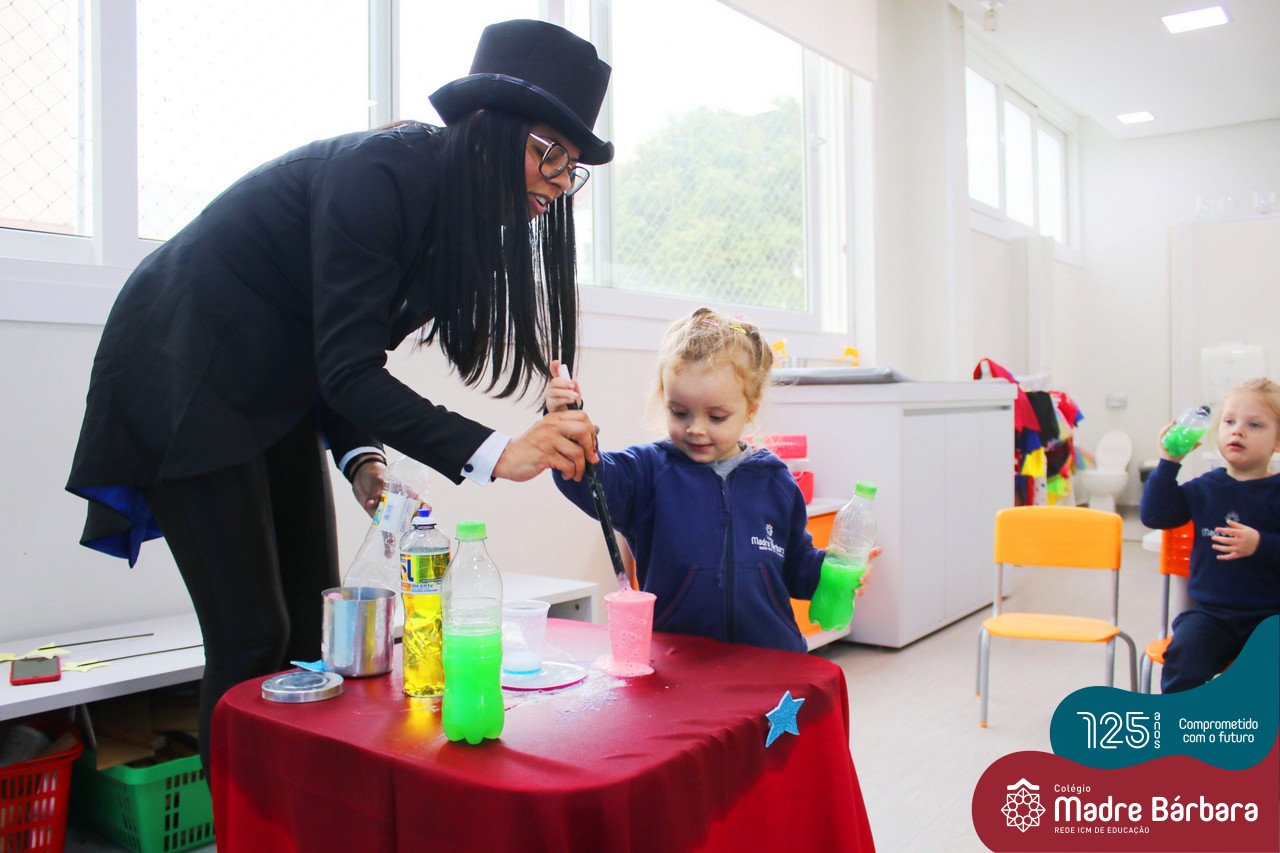 O primeiro dia da Semana da Criança foi marcado por encanto e magia. As crianças foram recebidas em um ambiente especialmente preparado com muita cor, cartolas e estrelas! O dia foi de mágicas que empolgaram as crianças e professoras. Abracadabra…simsalabim!!!