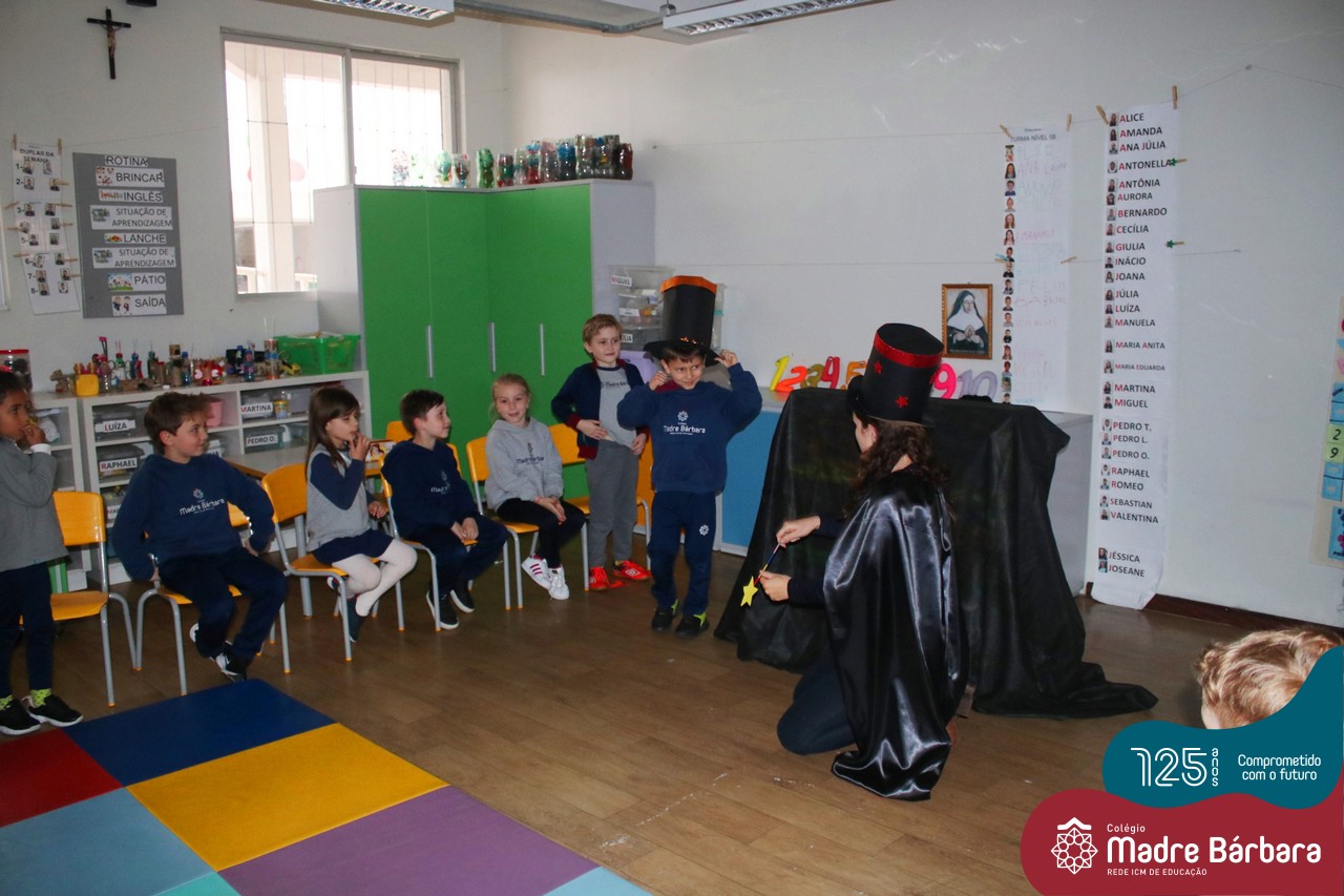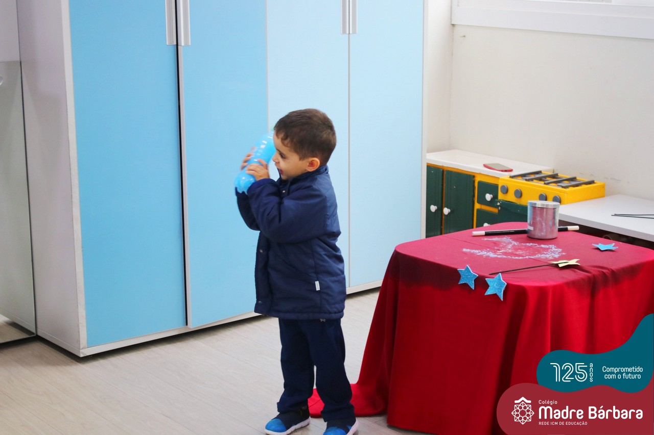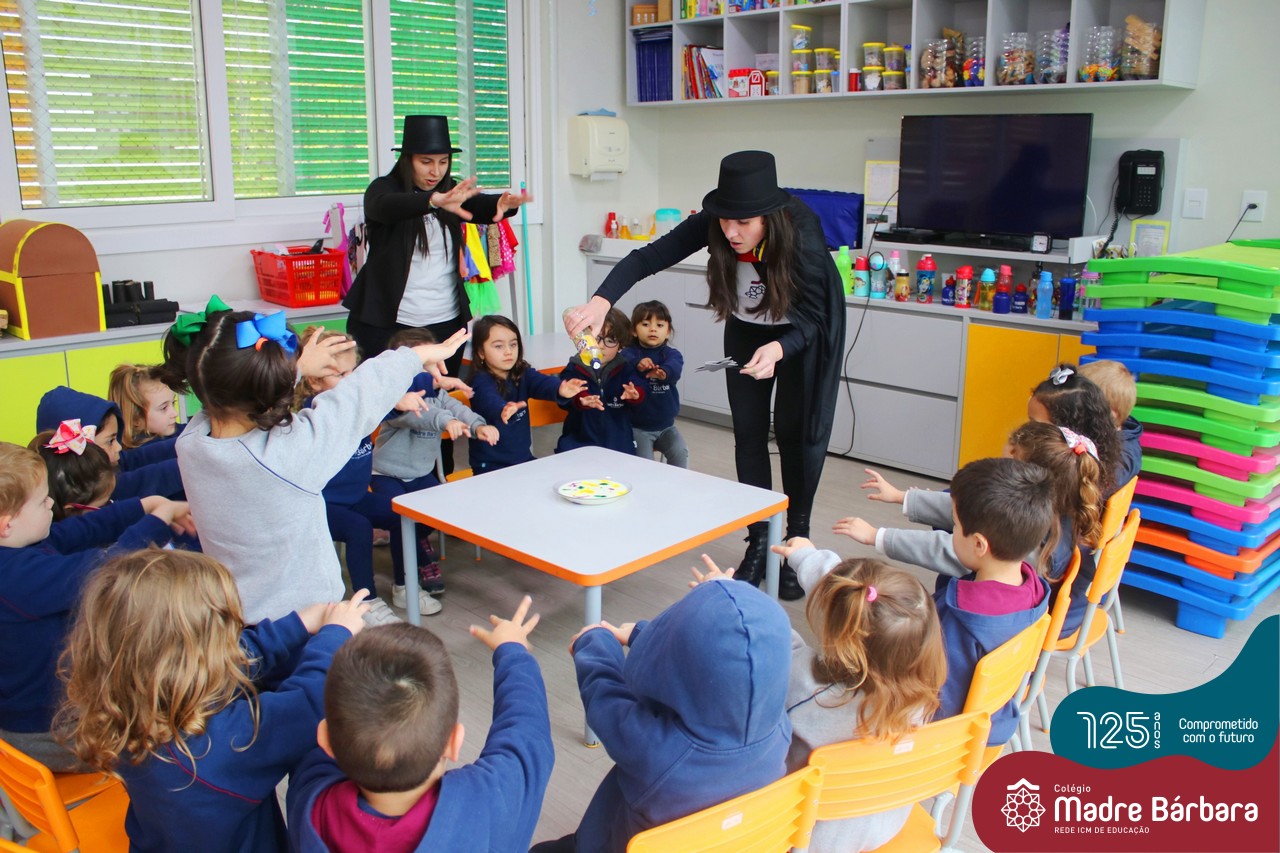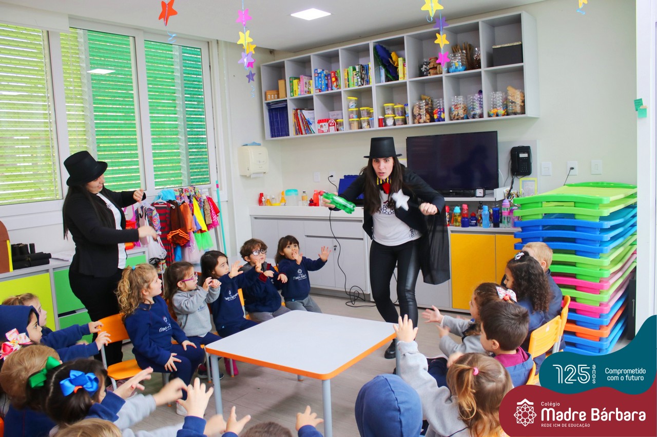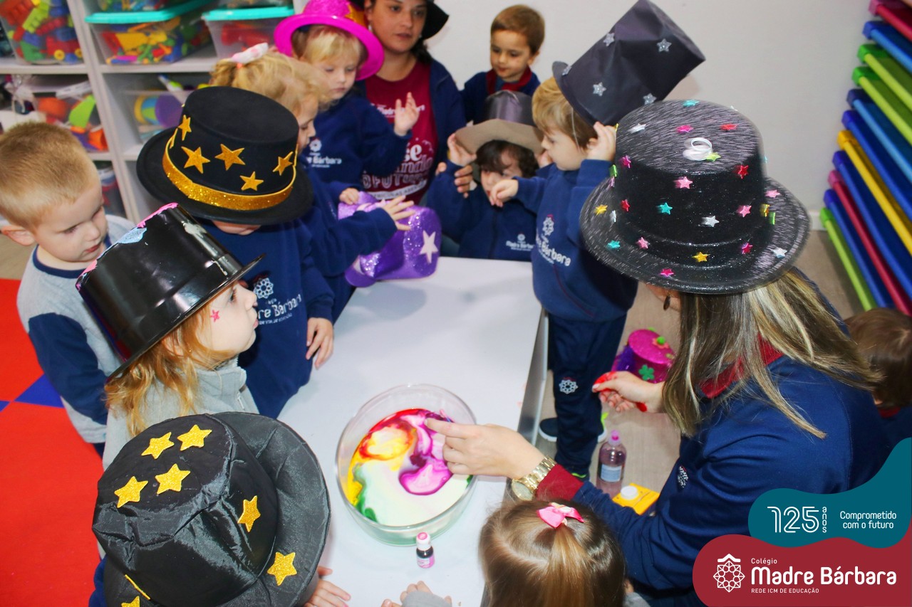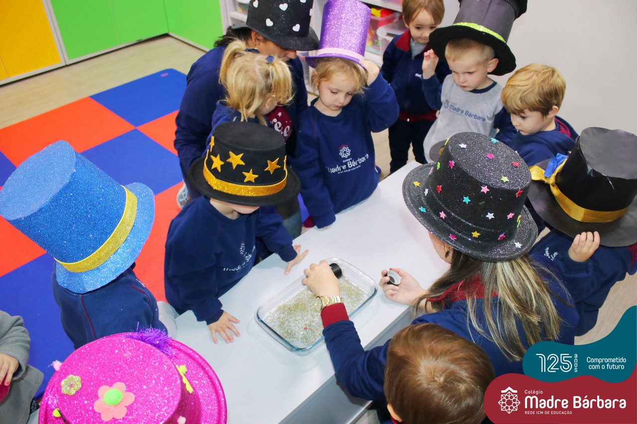 O primeiro dia da Semana da Criança foi marcado por encanto e magia. As crianças foram recebidas em um ambiente especialmente preparado com muita cor, cartolas e estrelas! O dia foi de mágicas que empolgaram as crianças e professoras. Abracadabra…simsalabim!!!