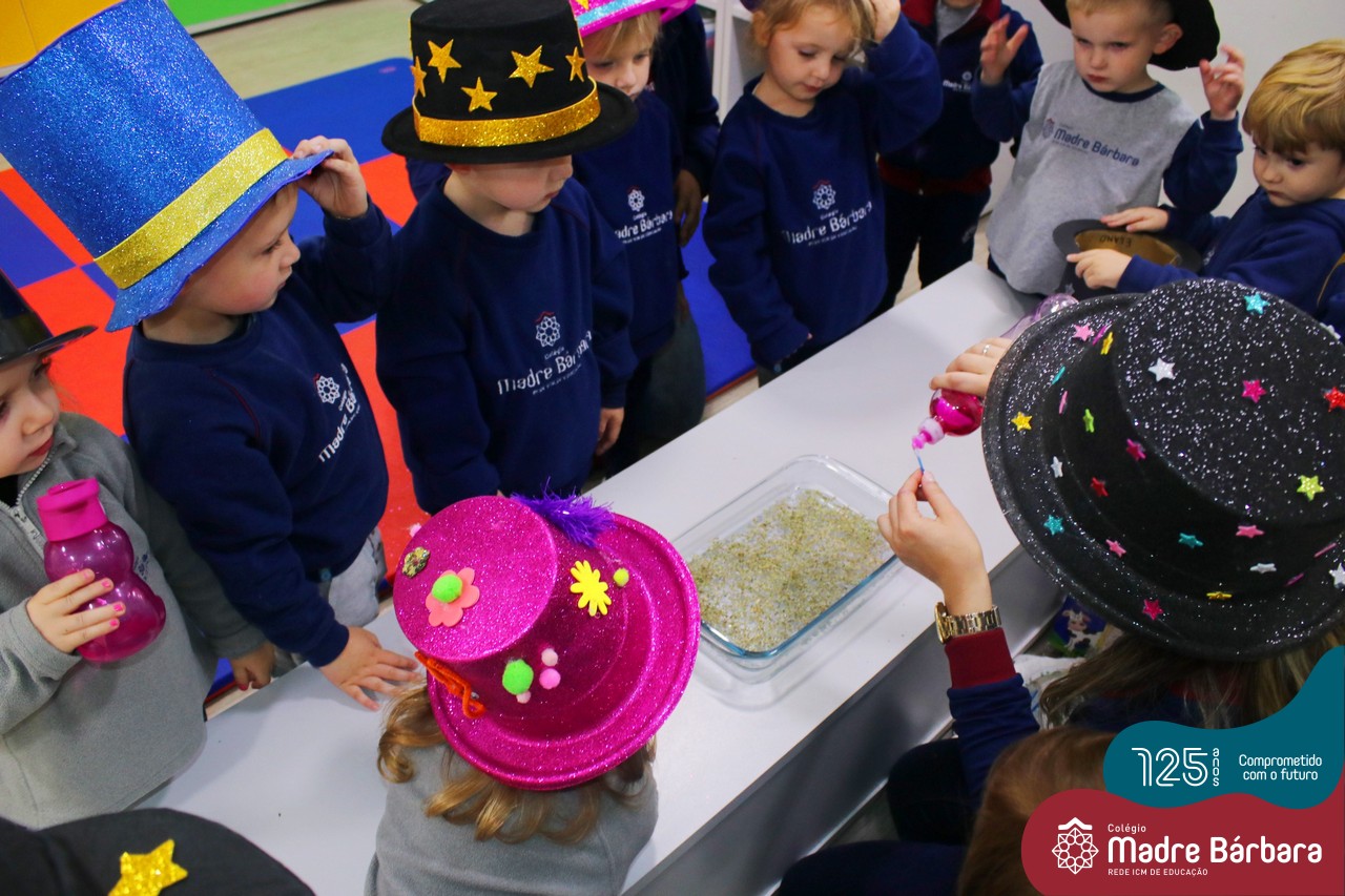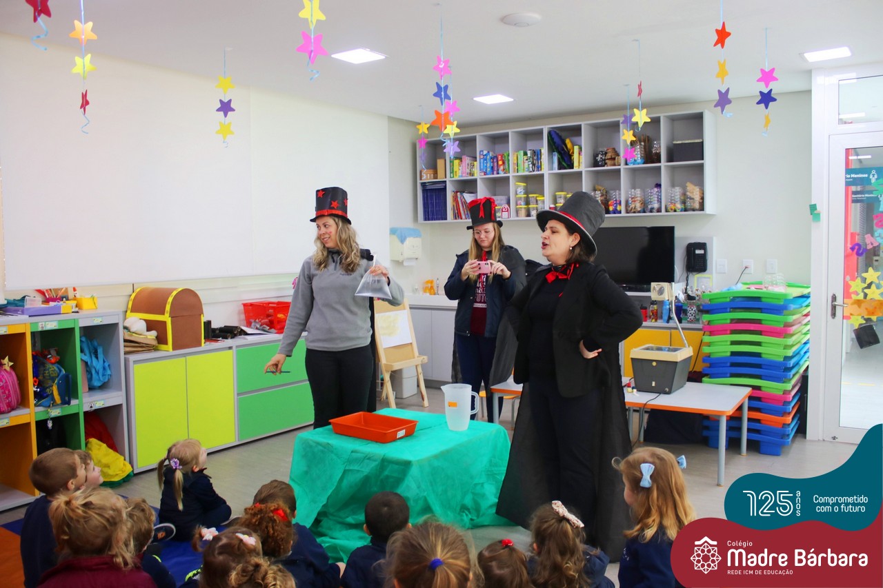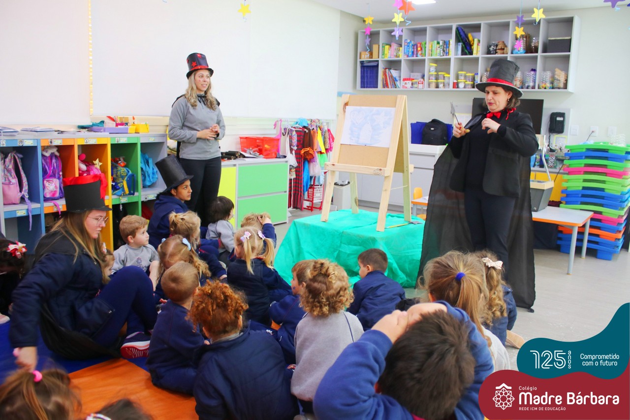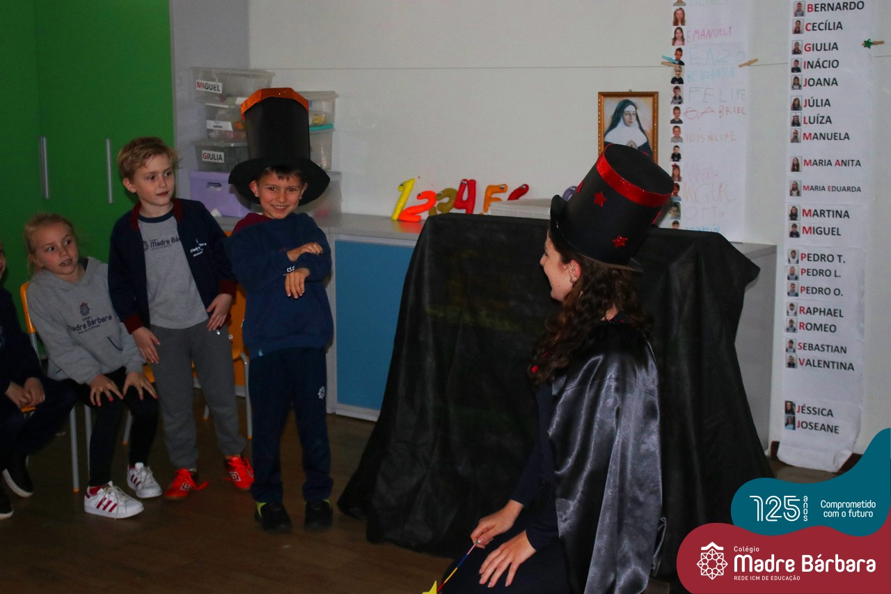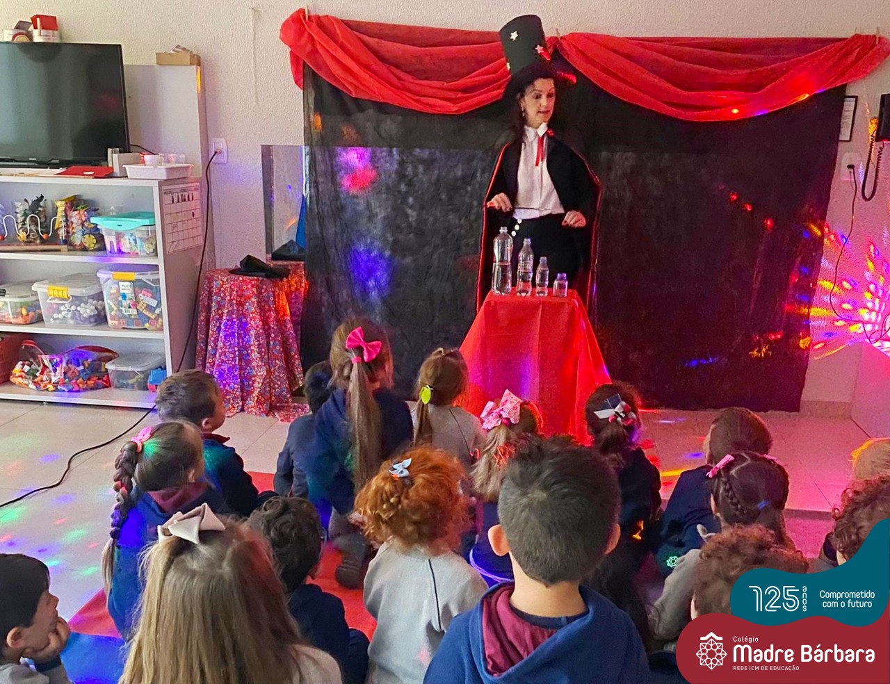 O primeiro dia da Semana da Criança foi marcado por encanto e magia. As crianças foram recebidas em um ambiente especialmente preparado com muita cor, cartolas e estrelas! O dia foi de mágicas que empolgaram as crianças e professoras. Abracadabra…simsalabim!!!