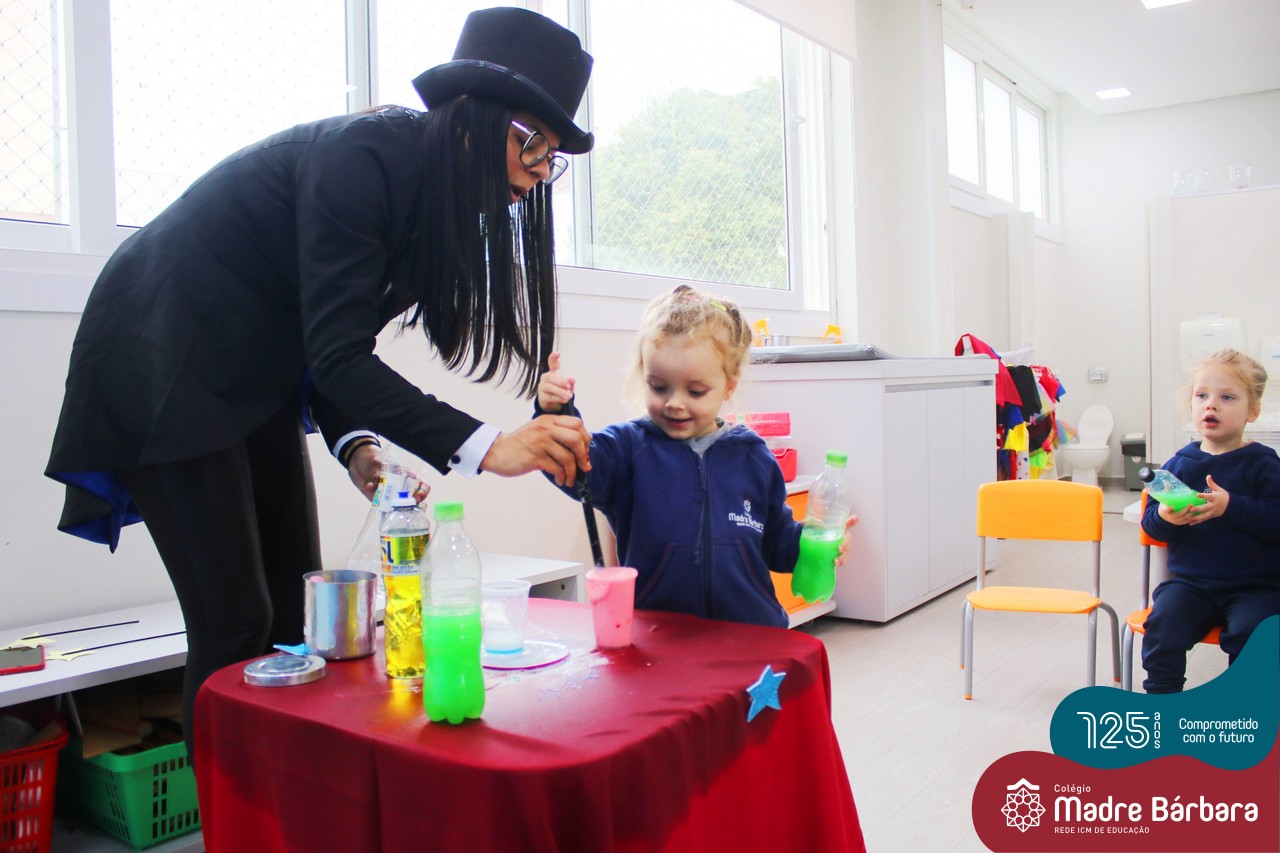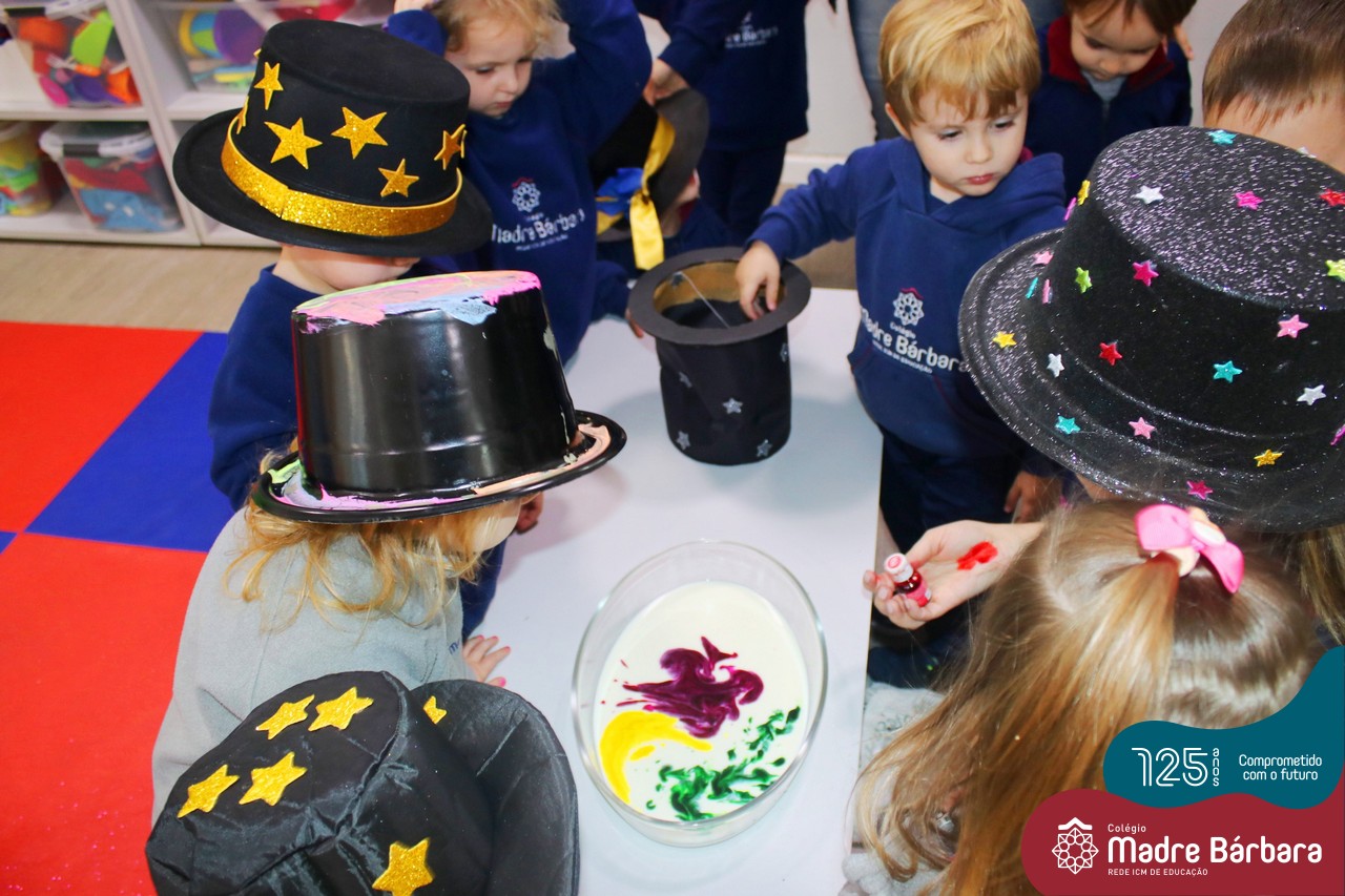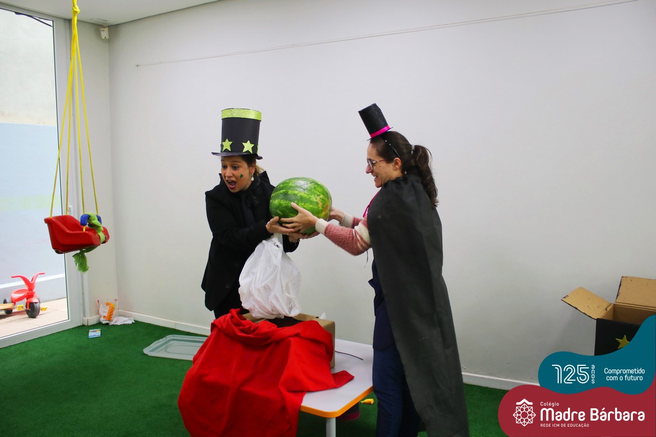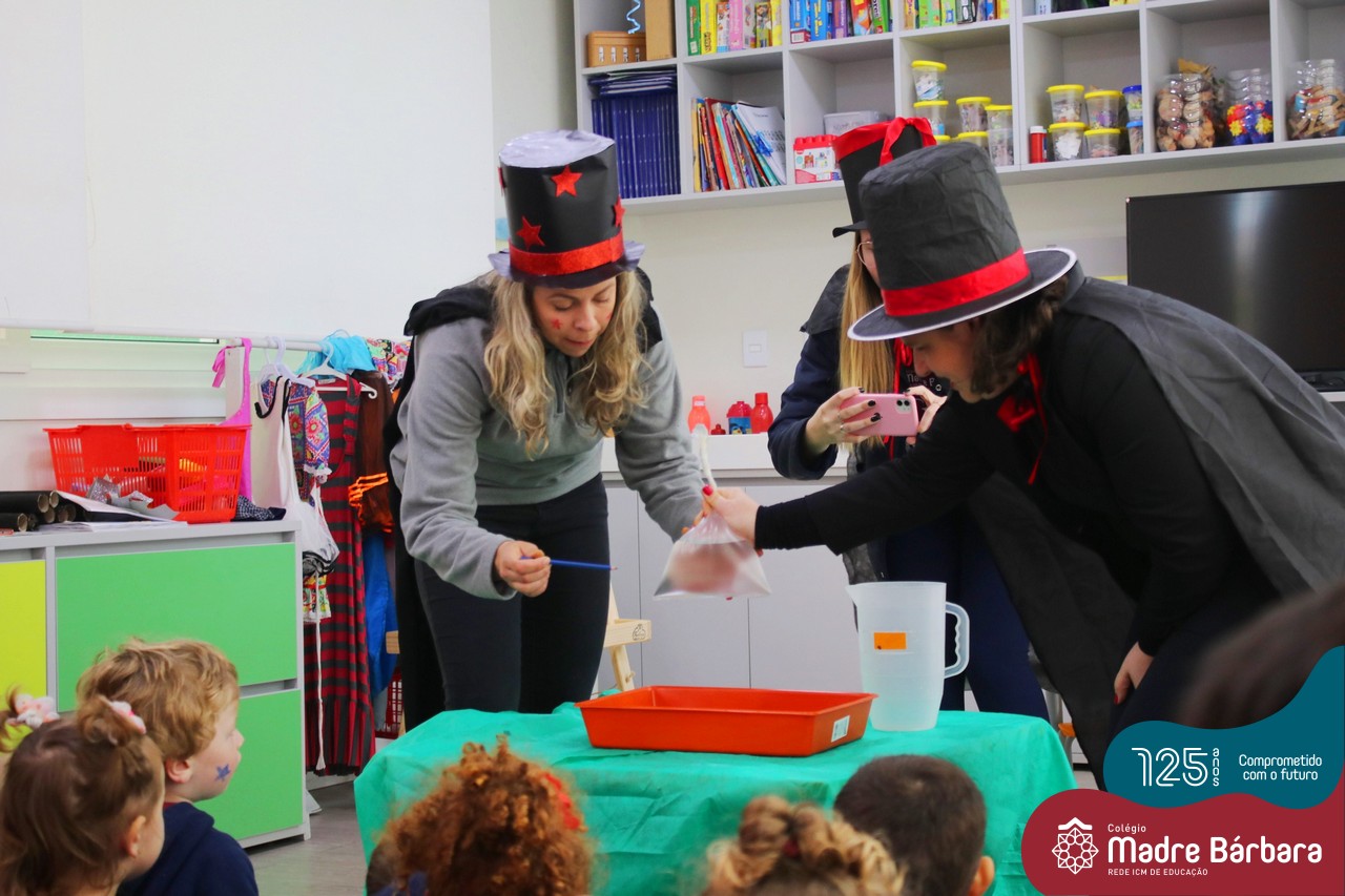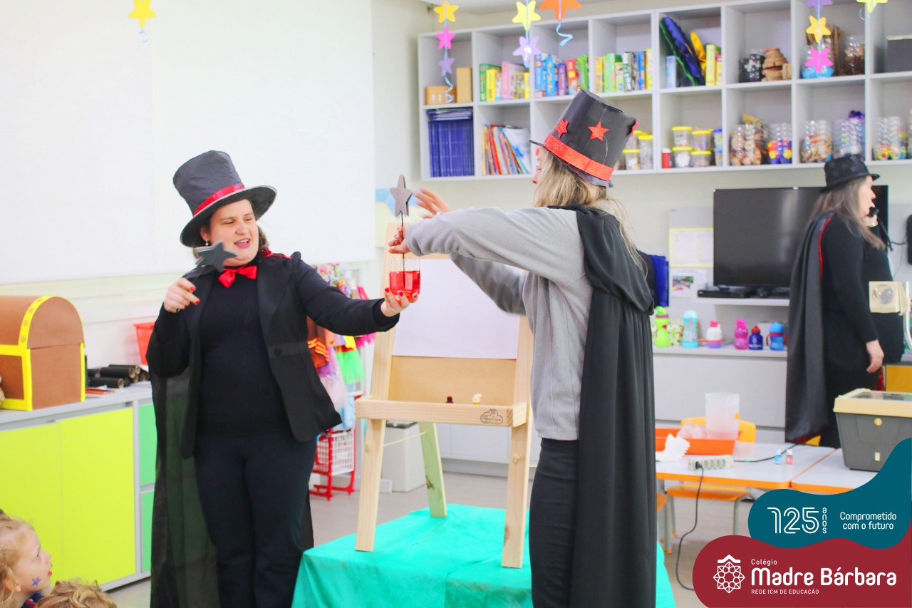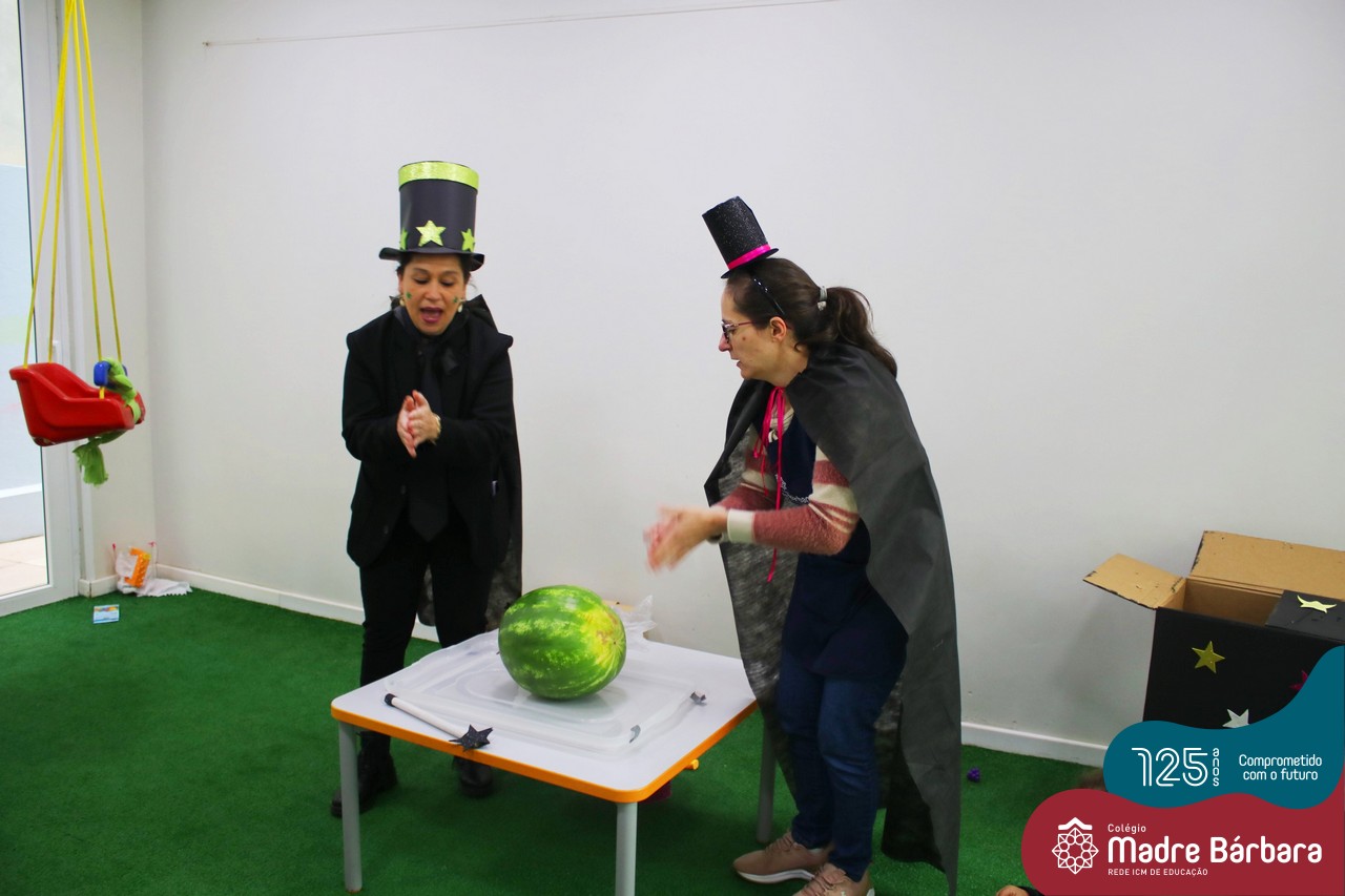 O primeiro dia da Semana da Criança foi marcado por encanto e magia. As crianças foram recebidas em um ambiente especialmente preparado com muita cor, cartolas e estrelas! O dia foi de mágicas que empolgaram as crianças e professoras. Abracadabra…simsalabim!!!