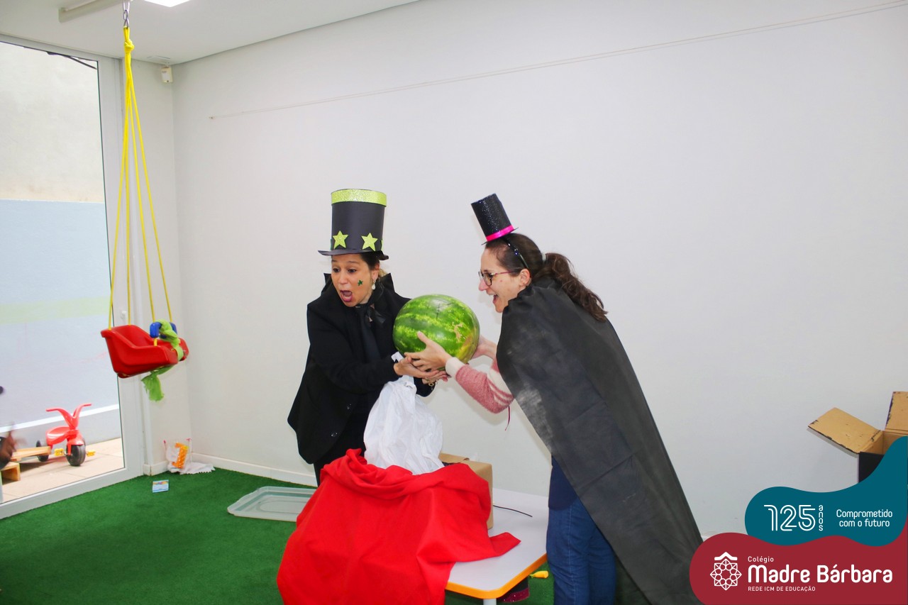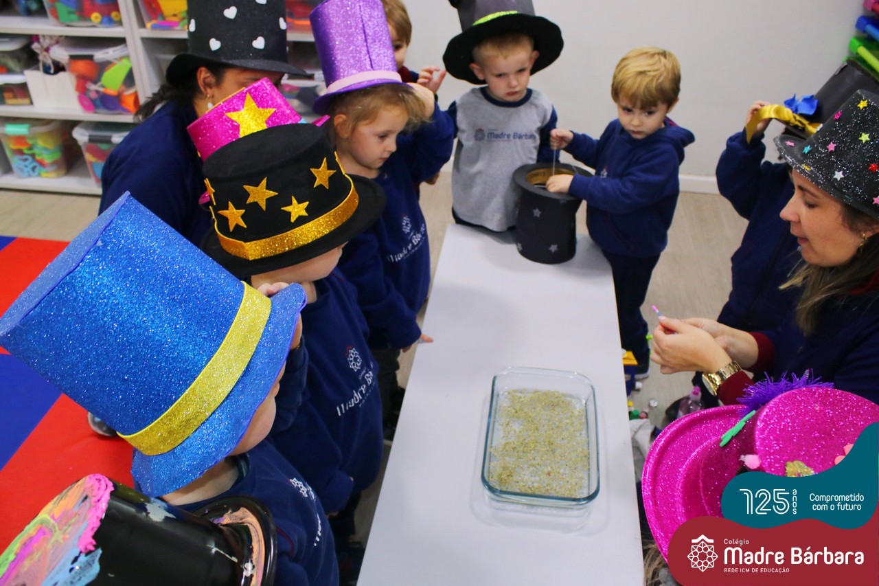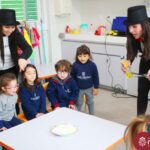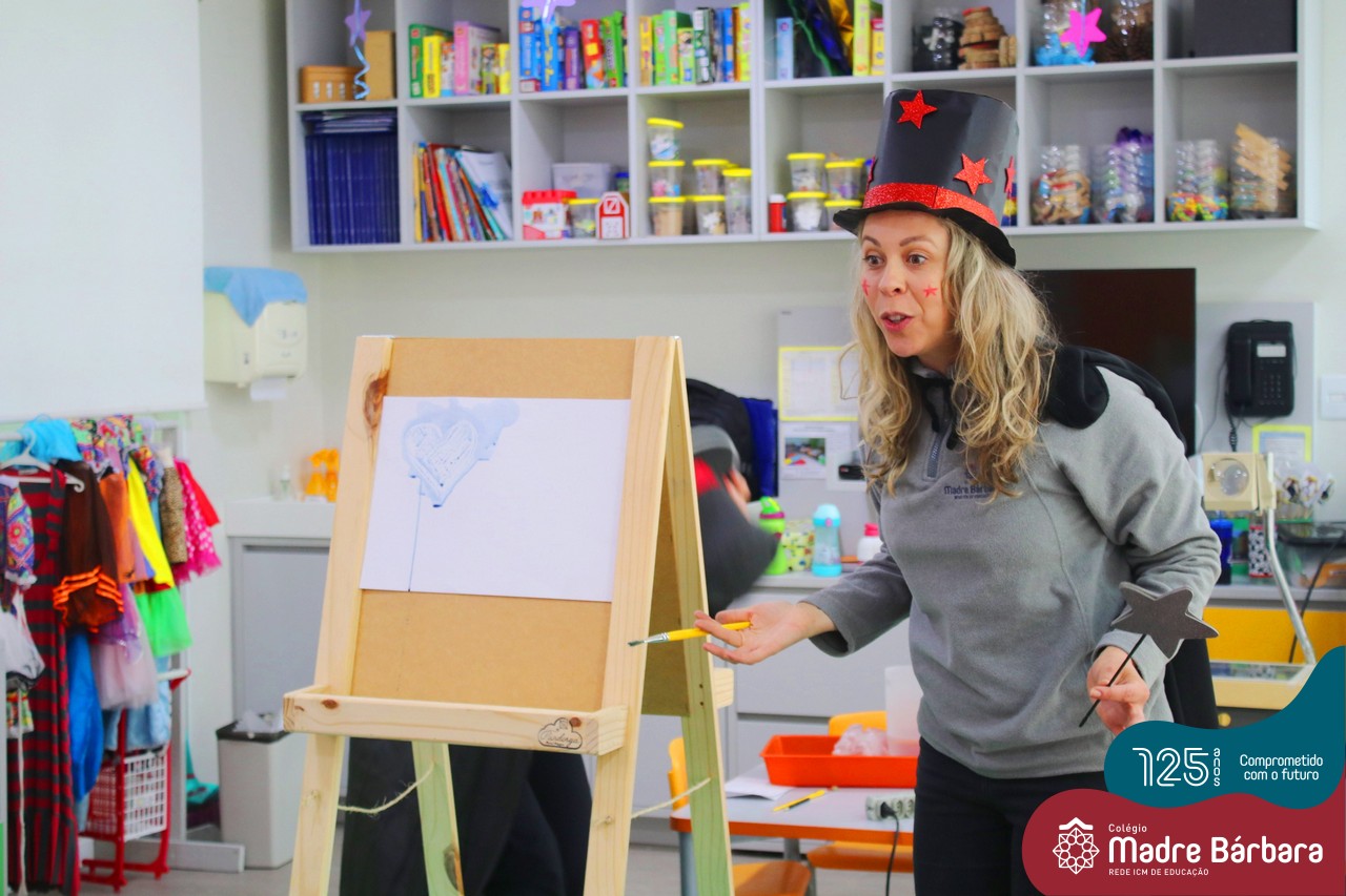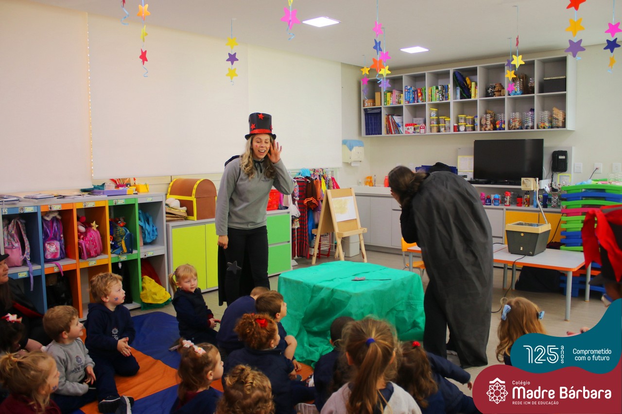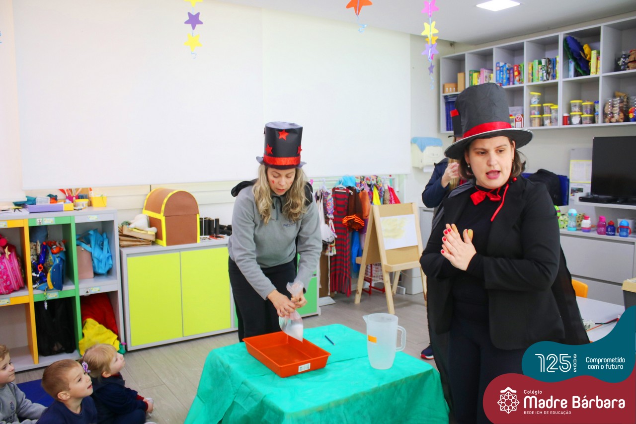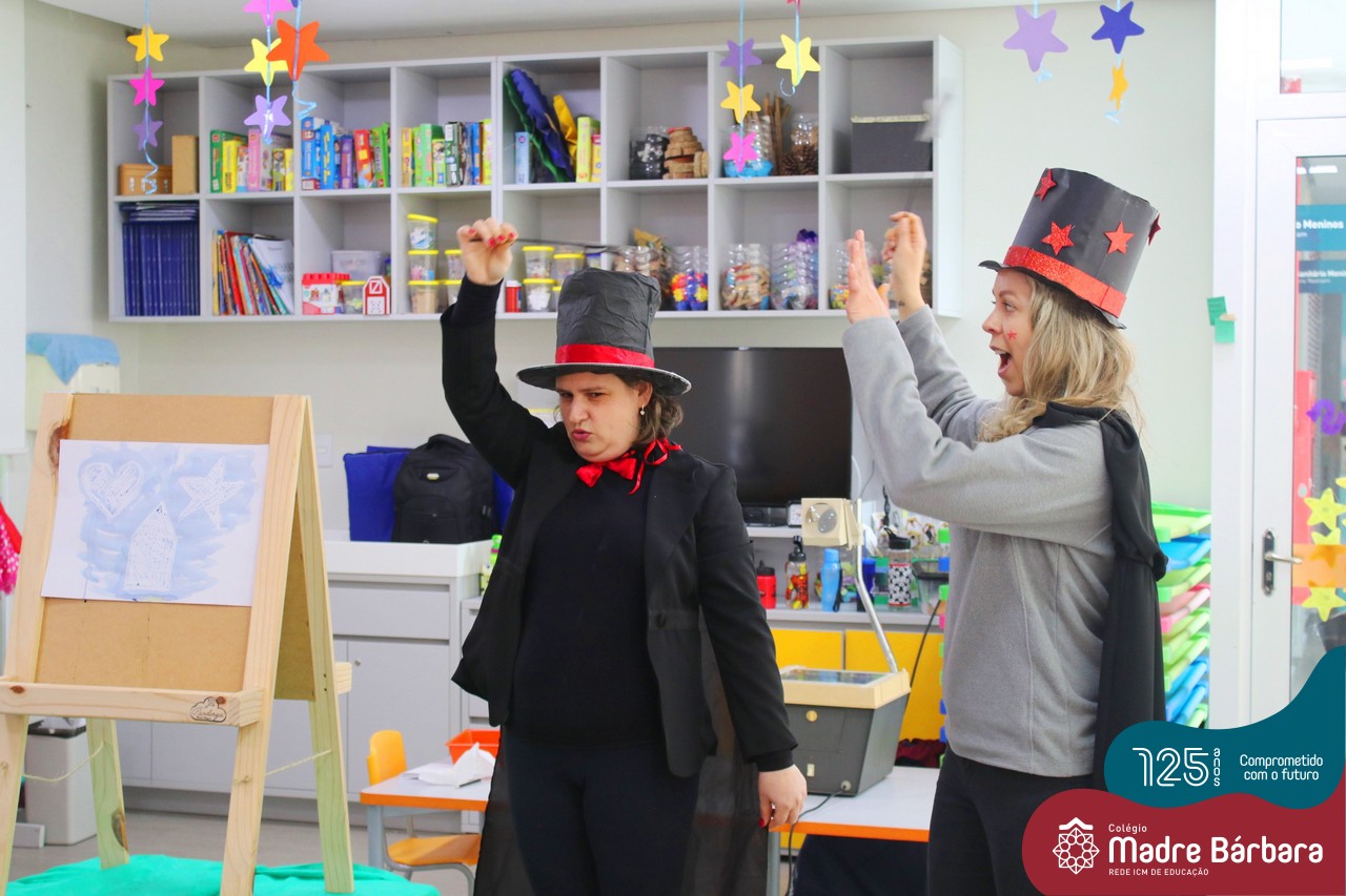 O primeiro dia da Semana da Criança foi marcado por encanto e magia. As crianças foram recebidas em um ambiente especialmente preparado com muita cor, cartolas e estrelas! O dia foi de mágicas que empolgaram as crianças e professoras. Abracadabra…simsalabim!!!