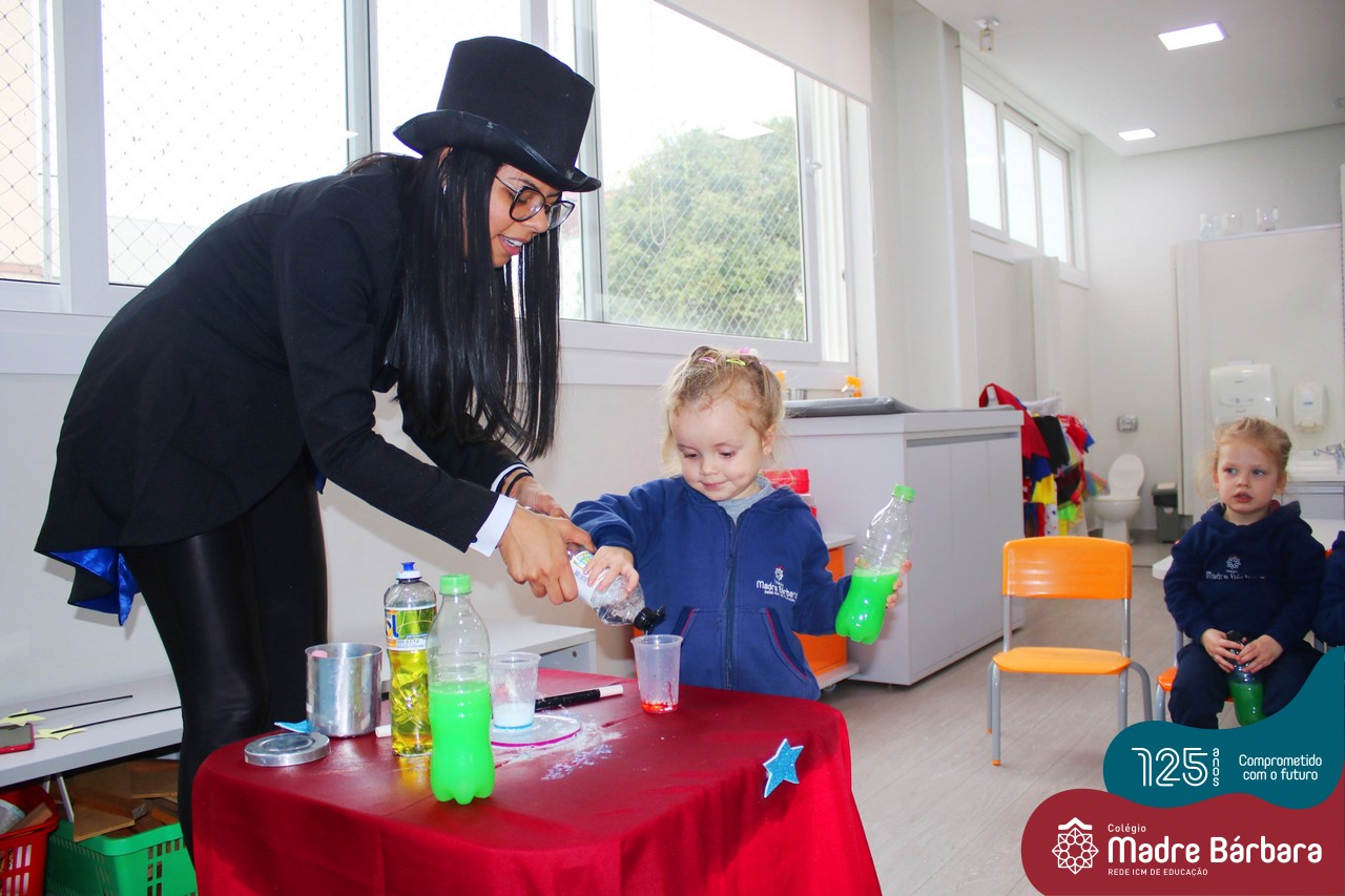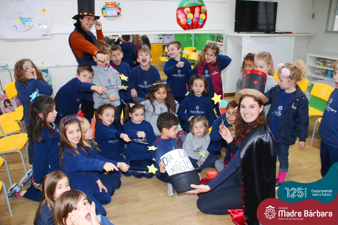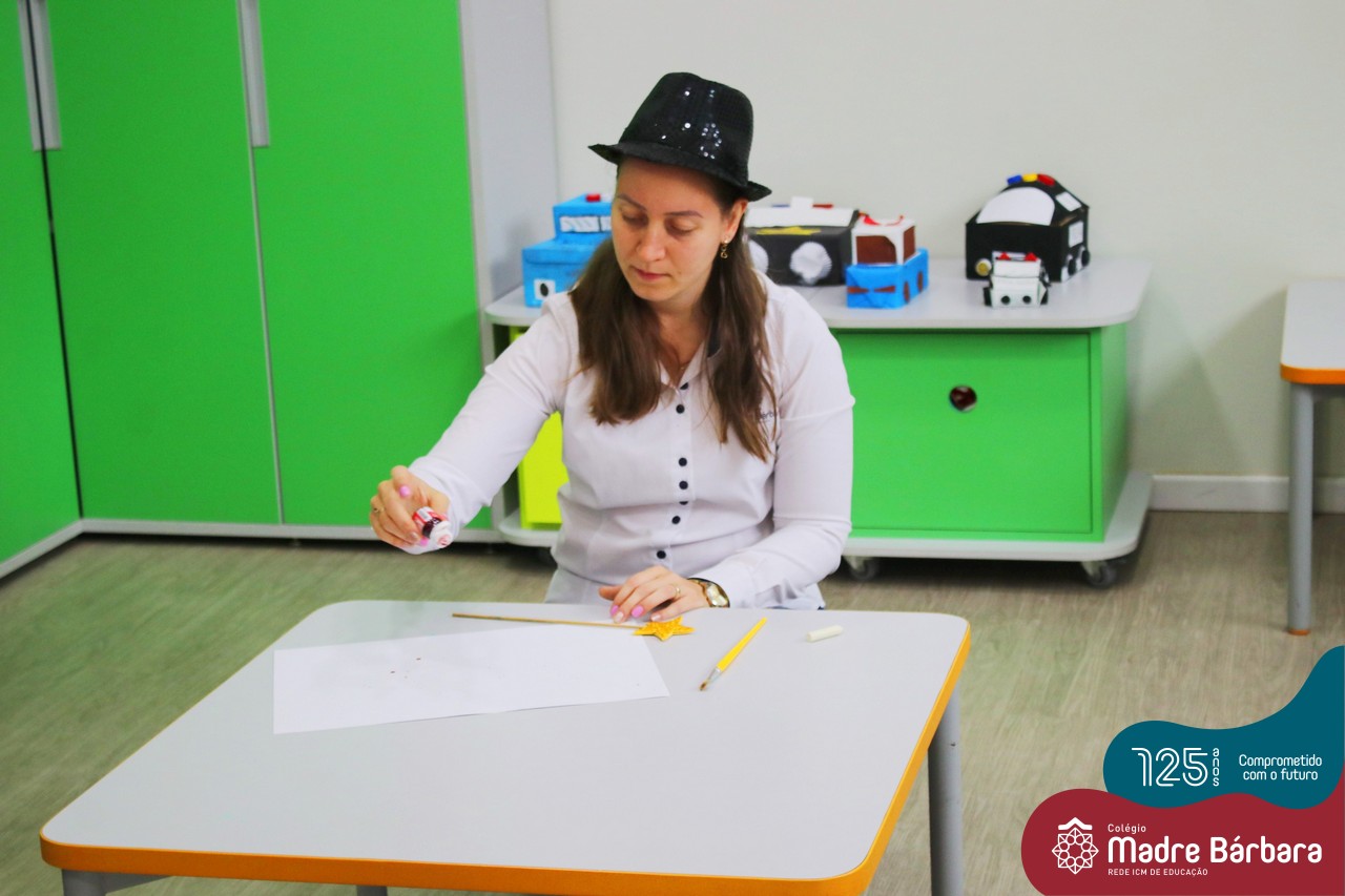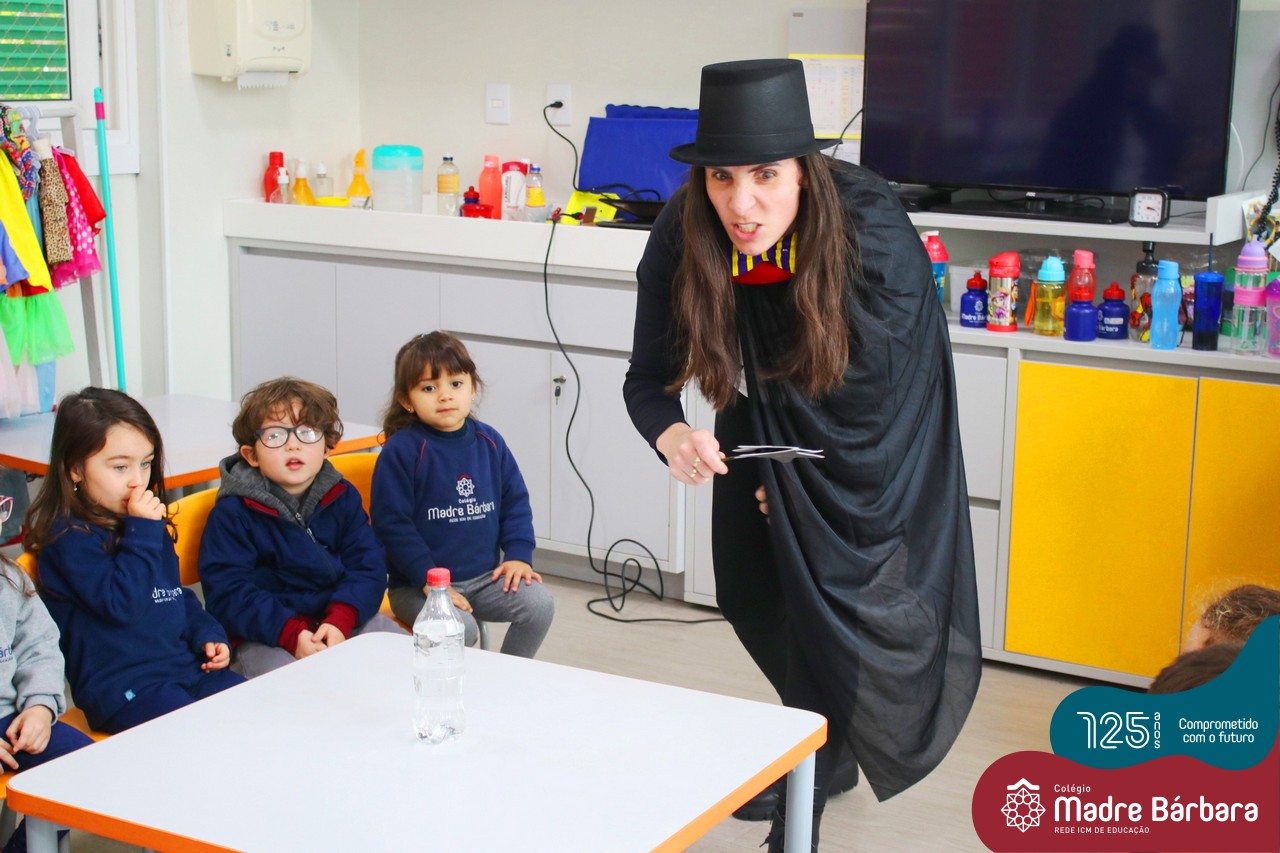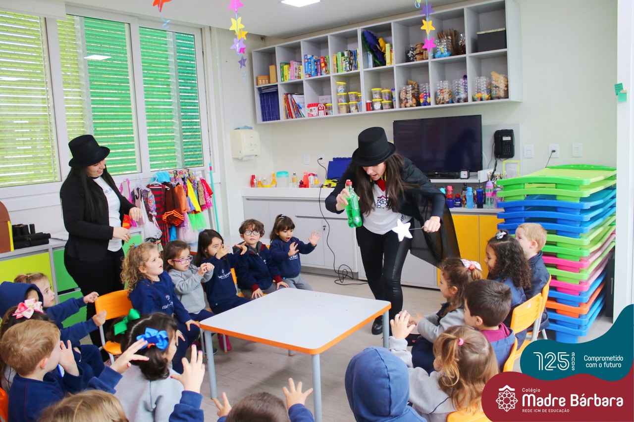 O primeiro dia da Semana da Criança foi marcado por encanto e magia. As crianças foram recebidas em um ambiente especialmente preparado com muita cor, cartolas e estrelas! O dia foi de mágicas que empolgaram as crianças e professoras. Abracadabra…simsalabim!!!