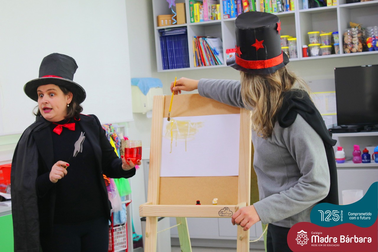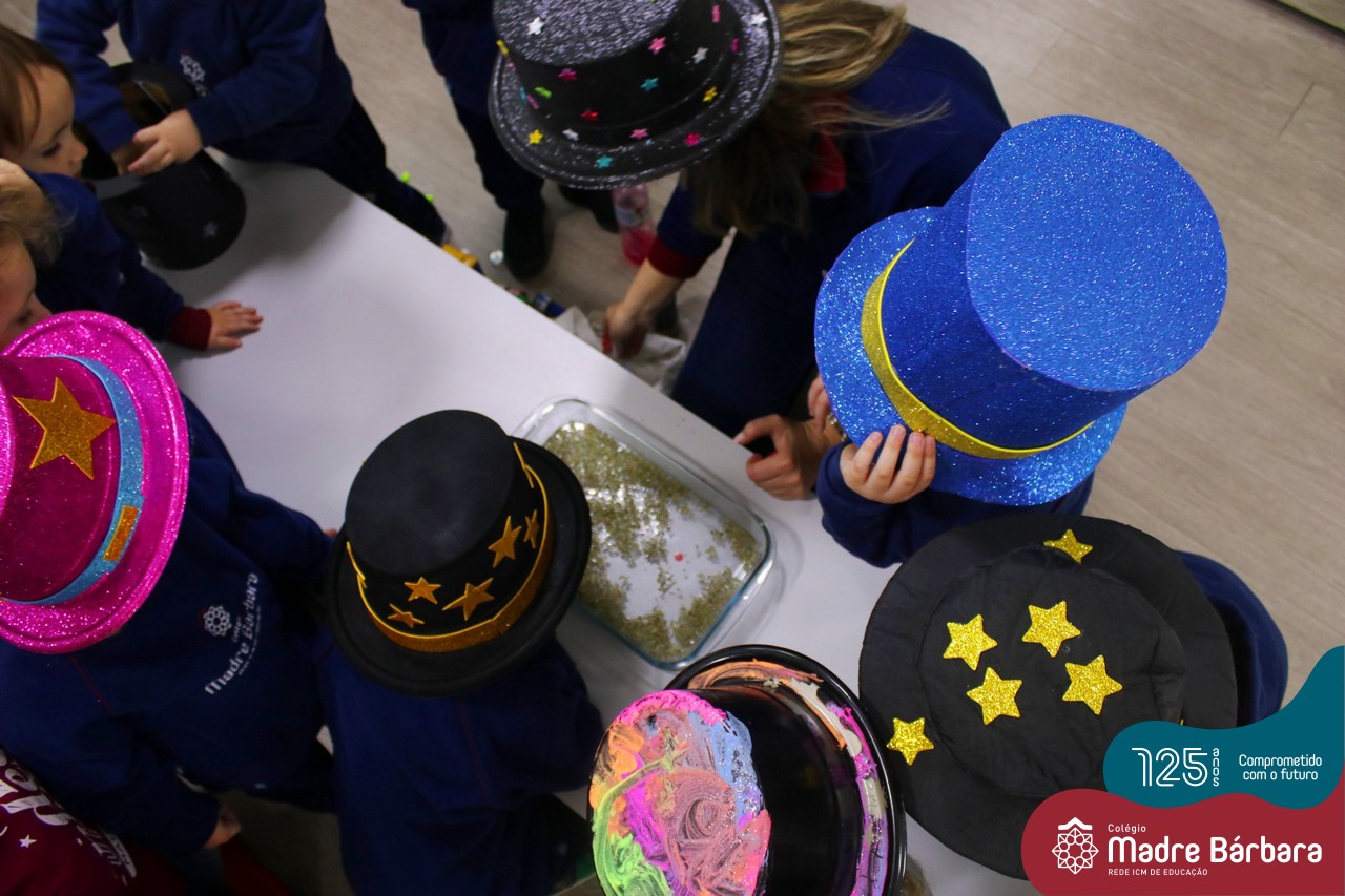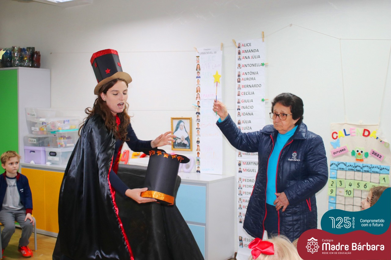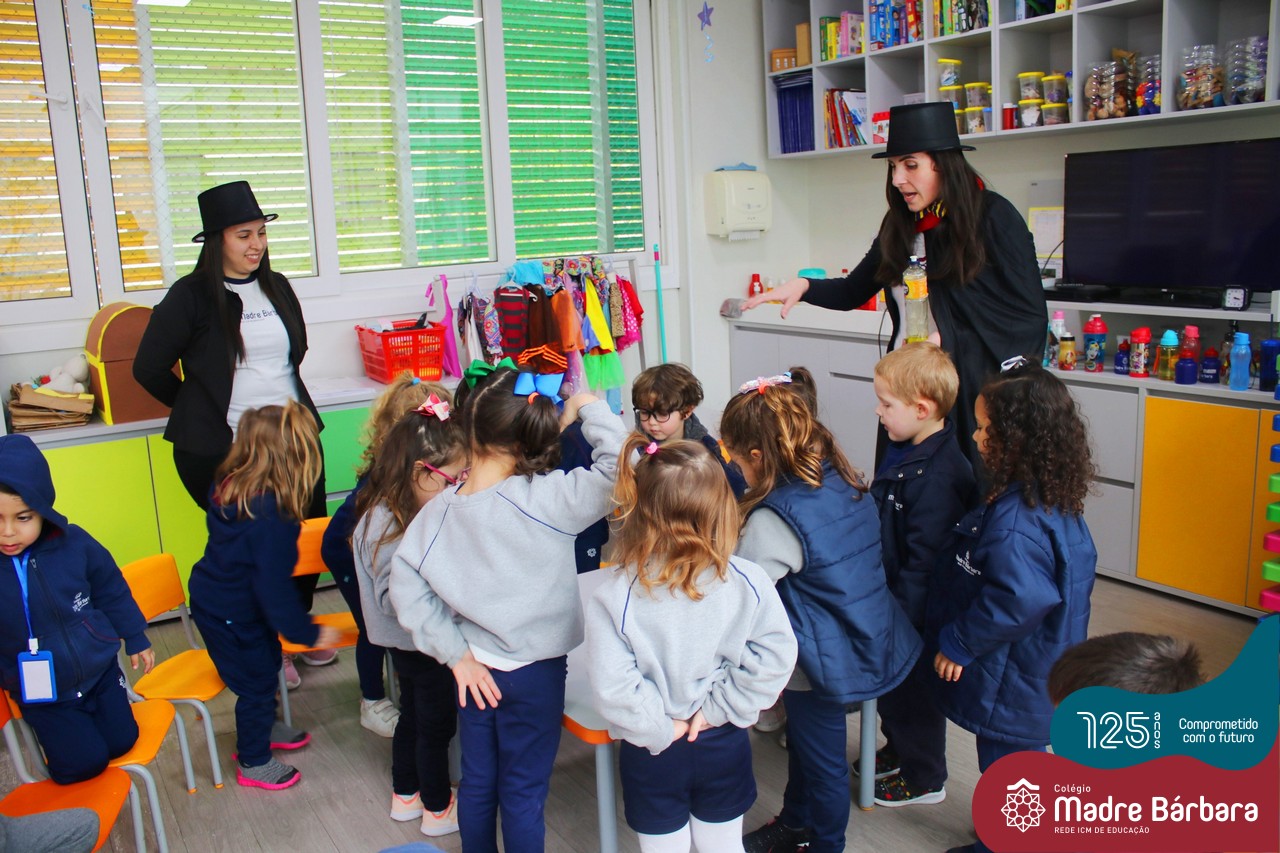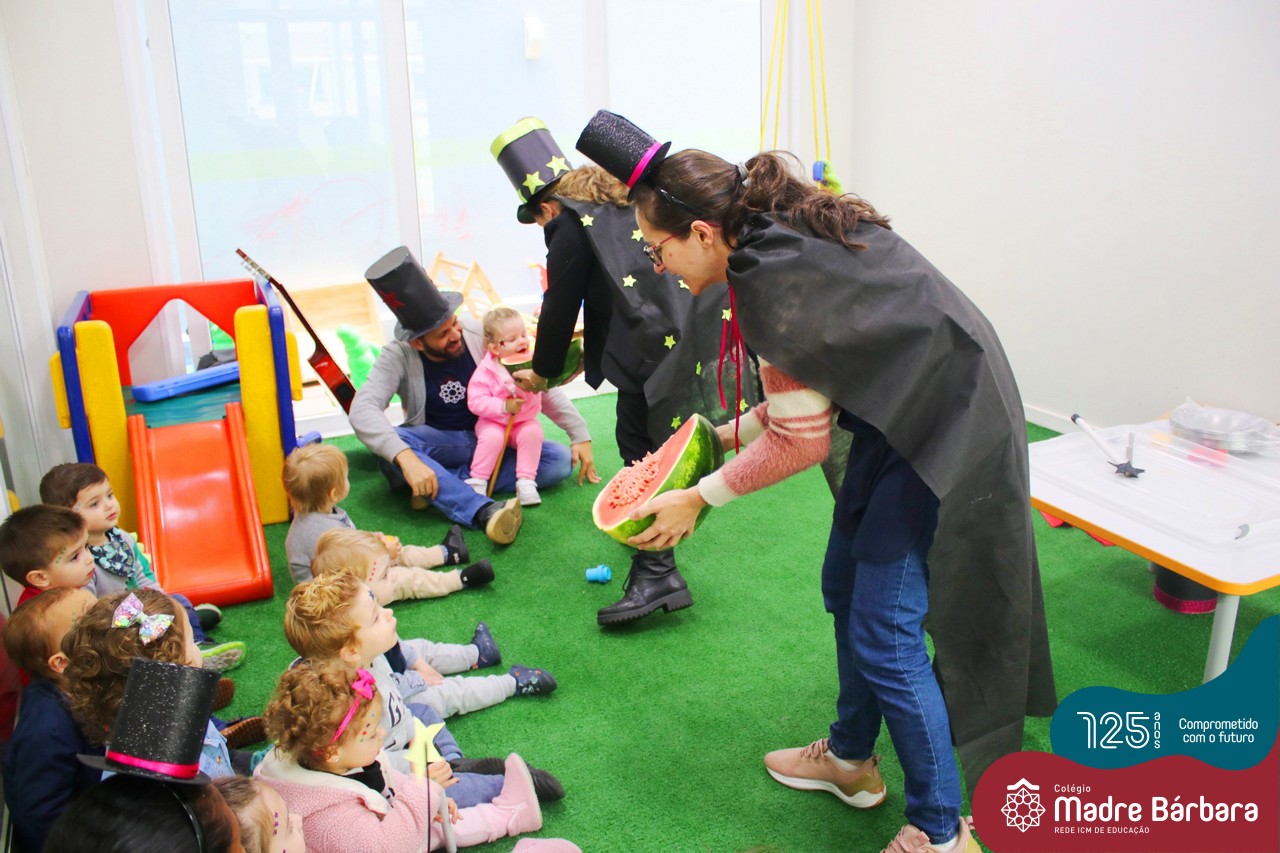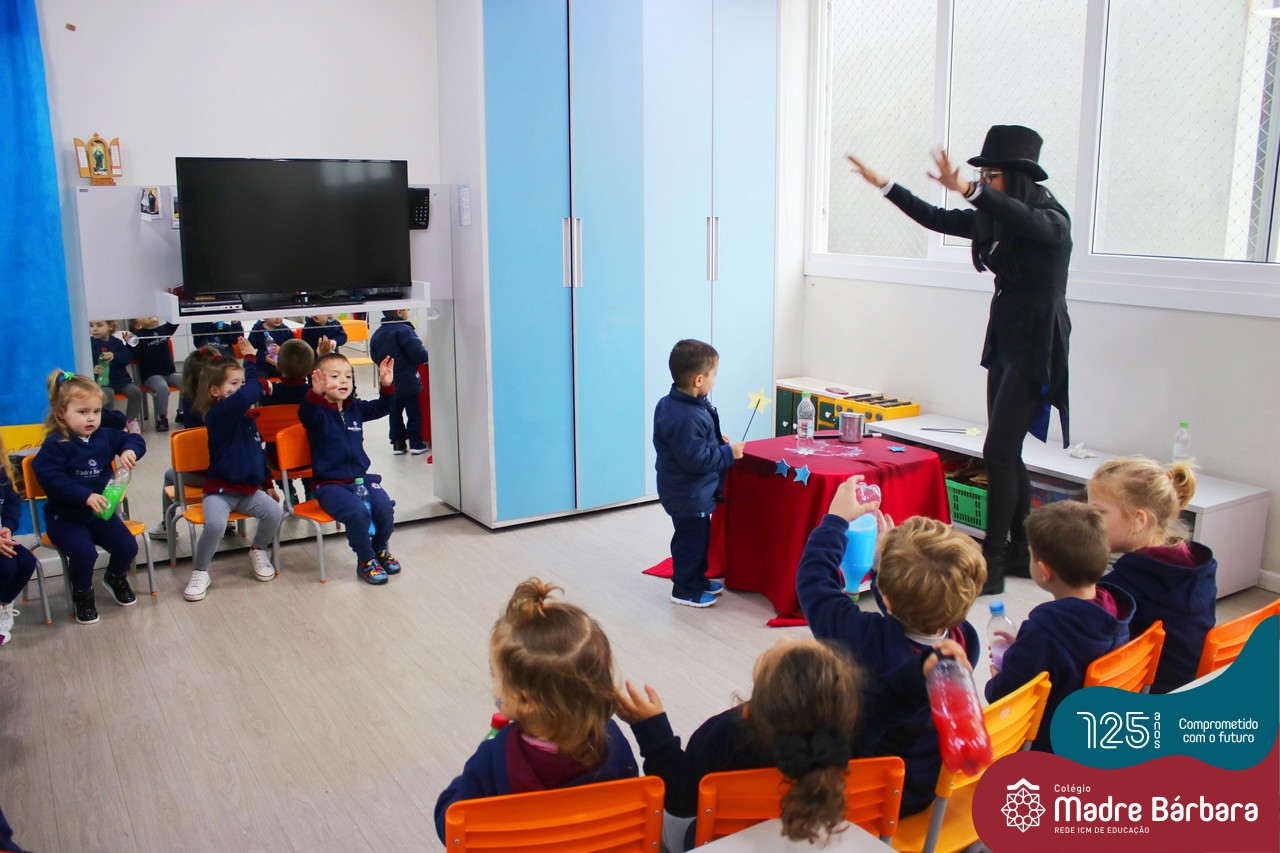 O primeiro dia da Semana da Criança foi marcado por encanto e magia. As crianças foram recebidas em um ambiente especialmente preparado com muita cor, cartolas e estrelas! O dia foi de mágicas que empolgaram as crianças e professoras. Abracadabra…simsalabim!!!