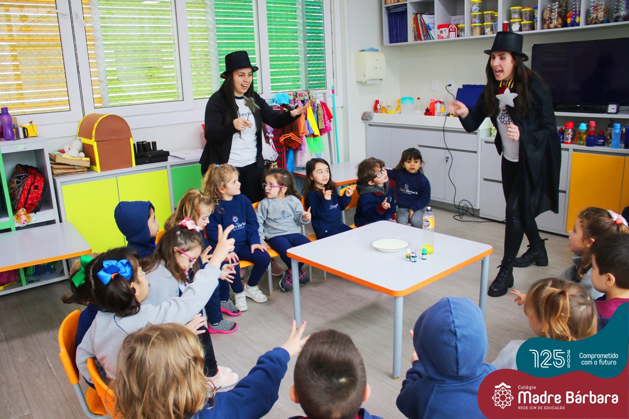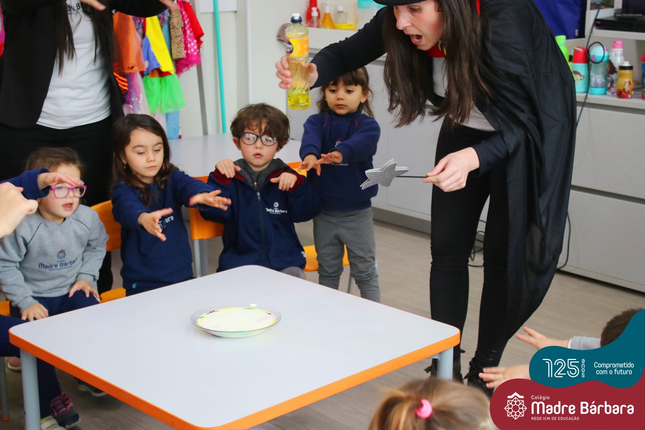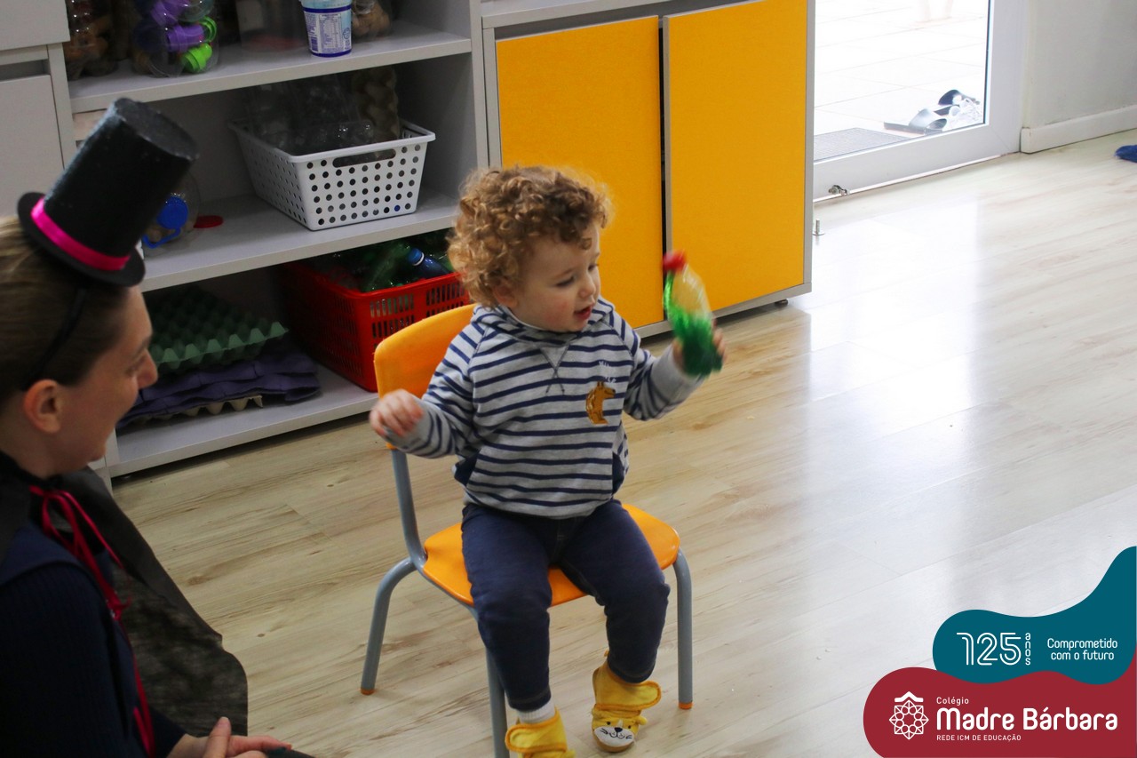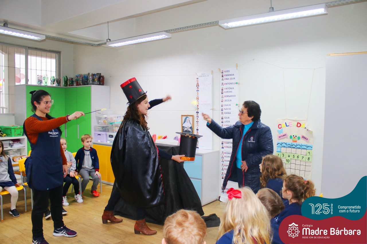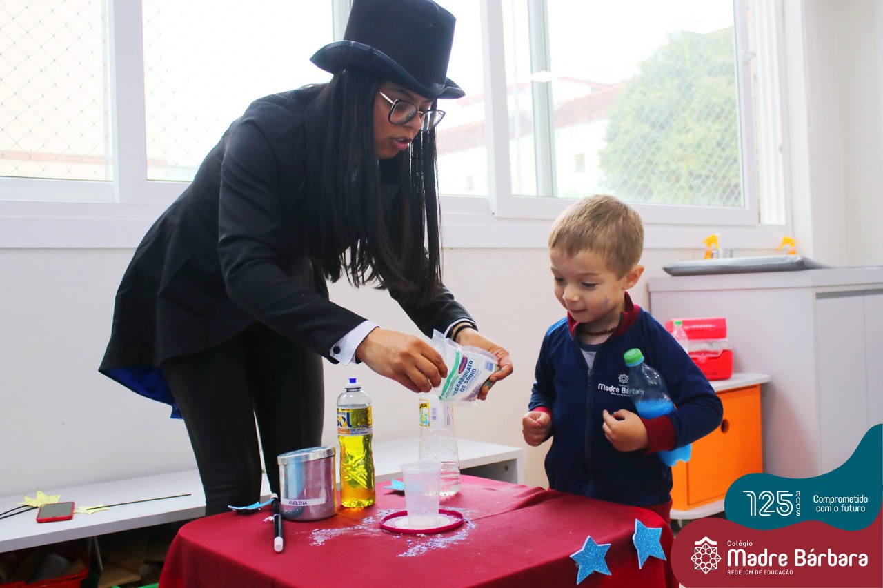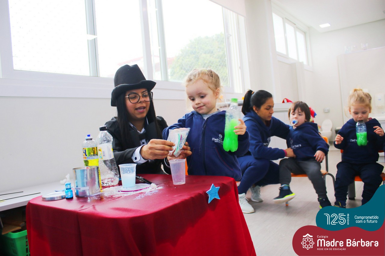 O primeiro dia da Semana da Criança foi marcado por encanto e magia. As crianças foram recebidas em um ambiente especialmente preparado com muita cor, cartolas e estrelas! O dia foi de mágicas que empolgaram as crianças e professoras. Abracadabra…simsalabim!!!