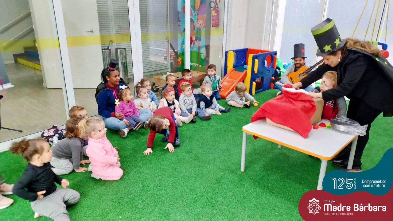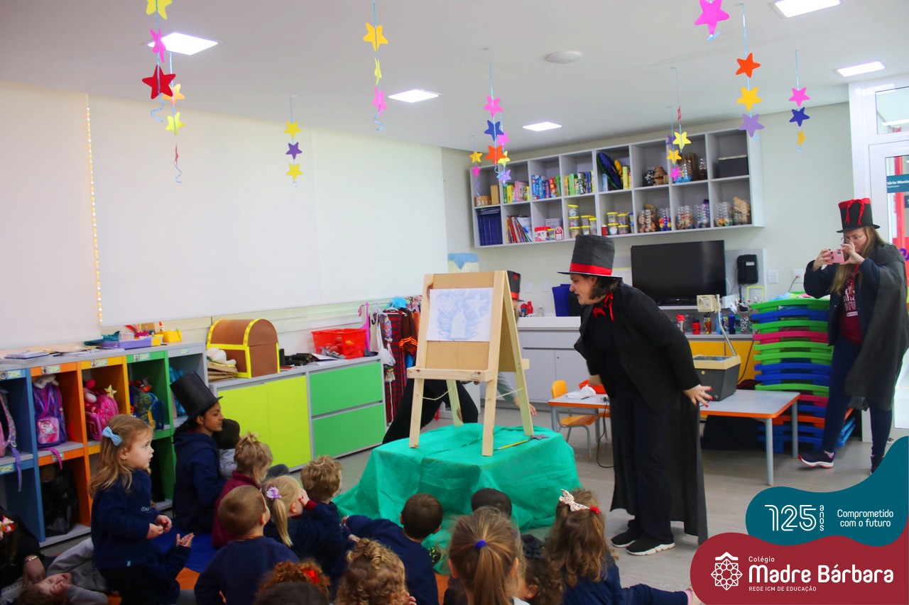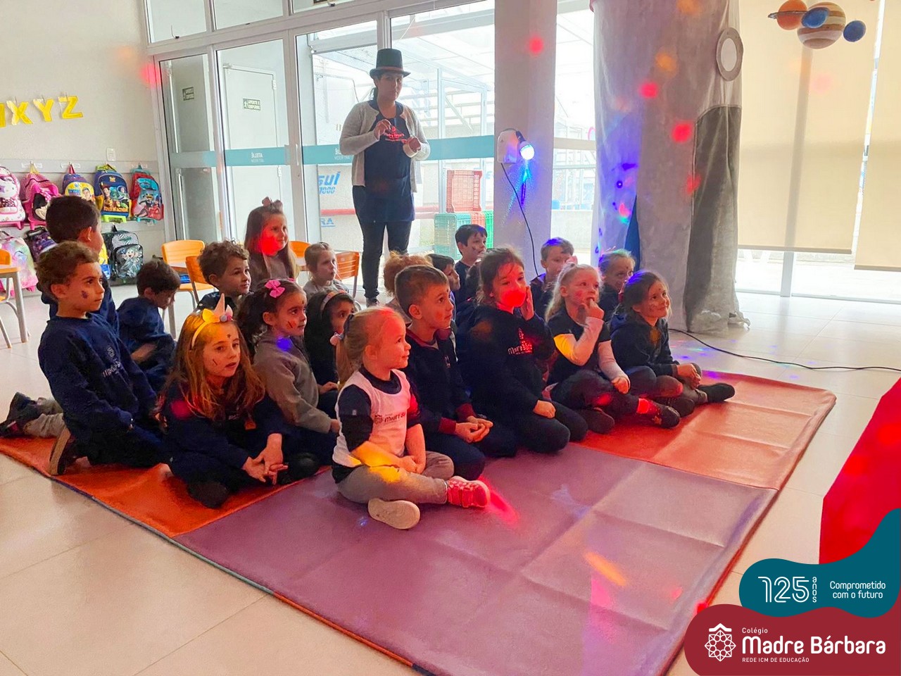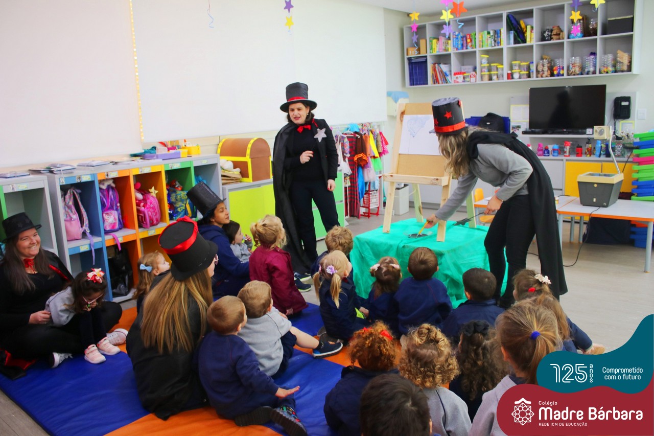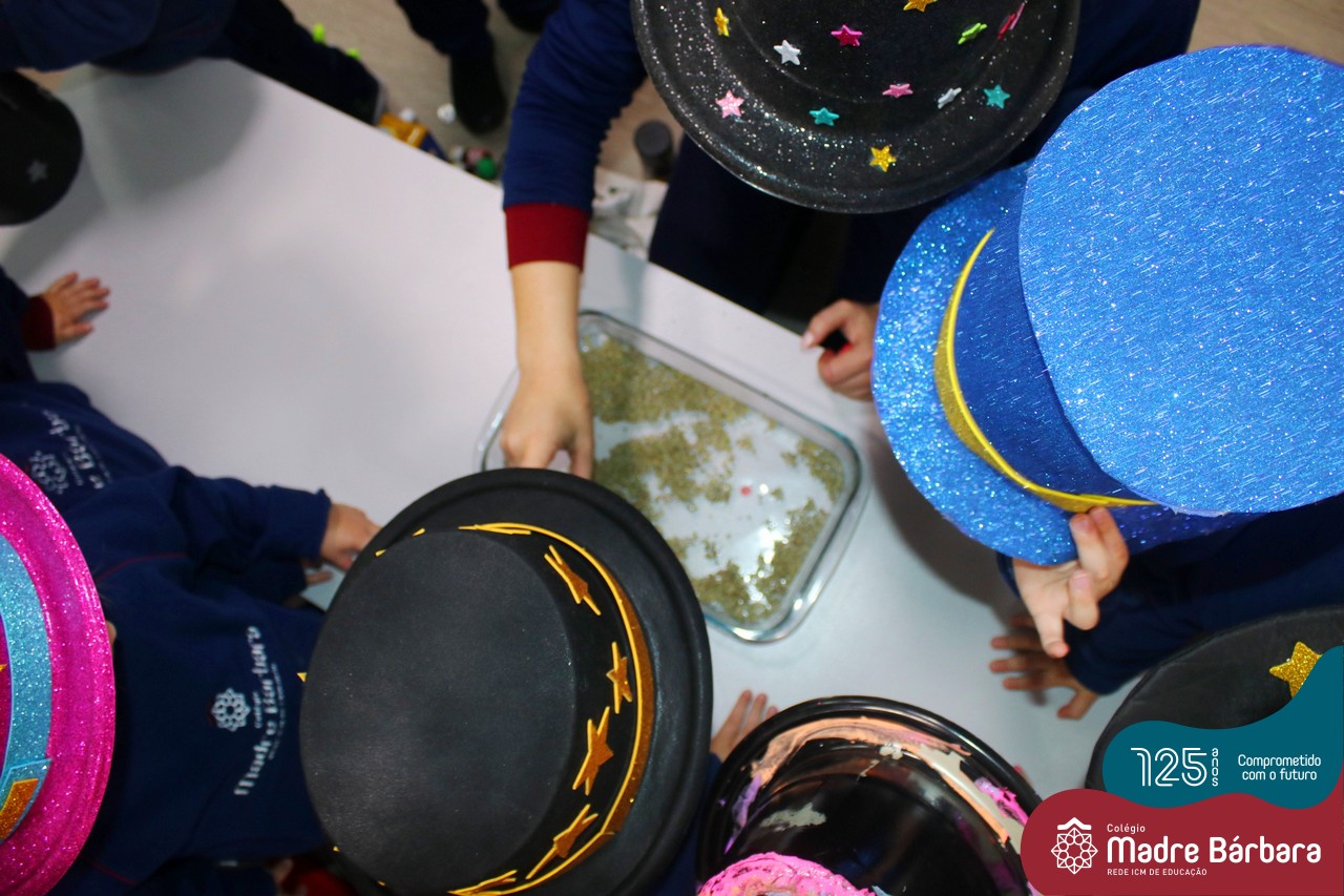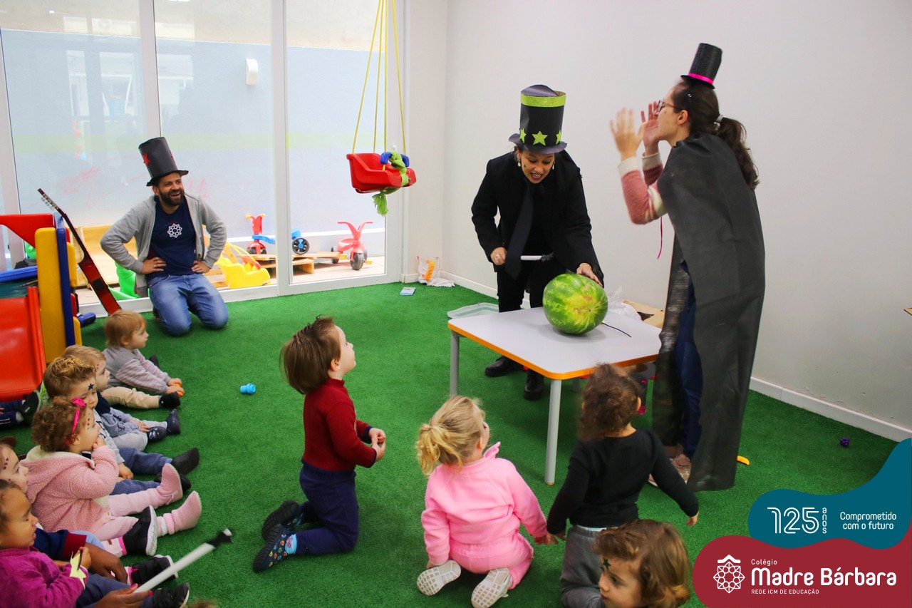 O primeiro dia da Semana da Criança foi marcado por encanto e magia. As crianças foram recebidas em um ambiente especialmente preparado com muita cor, cartolas e estrelas! O dia foi de mágicas que empolgaram as crianças e professoras. Abracadabra…simsalabim!!!