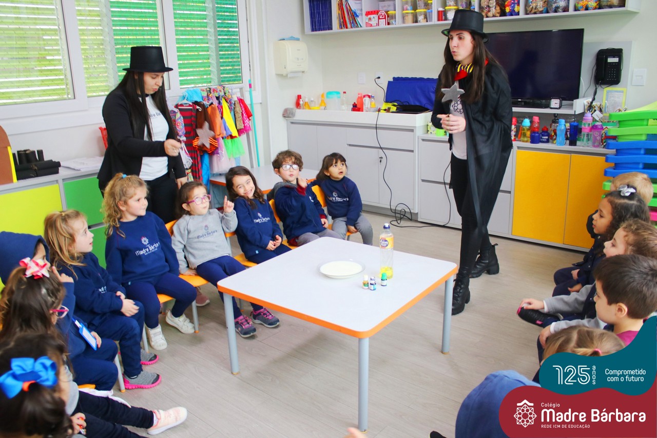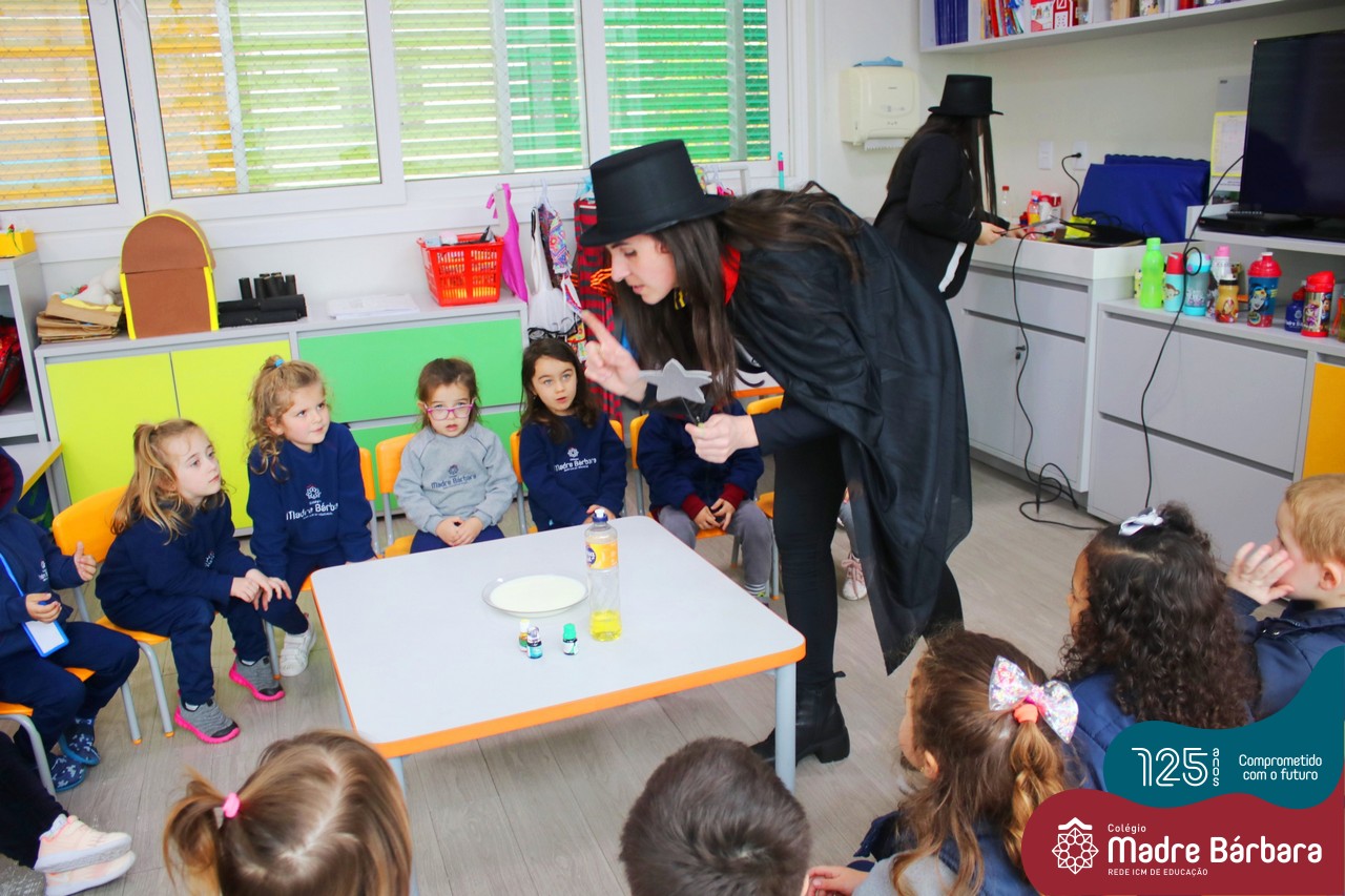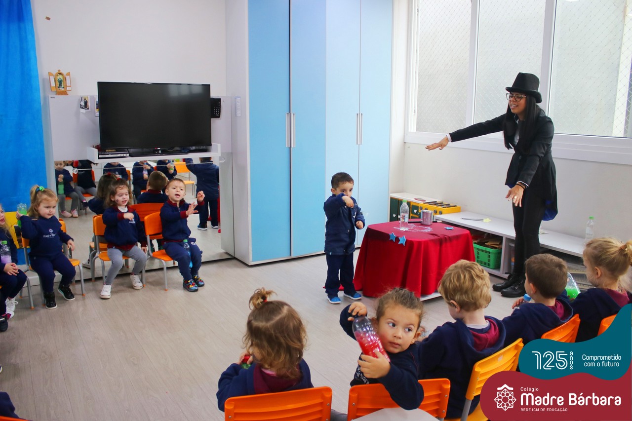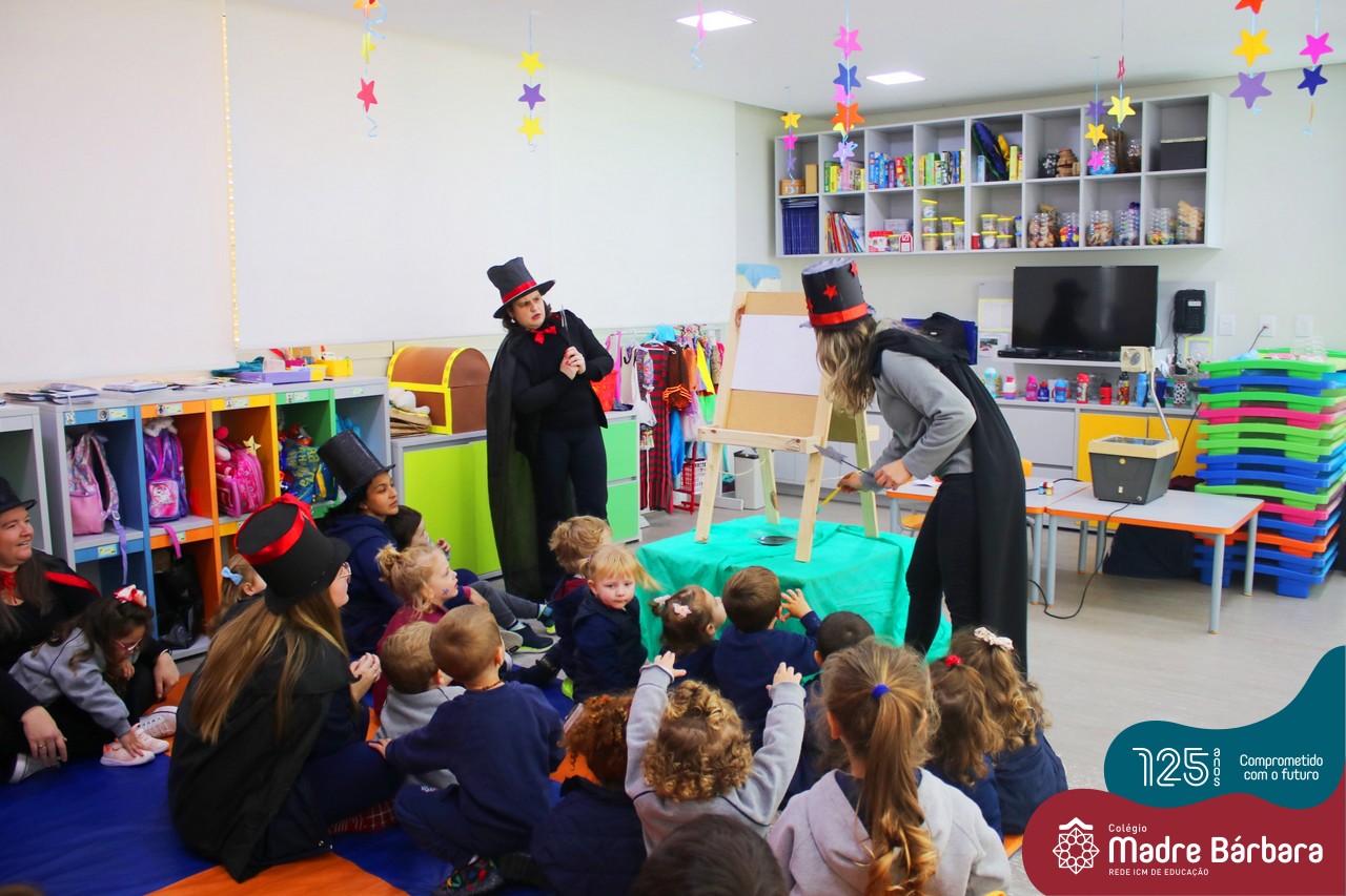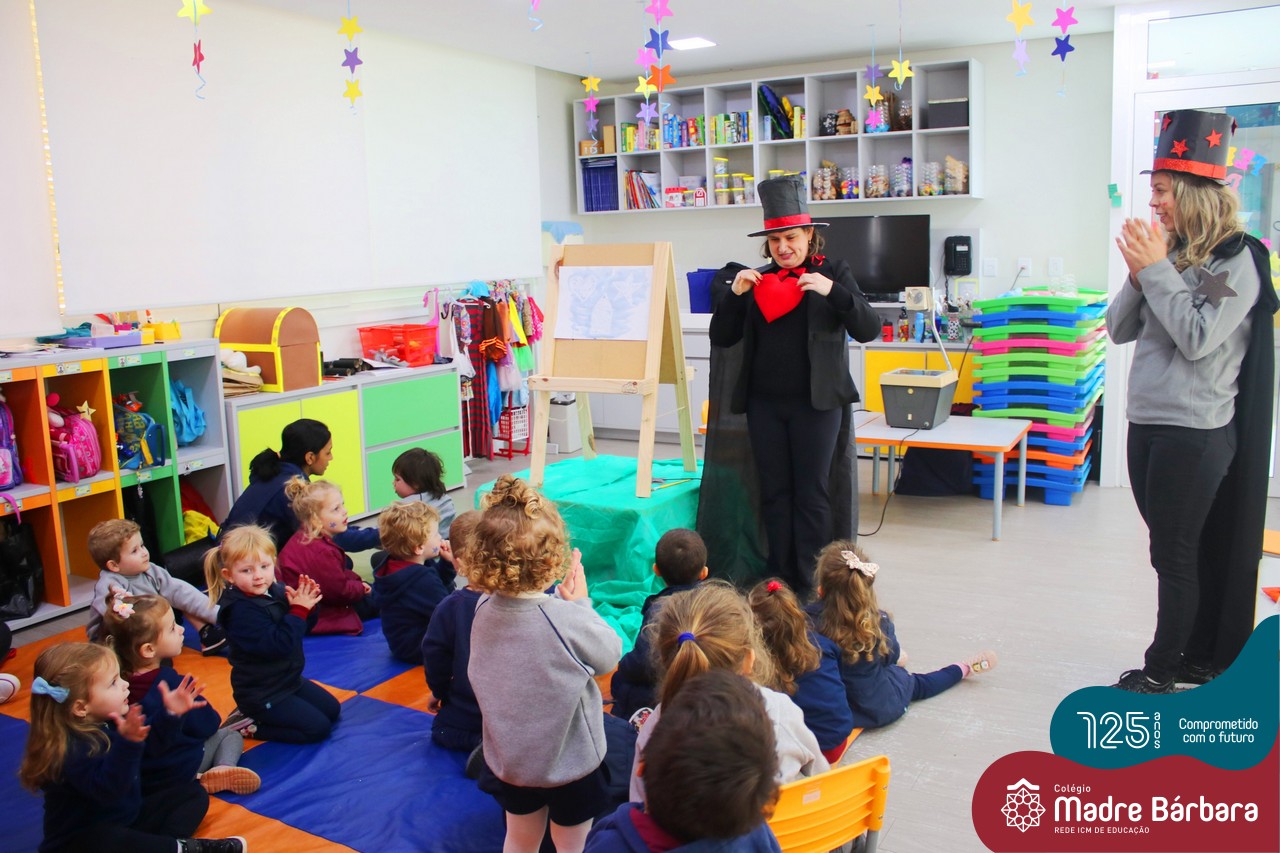 O primeiro dia da Semana da Criança foi marcado por encanto e magia. As crianças foram recebidas em um ambiente especialmente preparado com muita cor, cartolas e estrelas! O dia foi de mágicas que empolgaram as crianças e professoras. Abracadabra…simsalabim!!!