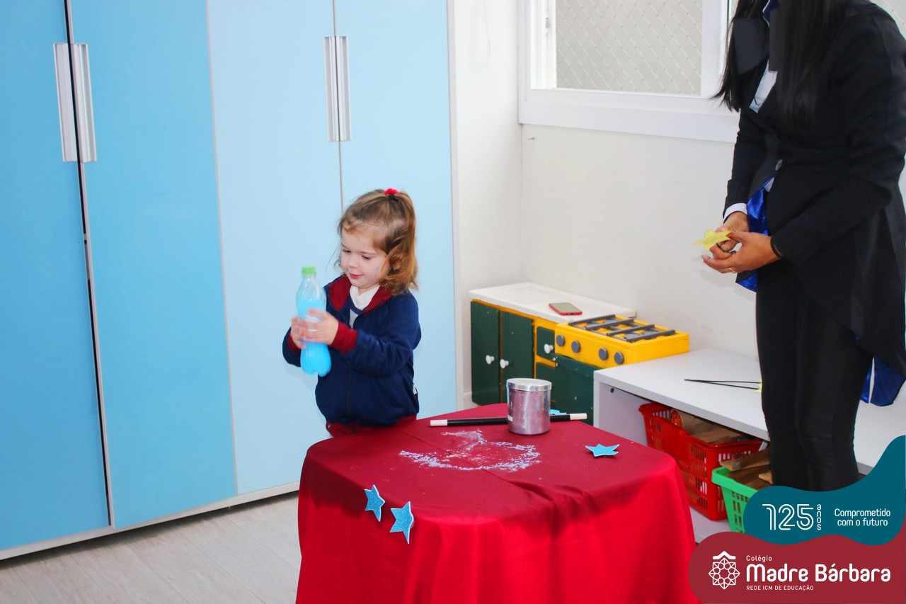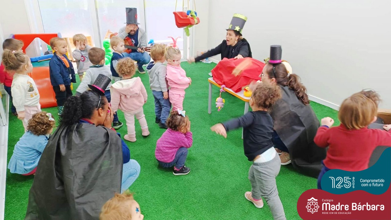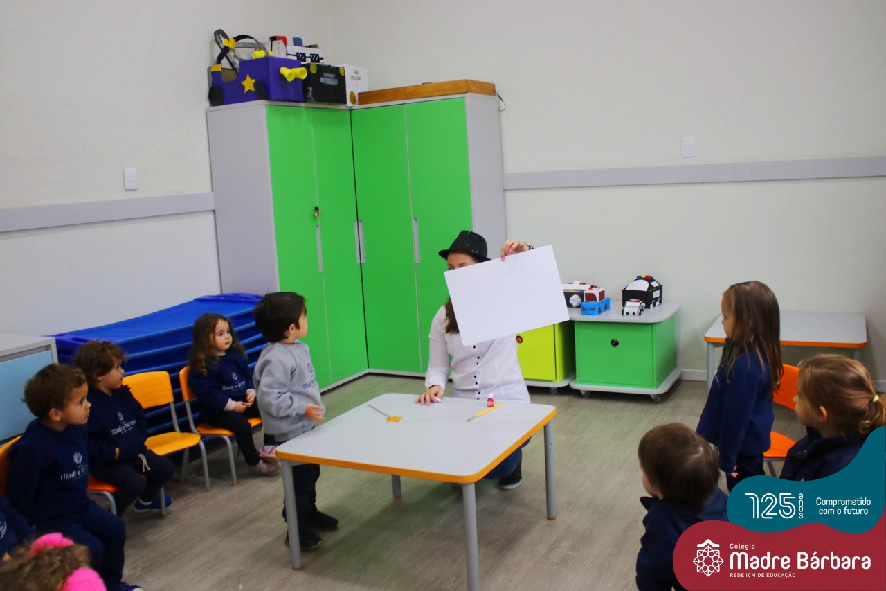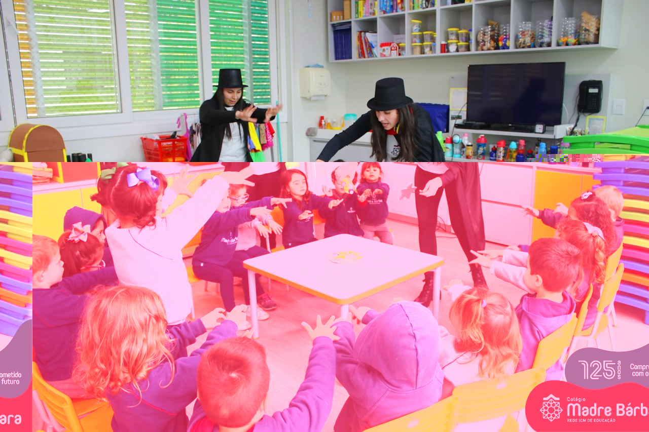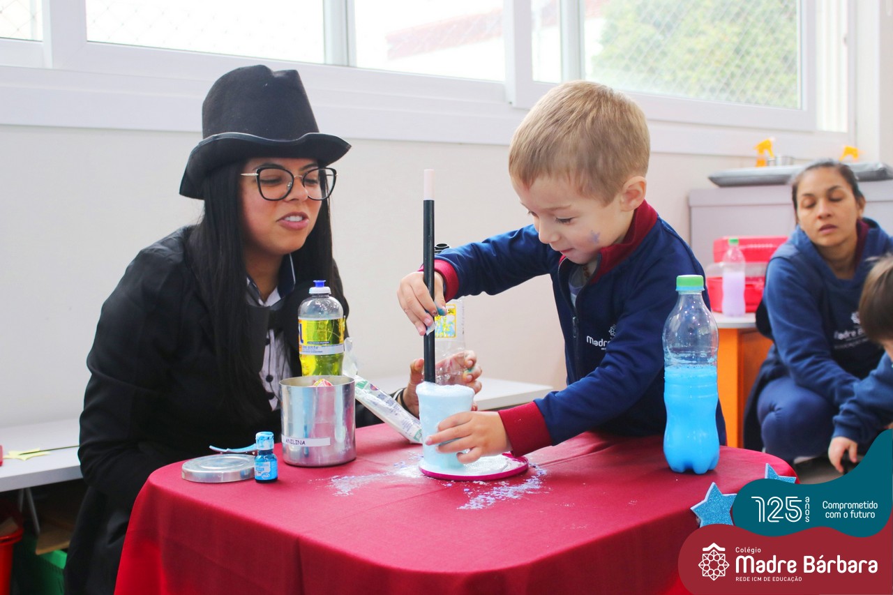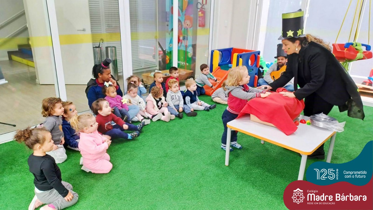 O primeiro dia da Semana da Criança foi marcado por encanto e magia. As crianças foram recebidas em um ambiente especialmente preparado com muita cor, cartolas e estrelas! O dia foi de mágicas que empolgaram as crianças e professoras. Abracadabra…simsalabim!!!