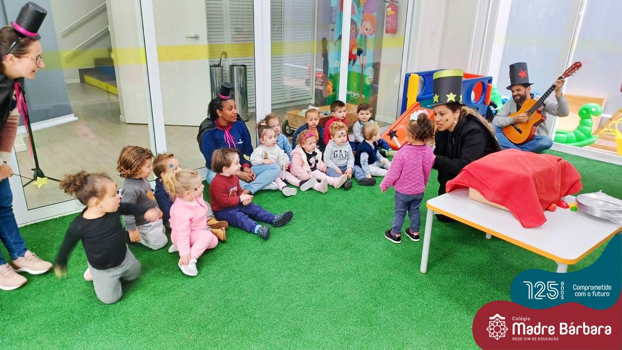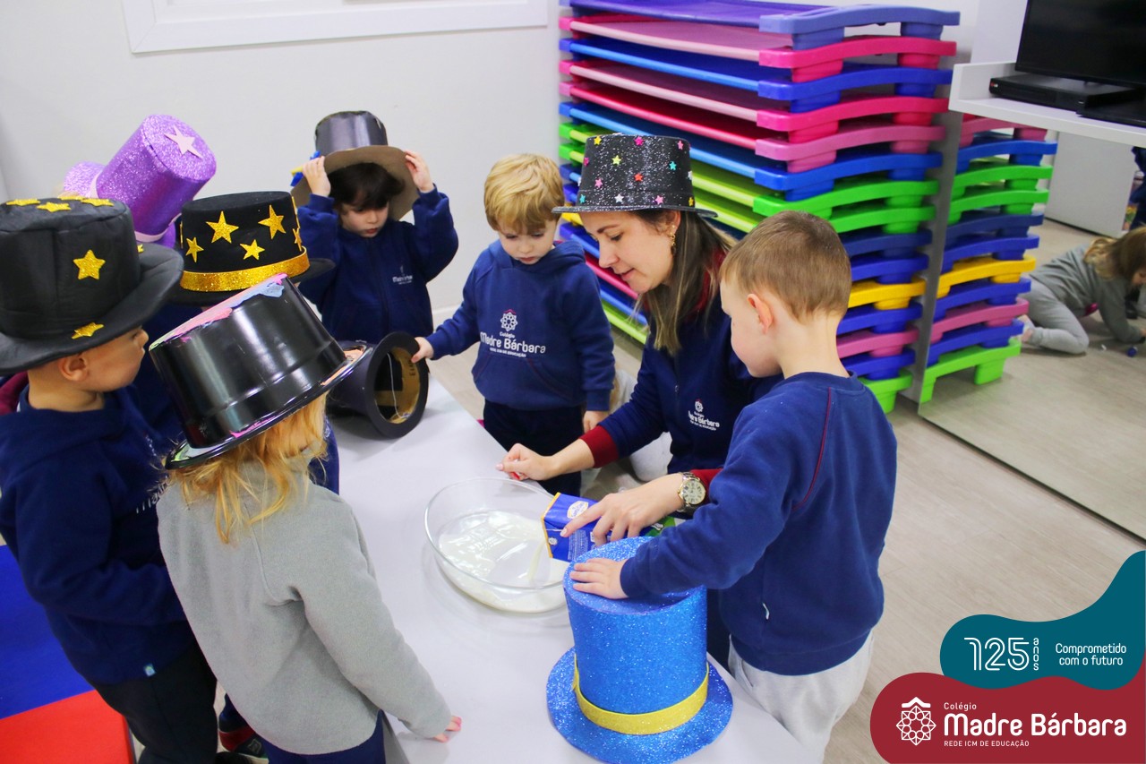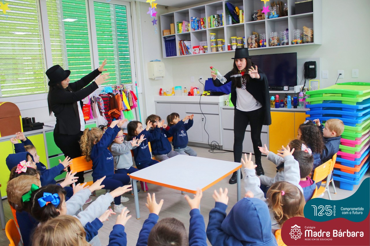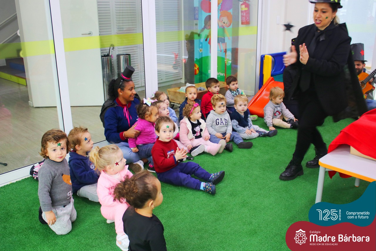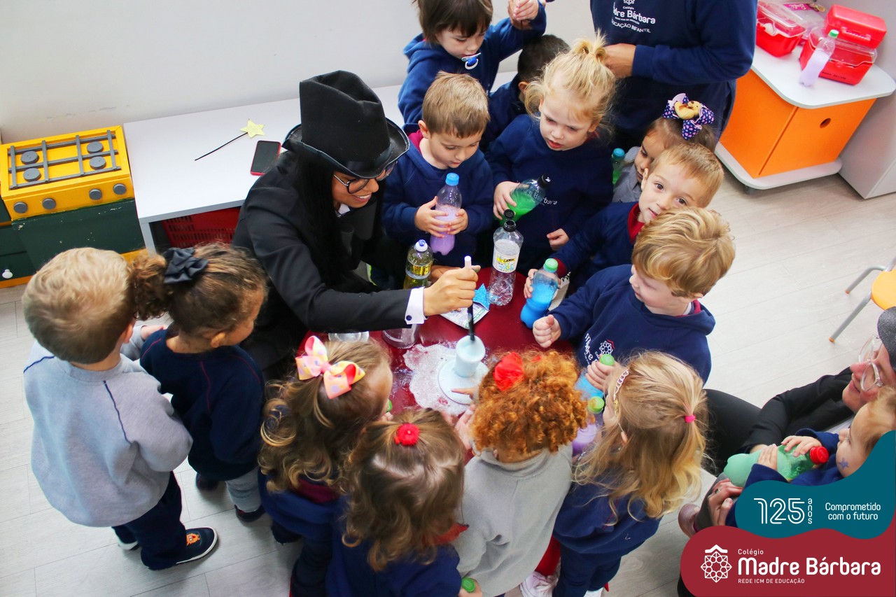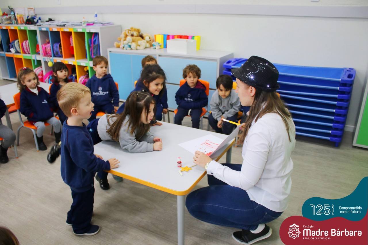 O primeiro dia da Semana da Criança foi marcado por encanto e magia. As crianças foram recebidas em um ambiente especialmente preparado com muita cor, cartolas e estrelas! O dia foi de mágicas que empolgaram as crianças e professoras. Abracadabra…simsalabim!!!