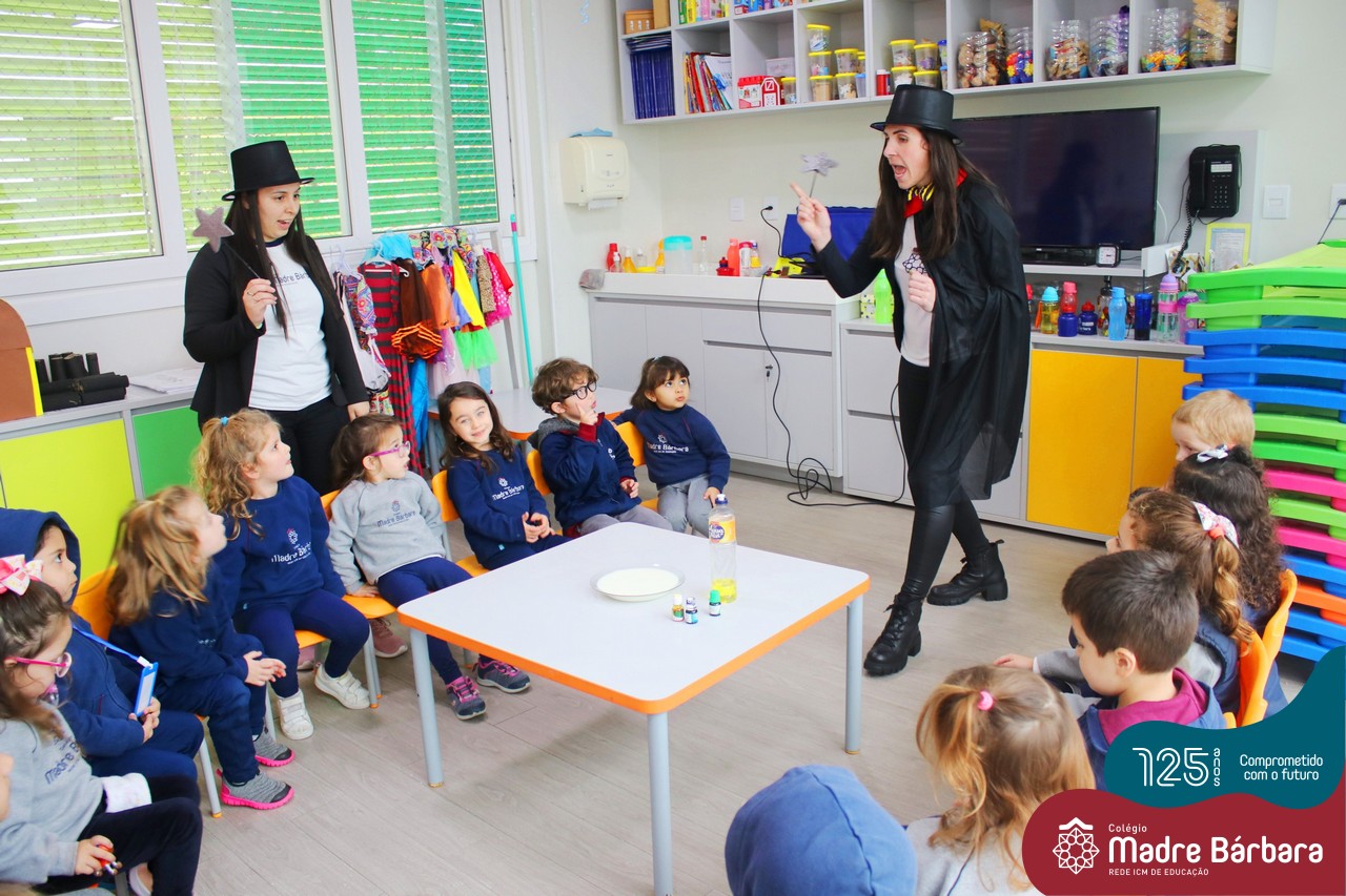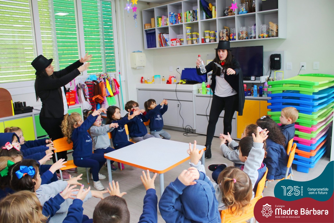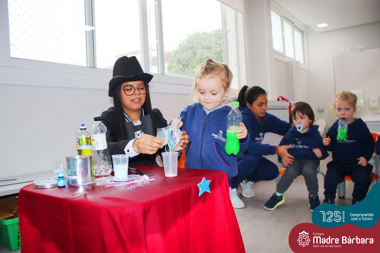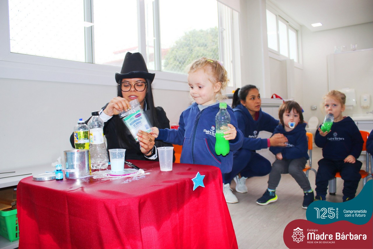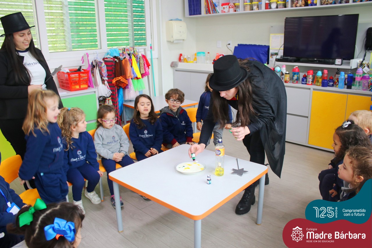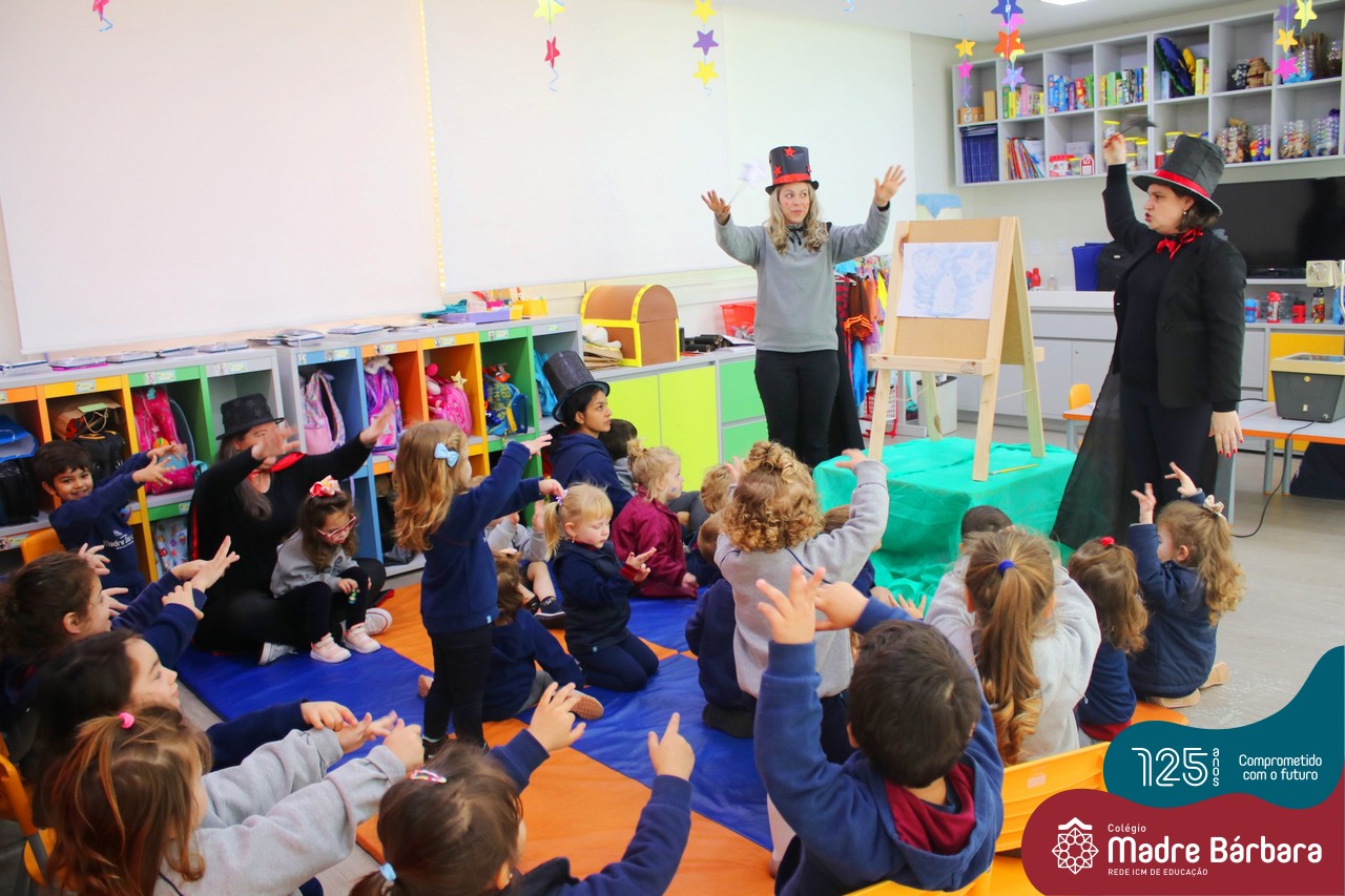 O primeiro dia da Semana da Criança foi marcado por encanto e magia. As crianças foram recebidas em um ambiente especialmente preparado com muita cor, cartolas e estrelas! O dia foi de mágicas que empolgaram as crianças e professoras. Abracadabra…simsalabim!!!