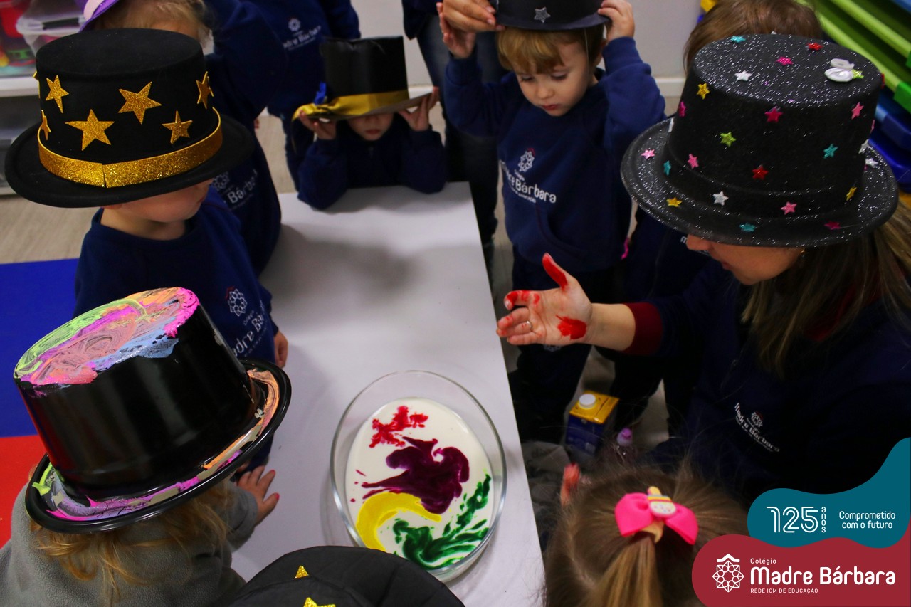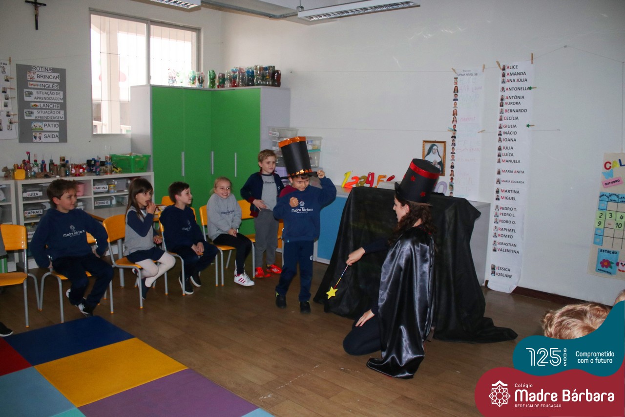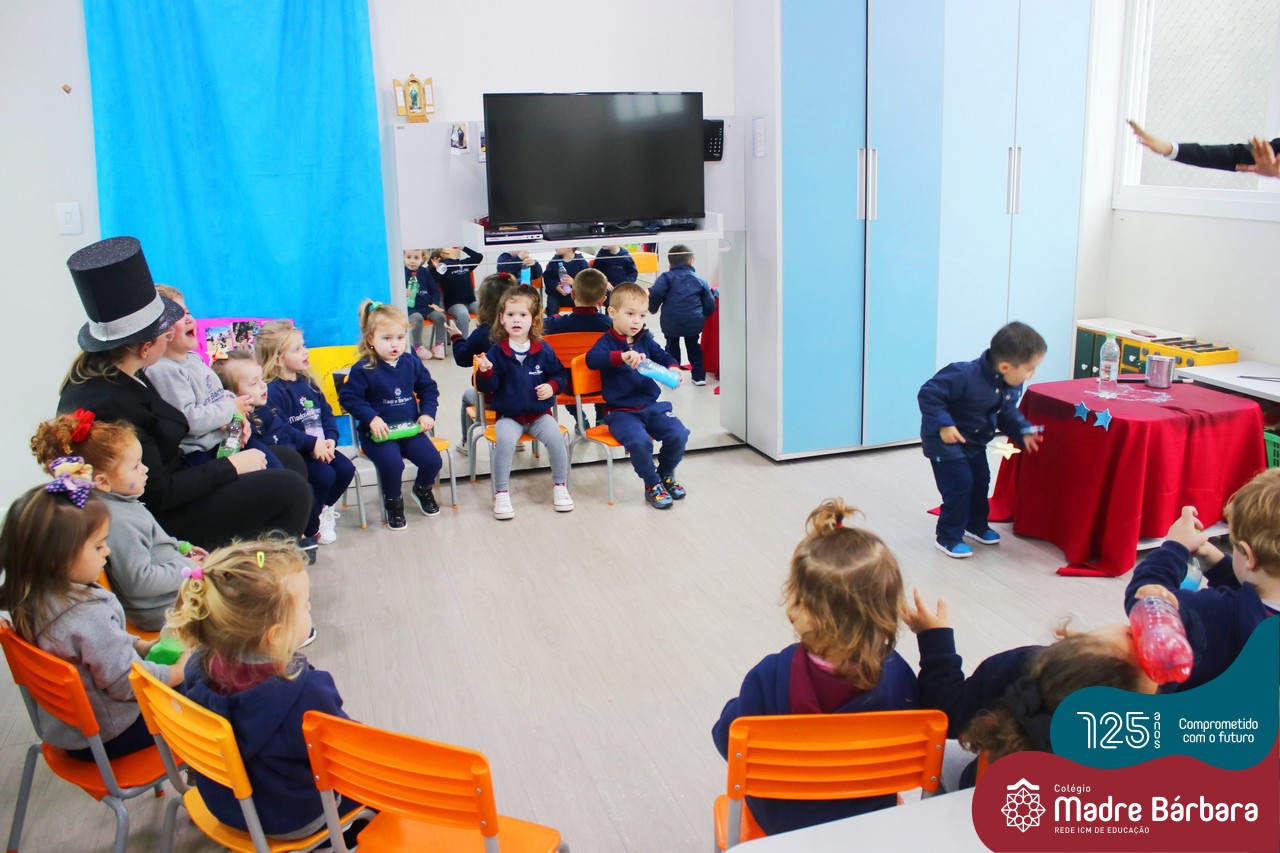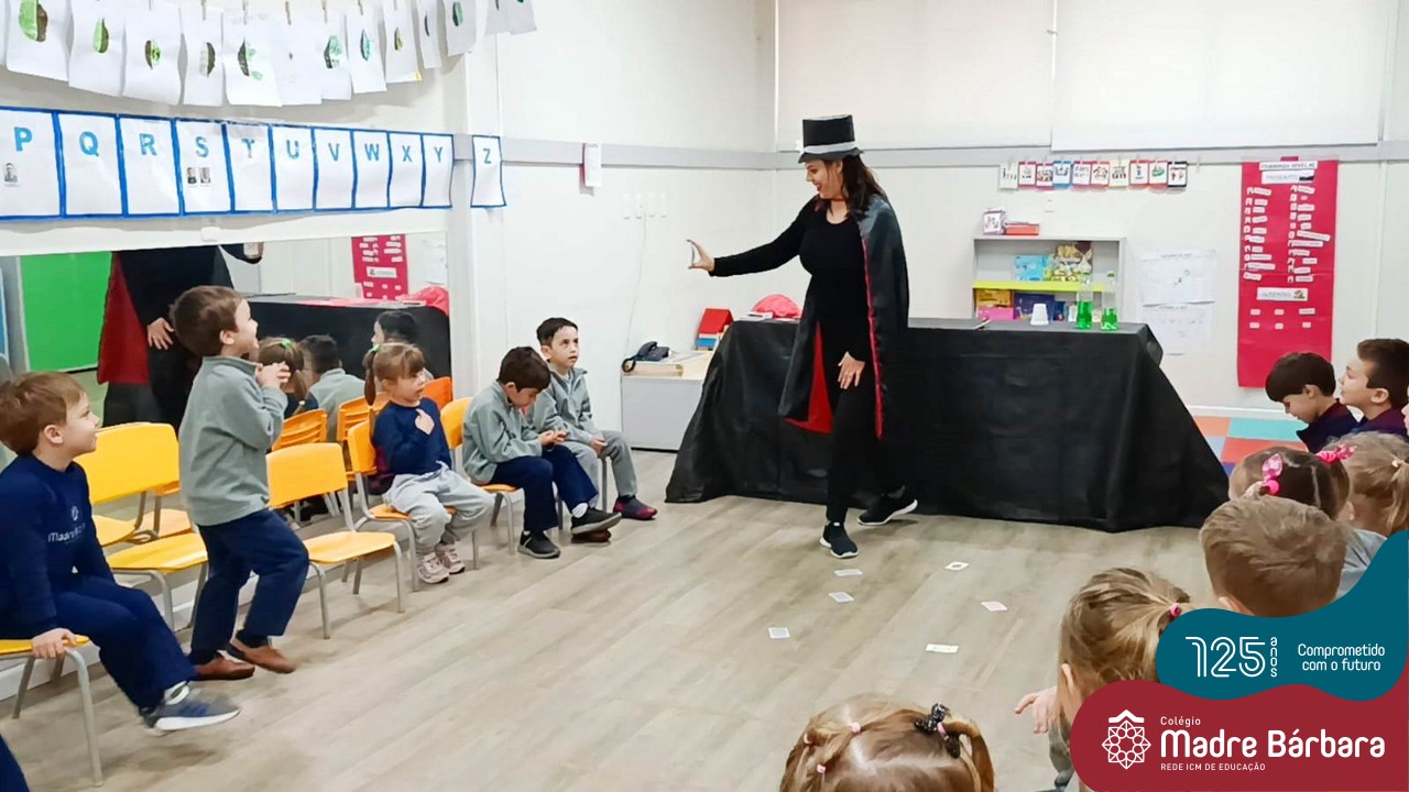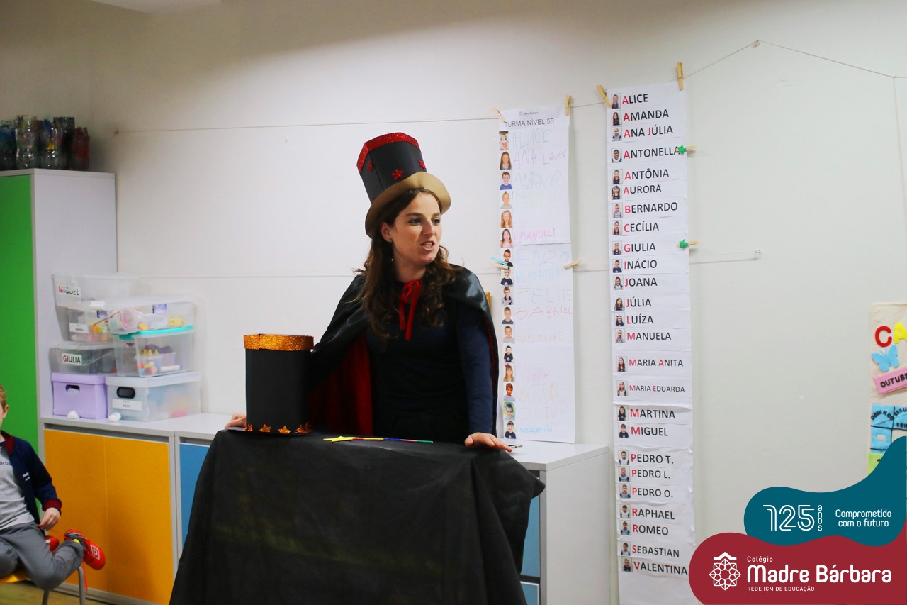 O primeiro dia da Semana da Criança foi marcado por encanto e magia. As crianças foram recebidas em um ambiente especialmente preparado com muita cor, cartolas e estrelas! O dia foi de mágicas que empolgaram as crianças e professoras. Abracadabra…simsalabim!!!