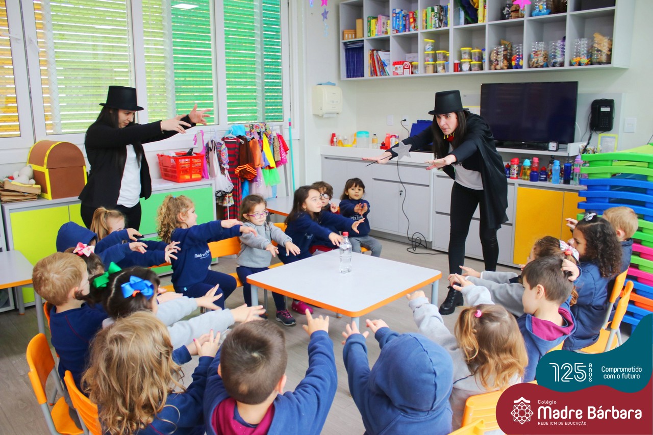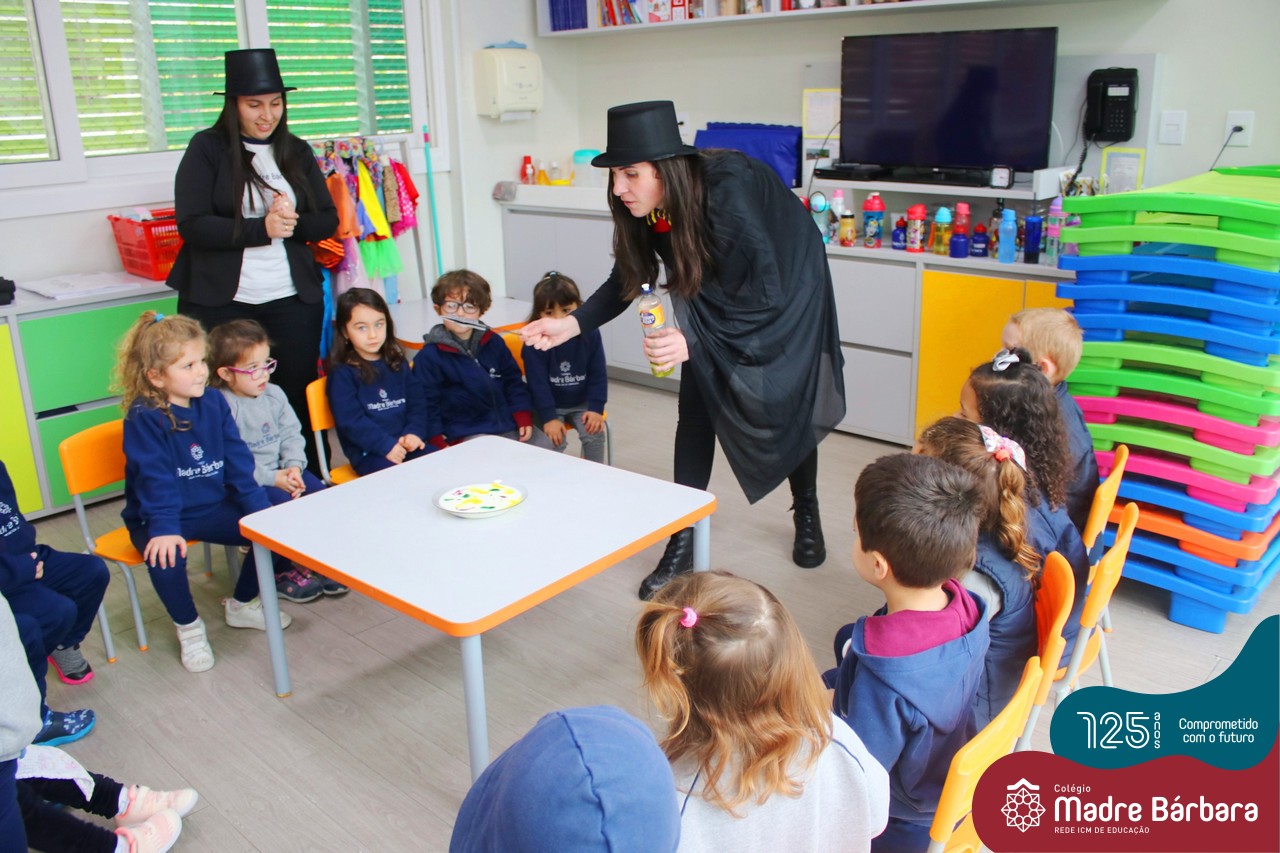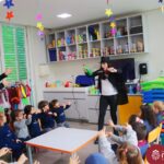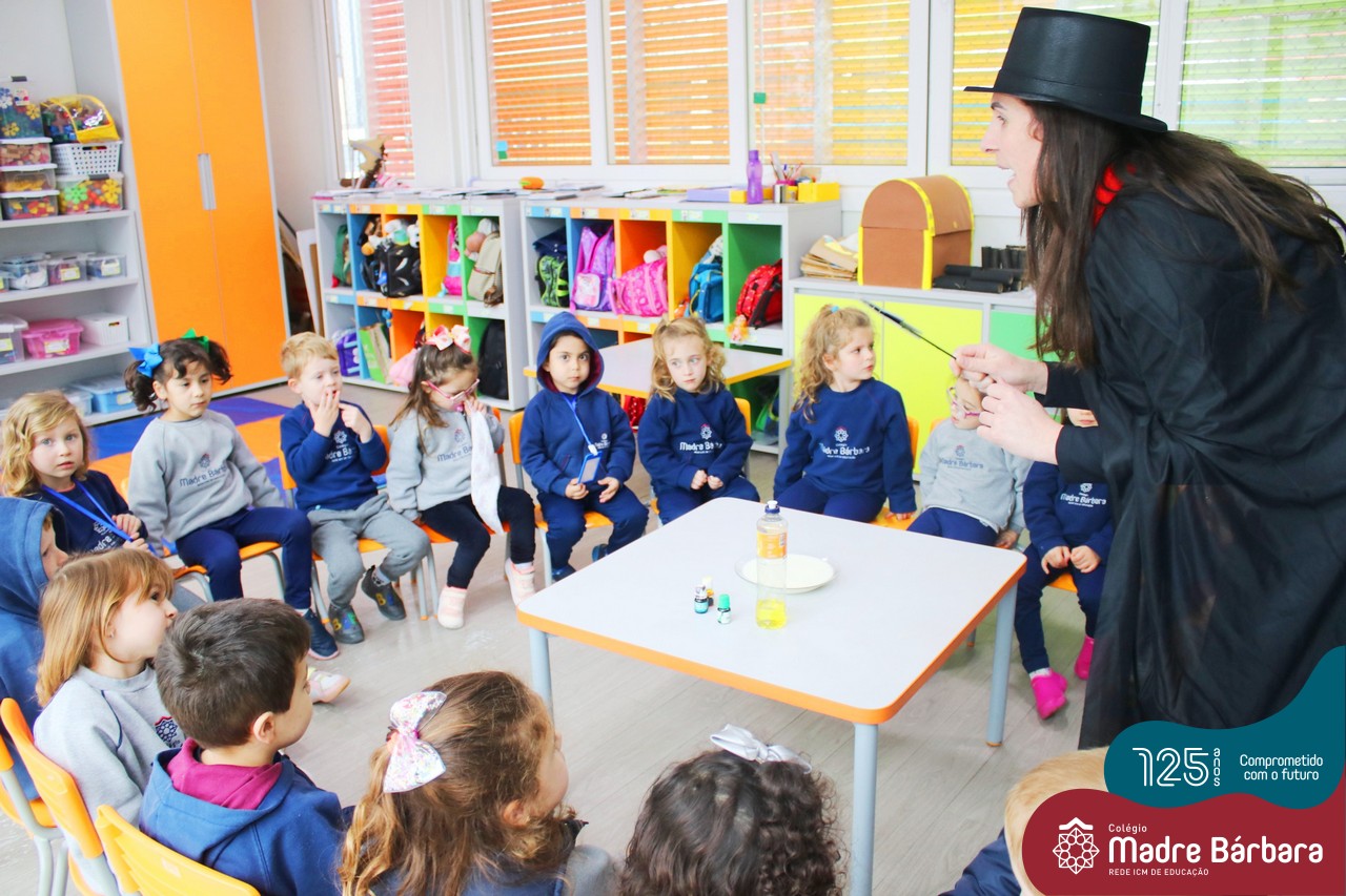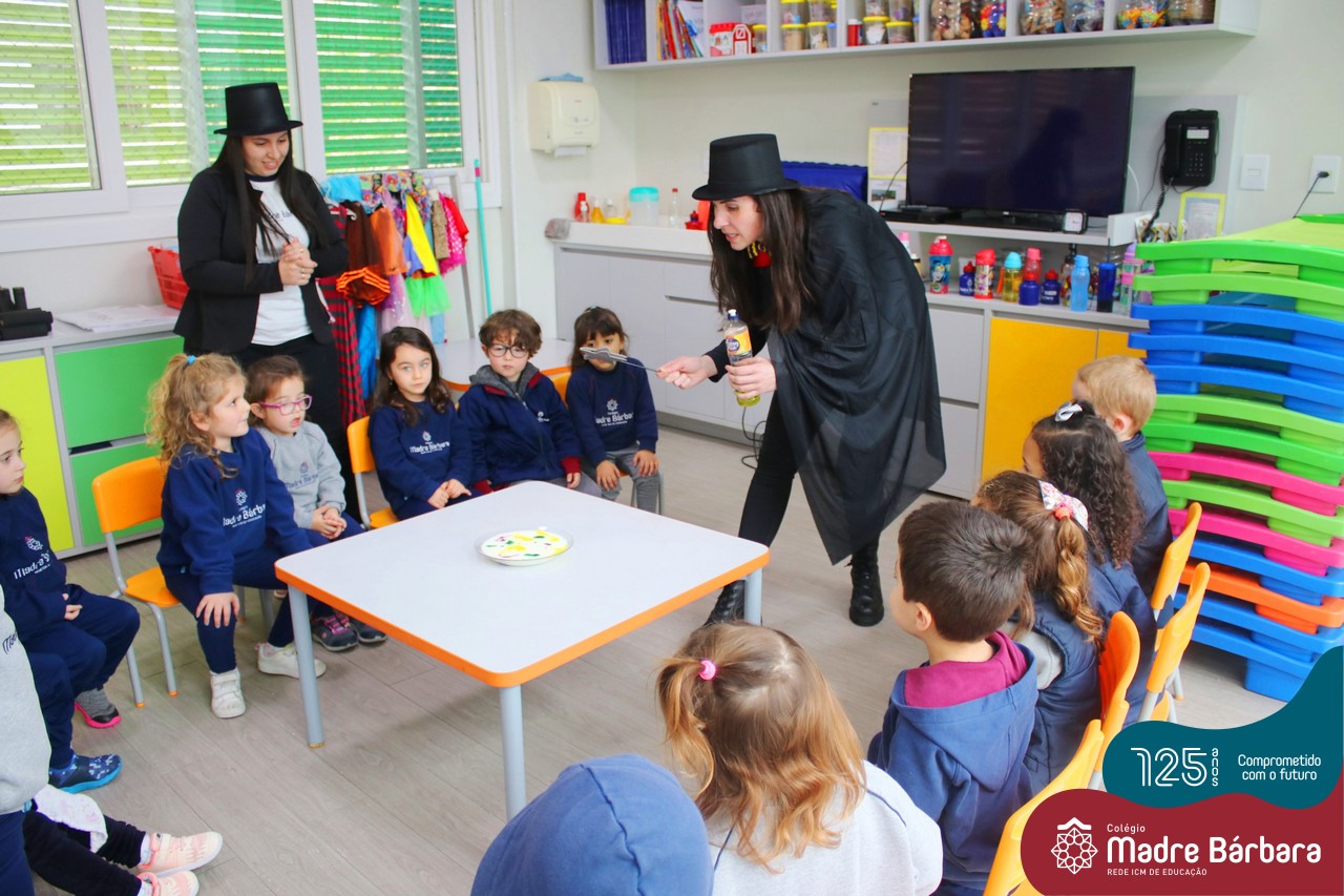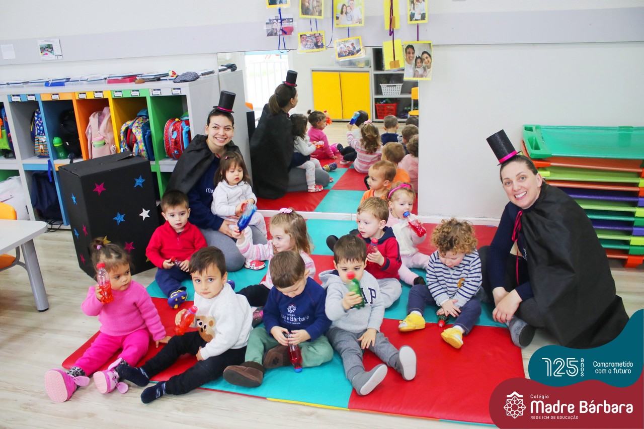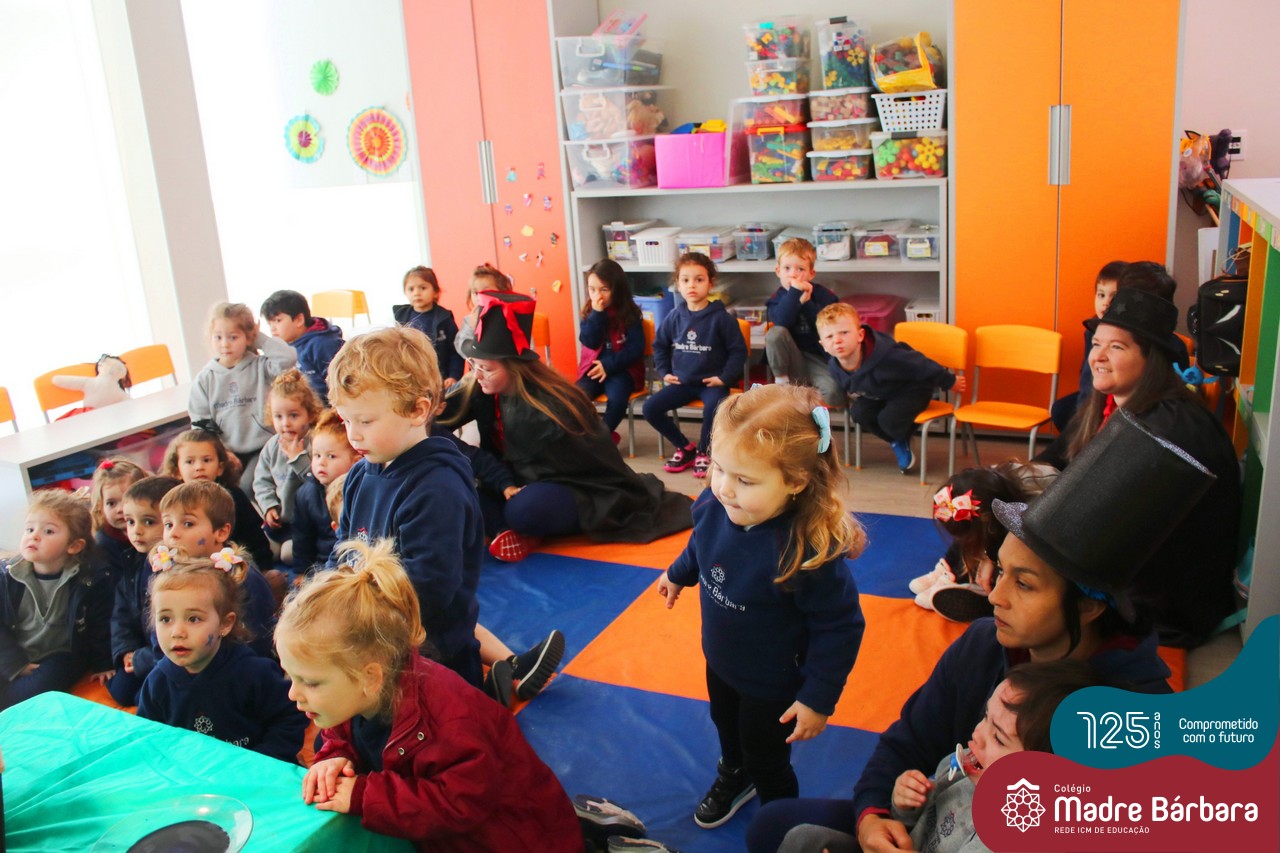 O primeiro dia da Semana da Criança foi marcado por encanto e magia. As crianças foram recebidas em um ambiente especialmente preparado com muita cor, cartolas e estrelas! O dia foi de mágicas que empolgaram as crianças e professoras. Abracadabra…simsalabim!!!
