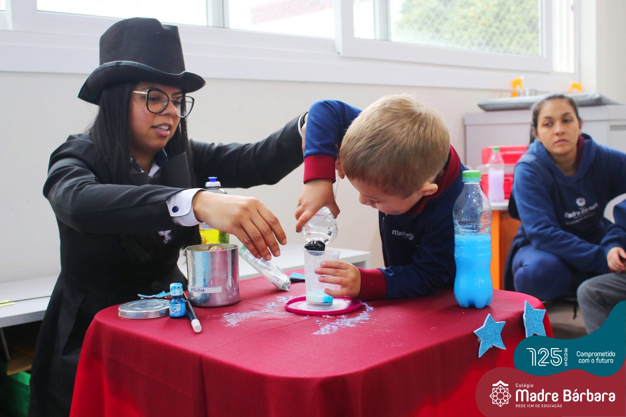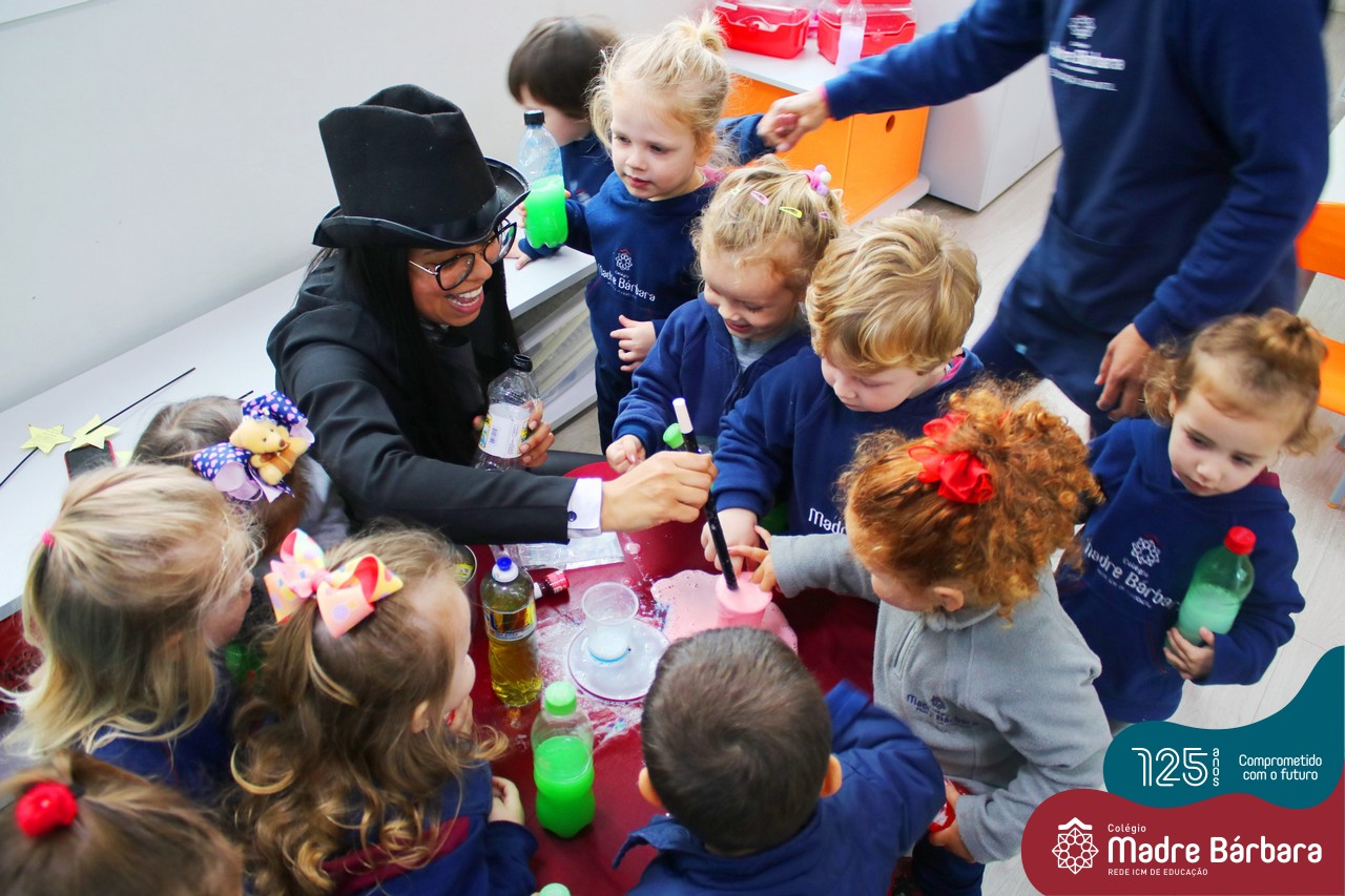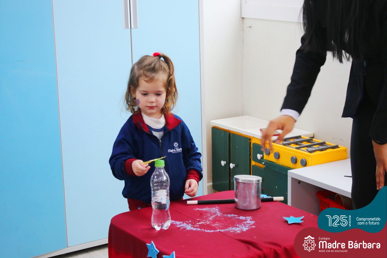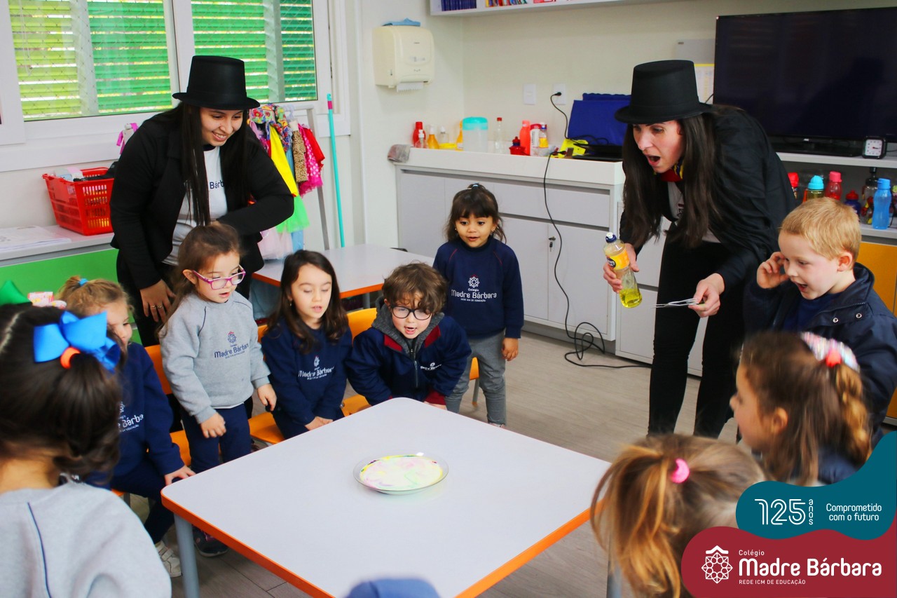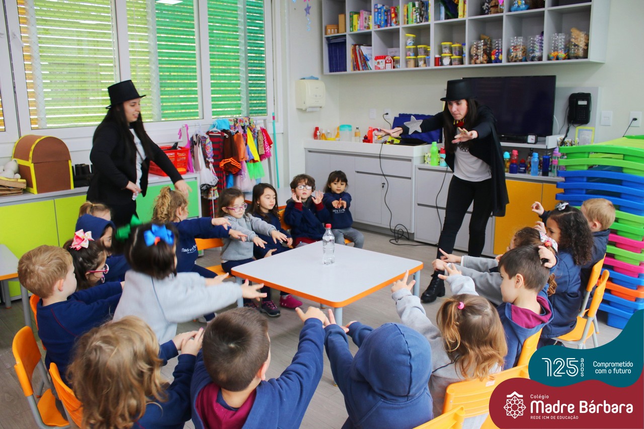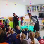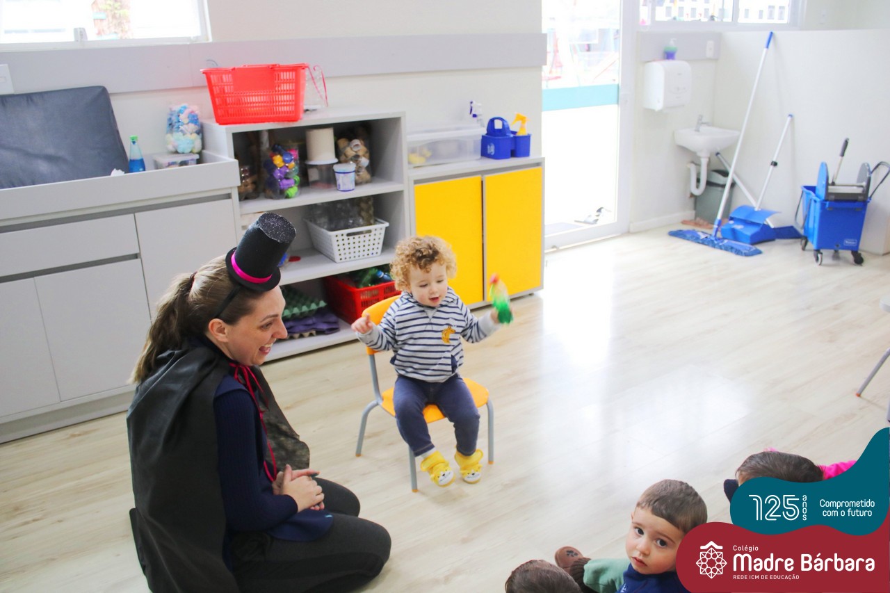 O primeiro dia da Semana da Criança foi marcado por encanto e magia. As crianças foram recebidas em um ambiente especialmente preparado com muita cor, cartolas e estrelas! O dia foi de mágicas que empolgaram as crianças e professoras. Abracadabra…simsalabim!!!