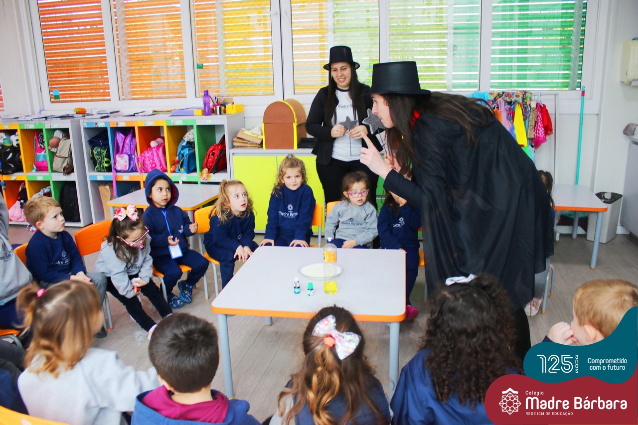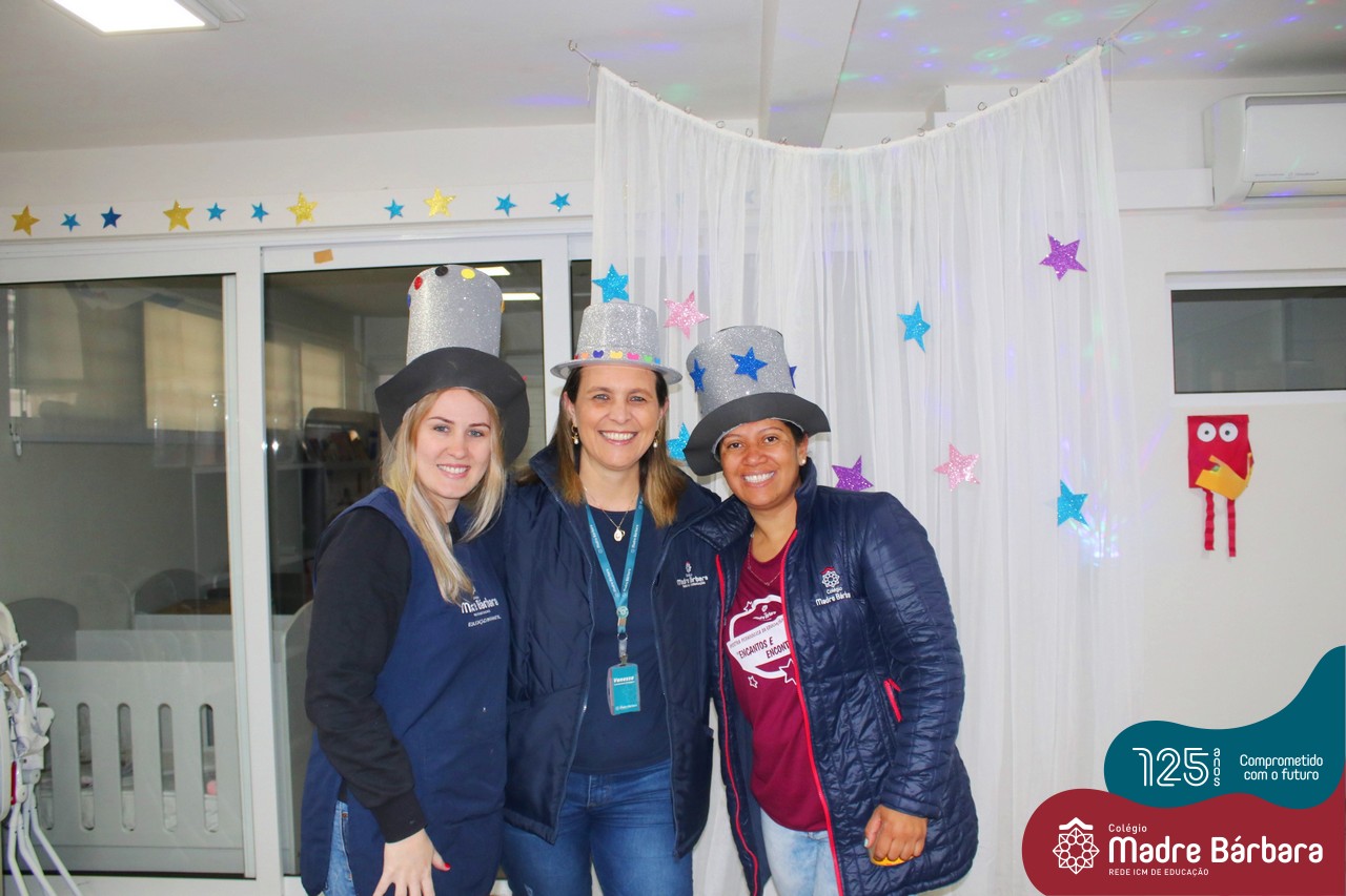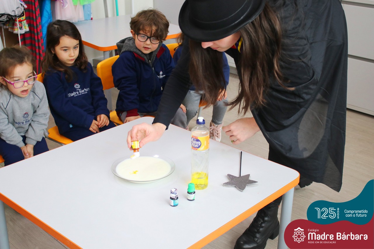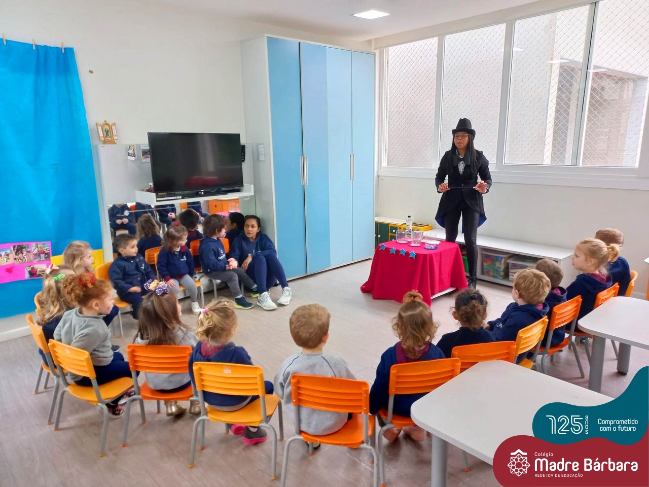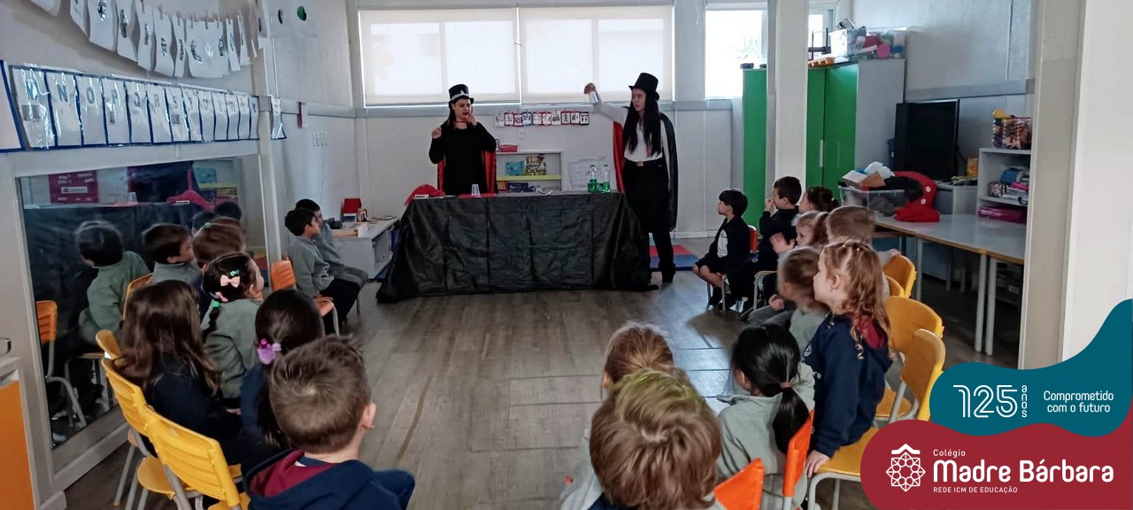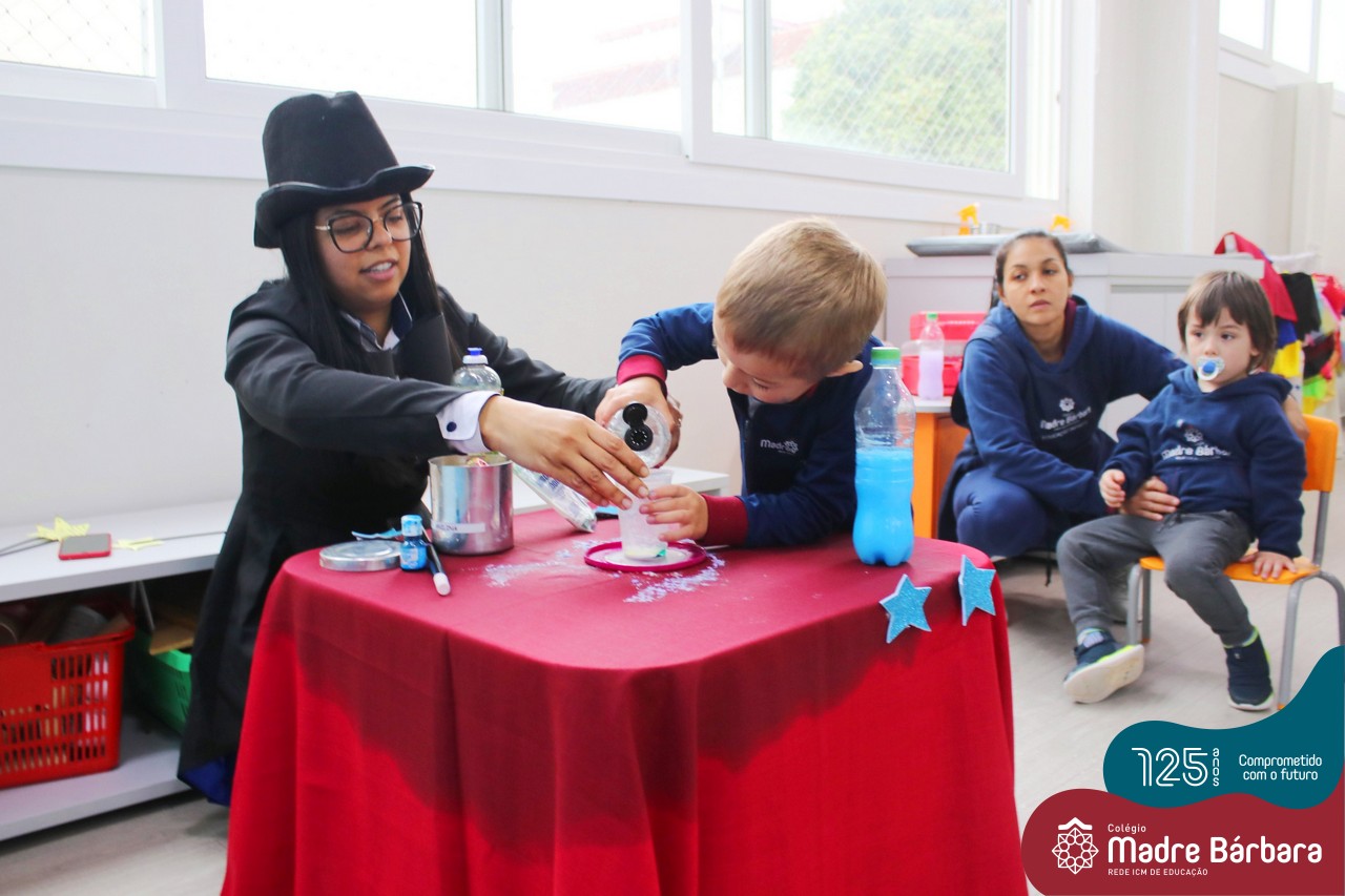 O primeiro dia da Semana da Criança foi marcado por encanto e magia. As crianças foram recebidas em um ambiente especialmente preparado com muita cor, cartolas e estrelas! O dia foi de mágicas que empolgaram as crianças e professoras. Abracadabra…simsalabim!!!
