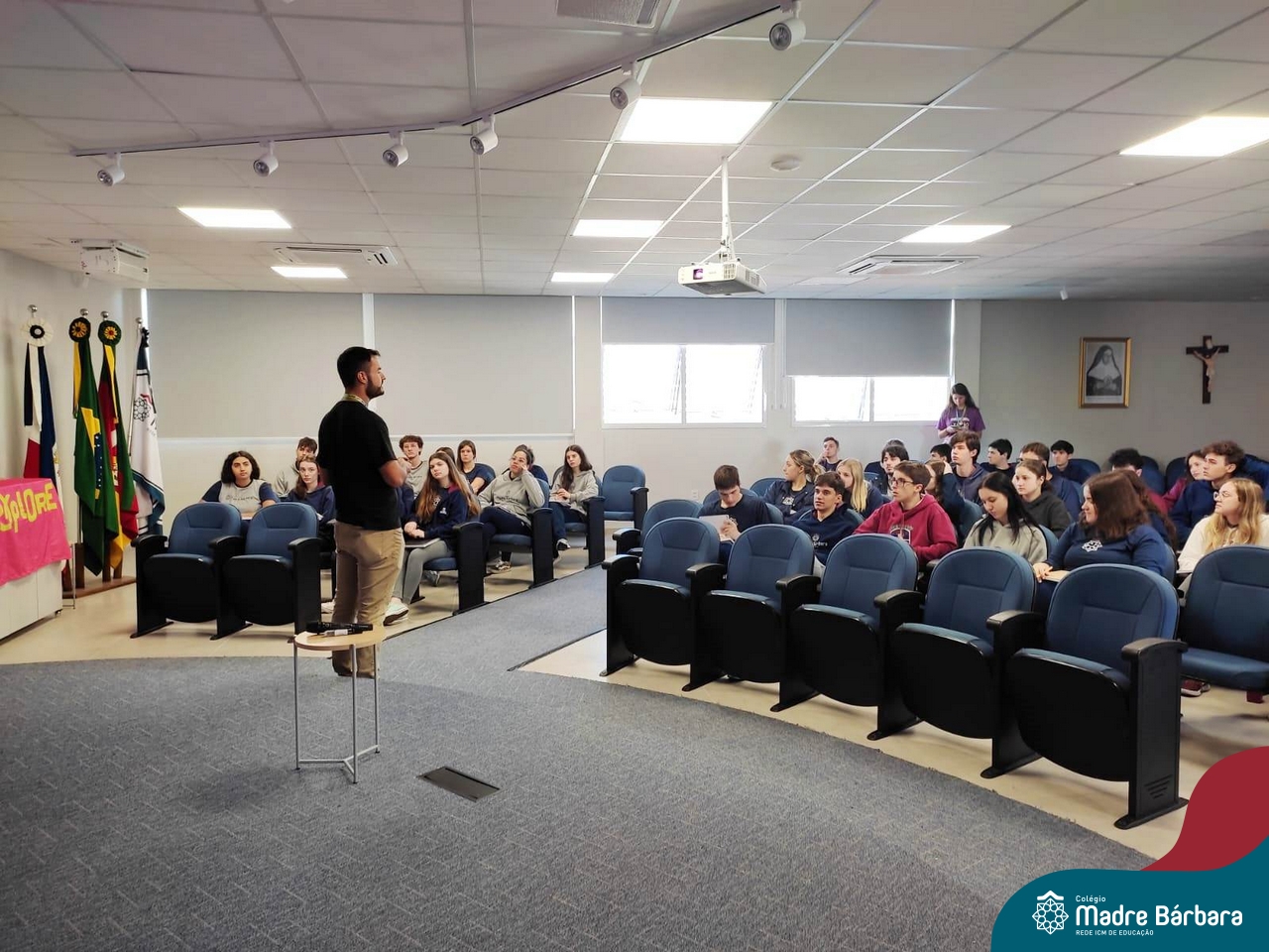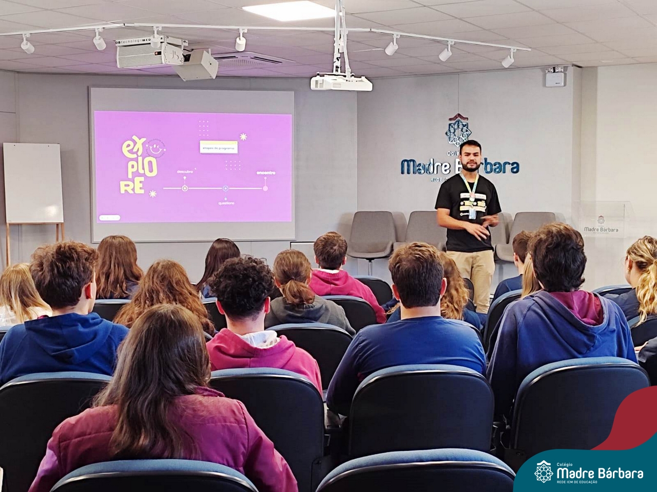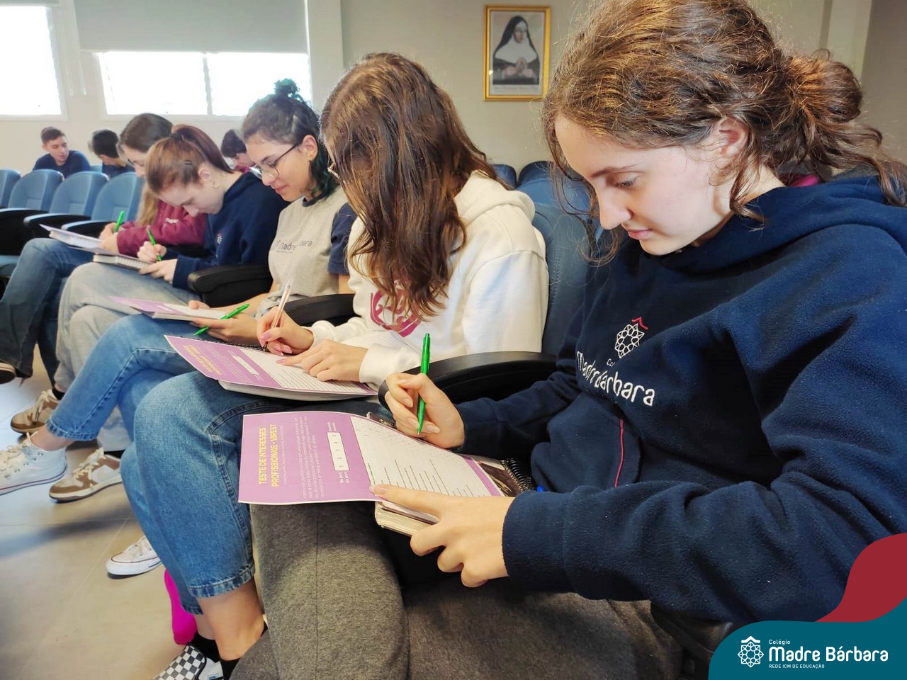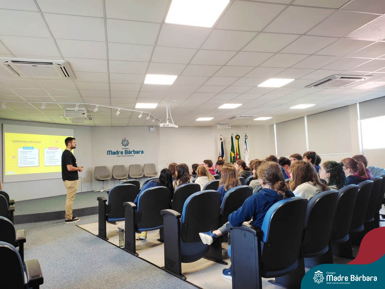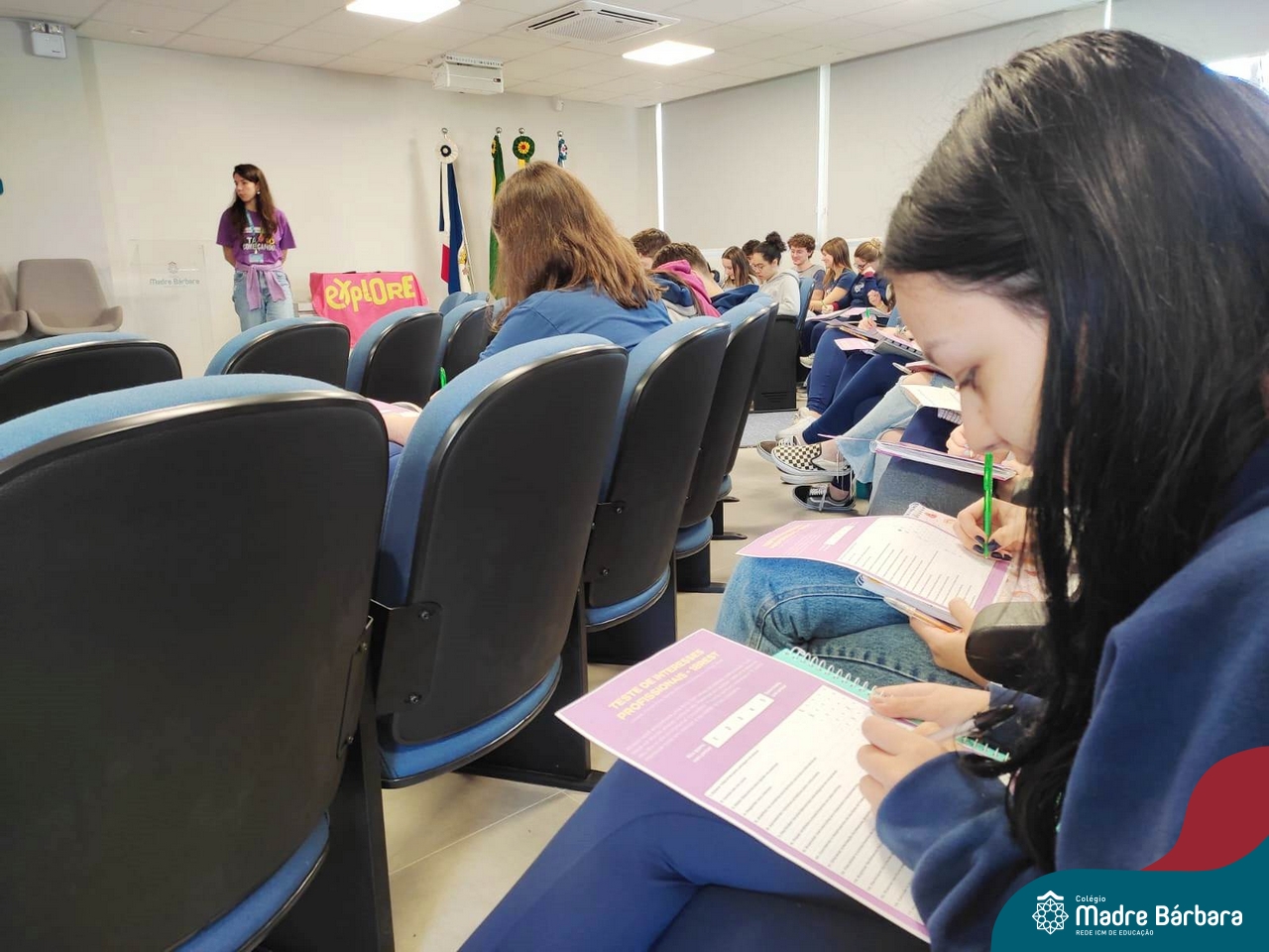 Os estudantes dos 3ºanos do Ensino Médio tiveram a oportunidade de refletir sobre o seu perfil vocacional, através da aplicação do Teste de Interesses – Perfil Vocacional, aplicado pelo psicólogo Gabriel Peres, com a parceria com a Univates. O psicólogo abordou com o grupo, as características para as profissões de interesse, as habilidades soft skills e hard skills, avaliando o perfil e os contextos de trabalho, expressos no teste neste momento. Reforçou para os estudantes que, o teste vocacional não é um instrumento com respostas absolutas, mas sim uma ferramenta que oportuniza muitas reflexões nas quais auxiliam no processo de escolha profissional e identifica suas maiores habilidades. A atividade contempla uma das ações previstas no Programa de Orientação Profissional do Colégio Madre Bárbara – Rede ICM.