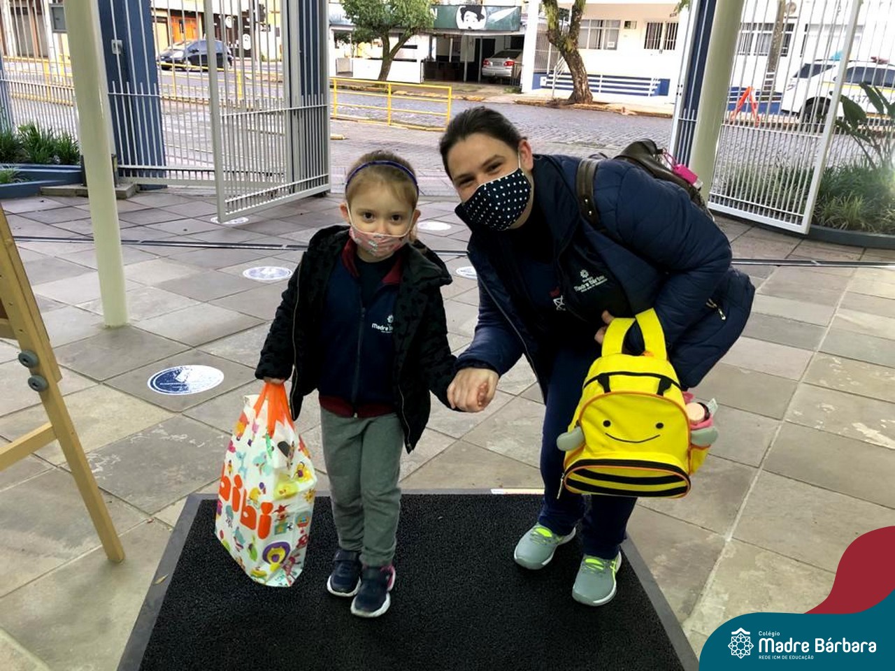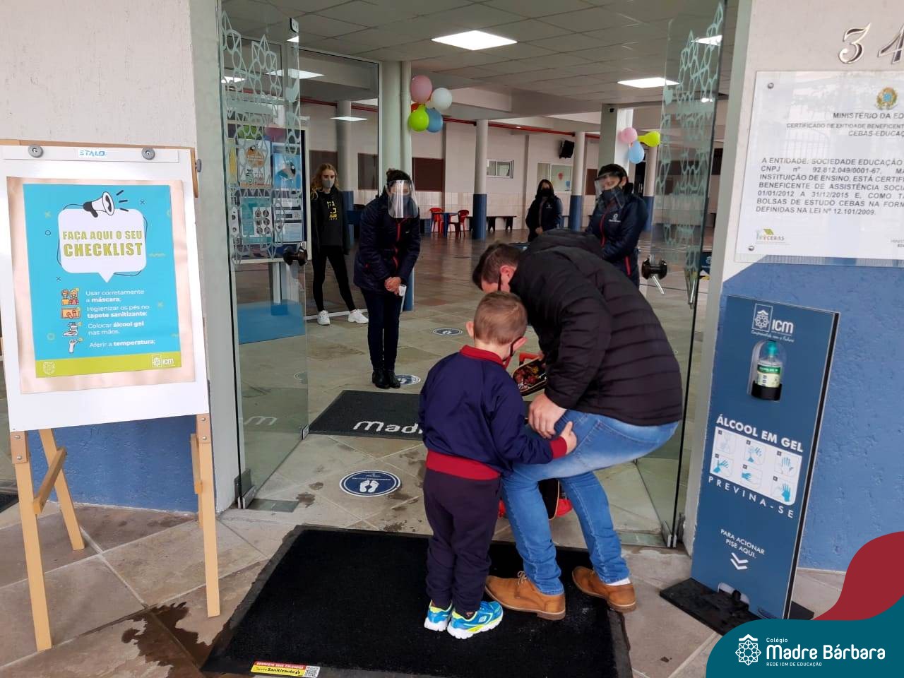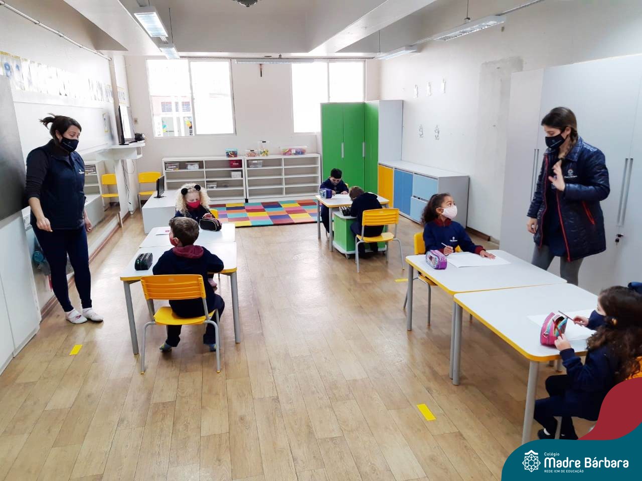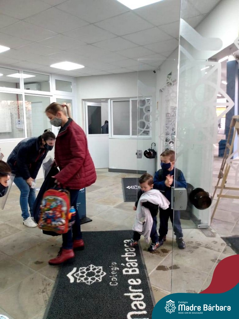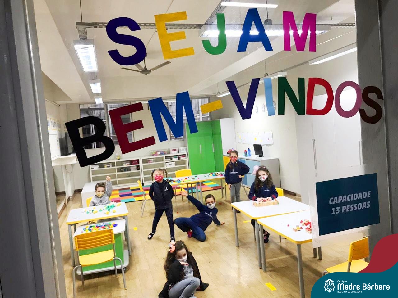 Nesta terça-feira (15) o Colégio Madre Bárbara – Rede ICM retornou com os atendimentos presenciais na Educação Infantil. Com todos os protocolos, medidas e cuidados de higiene e segurança, 184 crianças estão retornando para a escola. Destas, farão revezamento em dois grupos (A – segunda, terça e quarta-feira e B – quinta e sexta-feira), preenchendo 50% da capacidade da sala. O Colégio conta com equipes responsáveis pelo fluxo de entrada e saída, com checklist de aferição da temperatura, conferência do uso correto de máscaras, higienização dos pés no tapete sanitizante e limpeza das mãos com álcool gel.