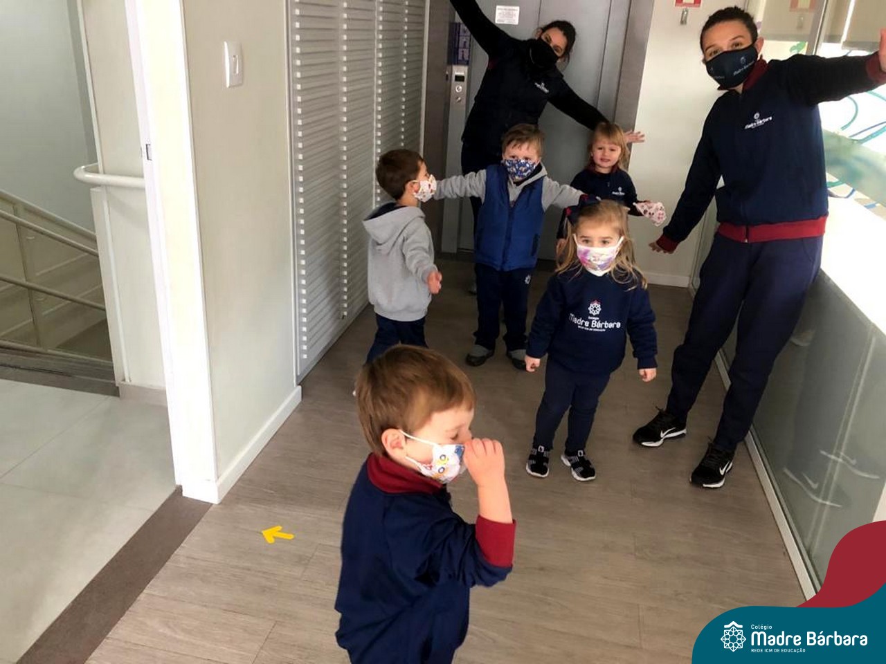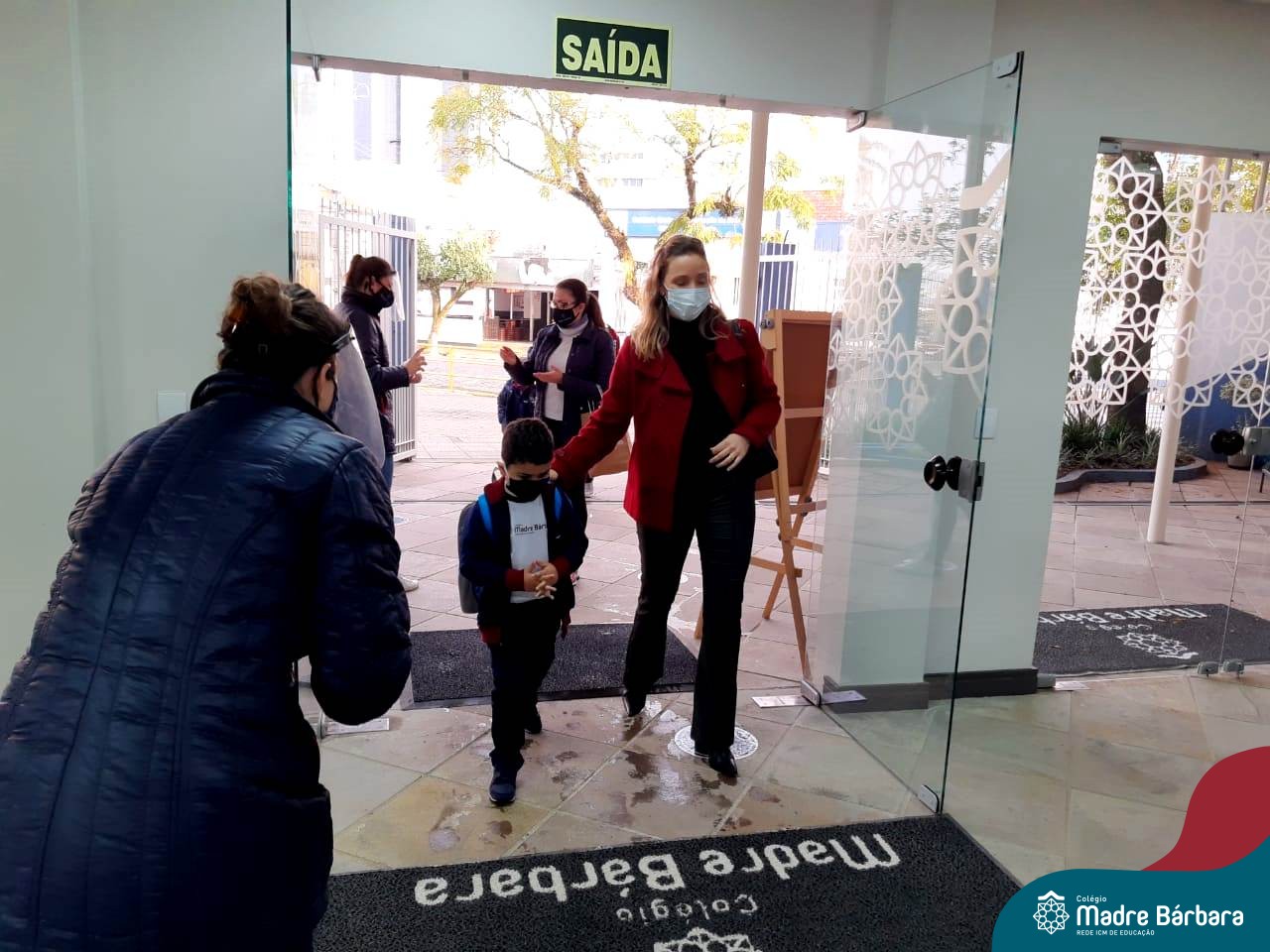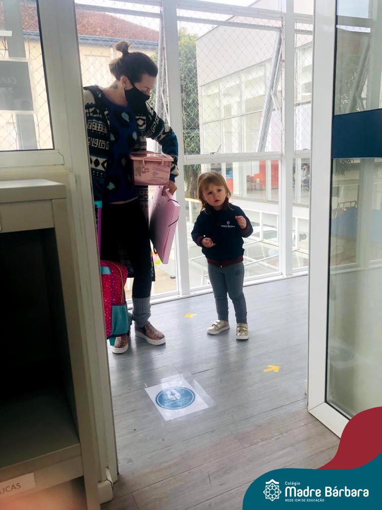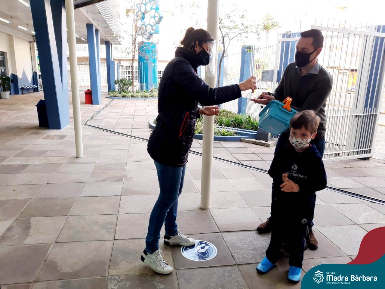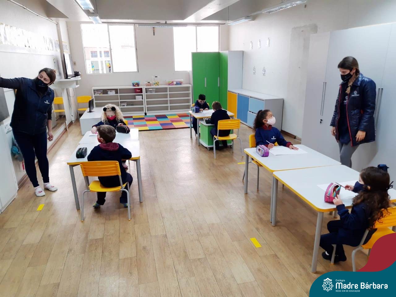 Nesta terça-feira (15) o Colégio Madre Bárbara – Rede ICM retornou com os atendimentos presenciais na Educação Infantil. Com todos os protocolos, medidas e cuidados de higiene e segurança, 184 crianças estão retornando para a escola. Destas, farão revezamento em dois grupos (A – segunda, terça e quarta-feira e B – quinta e sexta-feira), preenchendo 50% da capacidade da sala. O Colégio conta com equipes responsáveis pelo fluxo de entrada e saída, com checklist de aferição da temperatura, conferência do uso correto de máscaras, higienização dos pés no tapete sanitizante e limpeza das mãos com álcool gel.