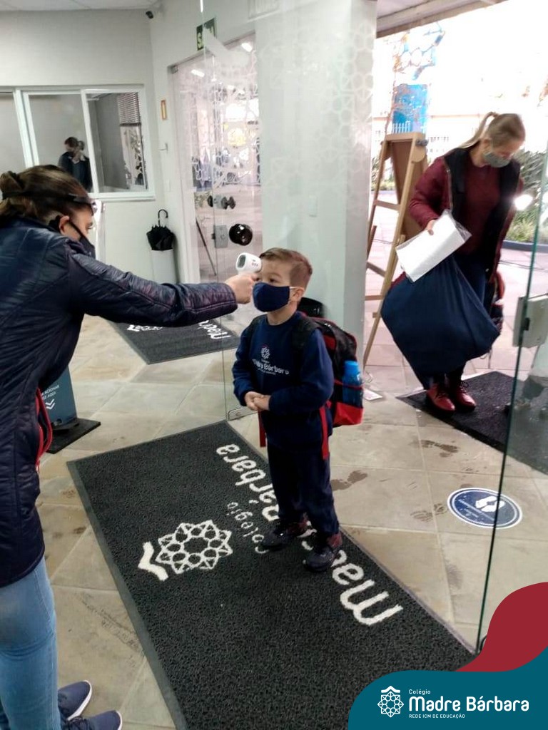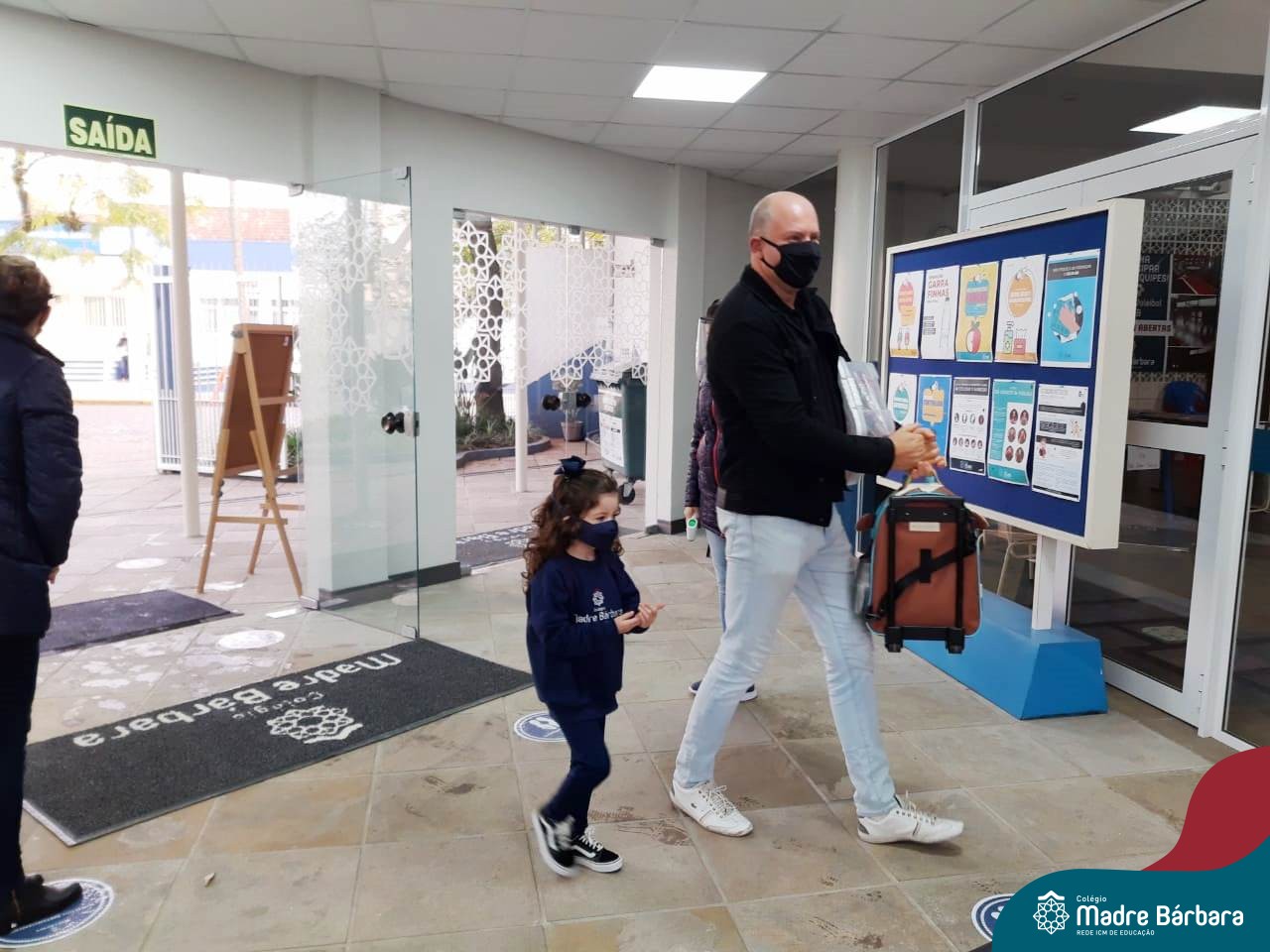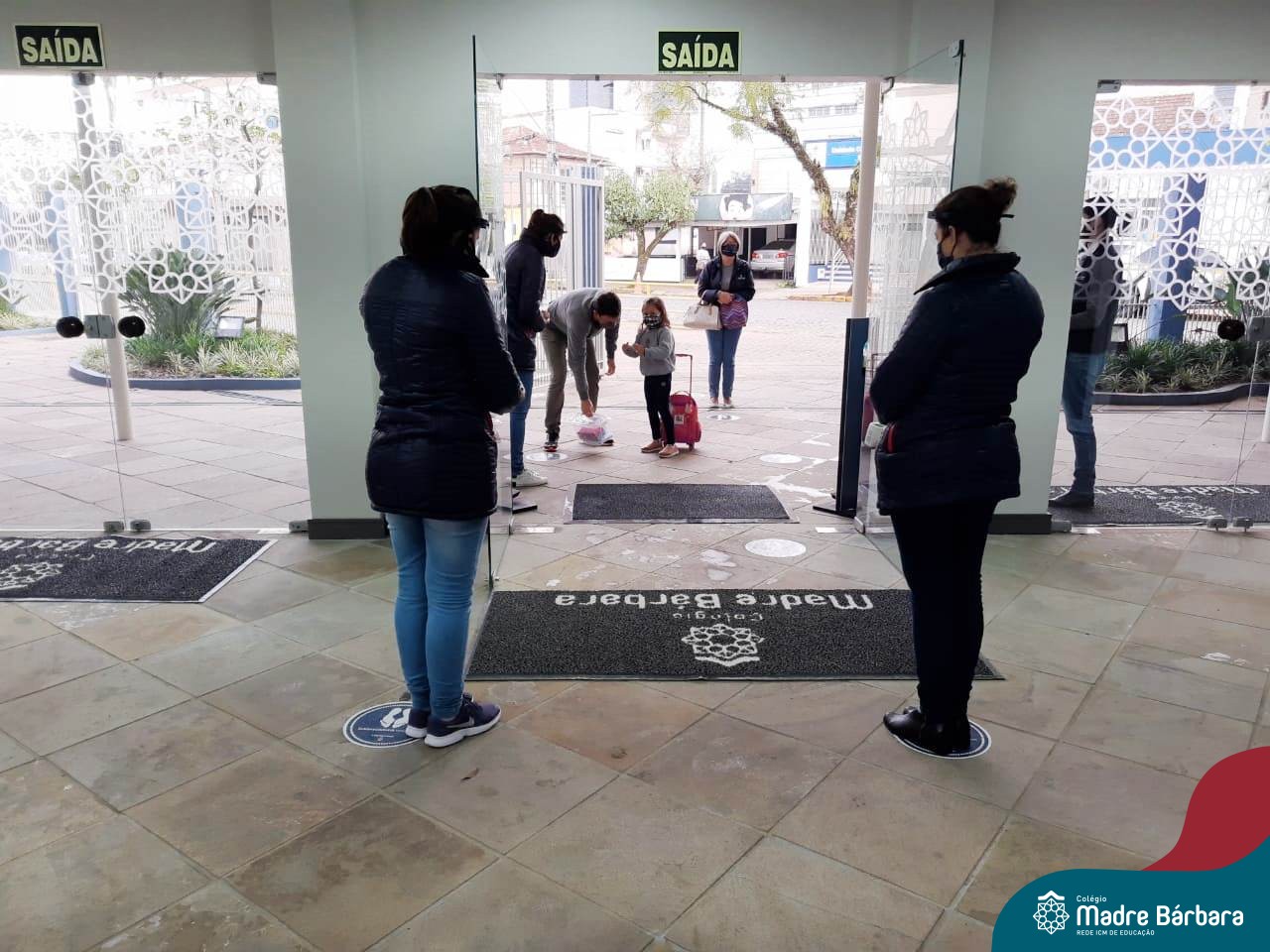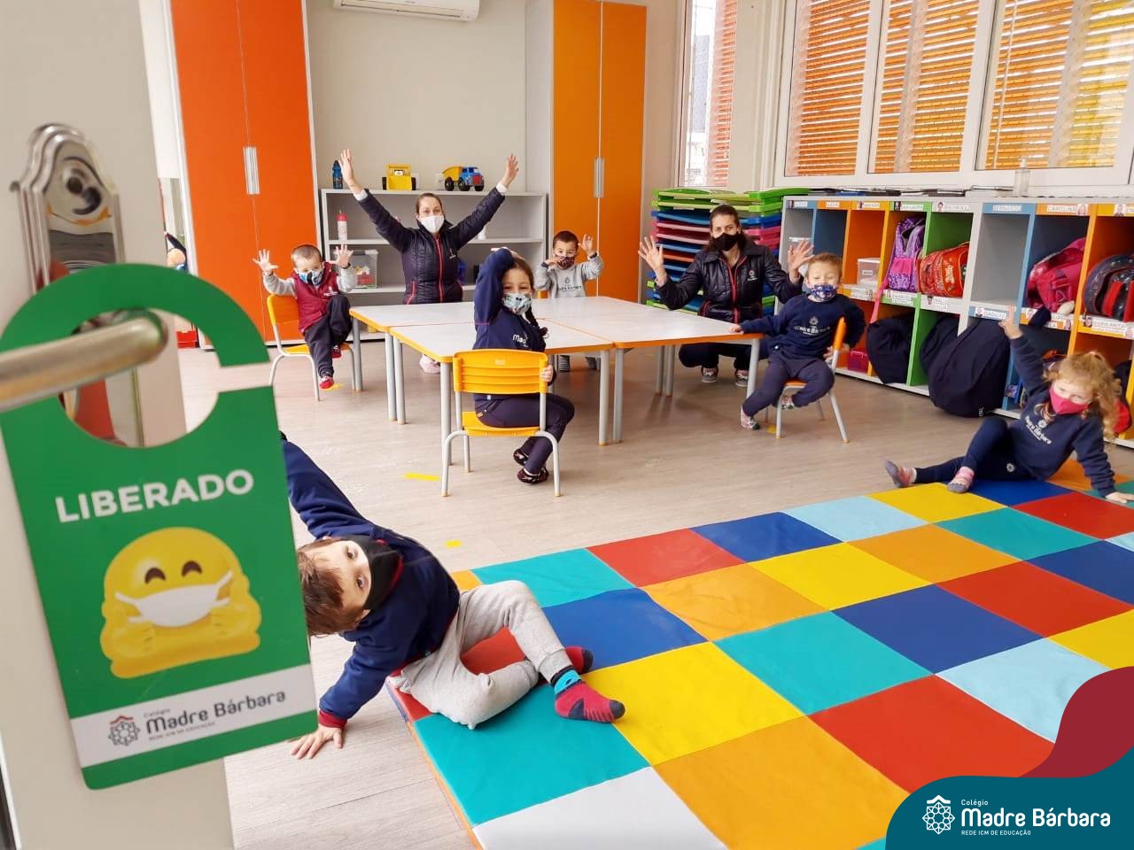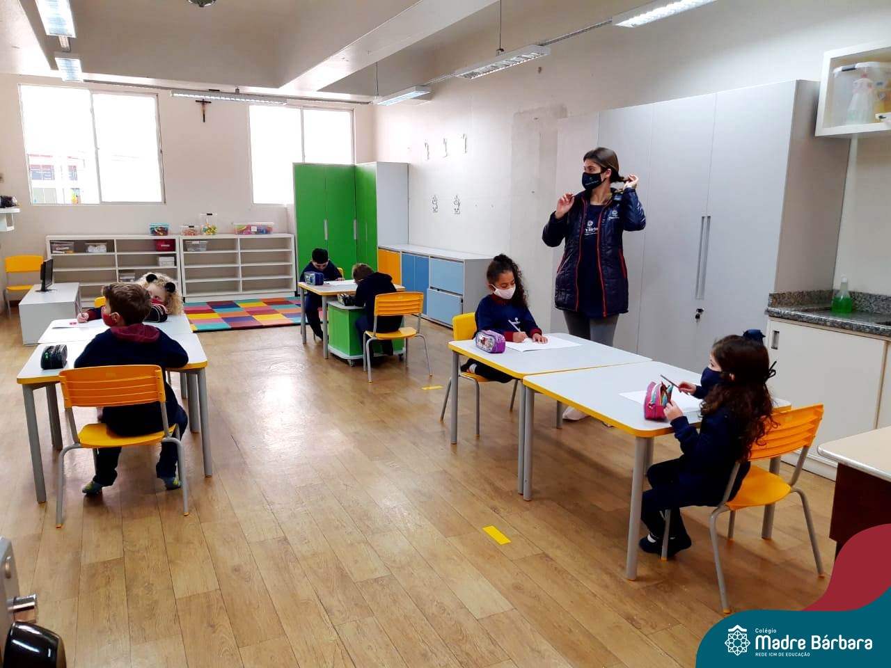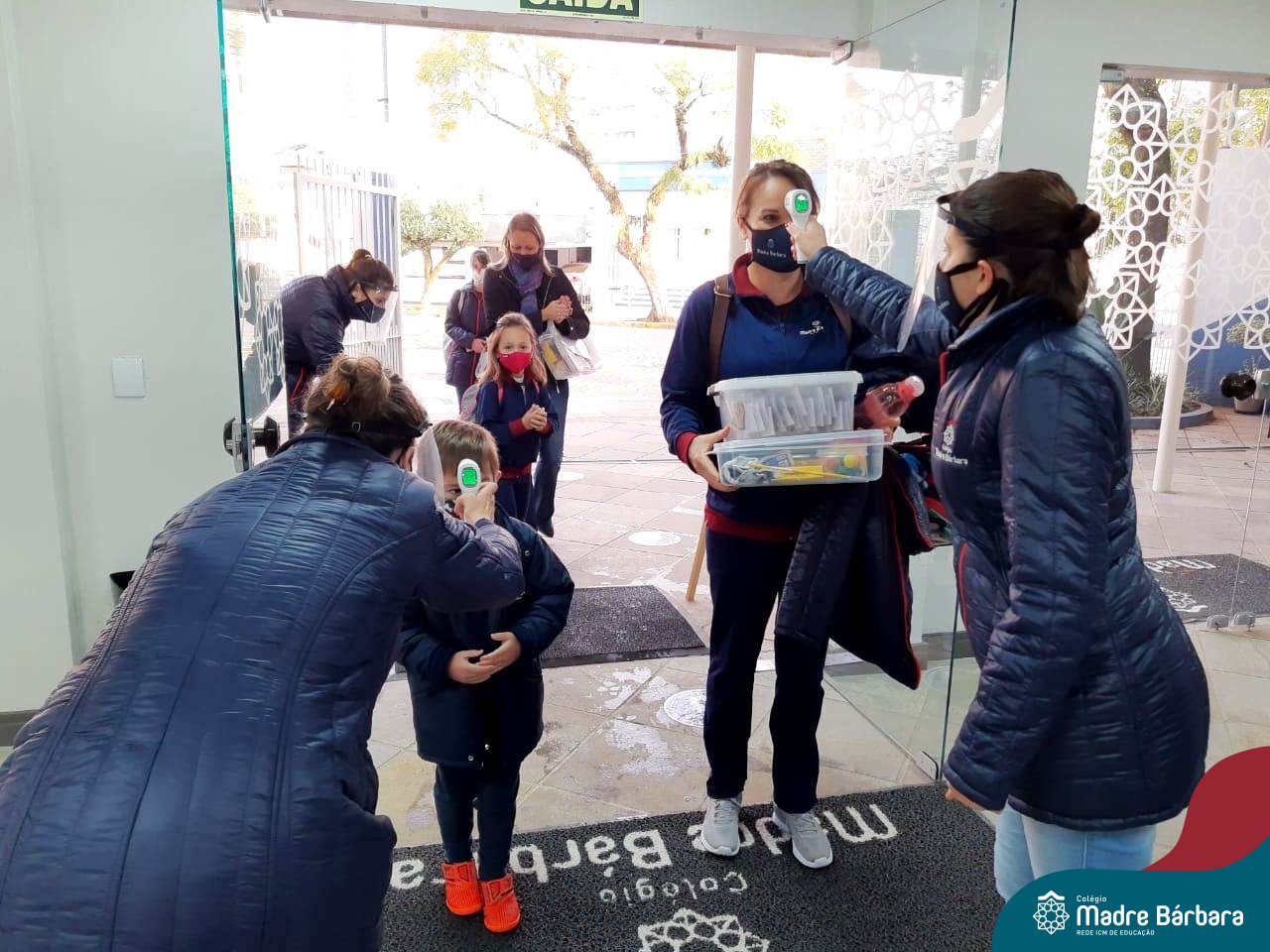 Nesta terça-feira (15) o Colégio Madre Bárbara – Rede ICM retornou com os atendimentos presenciais na Educação Infantil. Com todos os protocolos, medidas e cuidados de higiene e segurança, 184 crianças estão retornando para a escola. Destas, farão revezamento em dois grupos (A – segunda, terça e quarta-feira e B – quinta e sexta-feira), preenchendo 50% da capacidade da sala. O Colégio conta com equipes responsáveis pelo fluxo de entrada e saída, com checklist de aferição da temperatura, conferência do uso correto de máscaras, higienização dos pés no tapete sanitizante e limpeza das mãos com álcool gel.
