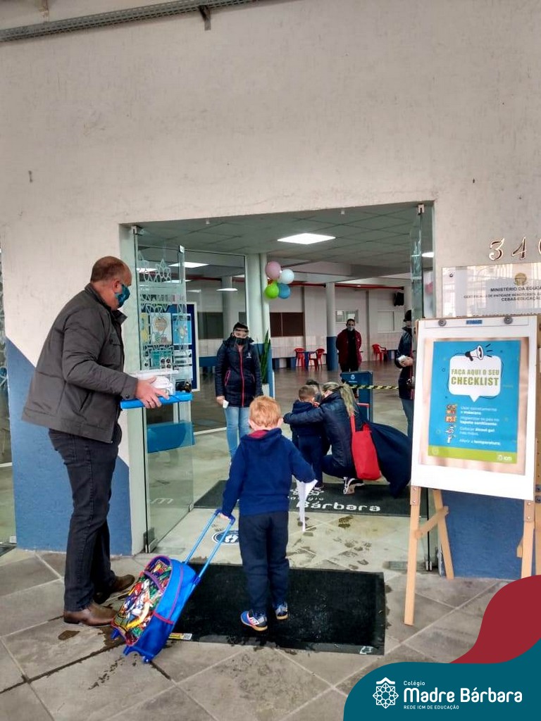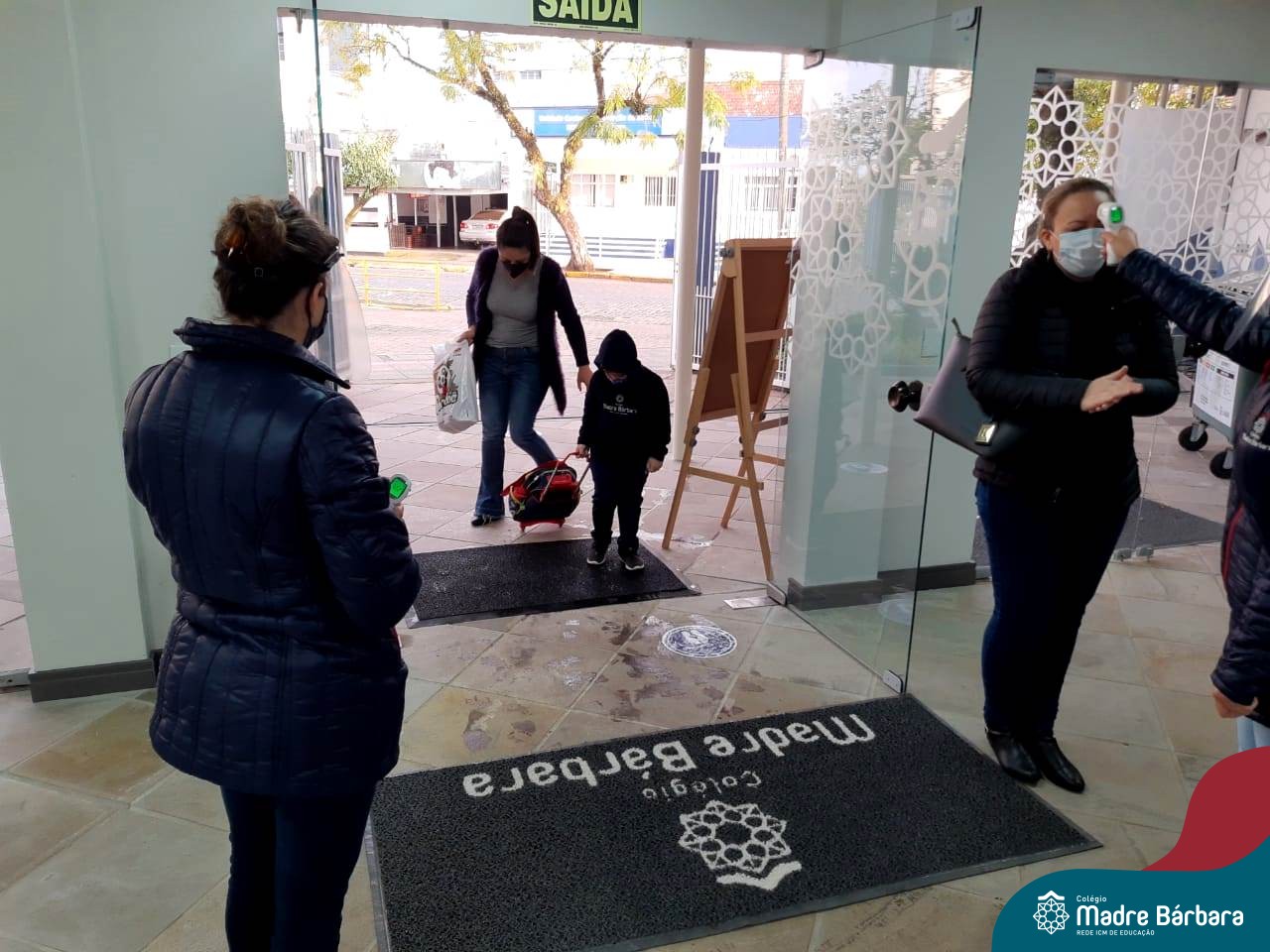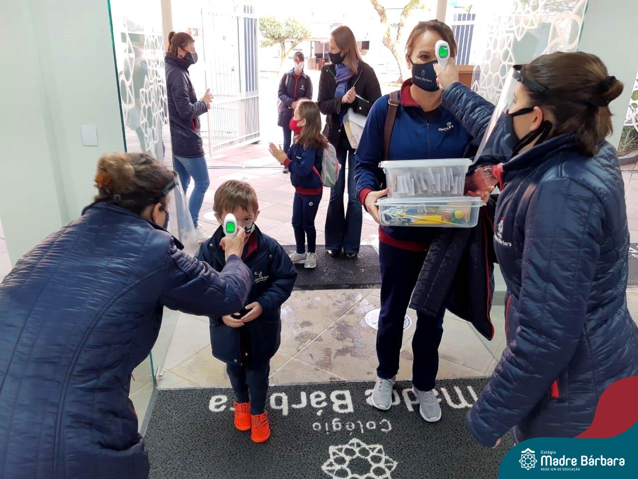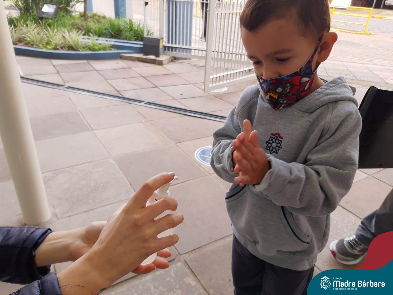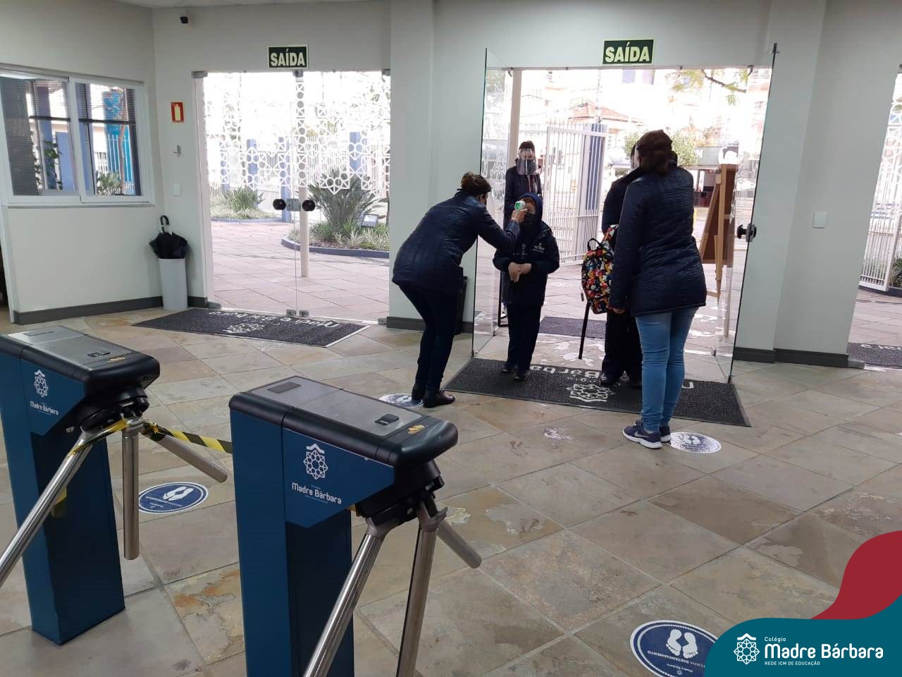 Nesta terça-feira (15) o Colégio Madre Bárbara – Rede ICM retornou com os atendimentos presenciais na Educação Infantil. Com todos os protocolos, medidas e cuidados de higiene e segurança, 184 crianças estão retornando para a escola. Destas, farão revezamento em dois grupos (A – segunda, terça e quarta-feira e B – quinta e sexta-feira), preenchendo 50% da capacidade da sala. O Colégio conta com equipes responsáveis pelo fluxo de entrada e saída, com checklist de aferição da temperatura, conferência do uso correto de máscaras, higienização dos pés no tapete sanitizante e limpeza das mãos com álcool gel.
