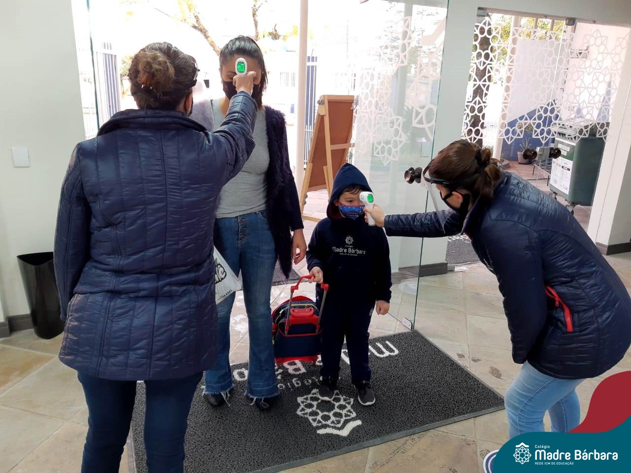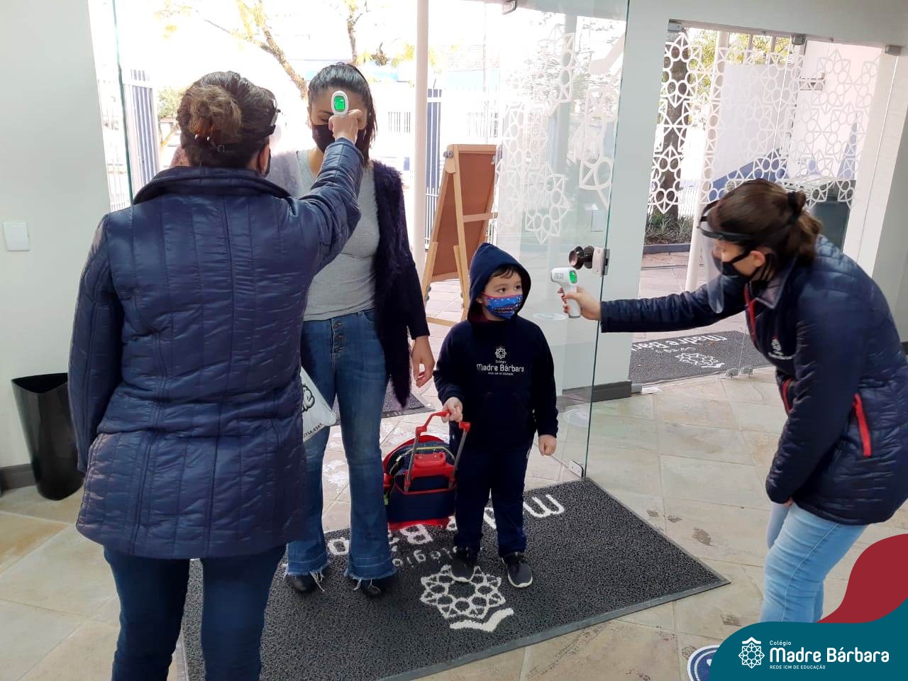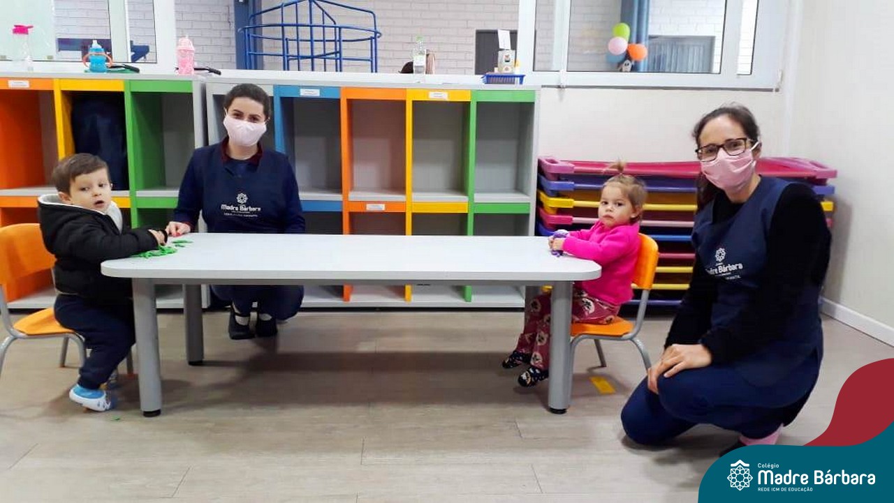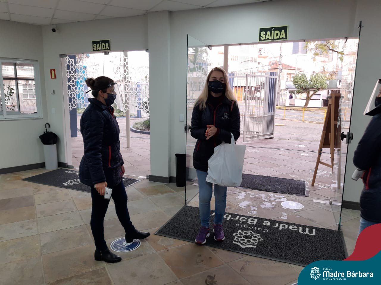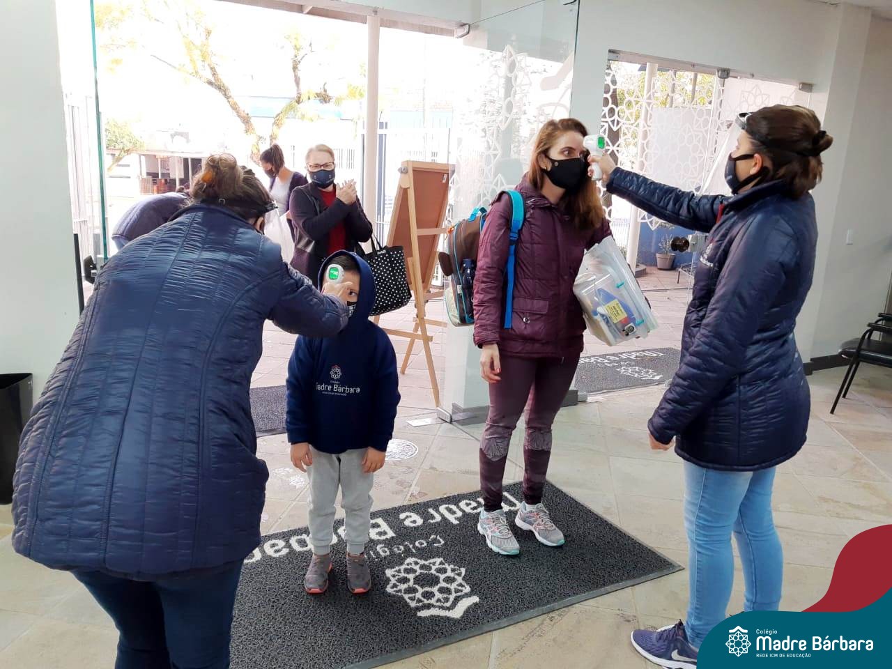 Nesta terça-feira (15) o Colégio Madre Bárbara – Rede ICM retornou com os atendimentos presenciais na Educação Infantil. Com todos os protocolos, medidas e cuidados de higiene e segurança, 184 crianças estão retornando para a escola. Destas, farão revezamento em dois grupos (A – segunda, terça e quarta-feira e B – quinta e sexta-feira), preenchendo 50% da capacidade da sala. O Colégio conta com equipes responsáveis pelo fluxo de entrada e saída, com checklist de aferição da temperatura, conferência do uso correto de máscaras, higienização dos pés no tapete sanitizante e limpeza das mãos com álcool gel.