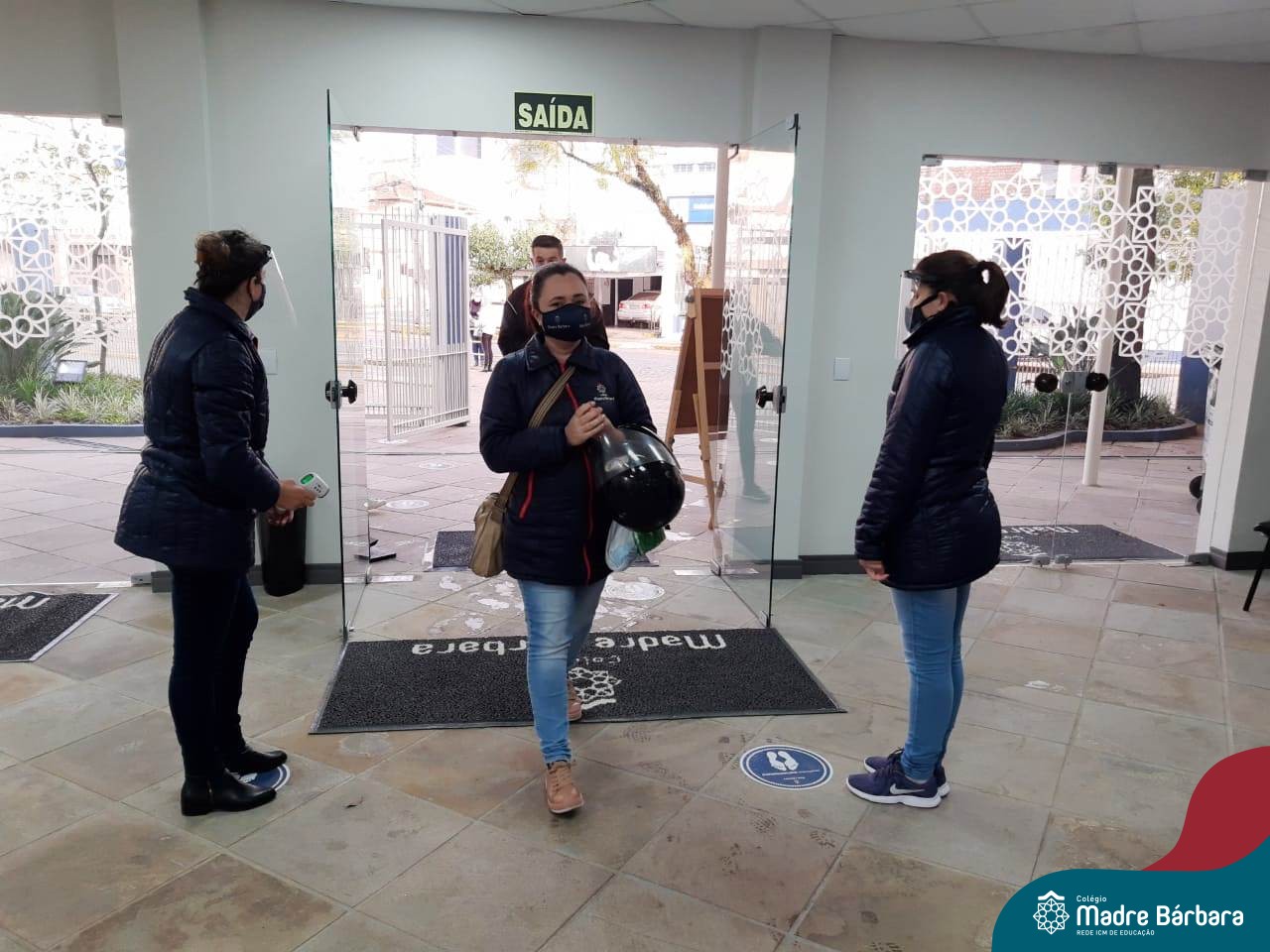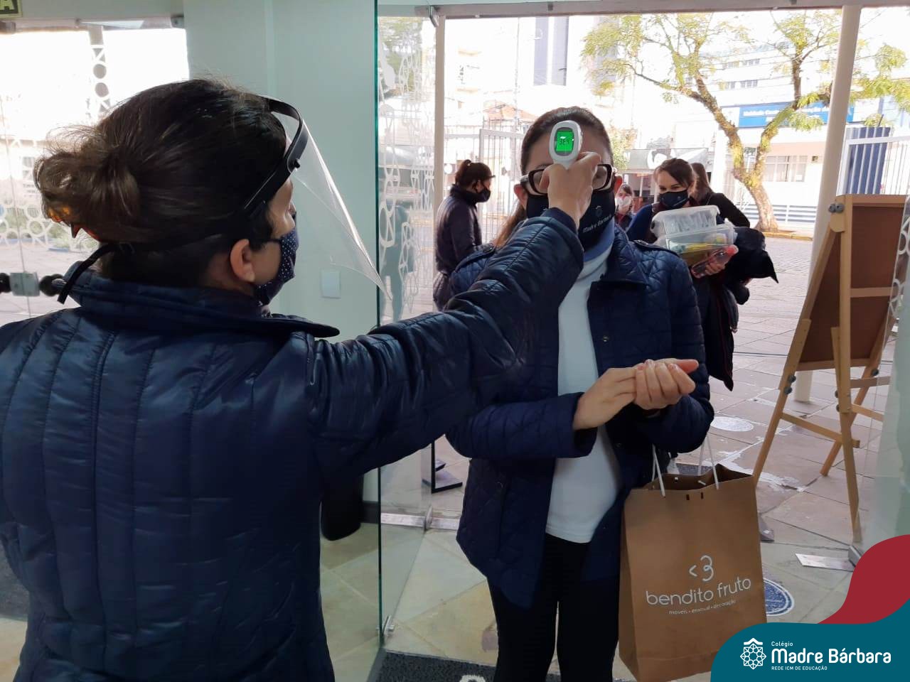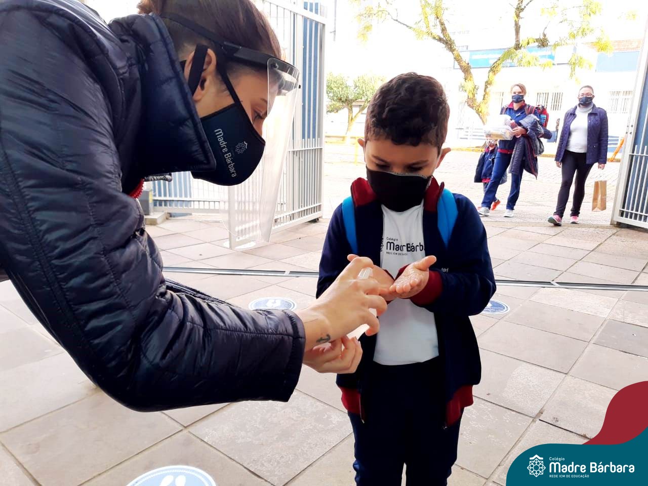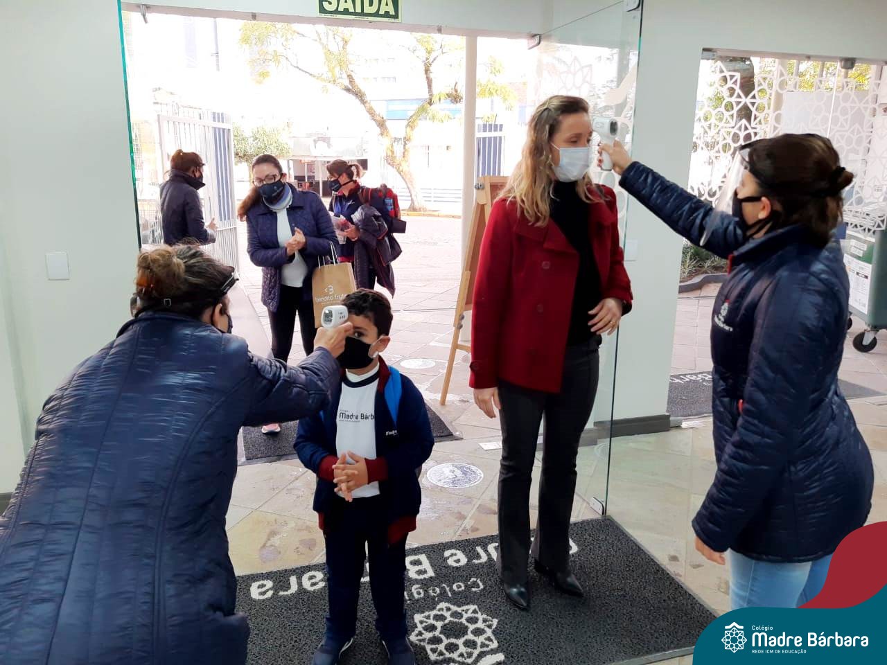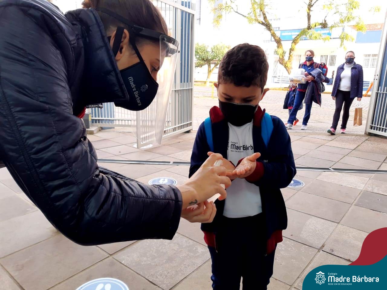 Nesta terça-feira (15) o Colégio Madre Bárbara – Rede ICM retornou com os atendimentos presenciais na Educação Infantil. Com todos os protocolos, medidas e cuidados de higiene e segurança, 184 crianças estão retornando para a escola. Destas, farão revezamento em dois grupos (A – segunda, terça e quarta-feira e B – quinta e sexta-feira), preenchendo 50% da capacidade da sala. O Colégio conta com equipes responsáveis pelo fluxo de entrada e saída, com checklist de aferição da temperatura, conferência do uso correto de máscaras, higienização dos pés no tapete sanitizante e limpeza das mãos com álcool gel.