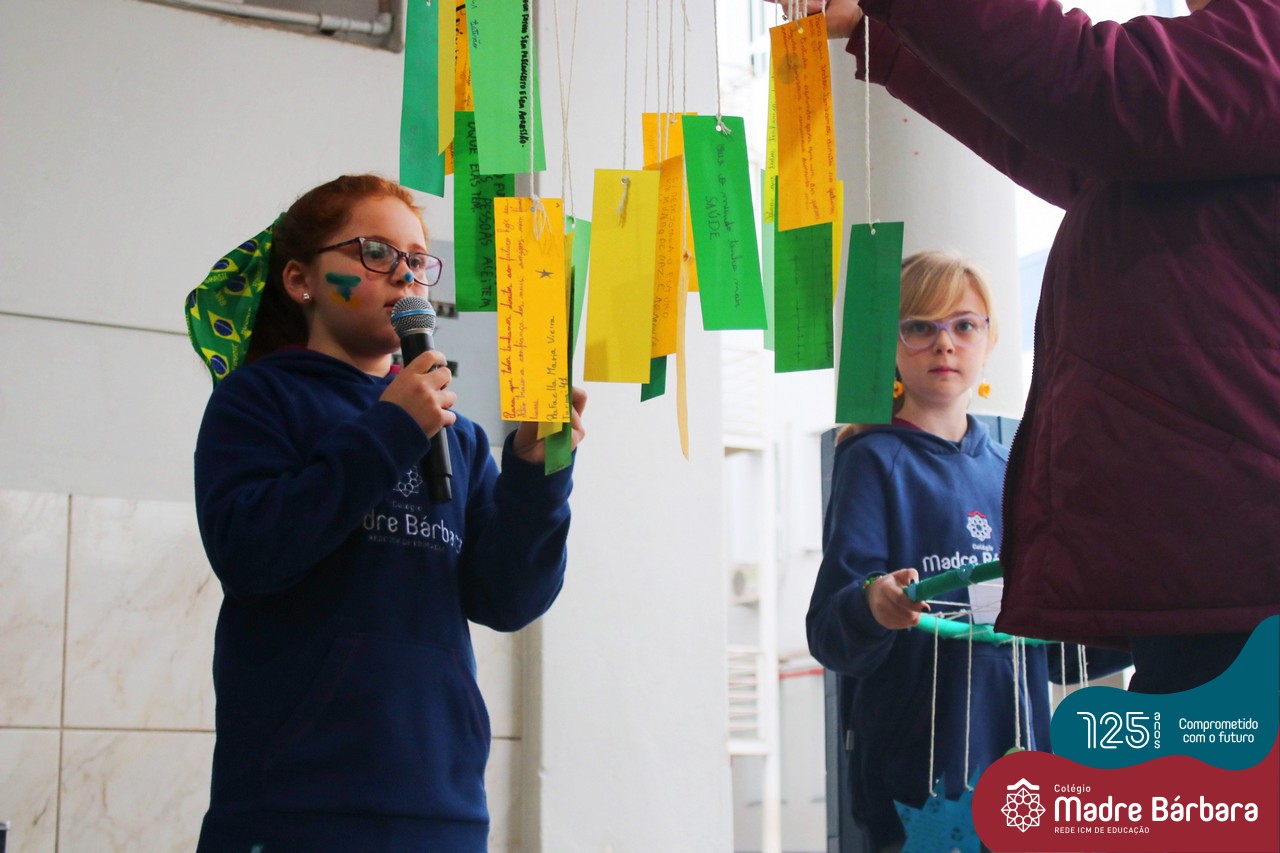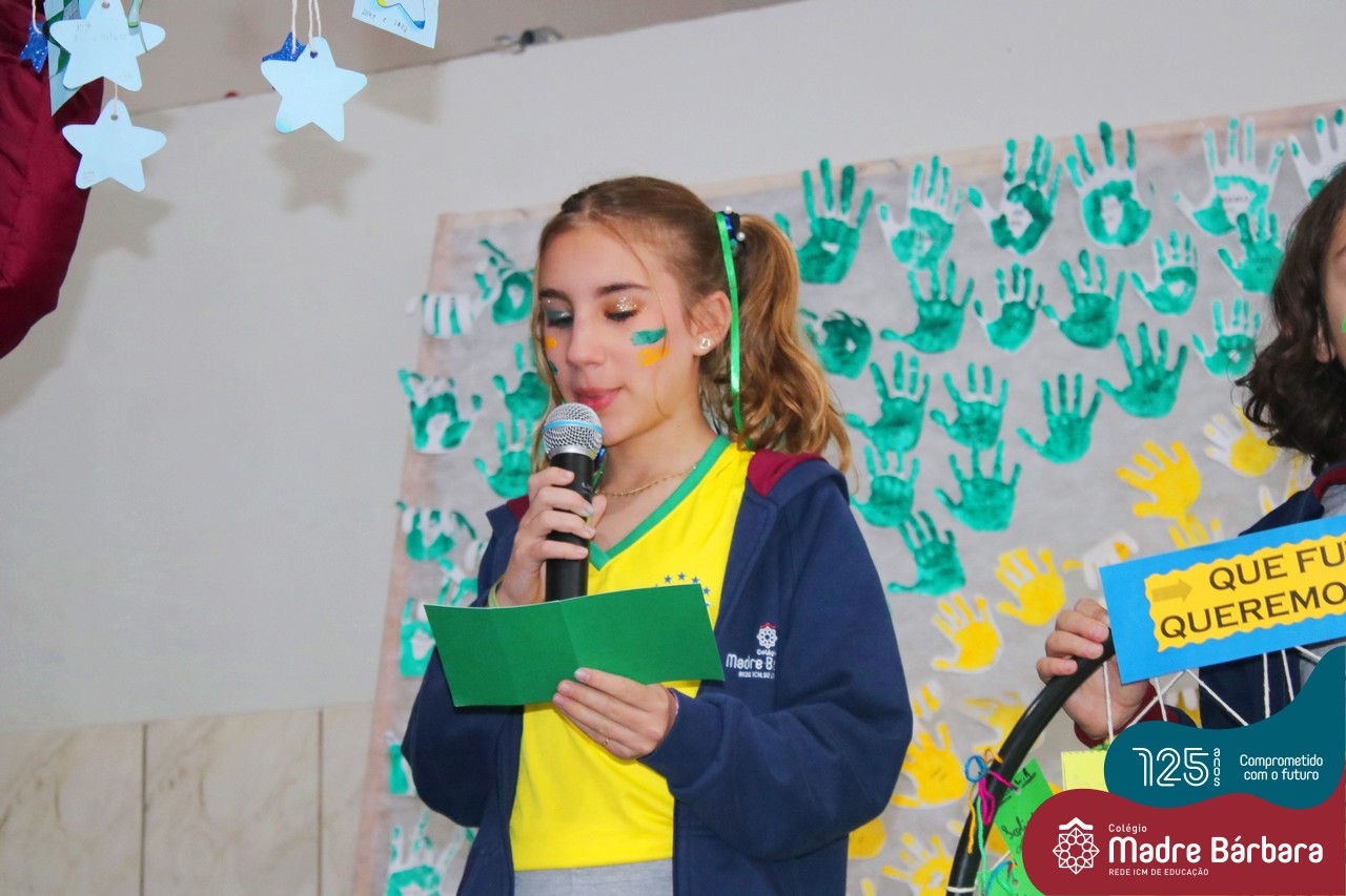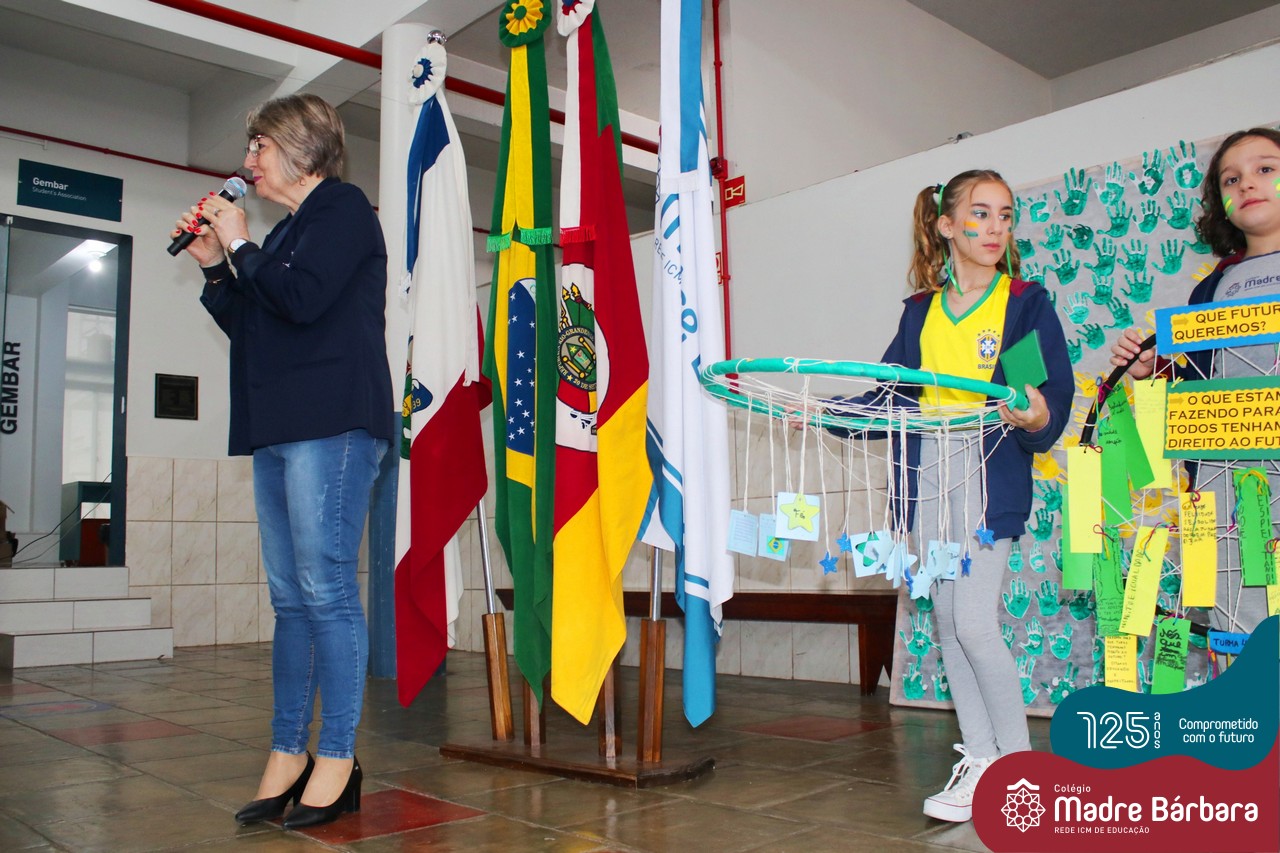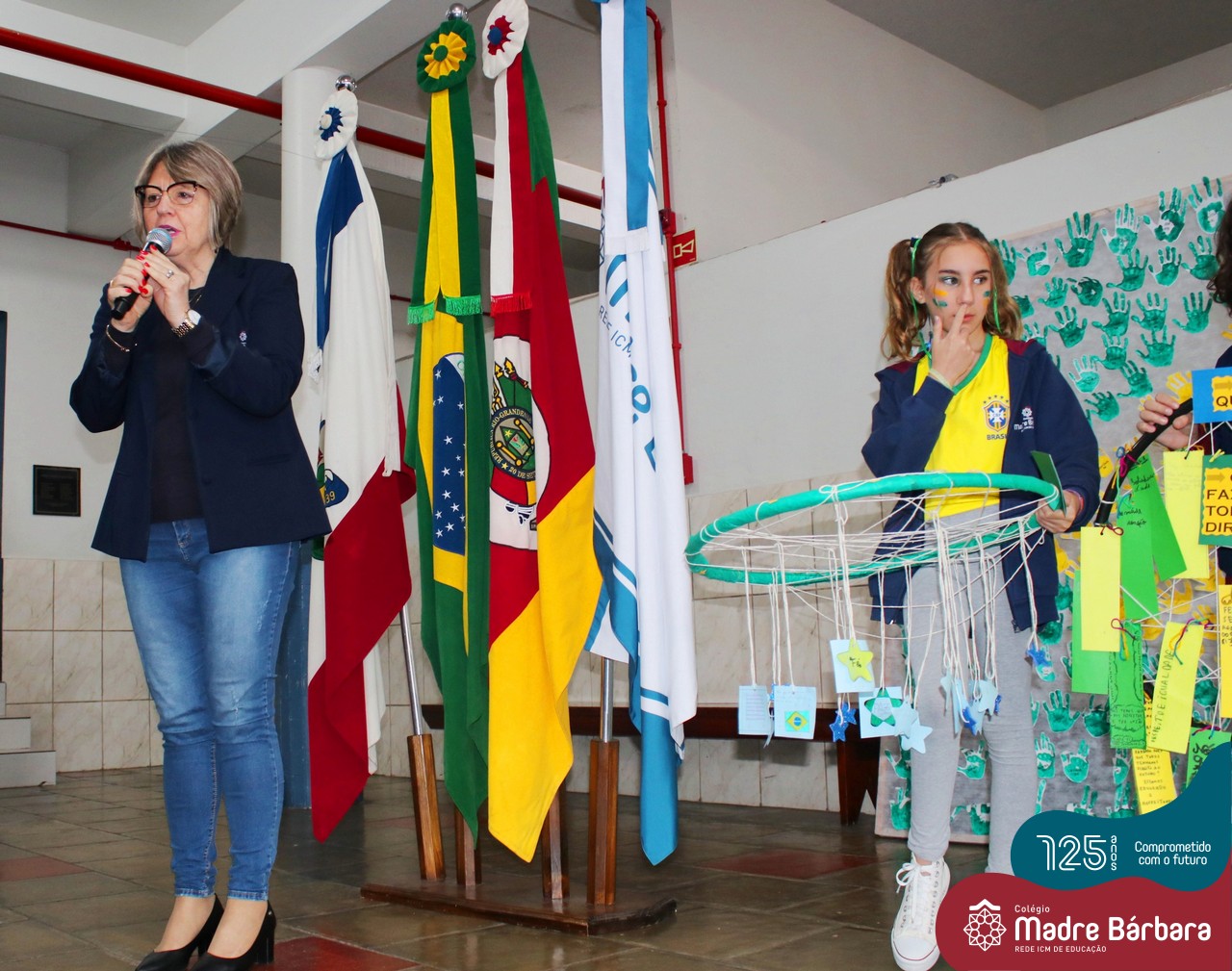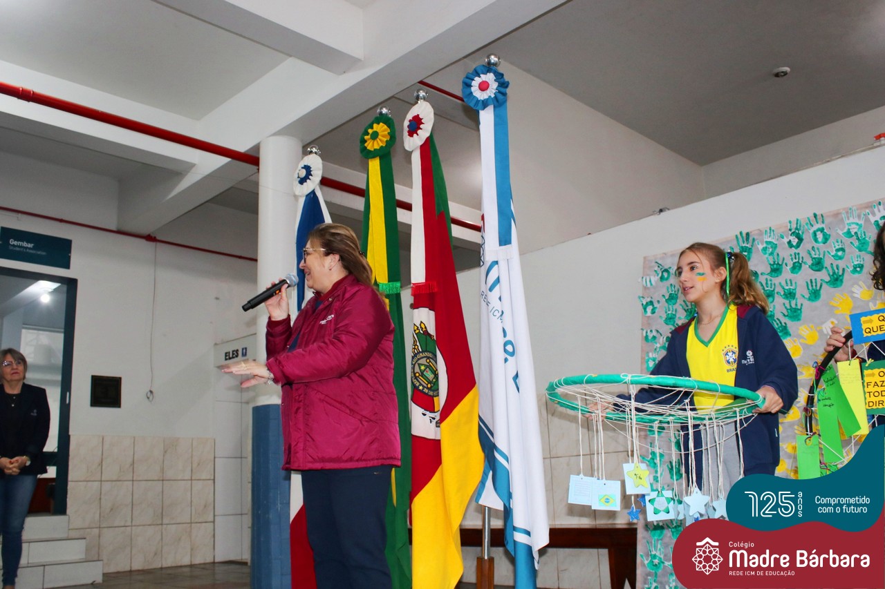 Nesta terça-feira (06.09) representantes dos alunos da Educação Infantil, Anos Iniciais, Anos Finais e Ensino Médio estiveram na área coberta do Colégio Madre Bárbara – Rede ICM para o encerramento das atividades da Semana da Pátria. Alunos dos Anos Iniciais e da Educação Infantil levaram seus trabalhos e apresentaram as intenções/reflexões elaboradas em ala sobre os desejos para o país.