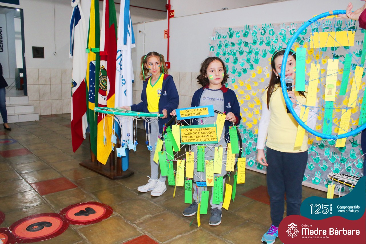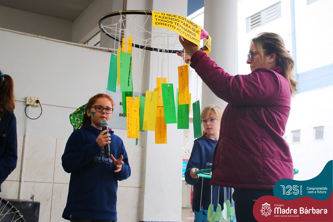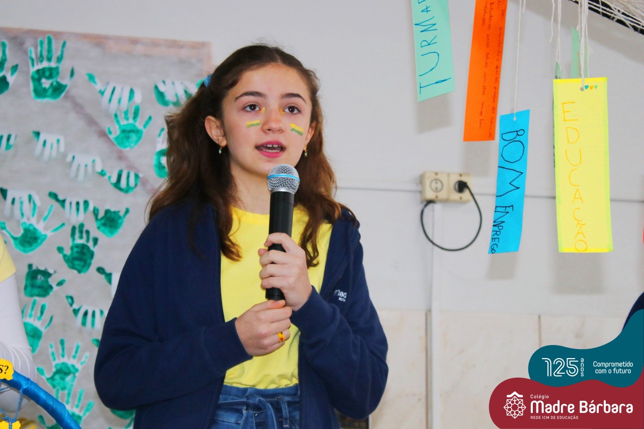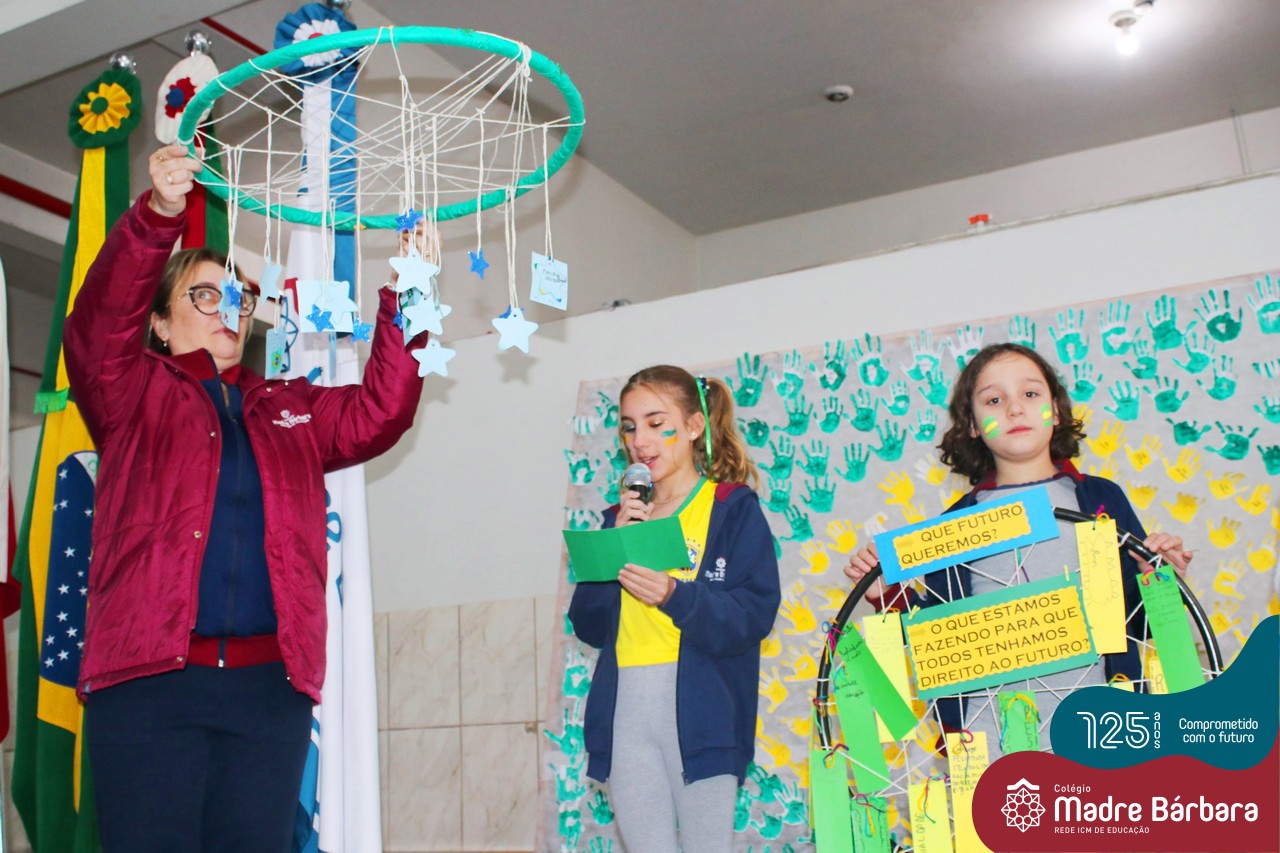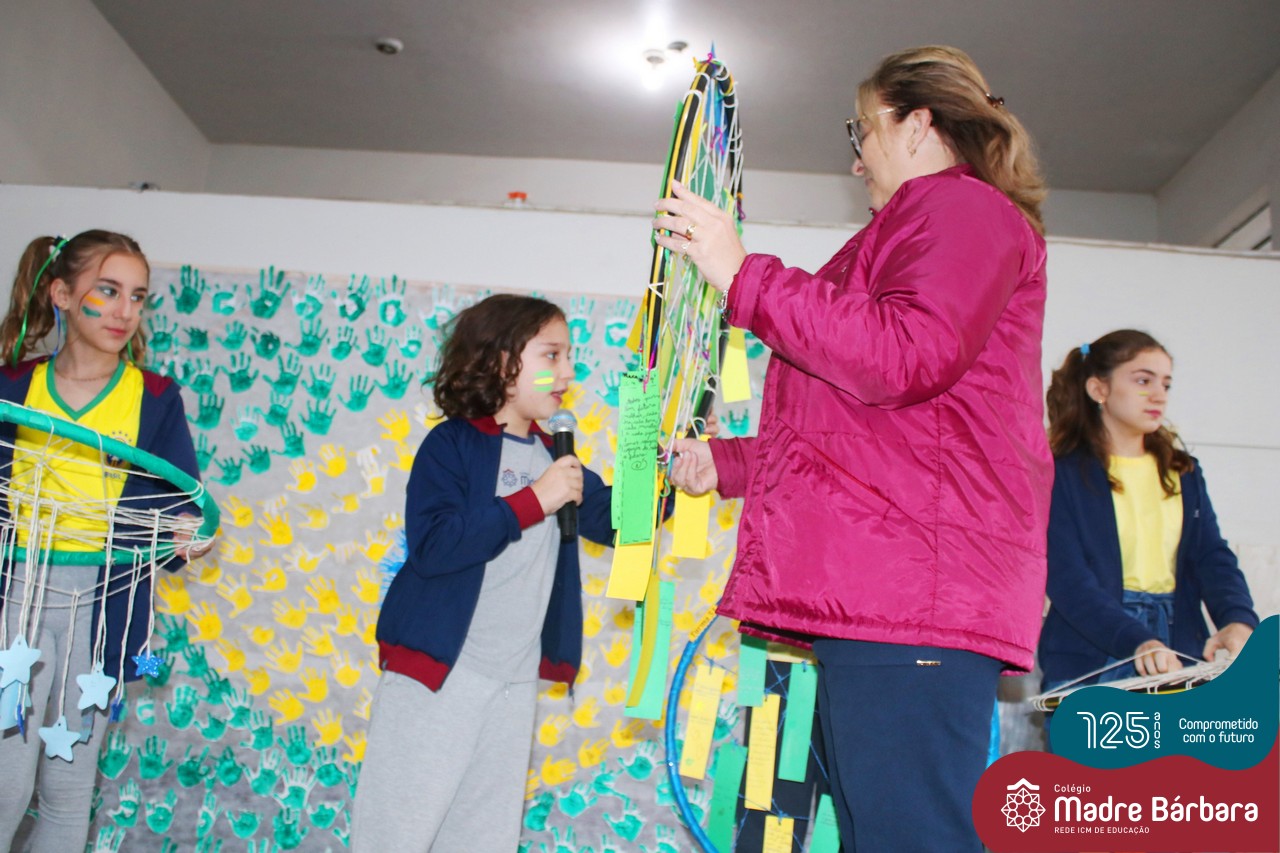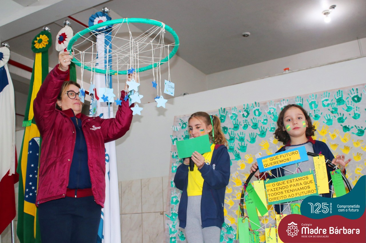 Nesta terça-feira (06.09) representantes dos alunos da Educação Infantil, Anos Iniciais, Anos Finais e Ensino Médio estiveram na área coberta do Colégio Madre Bárbara – Rede ICM para o encerramento das atividades da Semana da Pátria. Alunos dos Anos Iniciais e da Educação Infantil levaram seus trabalhos e apresentaram as intenções/reflexões elaboradas em ala sobre os desejos para o país.