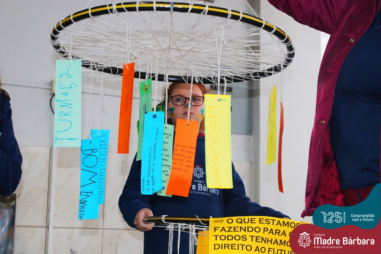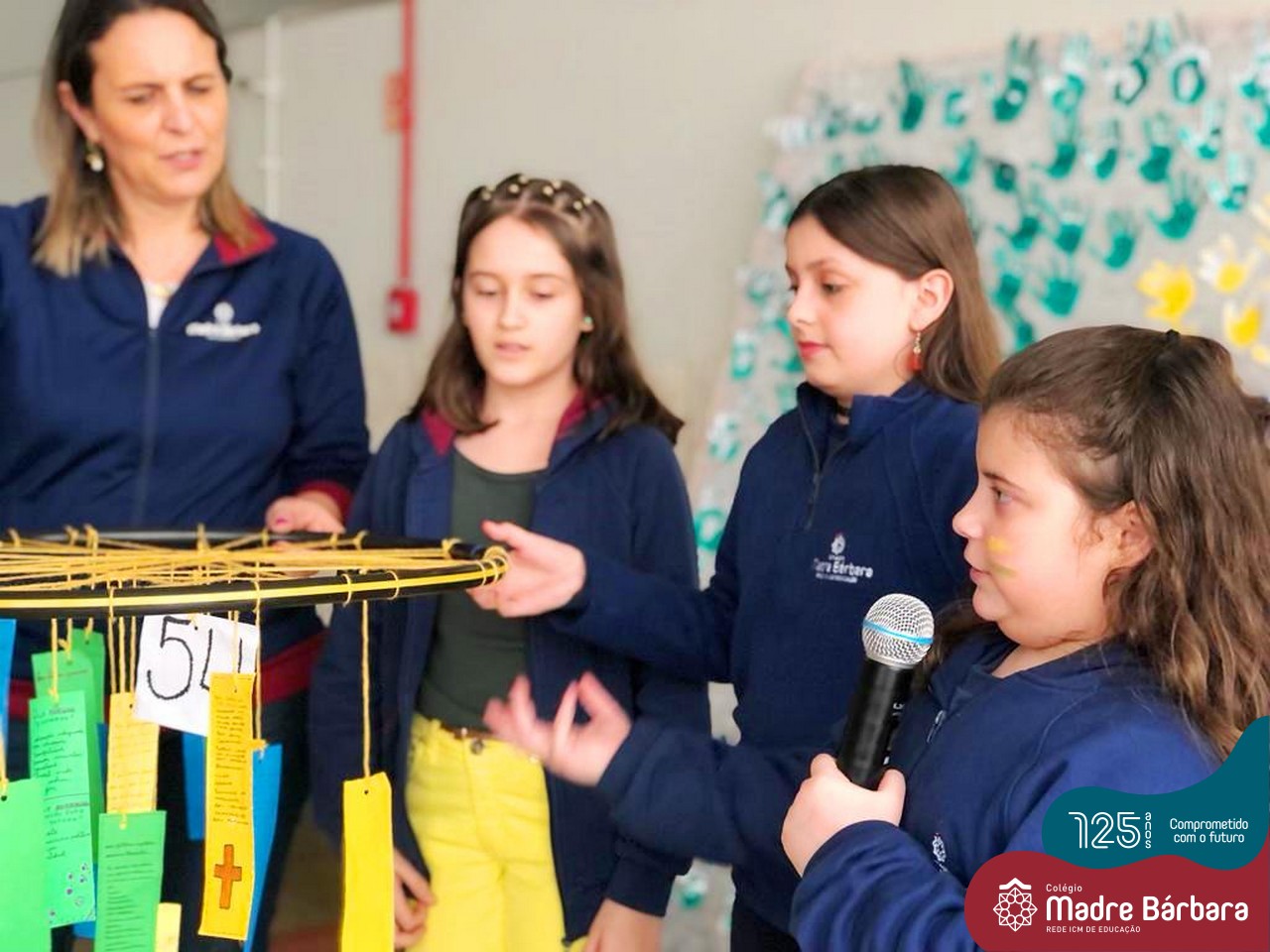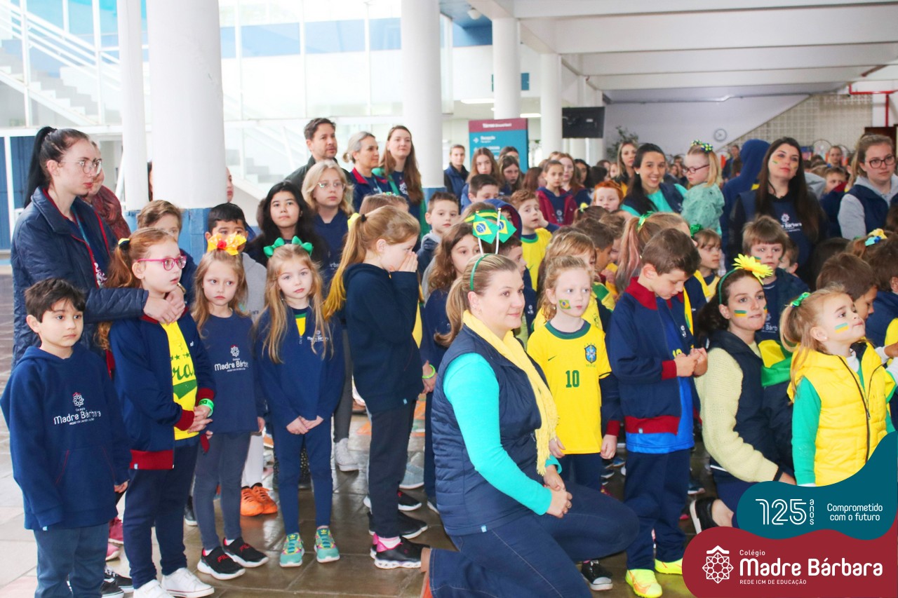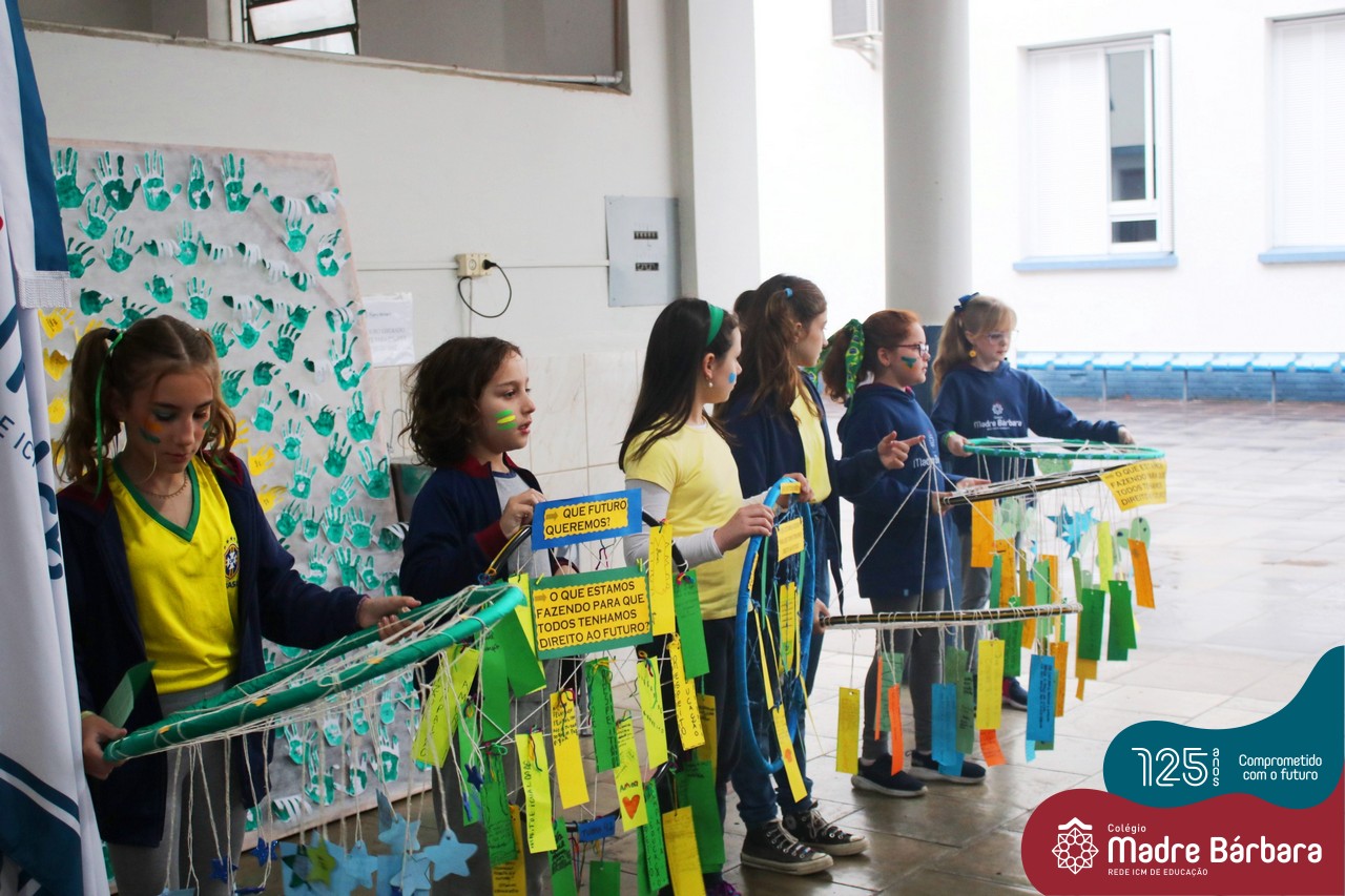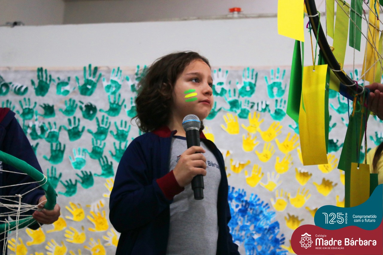 Nesta terça-feira (06.09) representantes dos alunos da Educação Infantil, Anos Iniciais, Anos Finais e Ensino Médio estiveram na área coberta do Colégio Madre Bárbara – Rede ICM para o encerramento das atividades da Semana da Pátria. Alunos dos Anos Iniciais e da Educação Infantil levaram seus trabalhos e apresentaram as intenções/reflexões elaboradas em ala sobre os desejos para o país.