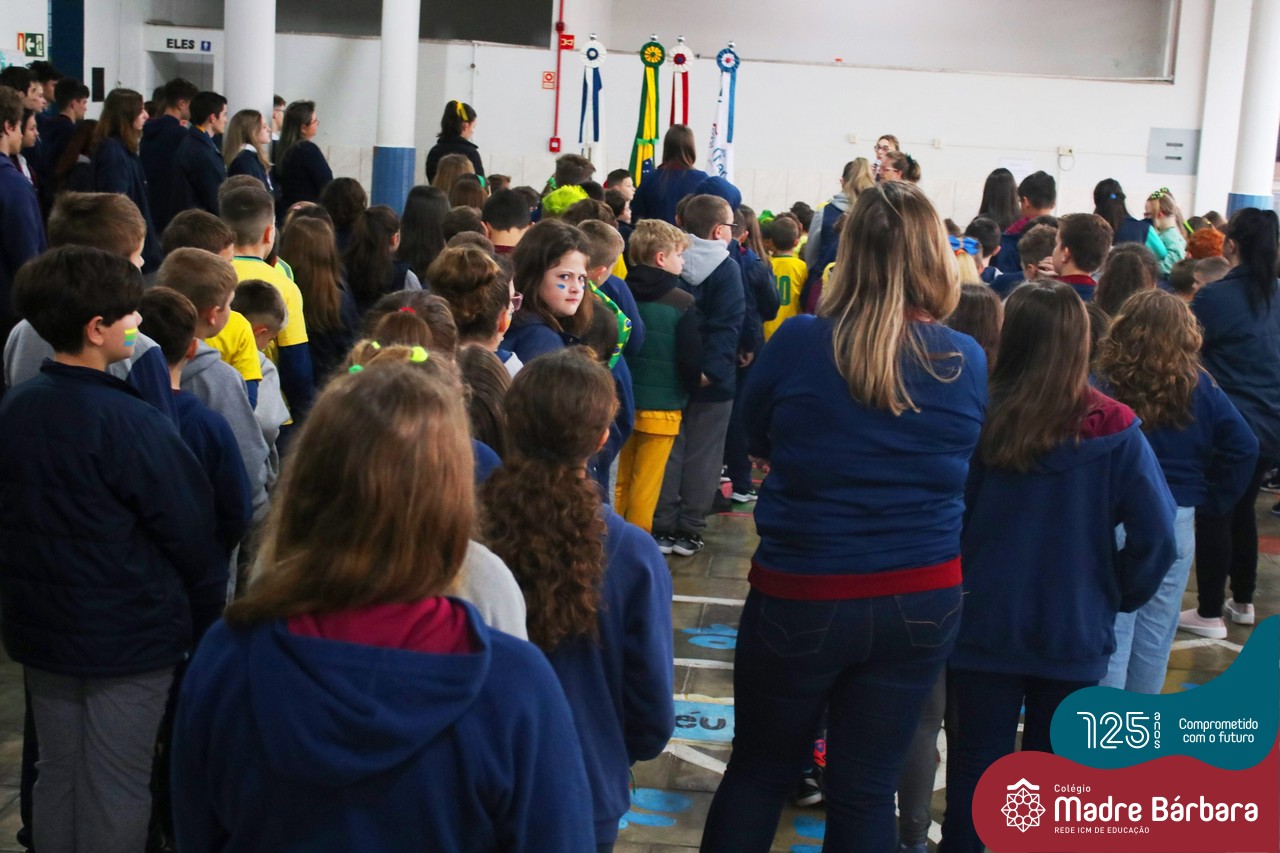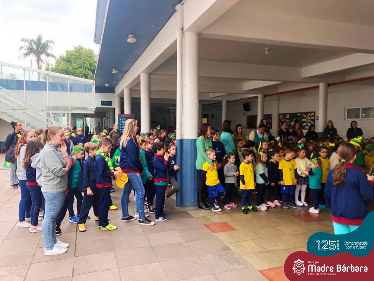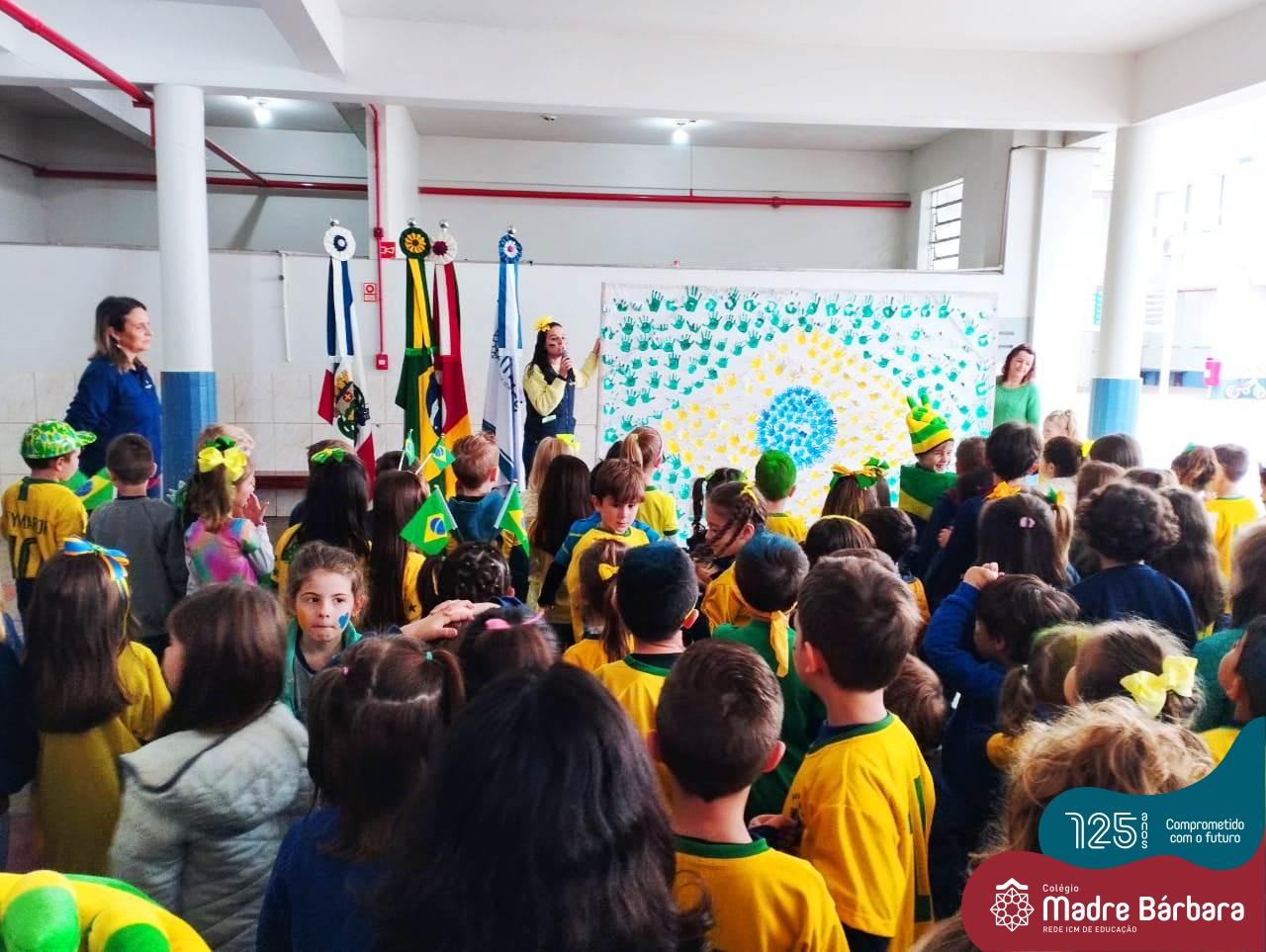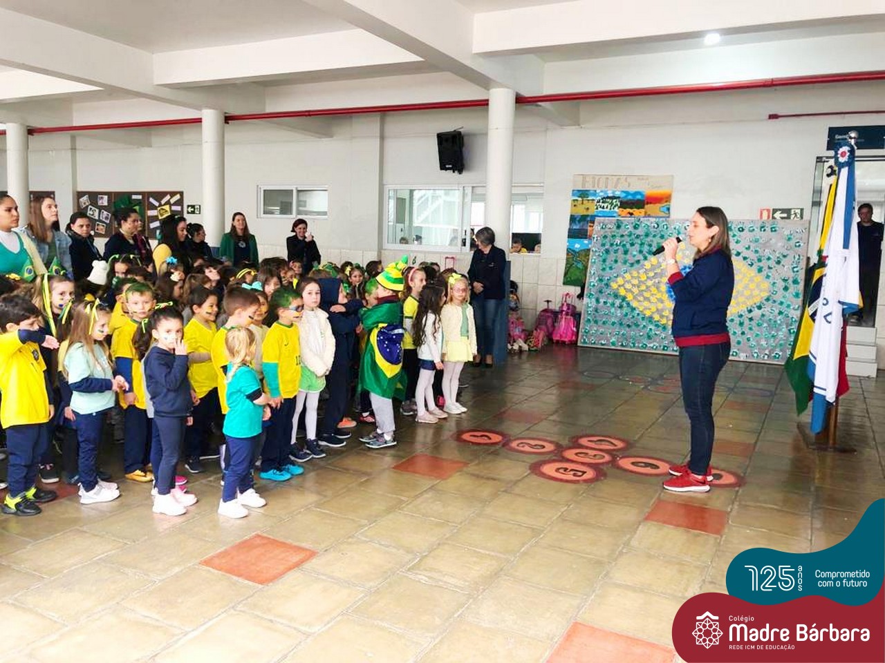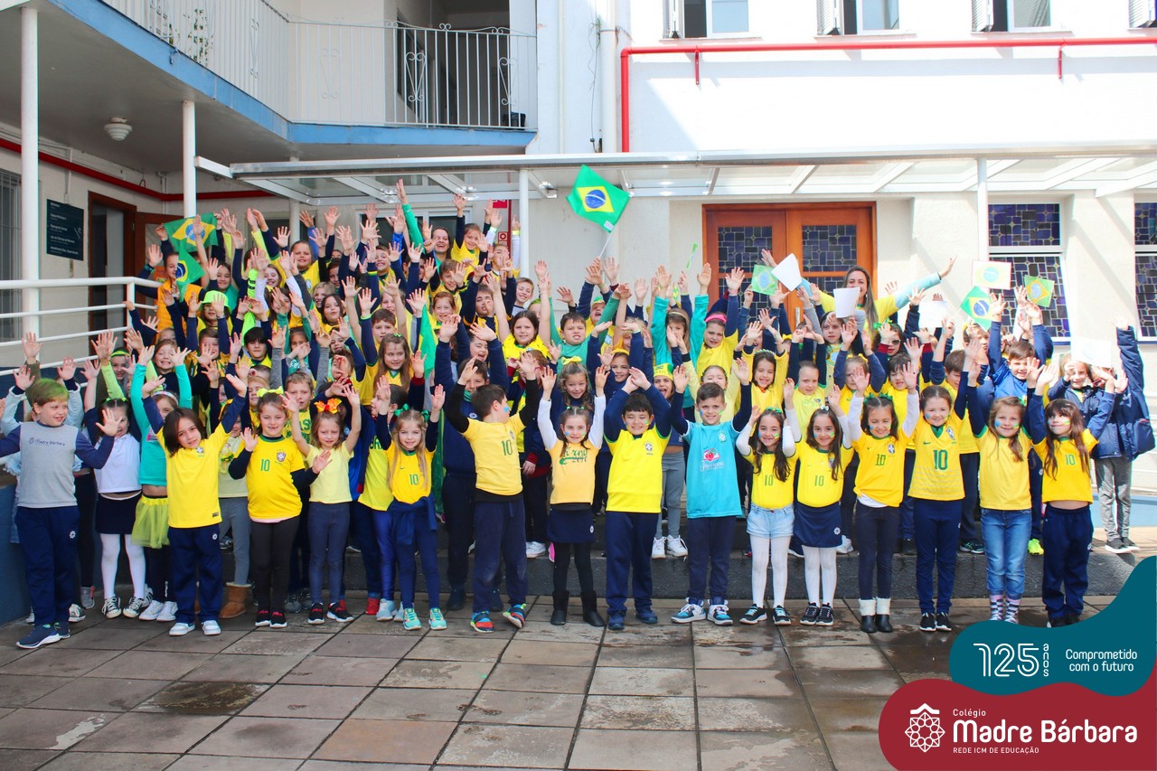 Nesta terça-feira (06.09) representantes dos alunos da Educação Infantil, Anos Iniciais, Anos Finais e Ensino Médio estiveram na área coberta do Colégio Madre Bárbara – Rede ICM para o encerramento das atividades da Semana da Pátria. Alunos dos Anos Iniciais e da Educação Infantil levaram seus trabalhos e apresentaram as intenções/reflexões elaboradas em ala sobre os desejos para o país.