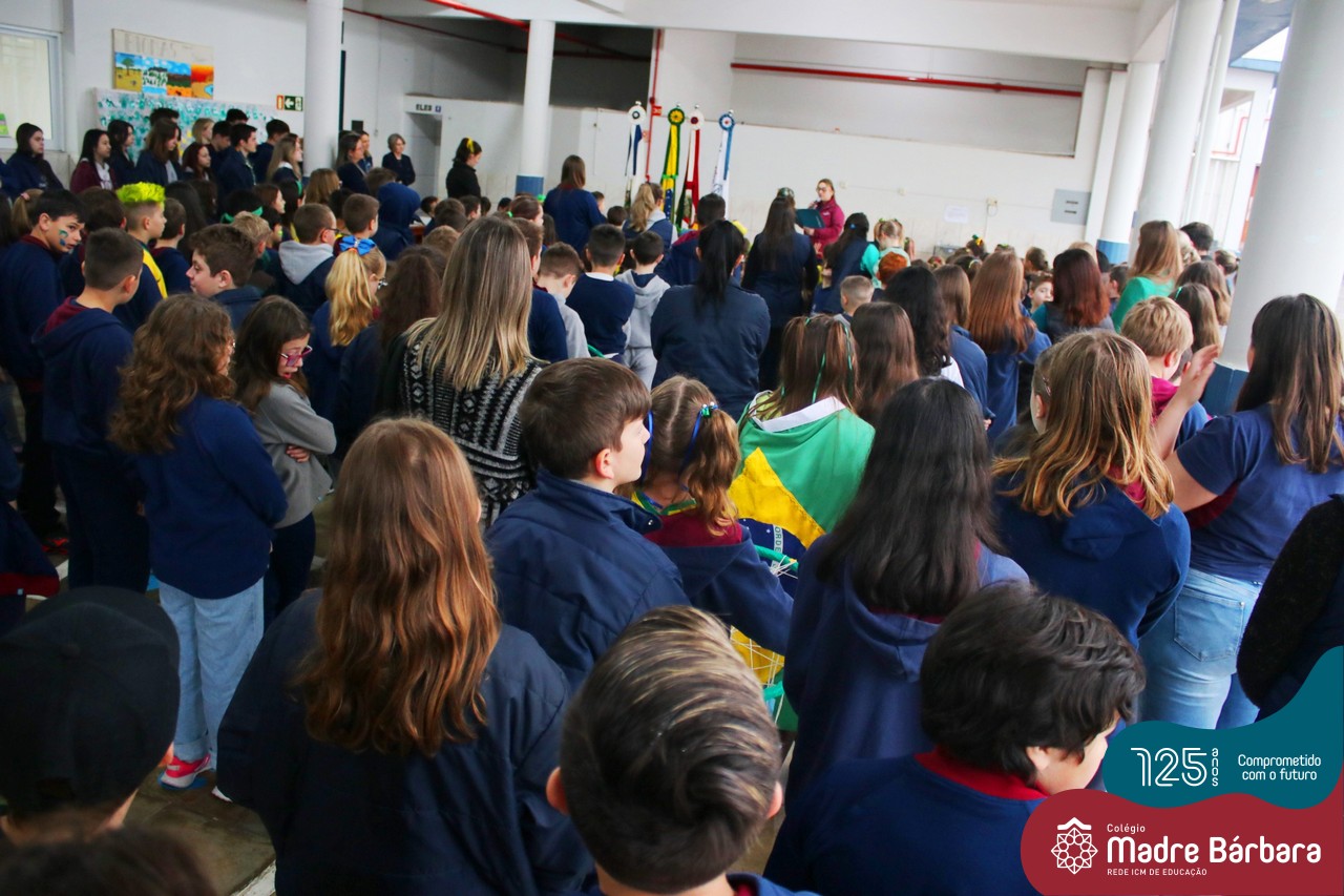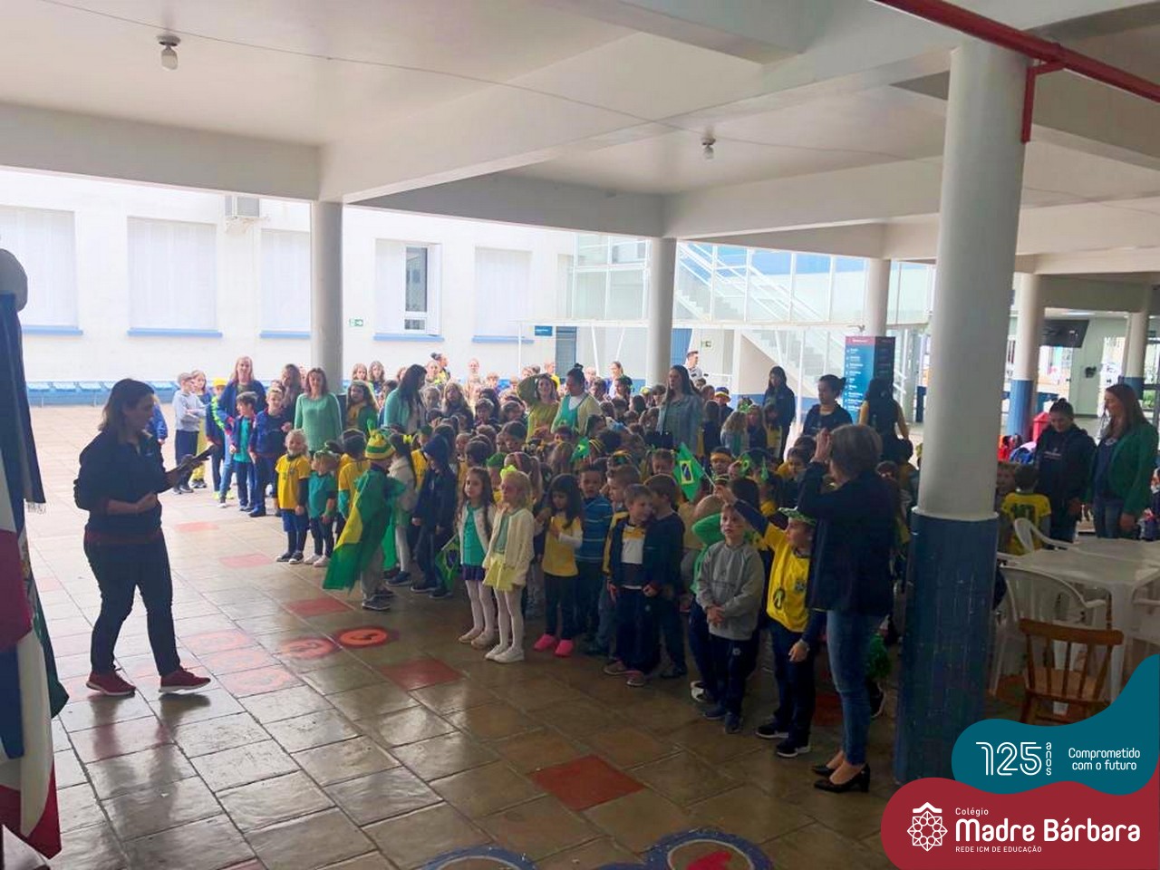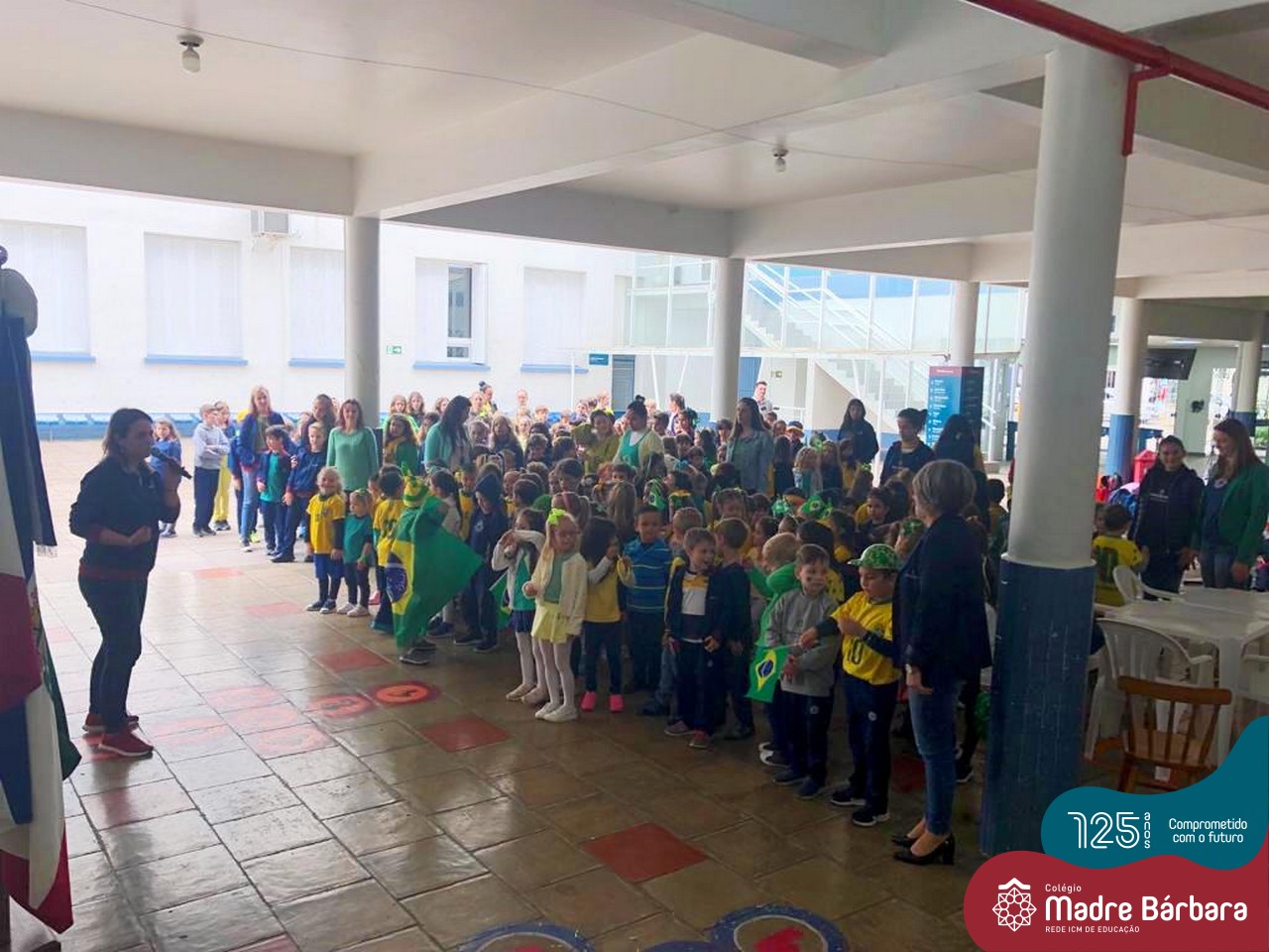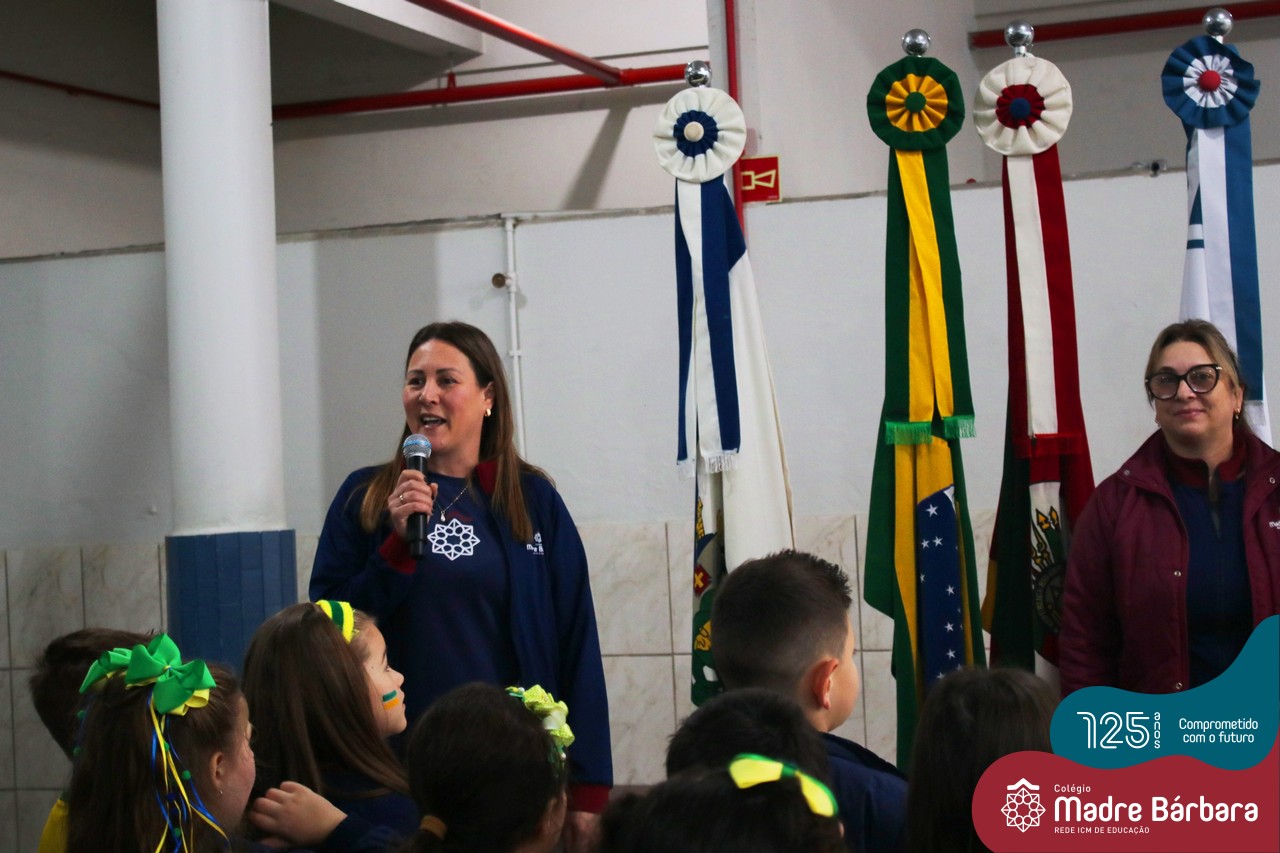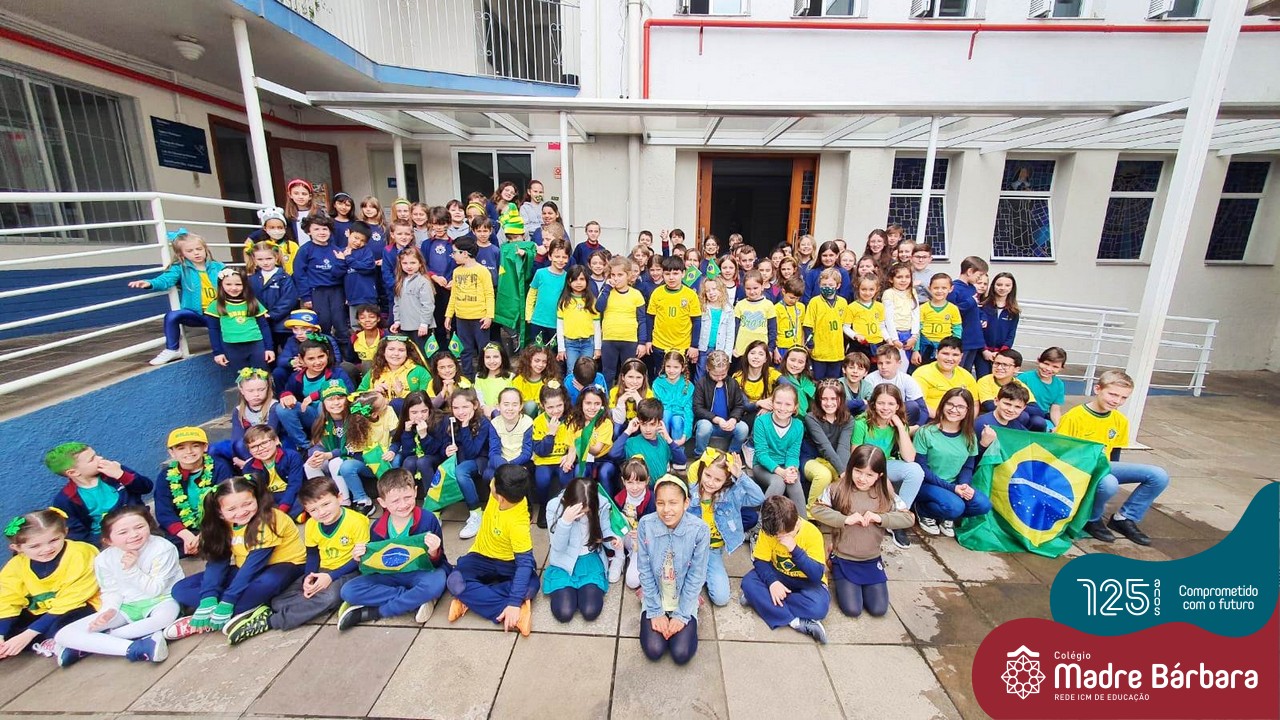 Nesta terça-feira (06.09) representantes dos alunos da Educação Infantil, Anos Iniciais, Anos Finais e Ensino Médio estiveram na área coberta do Colégio Madre Bárbara – Rede ICM para o encerramento das atividades da Semana da Pátria. Alunos dos Anos Iniciais e da Educação Infantil levaram seus trabalhos e apresentaram as intenções/reflexões elaboradas em ala sobre os desejos para o país.