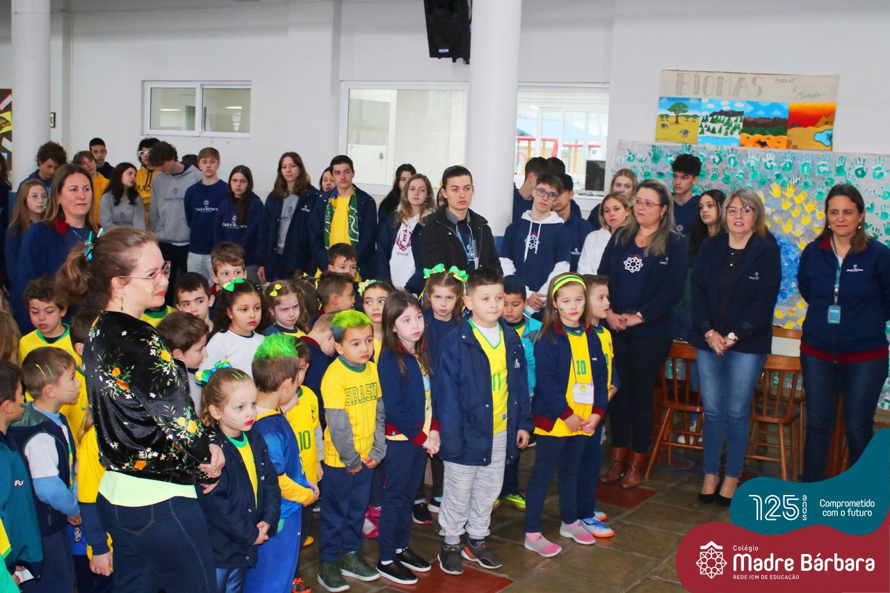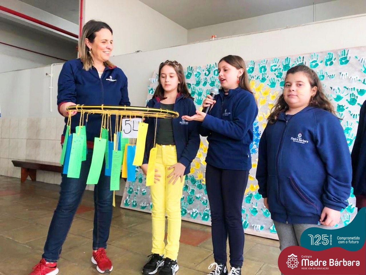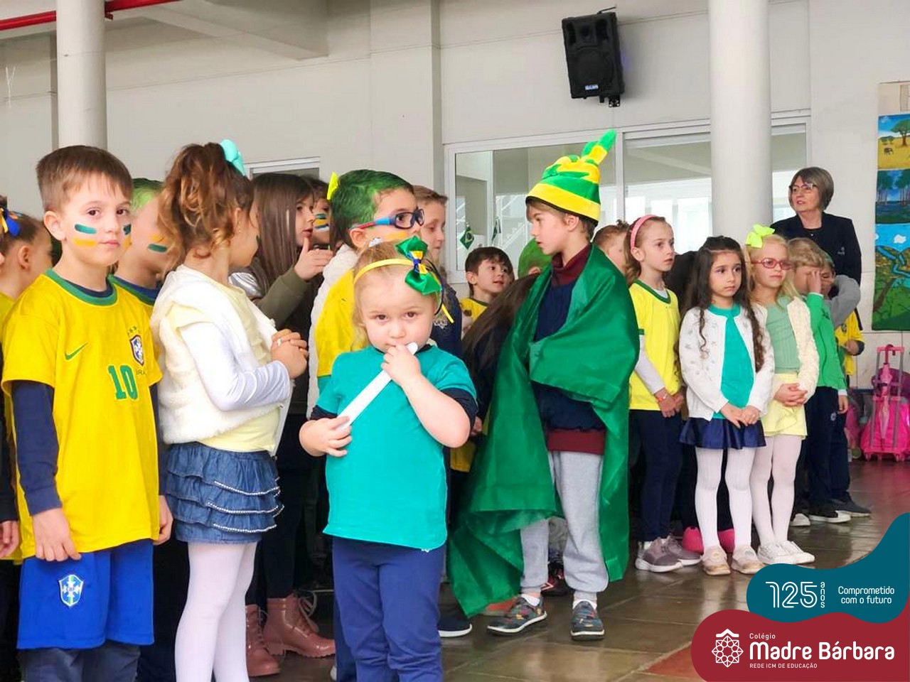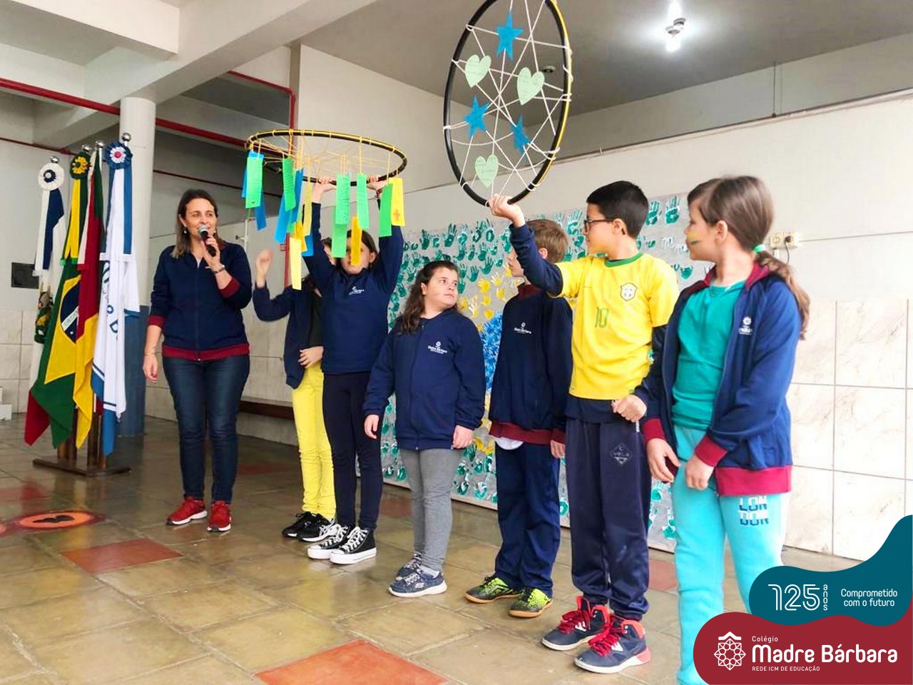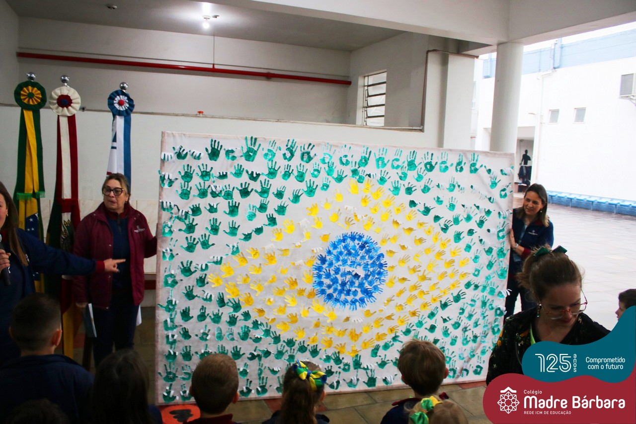 Nesta terça-feira (06.09) representantes dos alunos da Educação Infantil, Anos Iniciais, Anos Finais e Ensino Médio estiveram na área coberta do Colégio Madre Bárbara – Rede ICM para o encerramento das atividades da Semana da Pátria. Alunos dos Anos Iniciais e da Educação Infantil levaram seus trabalhos e apresentaram as intenções/reflexões elaboradas em ala sobre os desejos para o país.