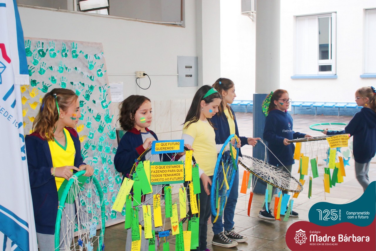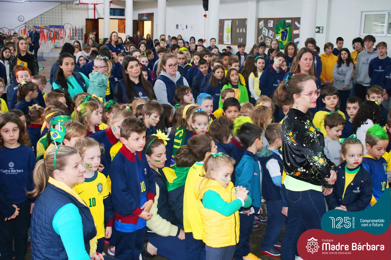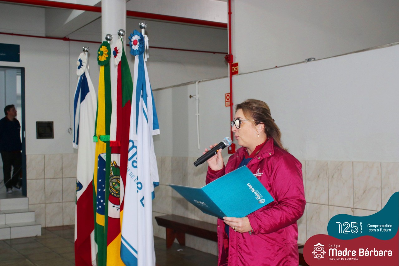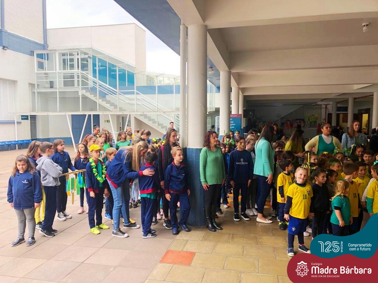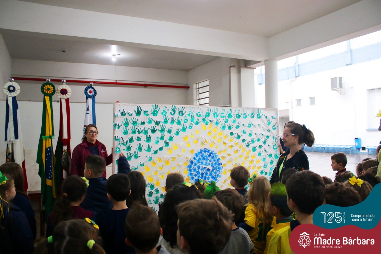 Nesta terça-feira (06.09) representantes dos alunos da Educação Infantil, Anos Iniciais, Anos Finais e Ensino Médio estiveram na área coberta do Colégio Madre Bárbara – Rede ICM para o encerramento das atividades da Semana da Pátria. Alunos dos Anos Iniciais e da Educação Infantil levaram seus trabalhos e apresentaram as intenções/reflexões elaboradas em ala sobre os desejos para o país.