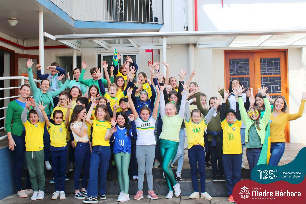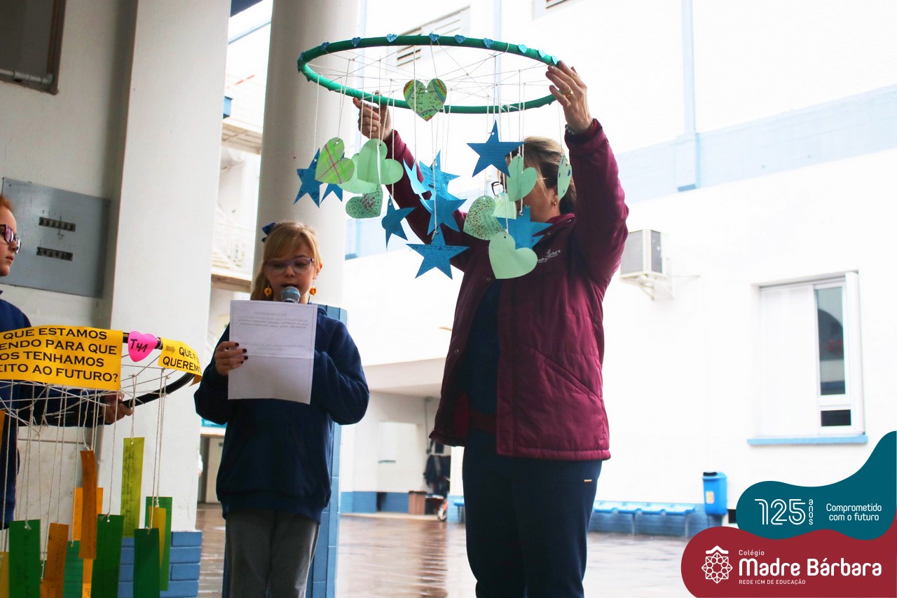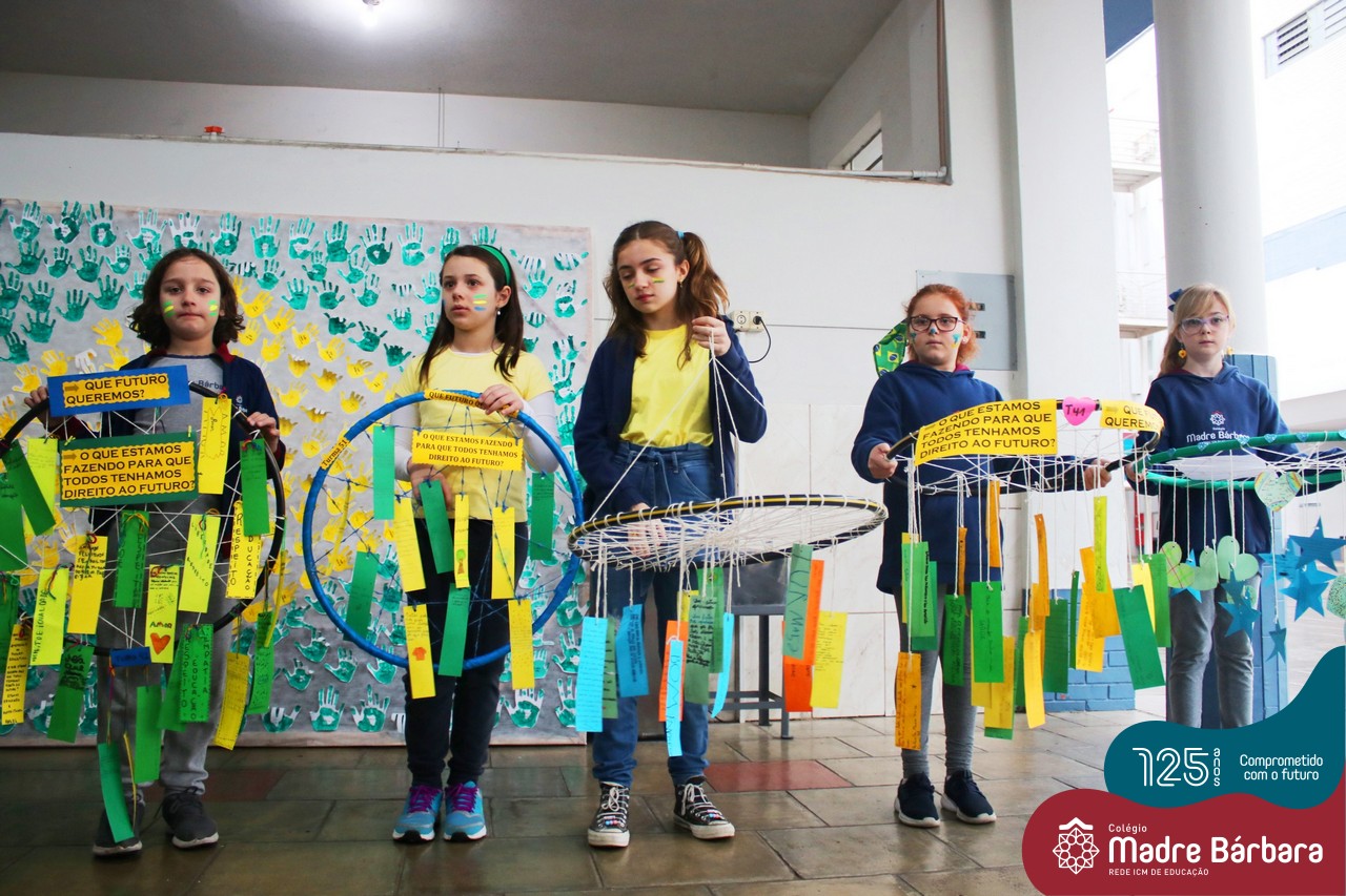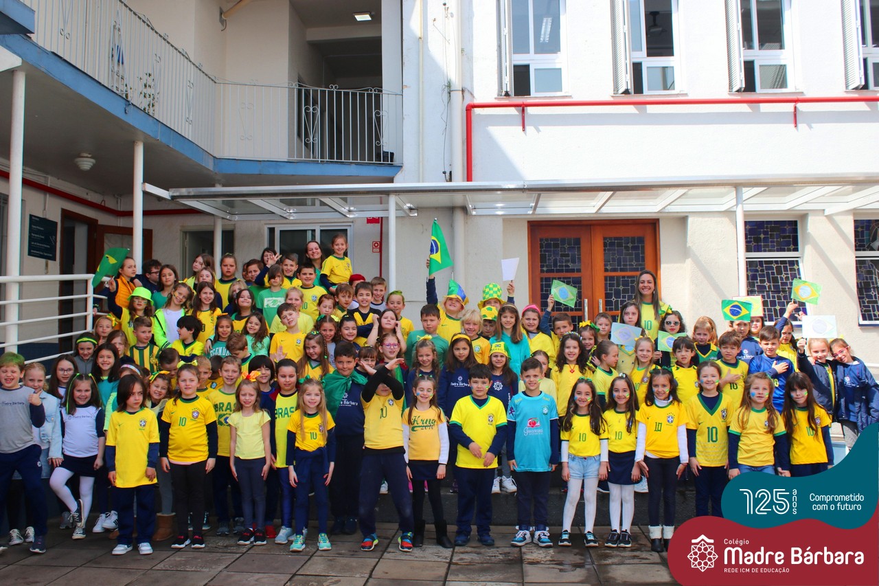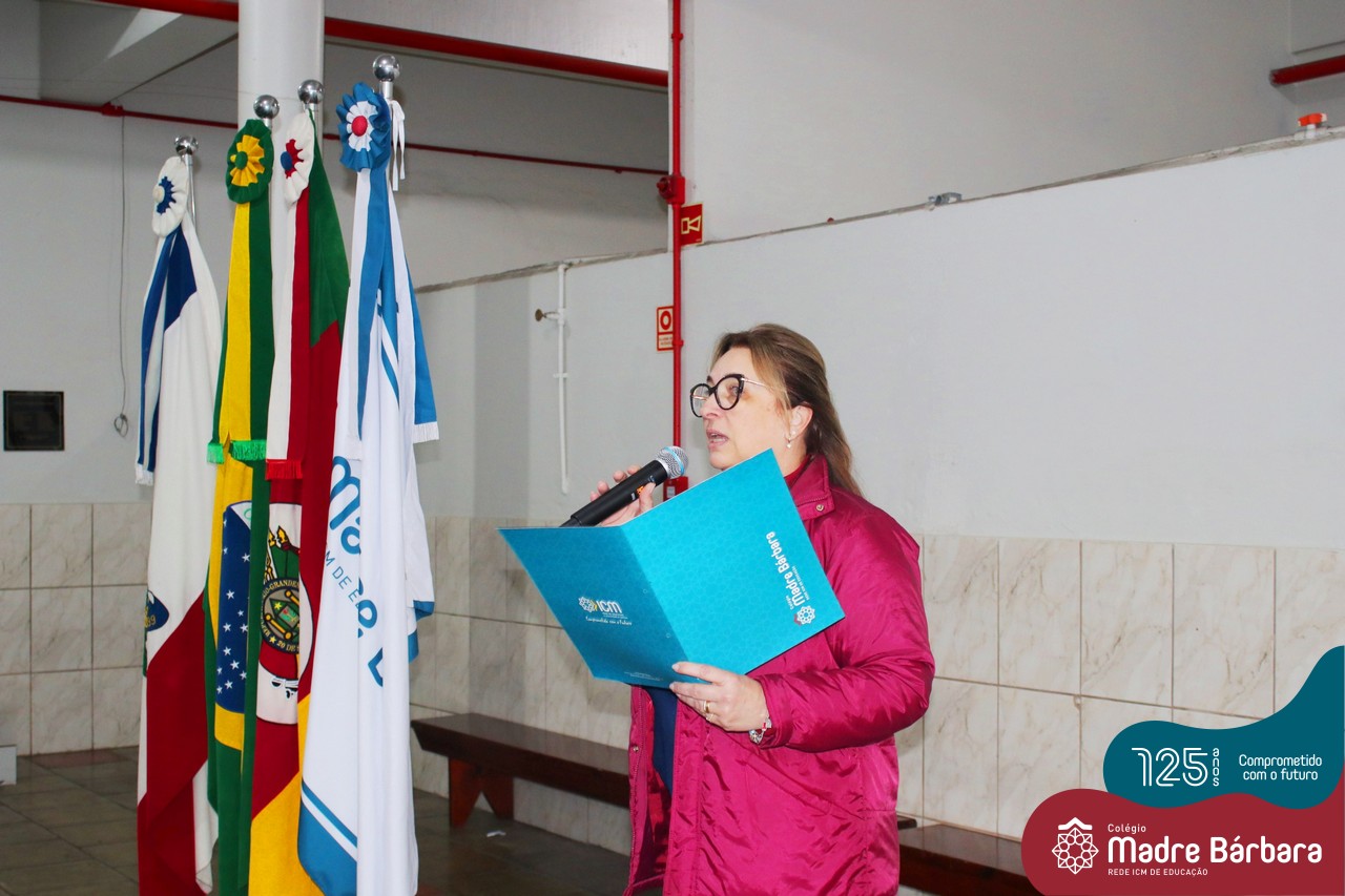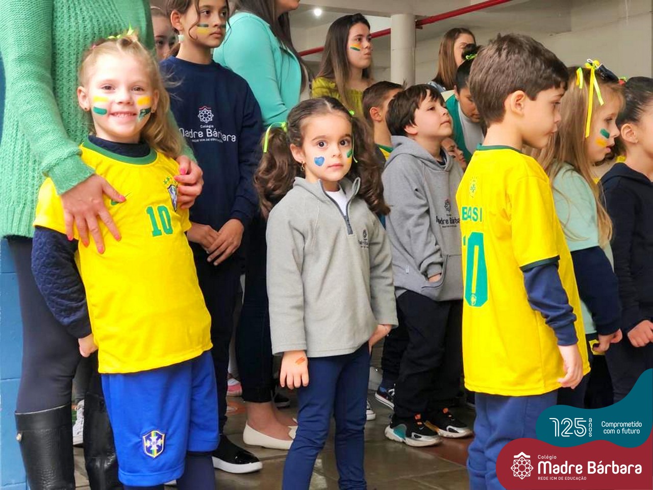 Nesta terça-feira (06.09) representantes dos alunos da Educação Infantil, Anos Iniciais, Anos Finais e Ensino Médio estiveram na área coberta do Colégio Madre Bárbara – Rede ICM para o encerramento das atividades da Semana da Pátria. Alunos dos Anos Iniciais e da Educação Infantil levaram seus trabalhos e apresentaram as intenções/reflexões elaboradas em ala sobre os desejos para o país.