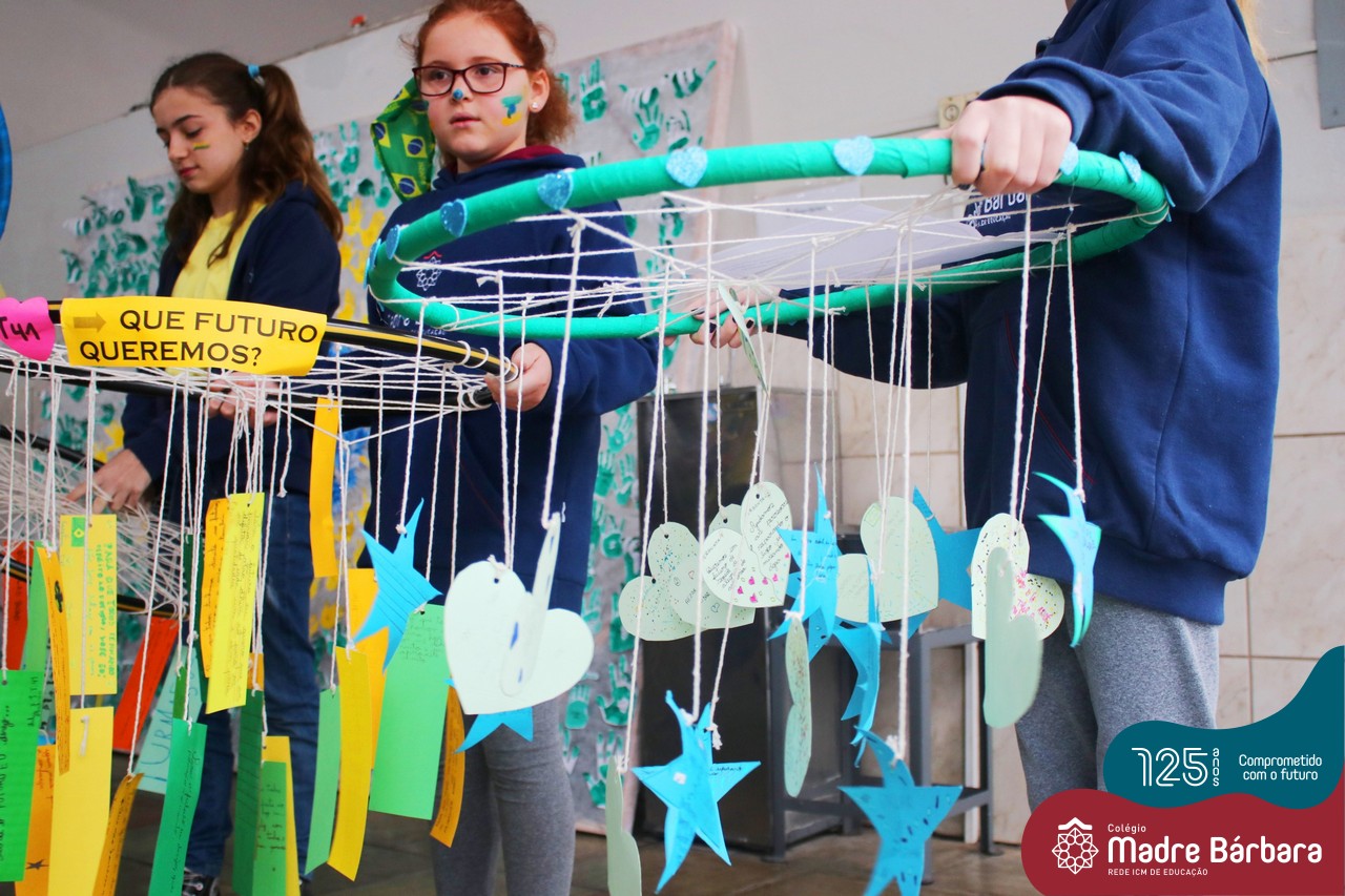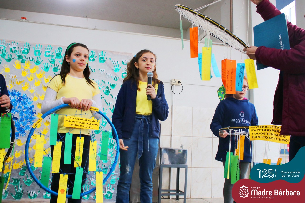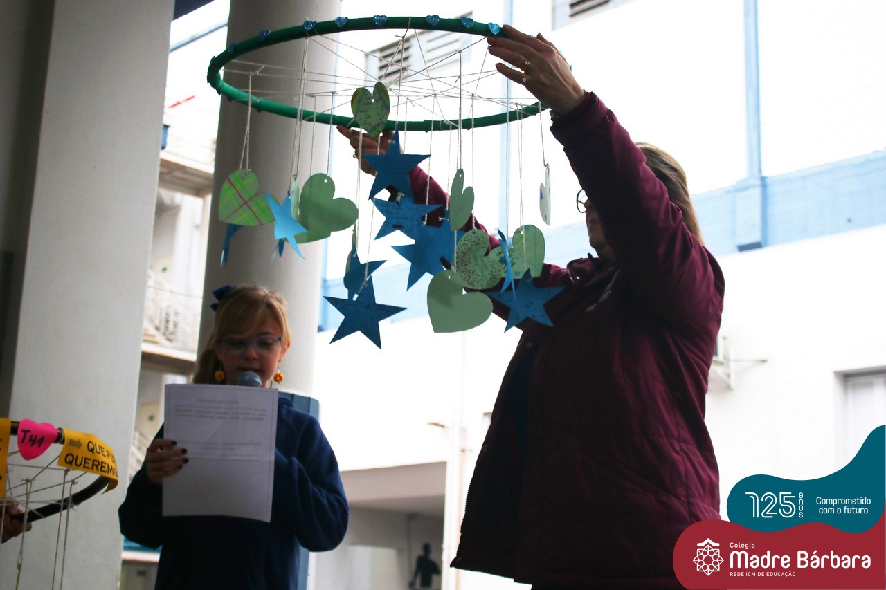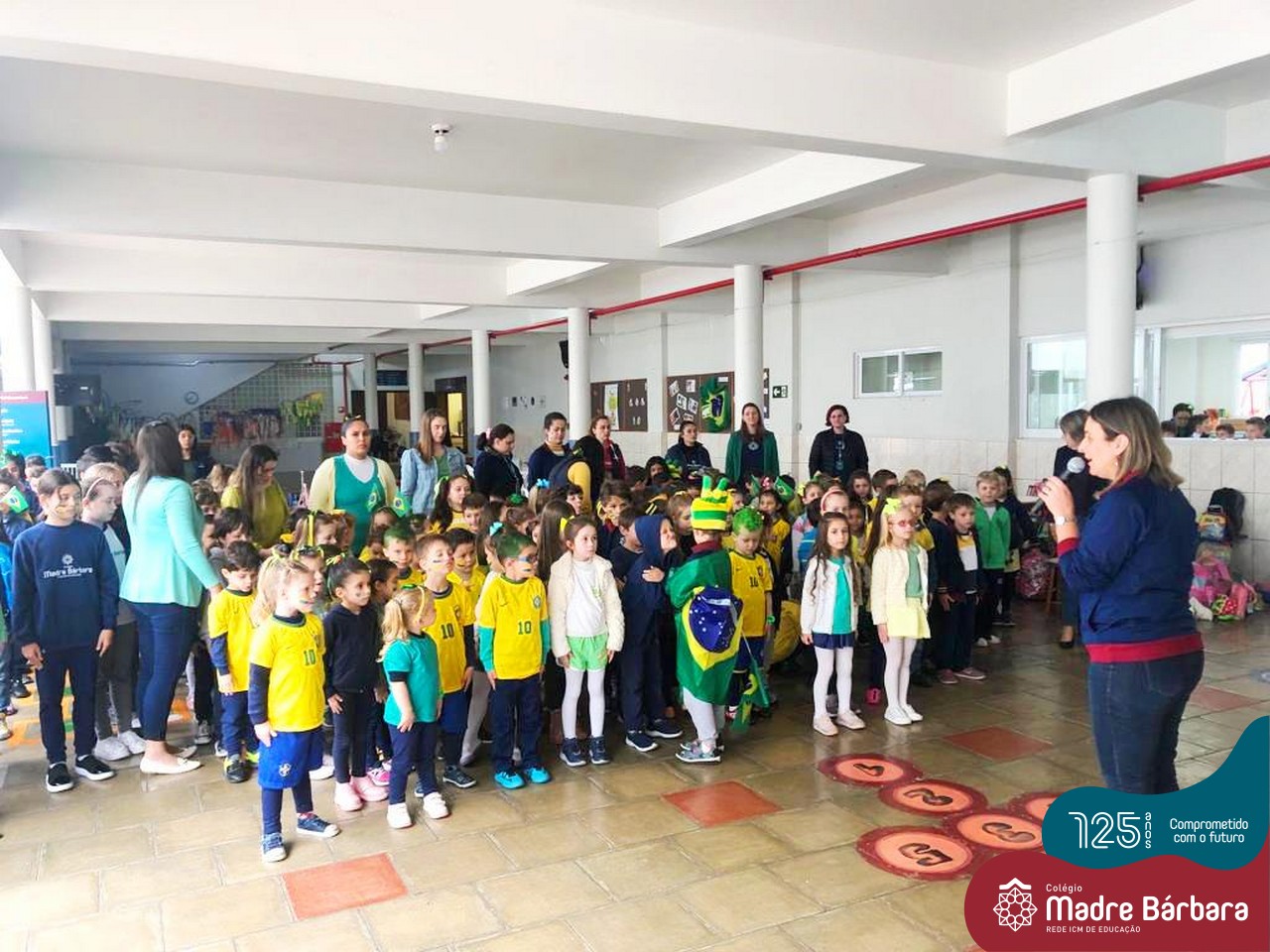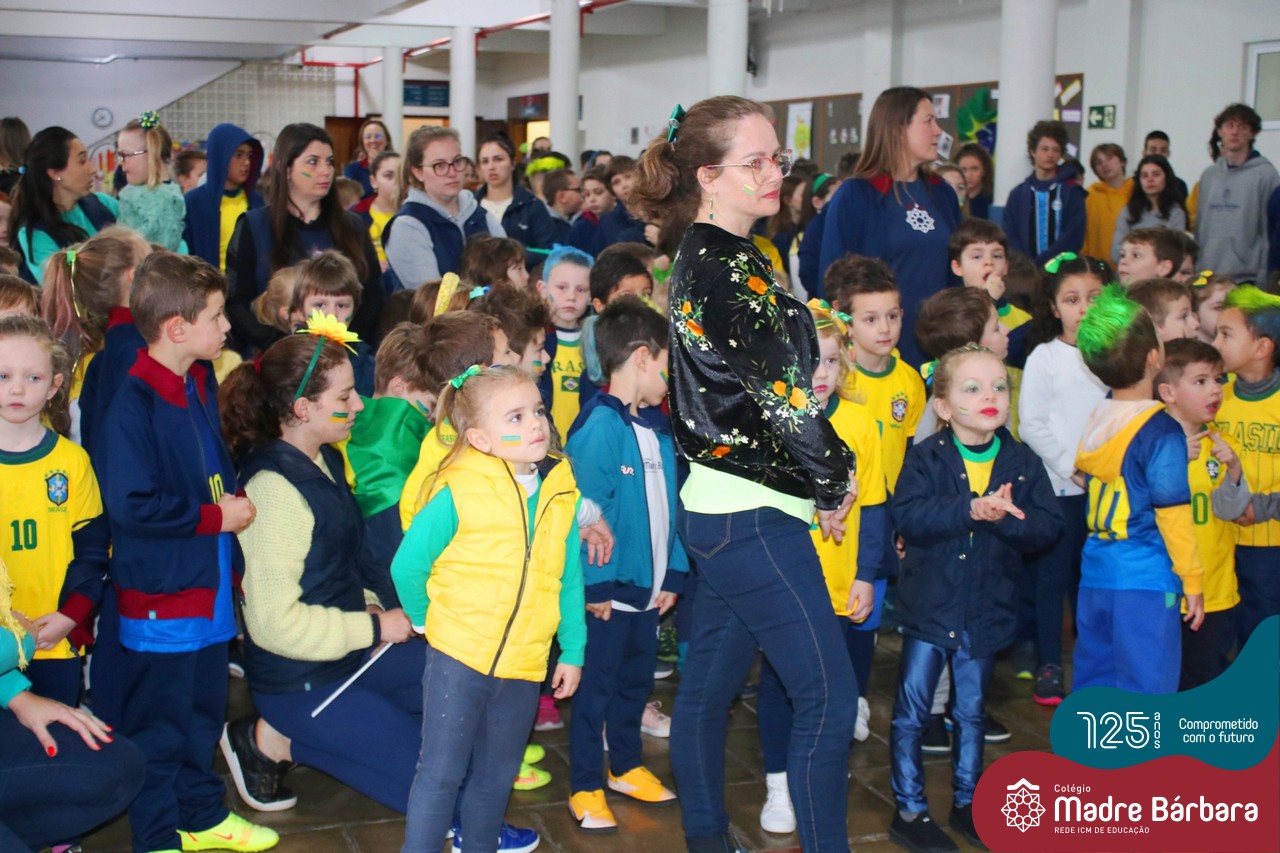 Nesta terça-feira (06.09) representantes dos alunos da Educação Infantil, Anos Iniciais, Anos Finais e Ensino Médio estiveram na área coberta do Colégio Madre Bárbara – Rede ICM para o encerramento das atividades da Semana da Pátria. Alunos dos Anos Iniciais e da Educação Infantil levaram seus trabalhos e apresentaram as intenções/reflexões elaboradas em ala sobre os desejos para o país.