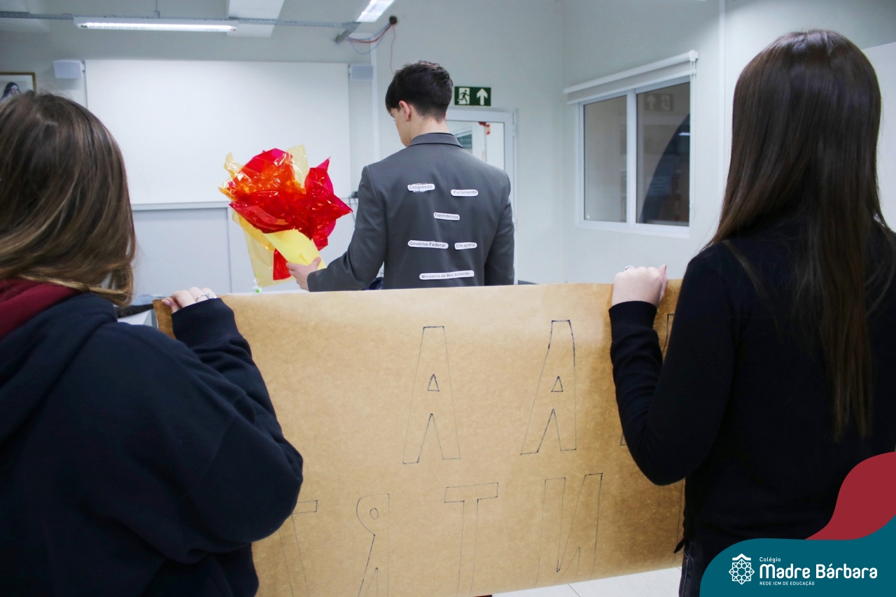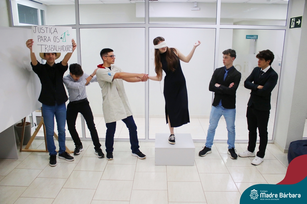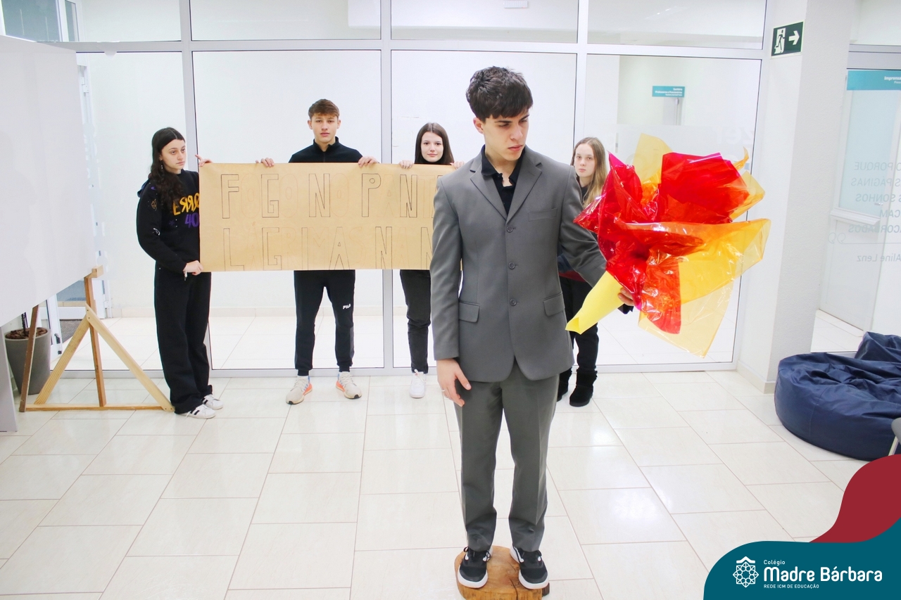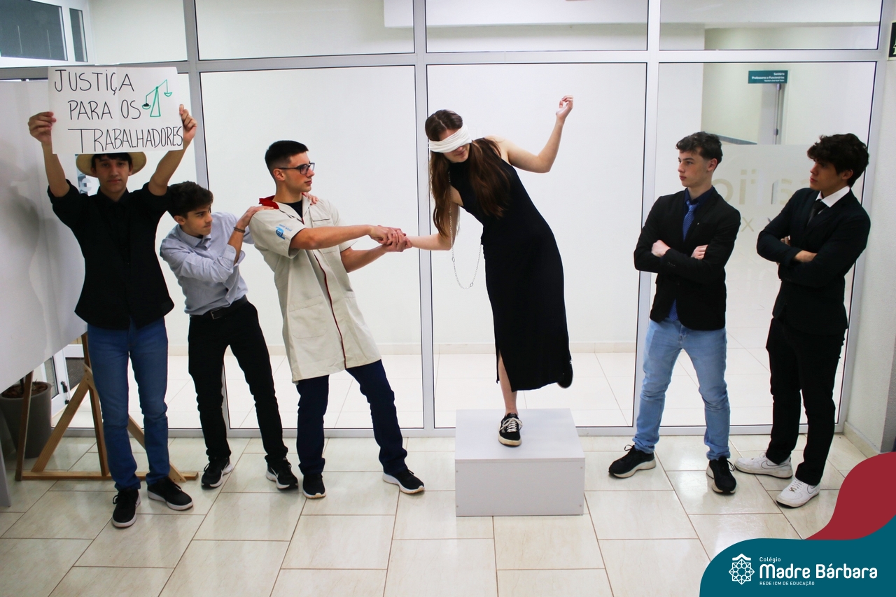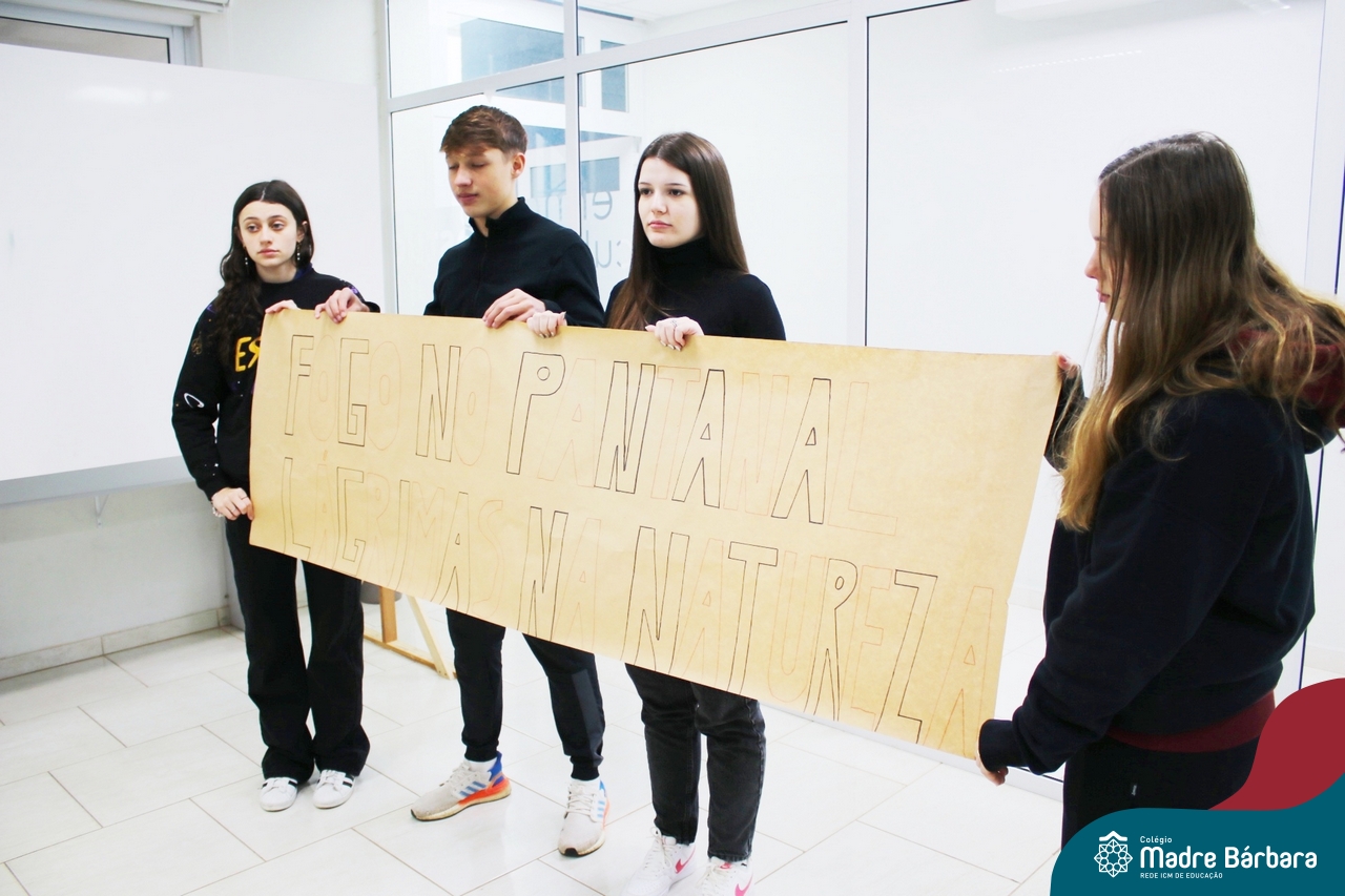 A sociedade em rede e movimentos sociais foi tema do produto final da Eletiva Cultura e Identidade, desenvolvida com estudantes das segundas séries do Ensino Médio, sob a orientação da professora Juciane Sehn da Silva. Com o desafio de criar uma performance sobre um movimento social contemporâneo, a partir da proposta de identificação do grupo, investigação científica, apropriação de referencial bibliográfico e teórico, fundamentado na categoria “sociedade em rede”, elaborada pelo sociólogo Manuel Castells, os estudantes produziram duas performances que retrataram o movimento operário e o movimento ambientalista, sob um olhar crítico e analítico, a fim de compreendê-los dentro da concepção de cultura e identidade, como fonte de significados e experiências coletivas.