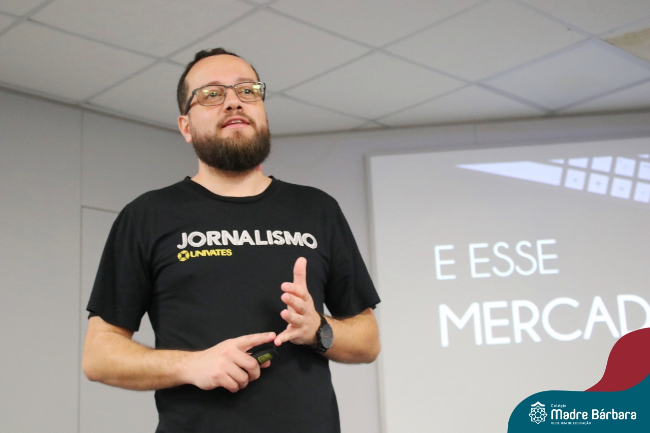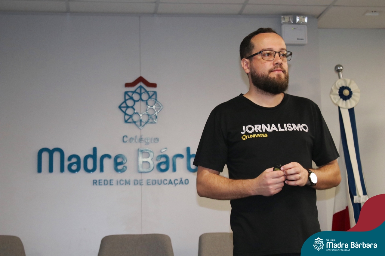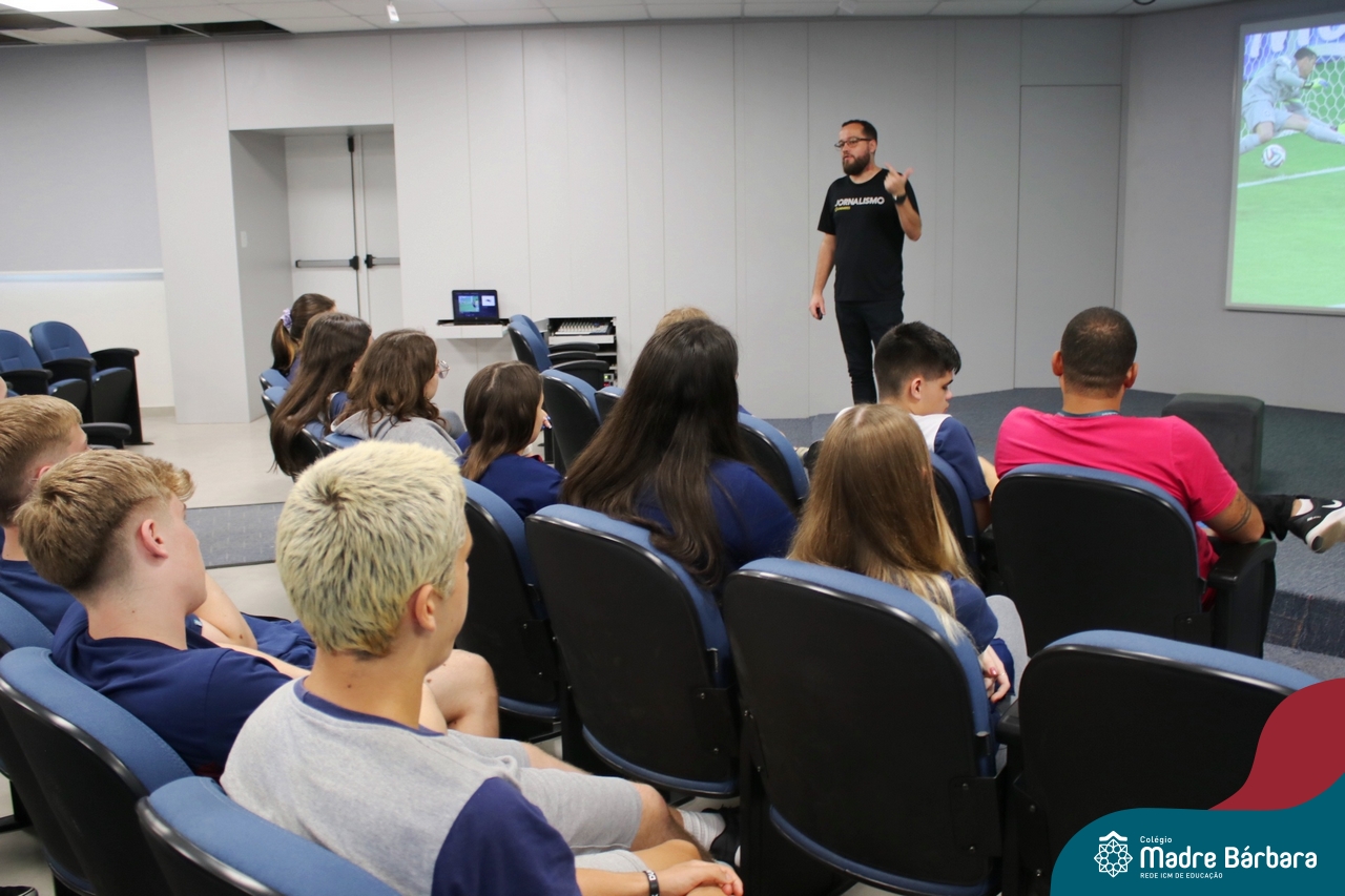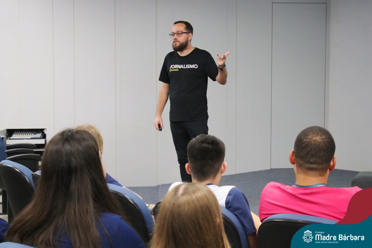 Na tarde de segunda-feira (21.10), no Itinerário de Comunicação e Mídias Digitais, os estudantes do 1º ano do Ensino Médio participaram de um encontro com o coordenador do curso de comunicação social da Univates, professor Marcus Staudt, para aprenderem mais sobre a importância da comunicação e do jornalismo através de questões relacionadas a divulgação e checagem de informações, fake news, storytelling e as possibilidades de produções audiovisuais.
