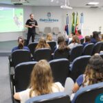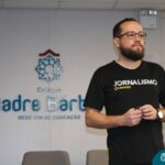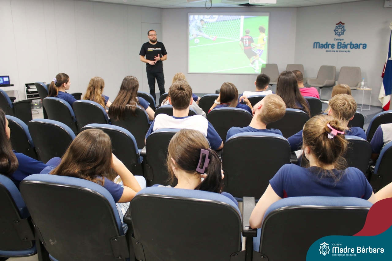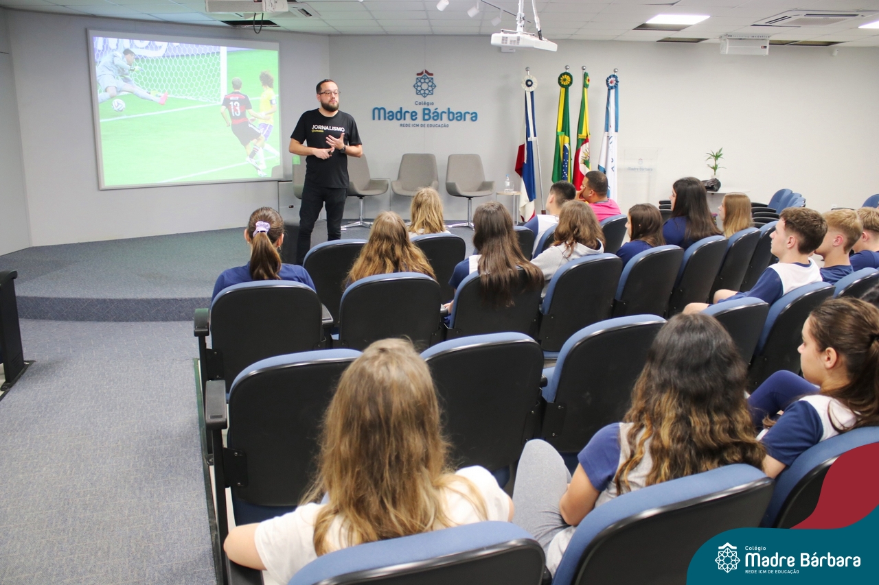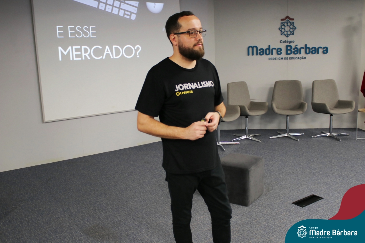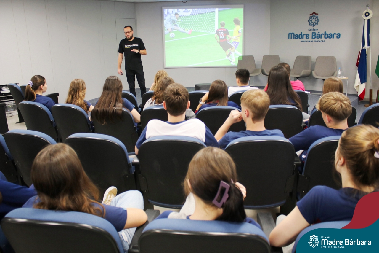 Na tarde de segunda-feira (21.10), no Itinerário de Comunicação e Mídias Digitais, os estudantes do 1º ano do Ensino Médio participaram de um encontro com o coordenador do curso de comunicação social da Univates, professor Marcus Staudt, para aprenderem mais sobre a importância da comunicação e do jornalismo através de questões relacionadas a divulgação e checagem de informações, fake news, storytelling e as possibilidades de produções audiovisuais.