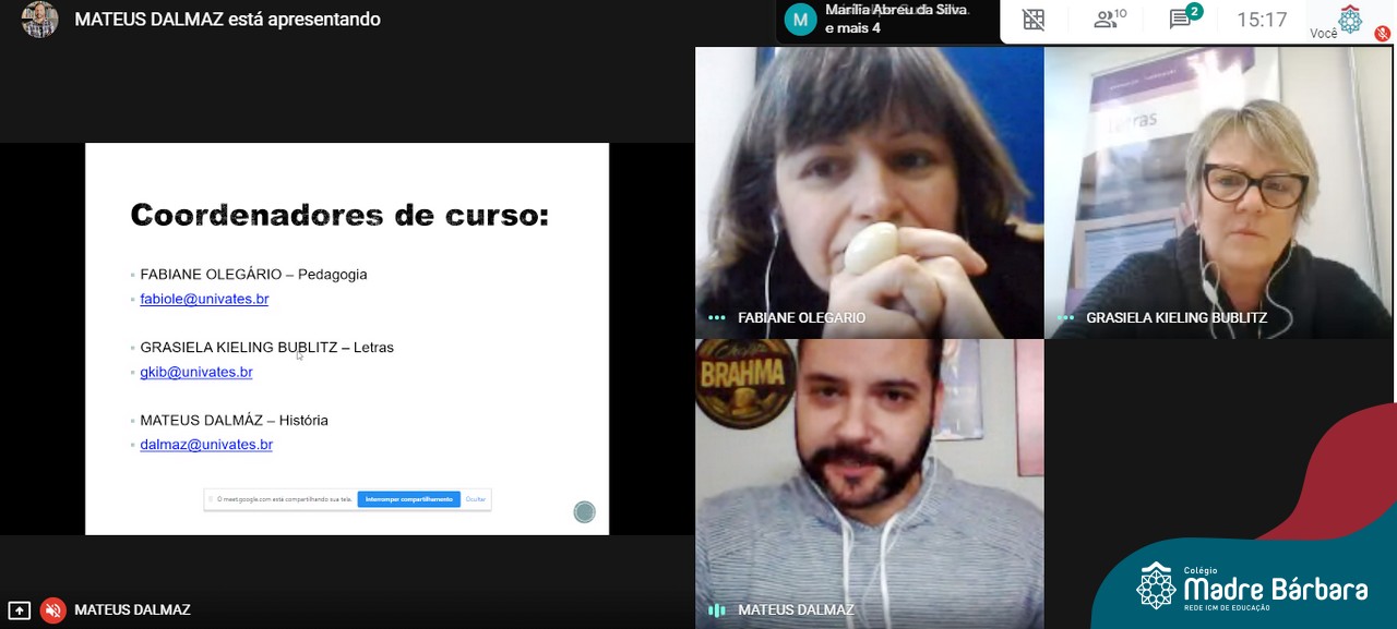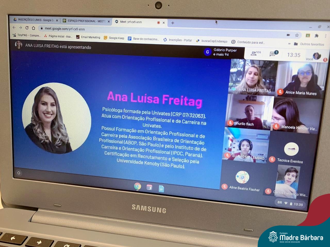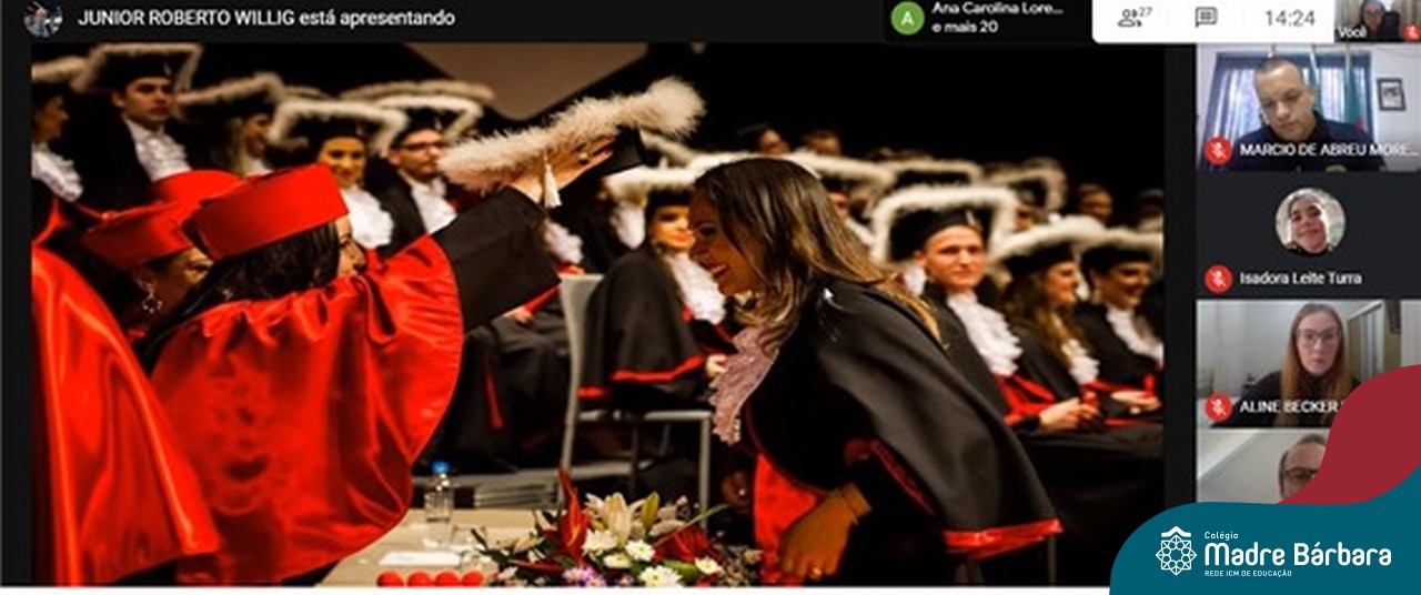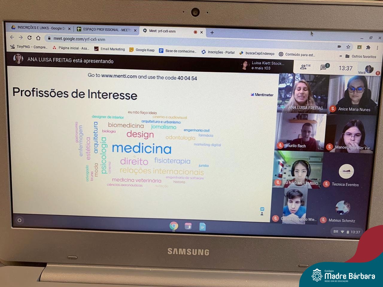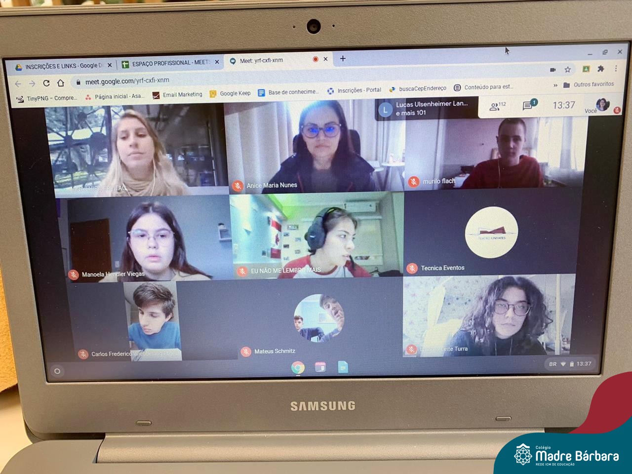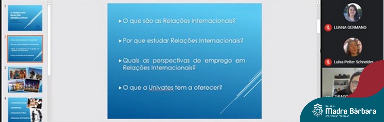 Nesta semana, os alunos do Ensino Médio do Colégio Madre Bárbara – Rede ICM estão participando do Espaço Profissional. O evento ocorreu na tarde desta segunda-feira (31) e também será realizado na tarde de quarta-feira (2). Pelo segundo ano consecutivo em parceria com a Univates, a ação busca instrumentalizar os alunos sobre o mercado com dicas para o futuro profissional. O evento exclusivo para alunos do Colégio, este ano em formato virtual pela plataforma Google Meet, conta com painéis com profissionais de diversas áreas e trocas de conhecimentos sobre o novo mercado de trabalho.