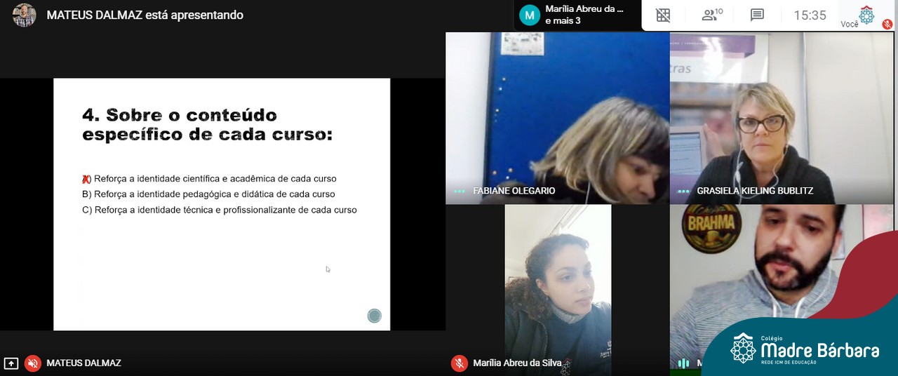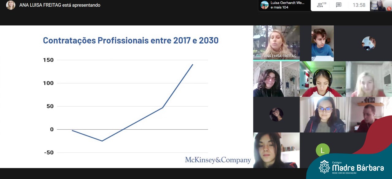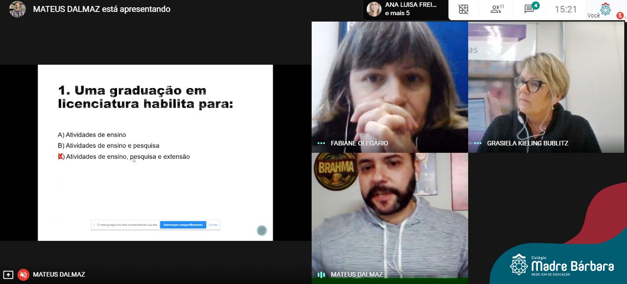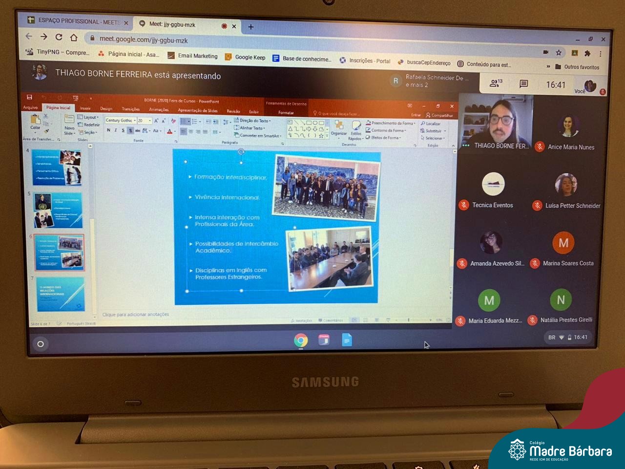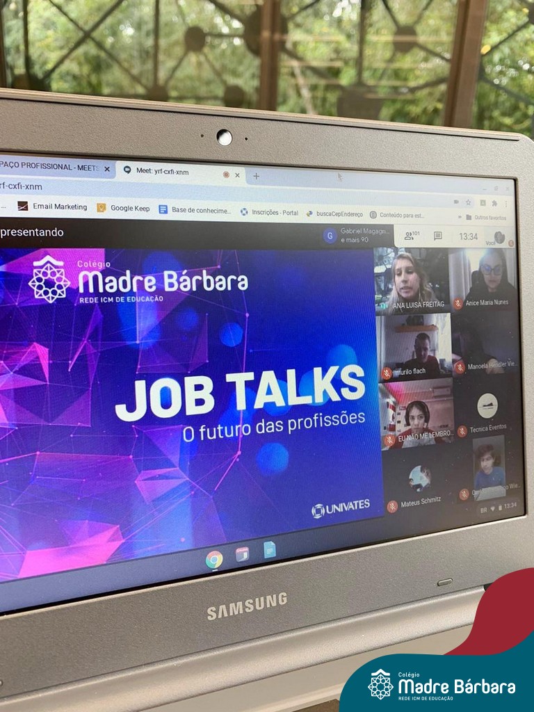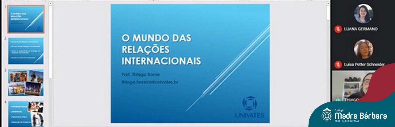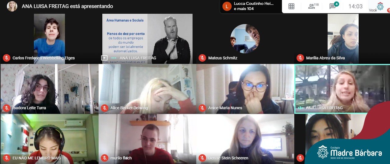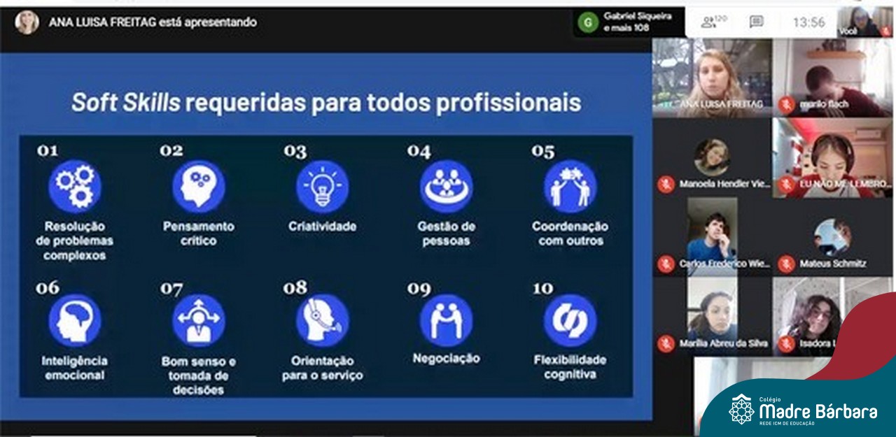 Nesta semana, os alunos do Ensino Médio do Colégio Madre Bárbara – Rede ICM estão participando do Espaço Profissional. O evento ocorreu na tarde desta segunda-feira (31) e também será realizado na tarde de quarta-feira (2). Pelo segundo ano consecutivo em parceria com a Univates, a ação busca instrumentalizar os alunos sobre o mercado com dicas para o futuro profissional. O evento exclusivo para alunos do Colégio, este ano em formato virtual pela plataforma Google Meet, conta com painéis com profissionais de diversas áreas e trocas de conhecimentos sobre o novo mercado de trabalho.