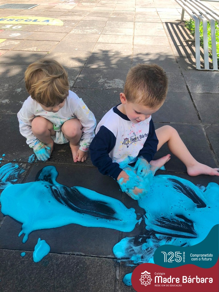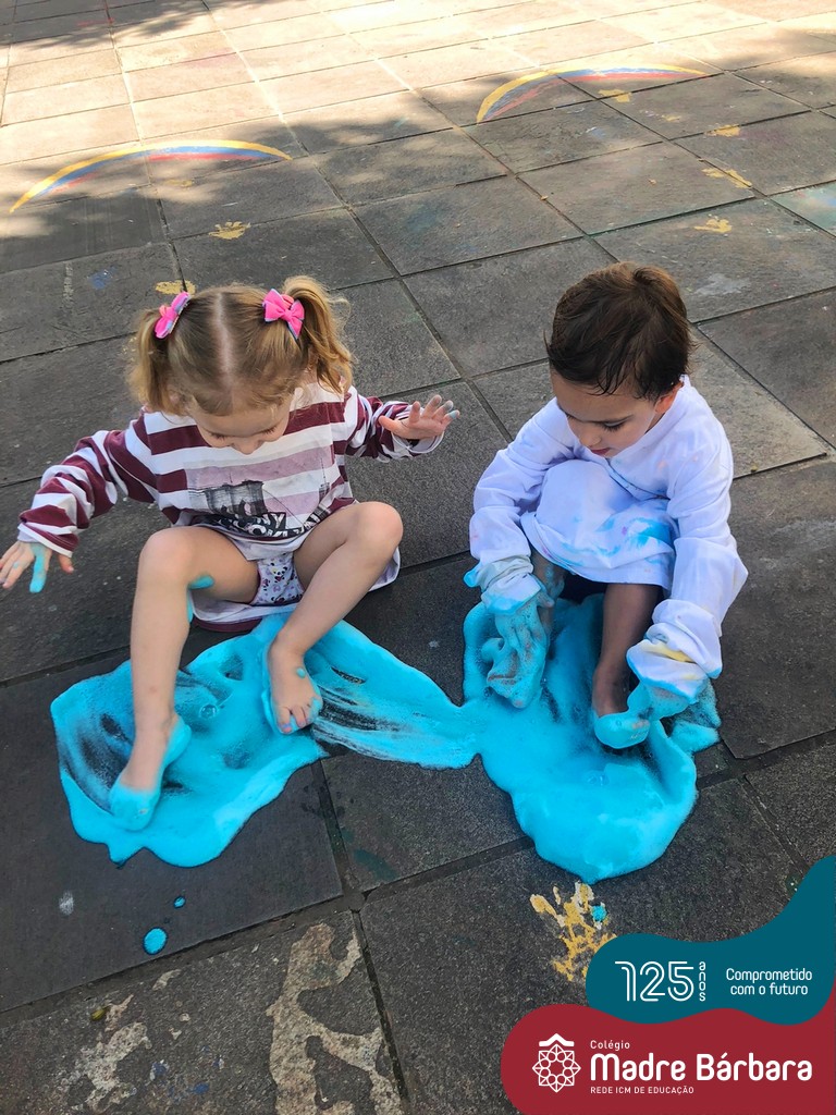 Através do corpo, as crianças se expressam, experienciam e constroem o conhecimento. A partir das sensações e percepções com a espuma colorida, as crianças do Nível 2A também puderam trocar afetos, sorrisos e compartilhar muita diversão!
