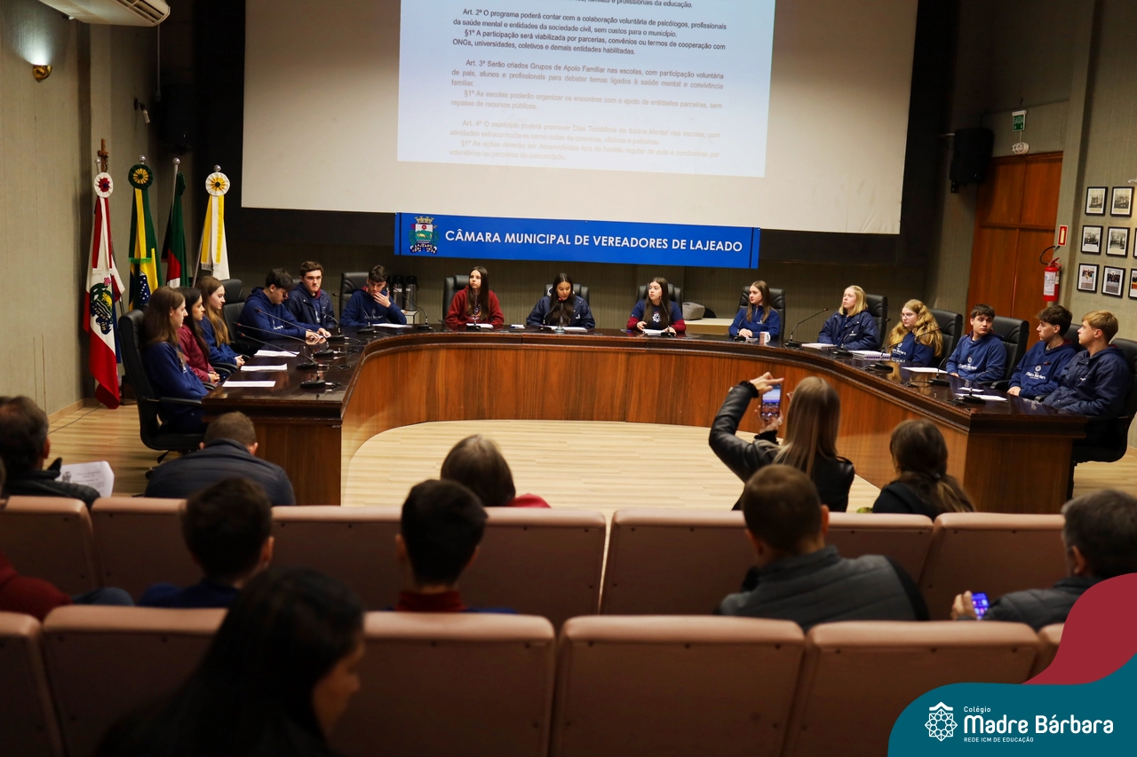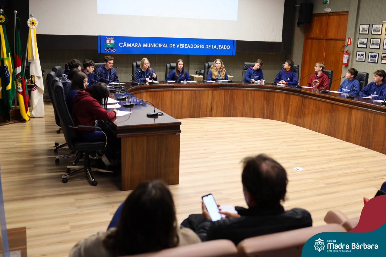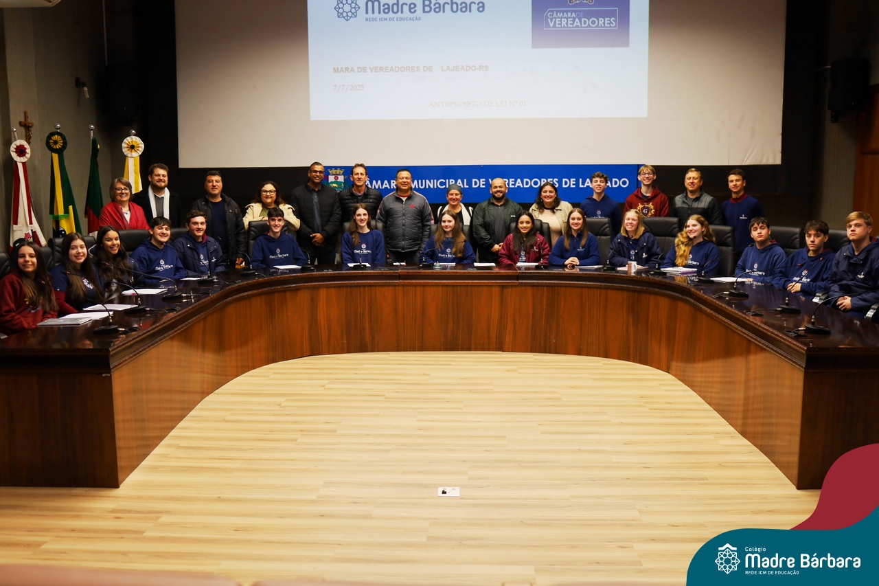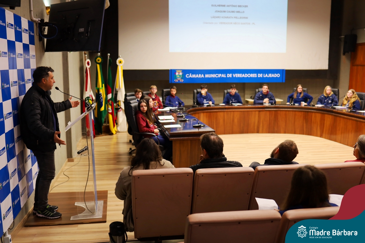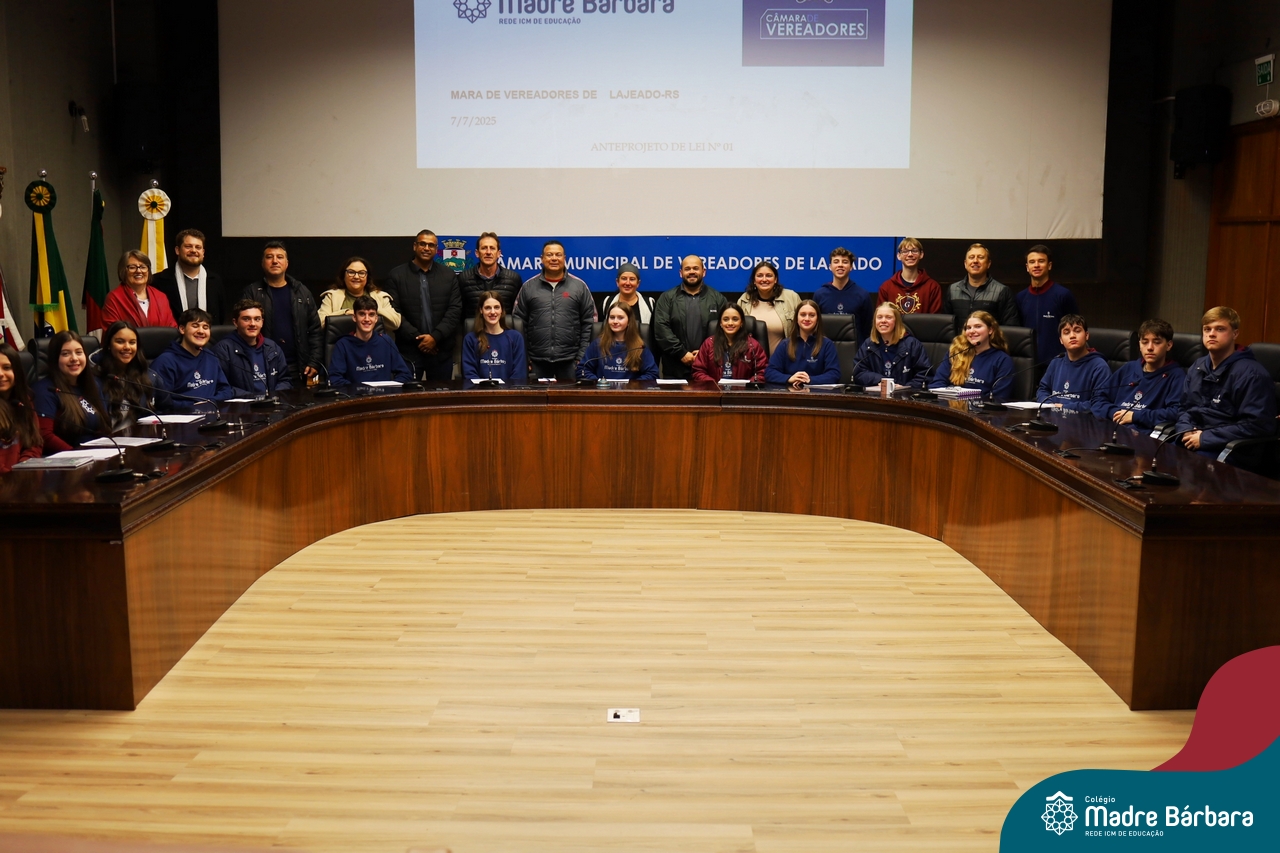 Na manhã desta segunda-feira, 07 de julho, os estudantes do 1º ano do Ensino Médio do Colégio Madre Bárbara – Rede ICM tiveram uma oportunidade única de participar de uma atividade que aproximou a teoria da prática legislativa. Durante a disciplina Modelos de Governança e Política, os alunos apresentaram seus Projetos de Lei na Câmara Municipal de Lajeado. A iniciativa foi proposta pelo professor de geografia, Lucas Schneider, que busca estimular o protagonismo juvenil, o pensamento crítico e a resiliência dos desafios da municipalidade.