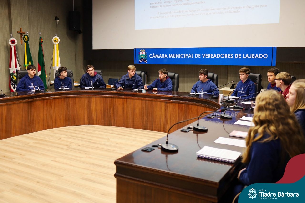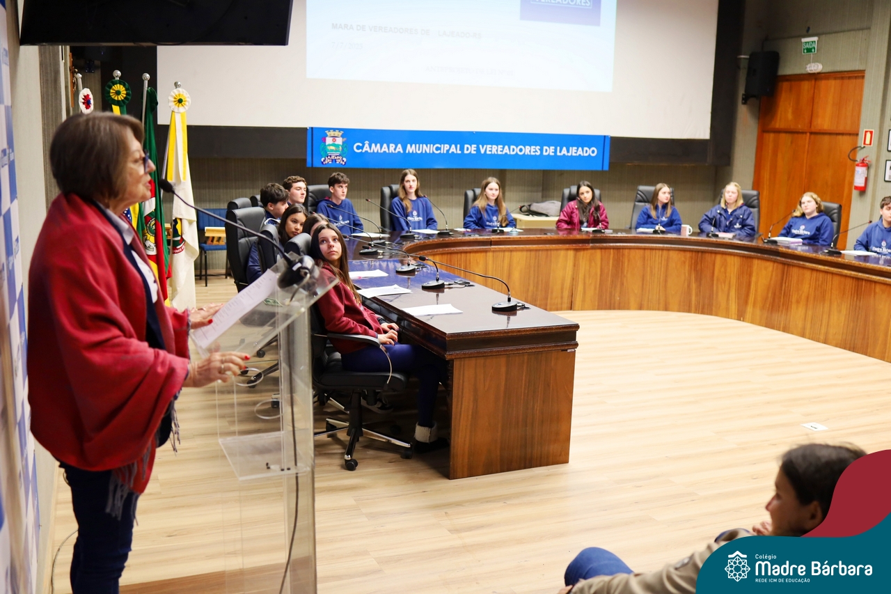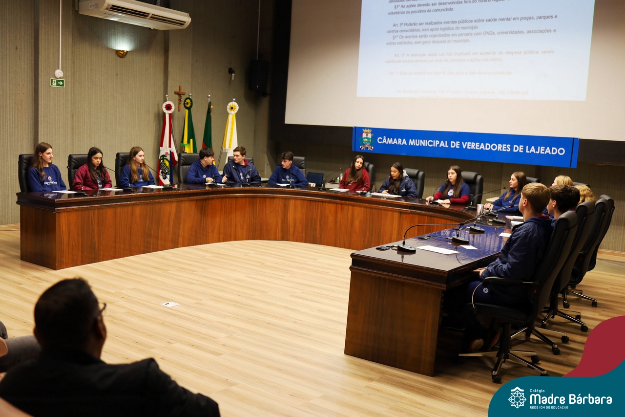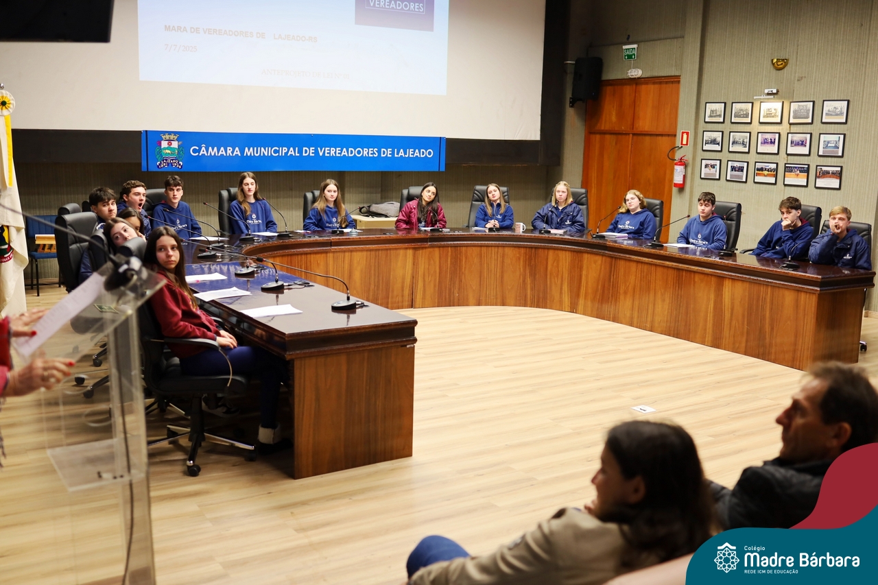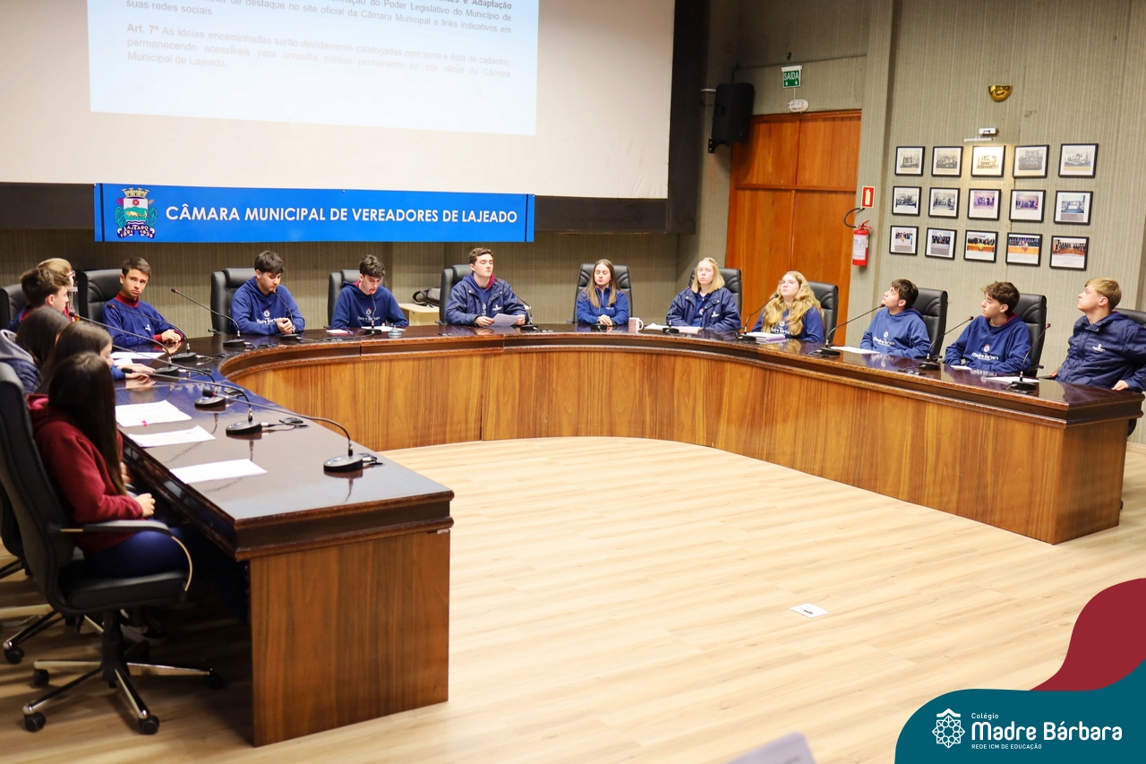 Na manhã desta segunda-feira, 07 de julho, os estudantes do 1º ano do Ensino Médio do Colégio Madre Bárbara – Rede ICM tiveram uma oportunidade única de participar de uma atividade que aproximou a teoria da prática legislativa. Durante a disciplina Modelos de Governança e Política, os alunos apresentaram seus Projetos de Lei na Câmara Municipal de Lajeado. A iniciativa foi proposta pelo professor de geografia, Lucas Schneider, que busca estimular o protagonismo juvenil, o pensamento crítico e a resiliência dos desafios da municipalidade.