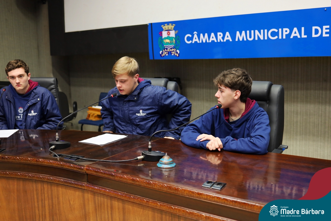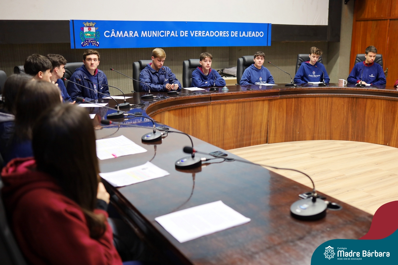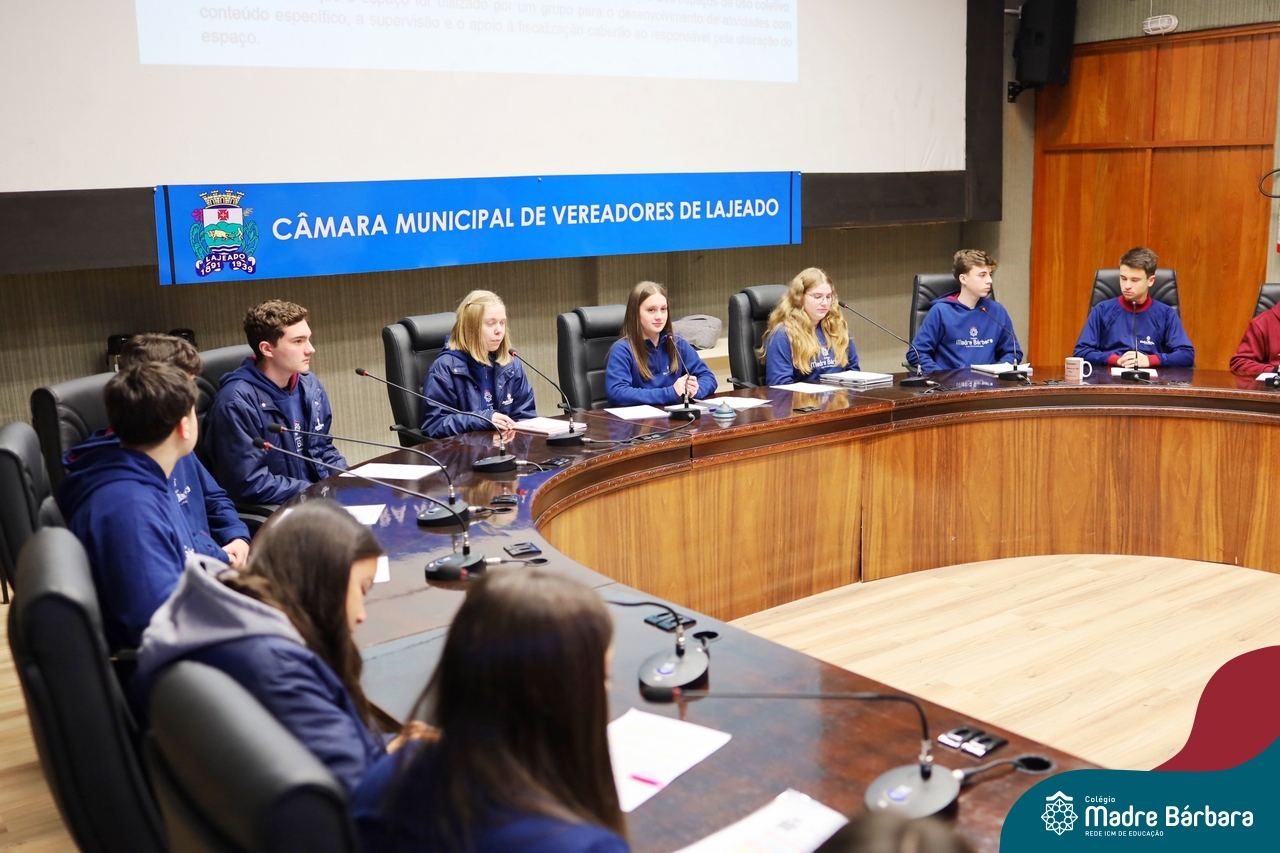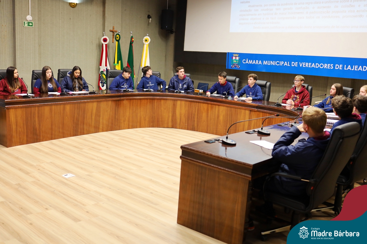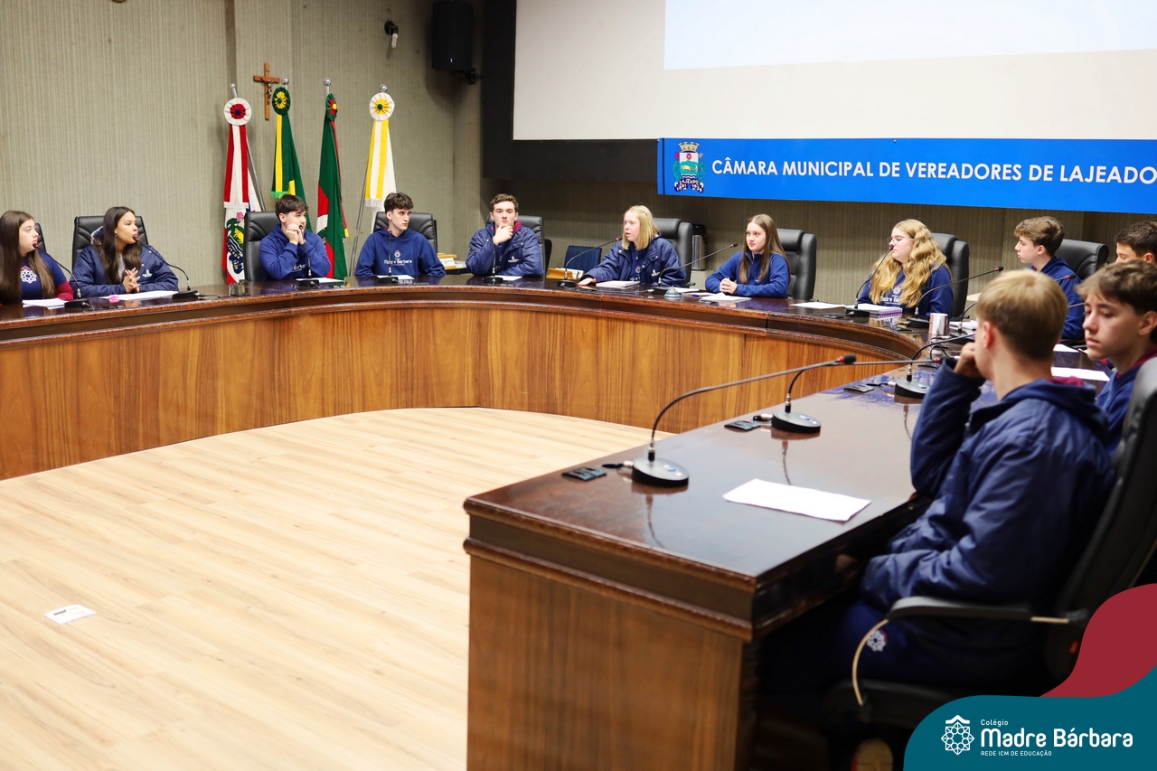 Na manhã desta segunda-feira, 07 de julho, os estudantes do 1º ano do Ensino Médio do Colégio Madre Bárbara – Rede ICM tiveram uma oportunidade única de participar de uma atividade que aproximou a teoria da prática legislativa. Durante a disciplina Modelos de Governança e Política, os alunos apresentaram seus Projetos de Lei na Câmara Municipal de Lajeado. A iniciativa foi proposta pelo professor de geografia, Lucas Schneider, que busca estimular o protagonismo juvenil, o pensamento crítico e a resiliência dos desafios da municipalidade.