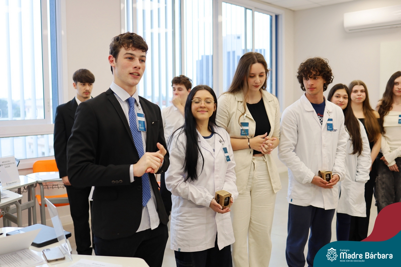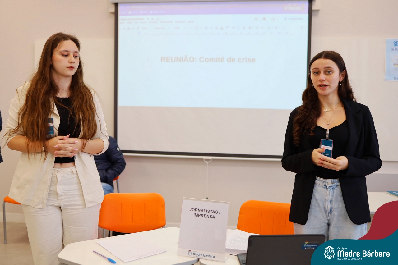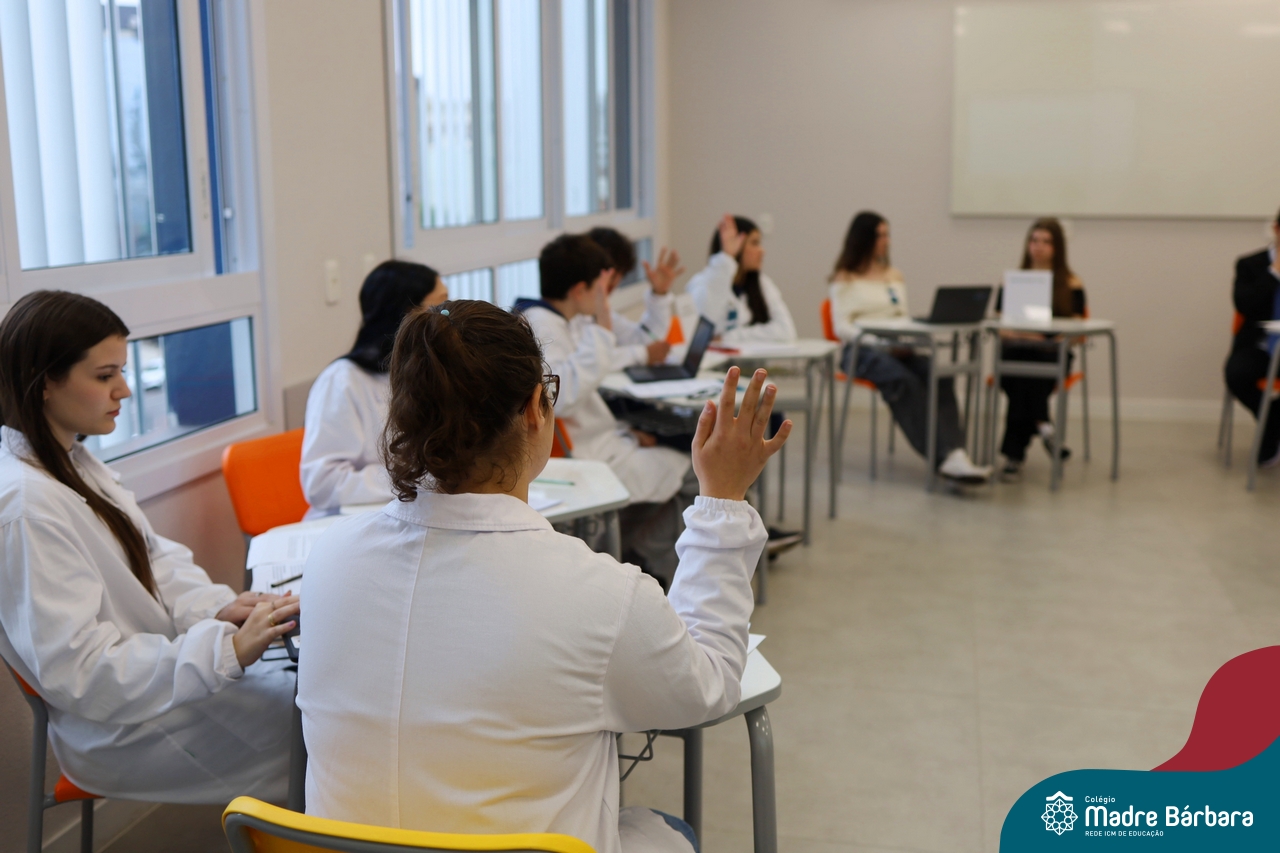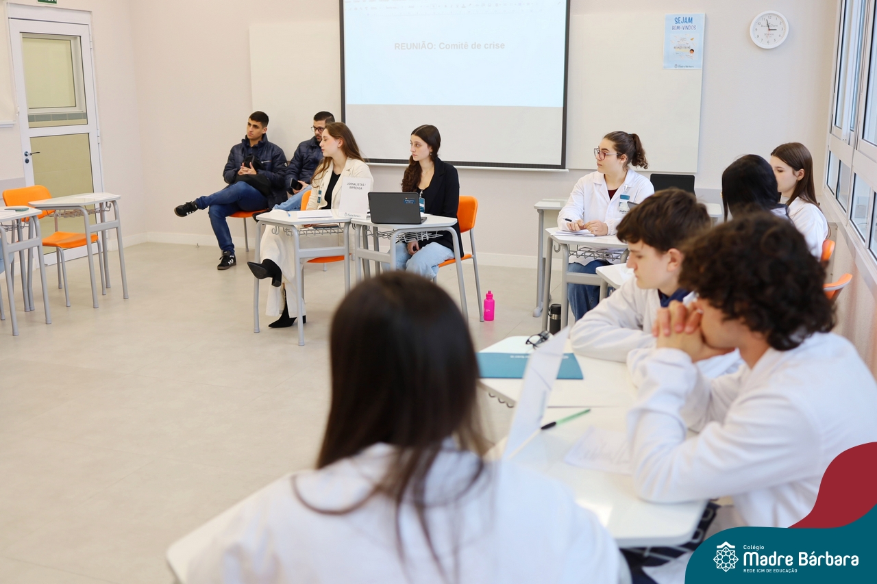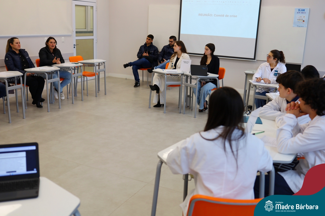 Na tarde de quarta-feira (09.07) os estudantes do 3º ano do Ensino Médio que estão participando do Itinerário Formativo “Casos clínicos em saúde humana” receberam um desafio de uma simulação através de uma “comunicação oficial” solicitando a organização de um “Comitê de Crise” para que cada estado e município tenham as definições quanto a uma superlotação de hospitais e uma epidemia de influenza. Para contextualizar, a professora Ângela Lenz apresentou matérias veiculadas tanto na Independente quanto na A Hora, quanto à lotação que teve na região há algum tempo atrás, no Hospital Bruno Born (HBB) em relação a casos de influenza.