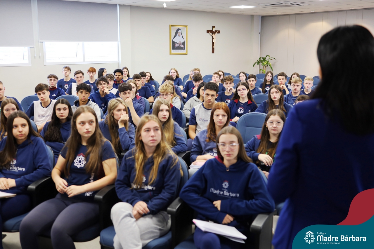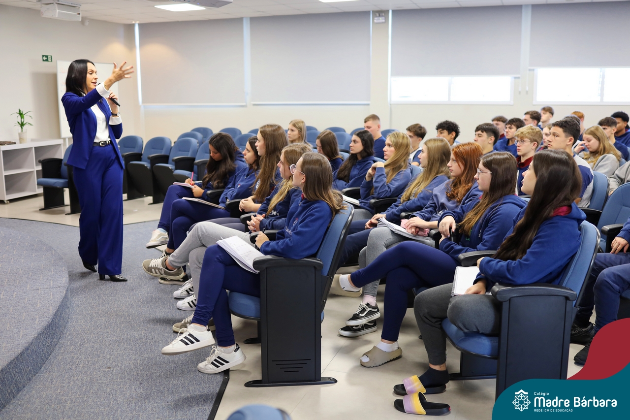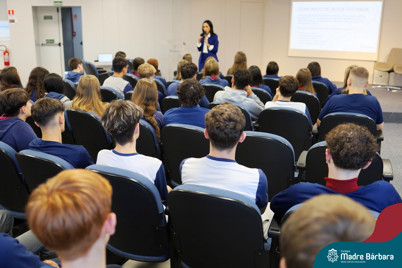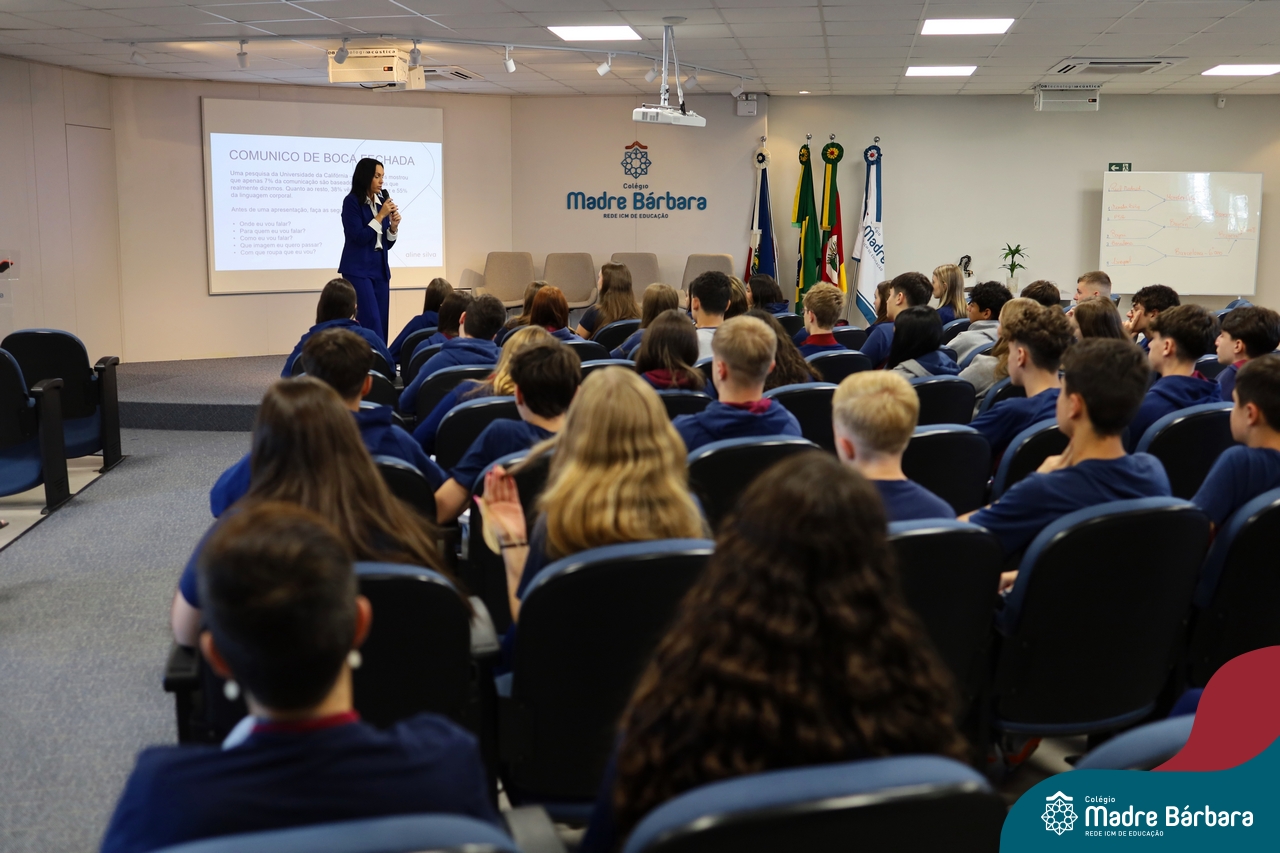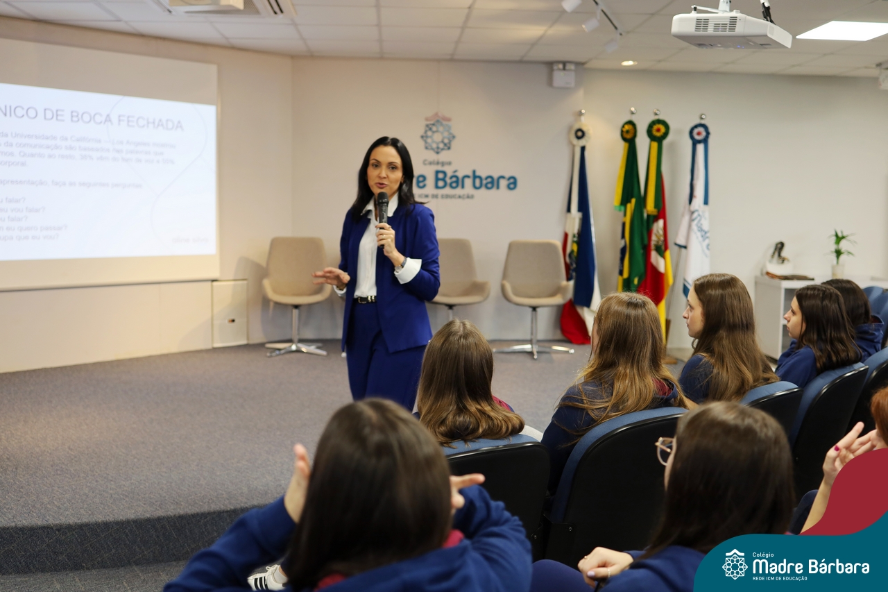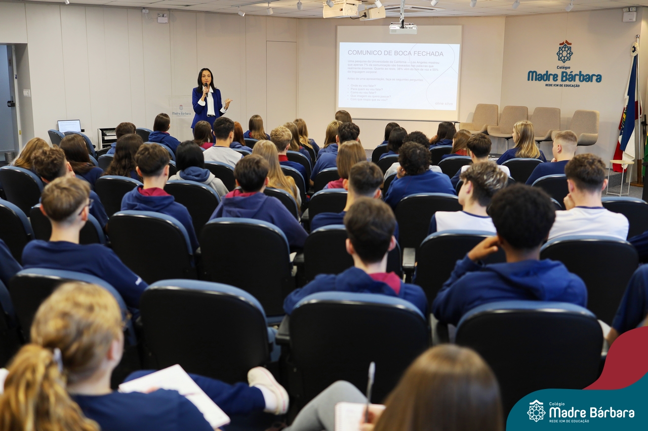 Na manhã desta segunda-feira (14.04) a comunicadora Aline Silva esteve no Colégio Madre Bárbara – Rede ICM para conversar com os estudantes dos 1ºs anos do Ensino Médio sobre a produção da vídeo-oratória de 2025. Aline deu dicas para os estudantes sobre a importância do escolha do tema e roteiro, de buscarem uma maneira para conectar com o público, ofereceu dicas de postura, entonação e exercícios para melhorar a dicção. A comunicadora ainda falou sobre como fazer uma boa oratória, comunicação assertiva e elegante, cuidados com postura, linguagem corporal, vícios de linguagem e como prender atenção da audiência.