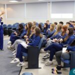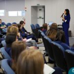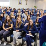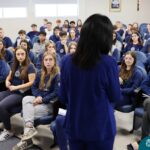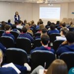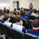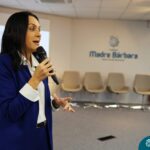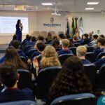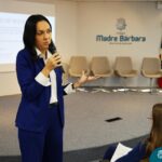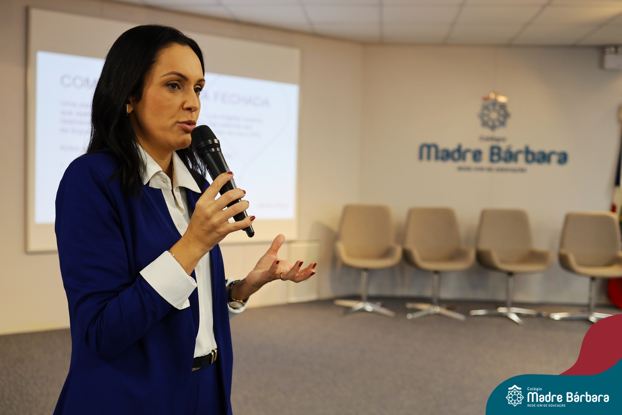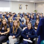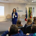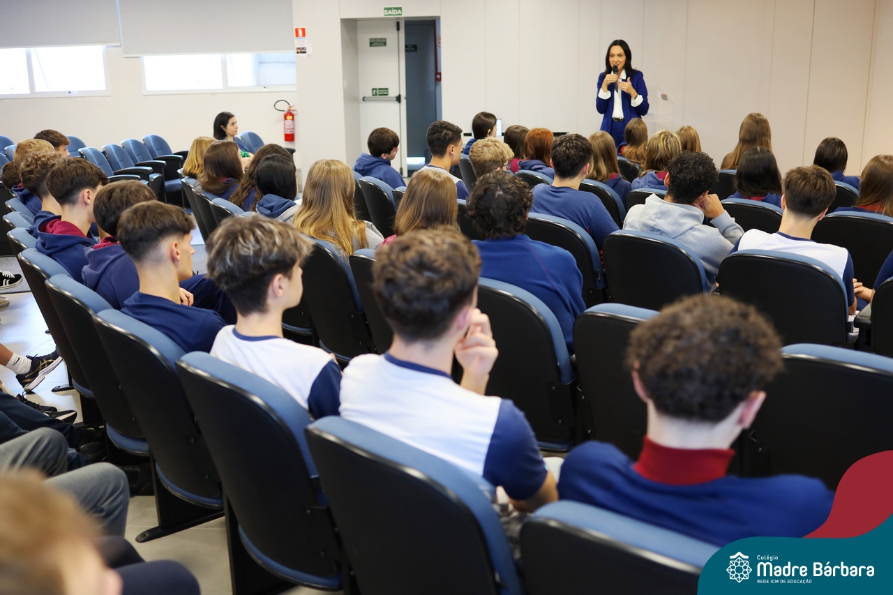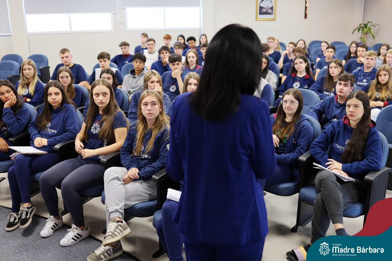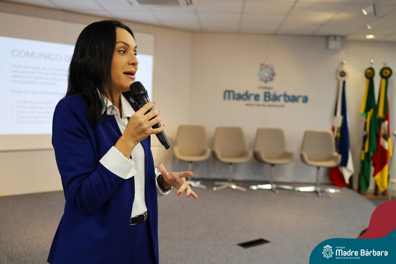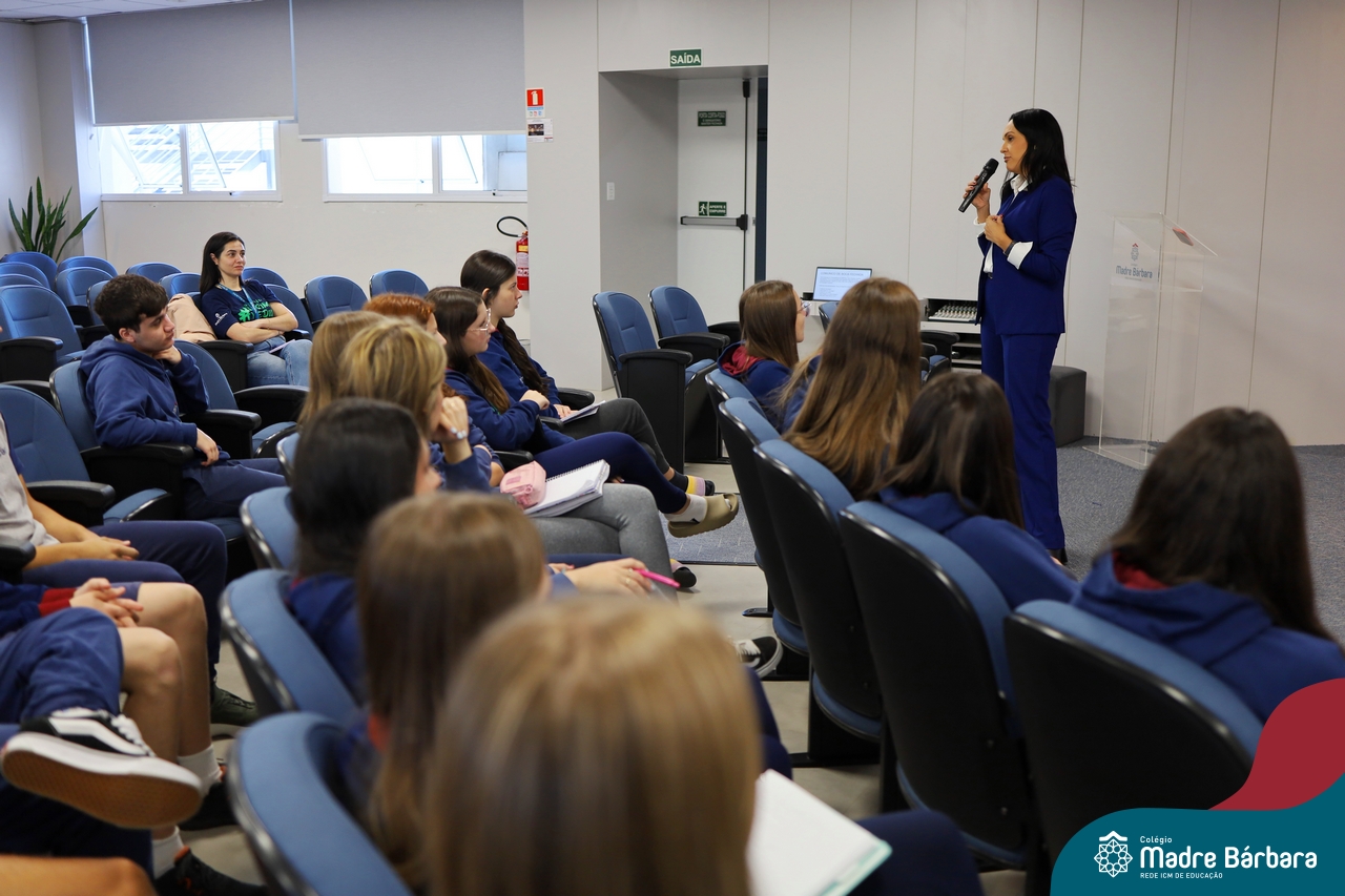 Na manhã desta segunda-feira (14.04) a comunicadora Aline Silva esteve no Colégio Madre Bárbara – Rede ICM para conversar com os estudantes dos 1ºs anos do Ensino Médio sobre a produção da vídeo-oratória de 2025. Aline deu dicas para os estudantes sobre a importância do escolha do tema e roteiro, de buscarem uma maneira para conectar com o público, ofereceu dicas de postura, entonação e exercícios para melhorar a dicção. A comunicadora ainda falou sobre como fazer uma boa oratória, comunicação assertiva e elegante, cuidados com postura, linguagem corporal, vícios de linguagem e como prender atenção da audiência.