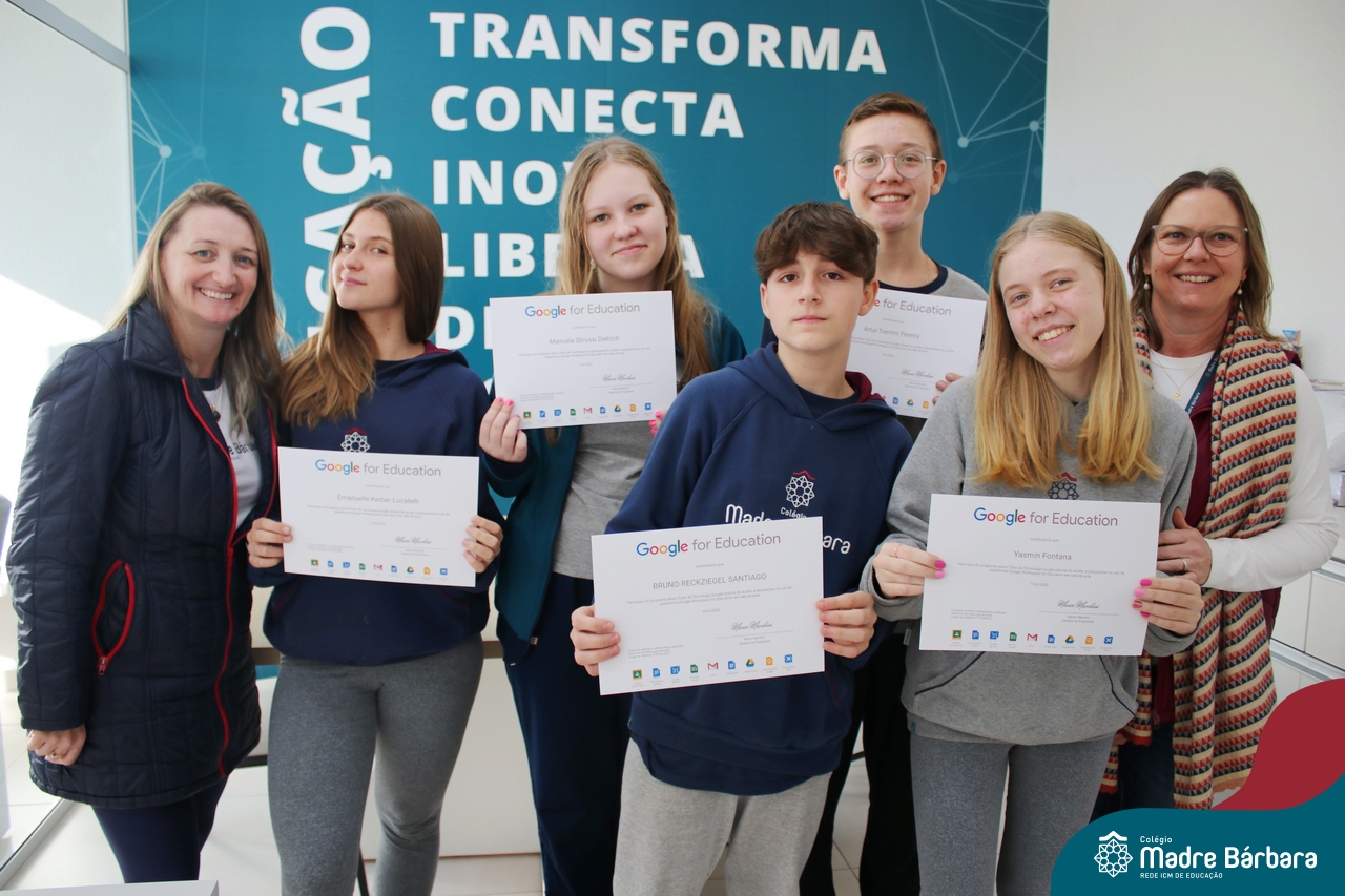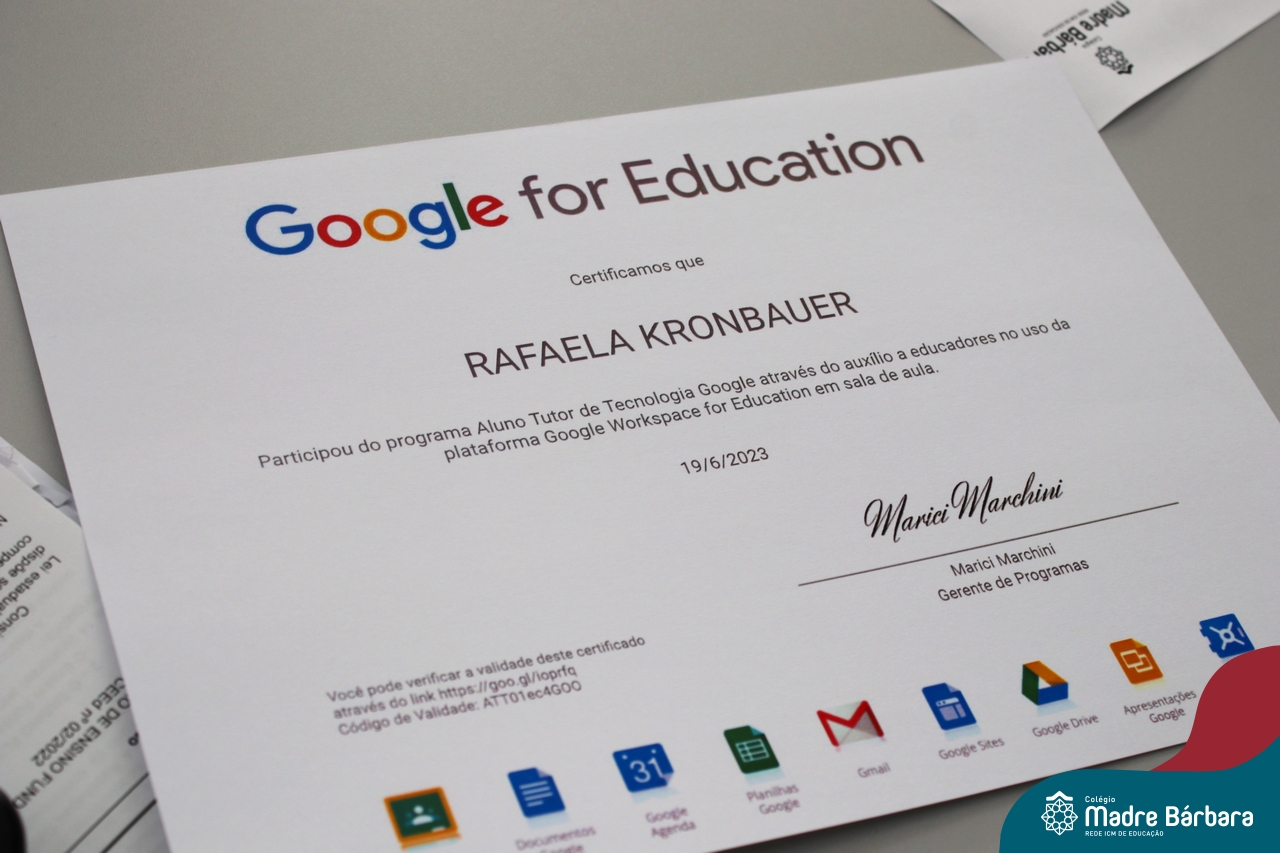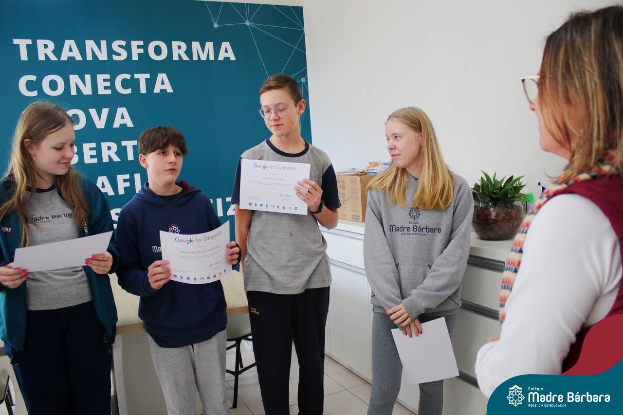 Na manhã de quinta-feira (06.07) estudantes do Ensino Fundamental – Anos Finais estiveram na coordenação pedagógica buscando seus certificados pela participação no programa Aluno Tutor de Tecnologia Google através do auxílio de educadores no uso da plataforma Google Workspace for Education em sala de aula. Parabenizamos pela dedicação e empenho na criação de projetos os estudantes: Artur Trentini, Bruno Reckziegel, Emanuelle Locatelli, Manuela Sbrussi, Rafaela Kronbauer e Yasmin Fontana. Orgulho de vocês!