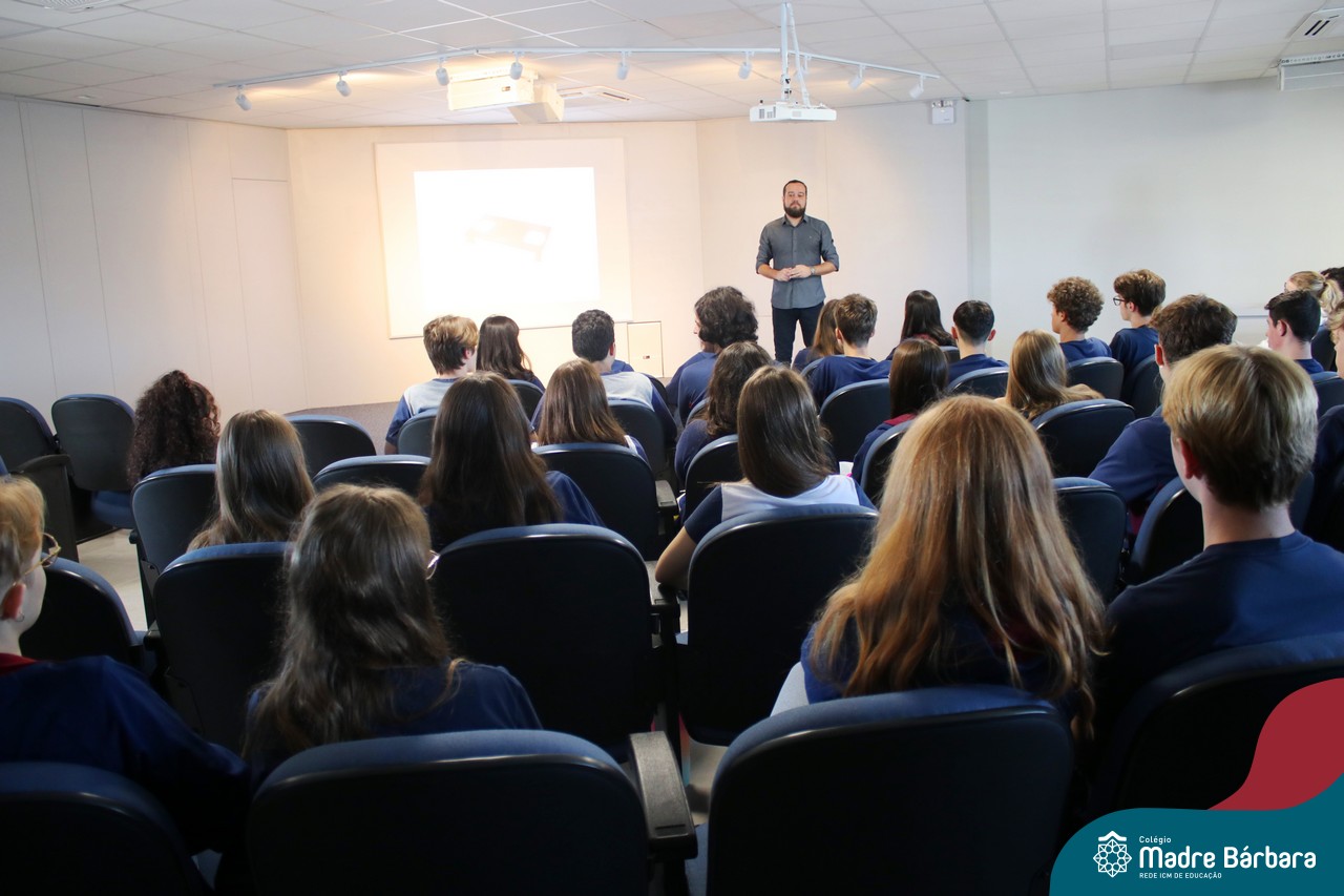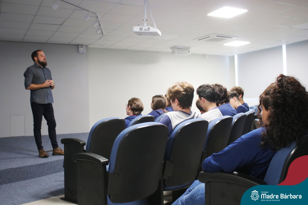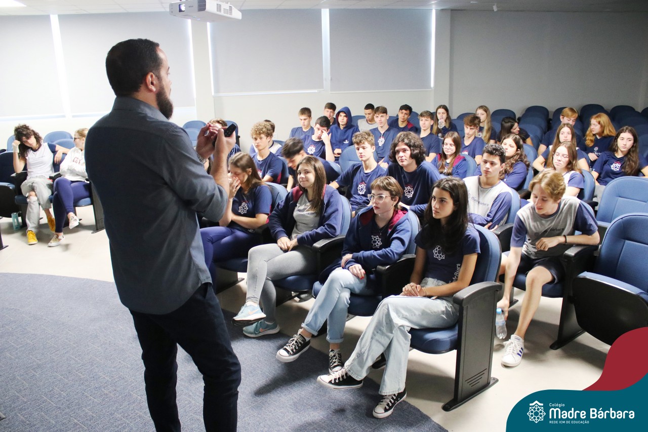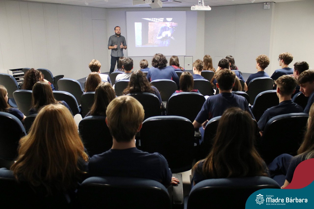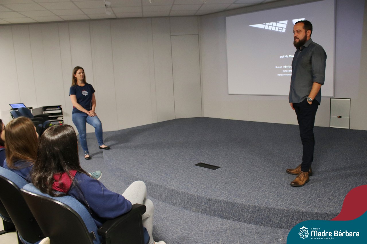 Na manhã dessa segunda-feira (10.04), os estudantes das turmas 201 e 202 do Ensino Médio do Colégio Madre Bárbara – Rede ICM – participaram de um momento com o jornalista Marcus Staudt, professor do Curso de Comunicação Social da Univates, sobre produção audiovisual e edição de vídeos. Os estudantes puderam tirar dúvidas e entender sobre o processo de produção, gravação e edição dos curtas cinematográficos para o XIII  Festival de Cinema, que terá como tema “Comédias da vida real”. O Festival é coordenado pela professora Francieli Winck.